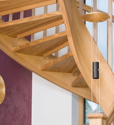 1/2 gewendelte offene Bogen-Wangentreppe Holzart Eiche geölt, Stäbe weiß transparent gewachst