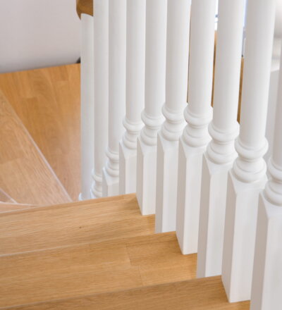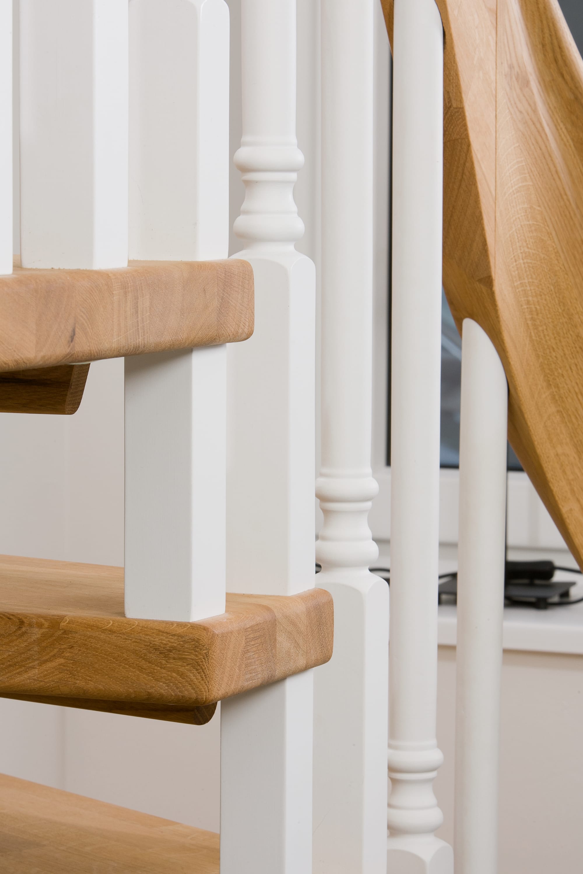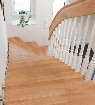 1/4 gewendelte freitragende Treppe mit profiliertem Handlauf; Holzart Kernbuche mosaik