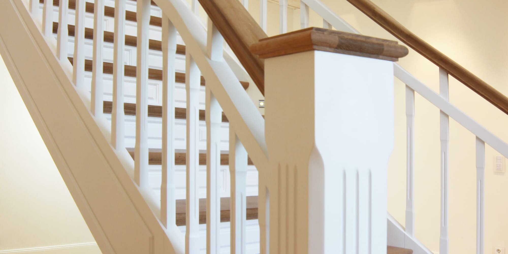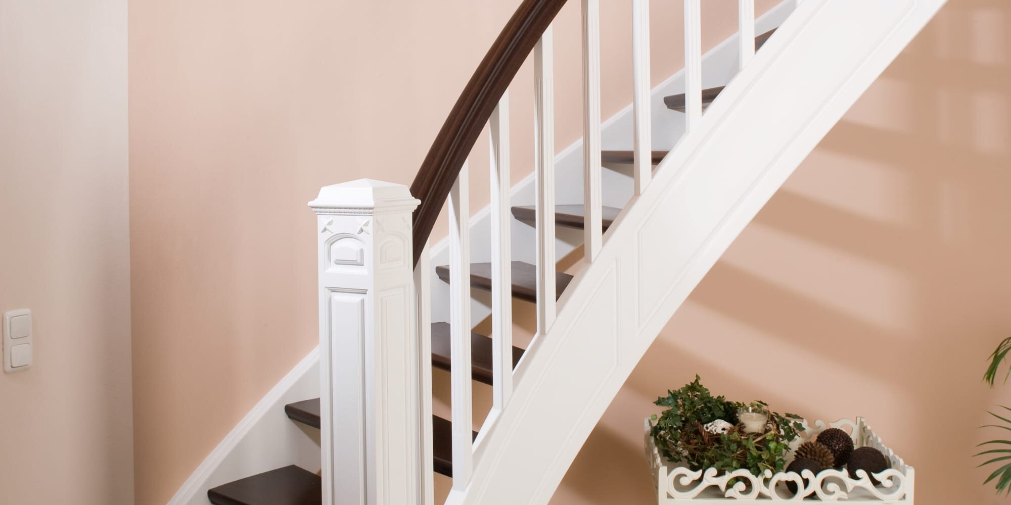 Der Pfosten einer Treppe wird beim Treppesteigen zuerst berührt und steht auch optisch im Vordergrund. Er kann durch aufgesetzte Pfostenköpfe sowie durch profilierte oder gedrechselte Verzierungen sehr unterschiedlich gestaltet werden. Für ein ansprechendes Treppendesign ist es entscheidend, dass Geländerfüllung, Handlauf und Pfosten insgesamt ein harmonisches Ganzes ergeben.