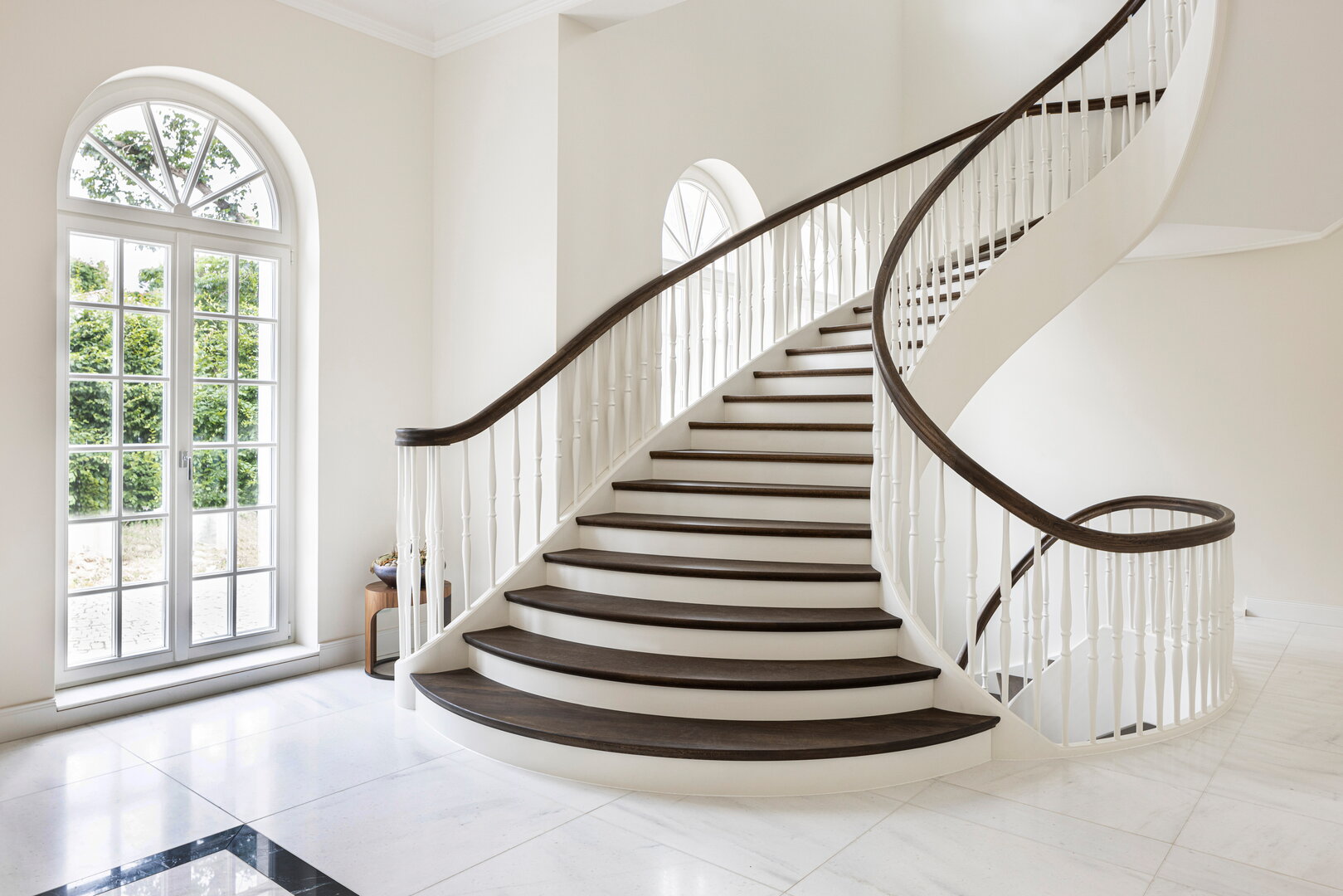 Nirgendwo ist es treffender, von Treppenbaukunst in Formvollendung zu sprechen, als bei einer bogenförmigen Treppe. Sie ist besonders dann zu empfehlen, wenn nicht die Funktion, sondern die Ästhetik im Vordergrund steht. Denn ob enge U-Form oder weitgeschweifter Bogen – diese Treppenform erzeugt immer eine extravagante Atmosphäre im Raum. Bogentreppen können als Wangentreppe oder auch als freitragende Treppe entworfen werden. In jedem Fall sind sie kleine Meisterwerke.