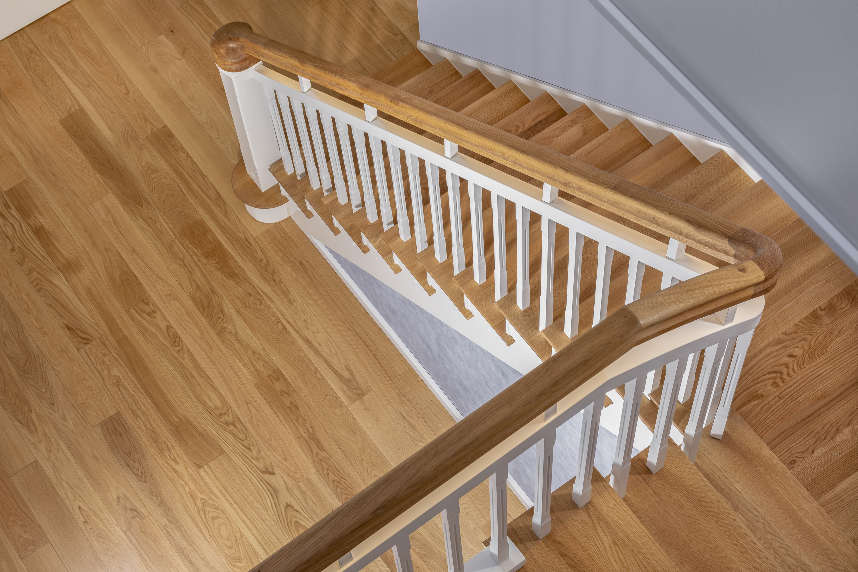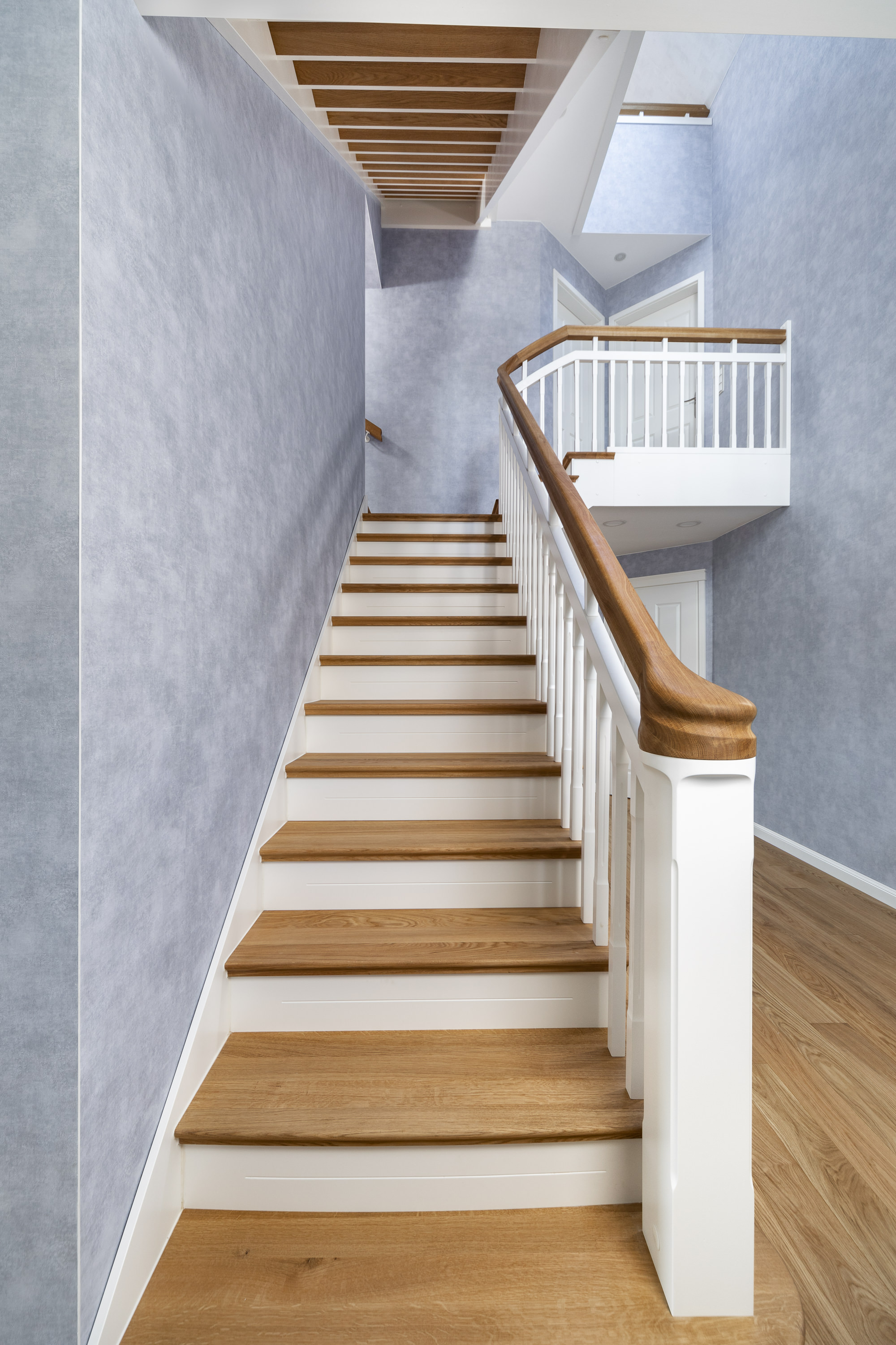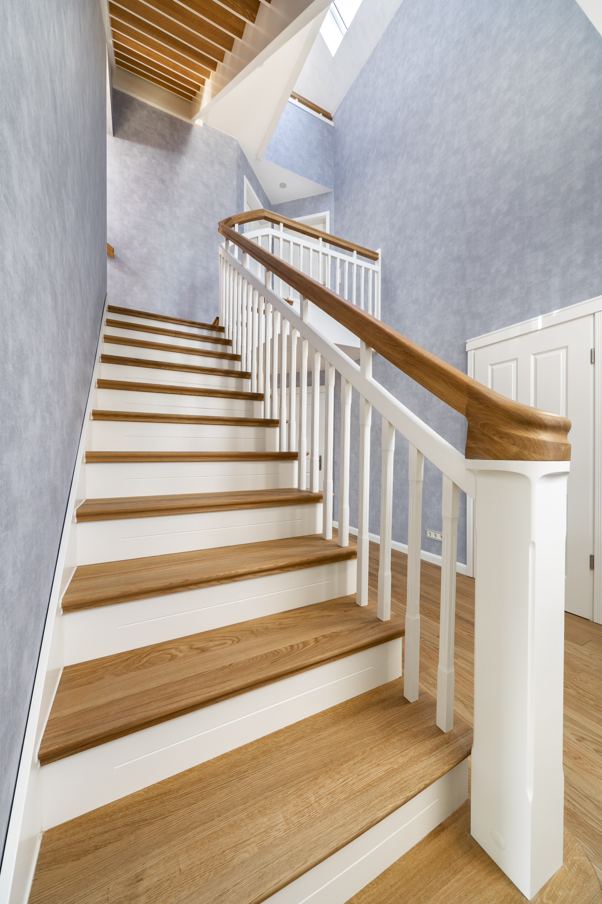Treppe in Faltwerkoptik. Bauseitige Verkleidung unterhalb der Stufen. Holzart Eiche weiß geölt. Wandhandlauf auf bauseitige Unterkonstruktion aufgeschoben mit Beleuchtung. Statt Brüstung wurde ein Sideboard aufgebaut. (Architektin: Jutta Petersen-Glombek, Hamburg)