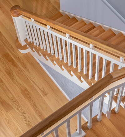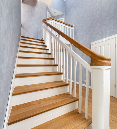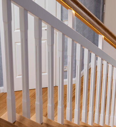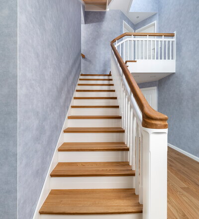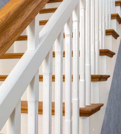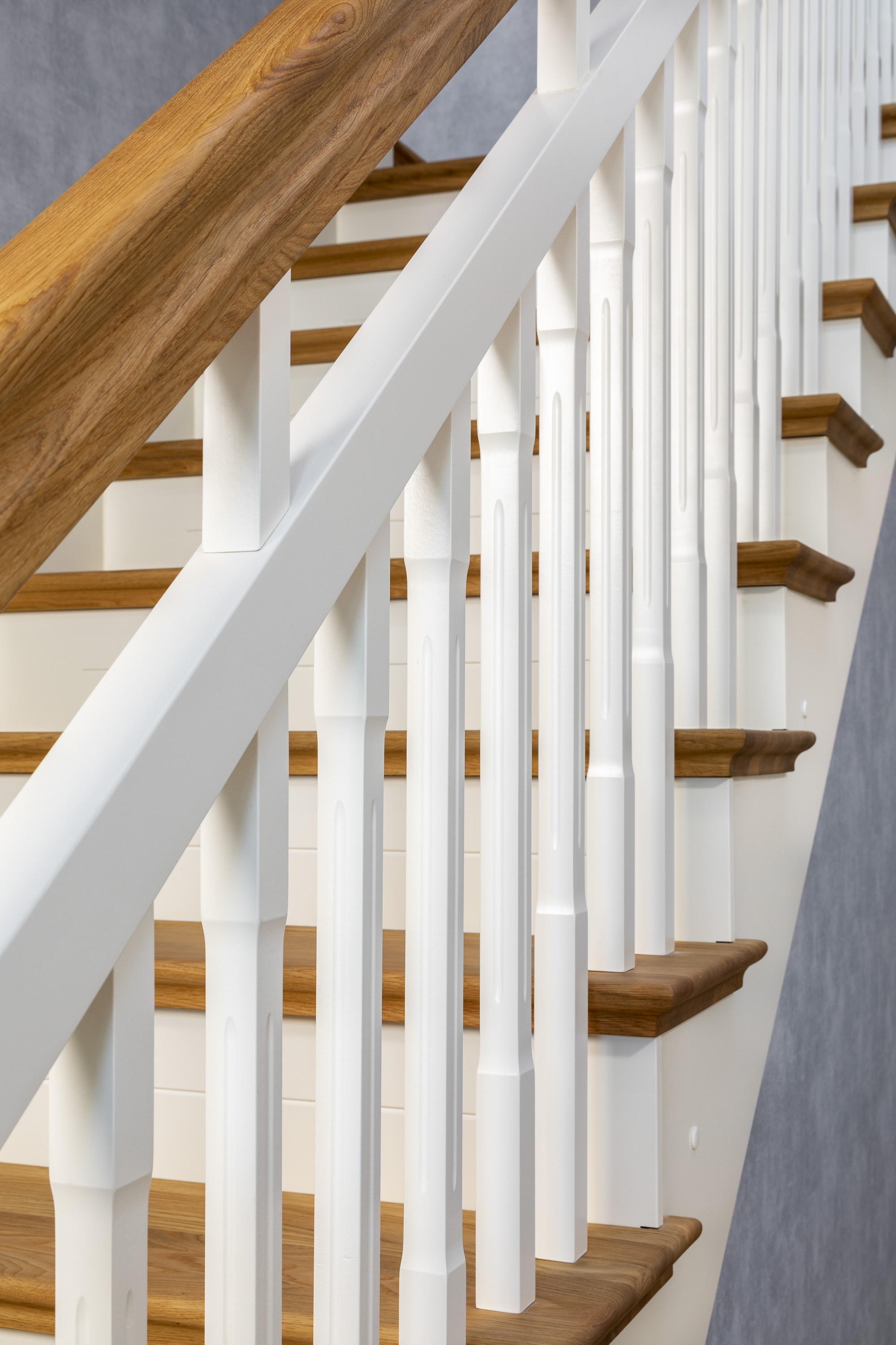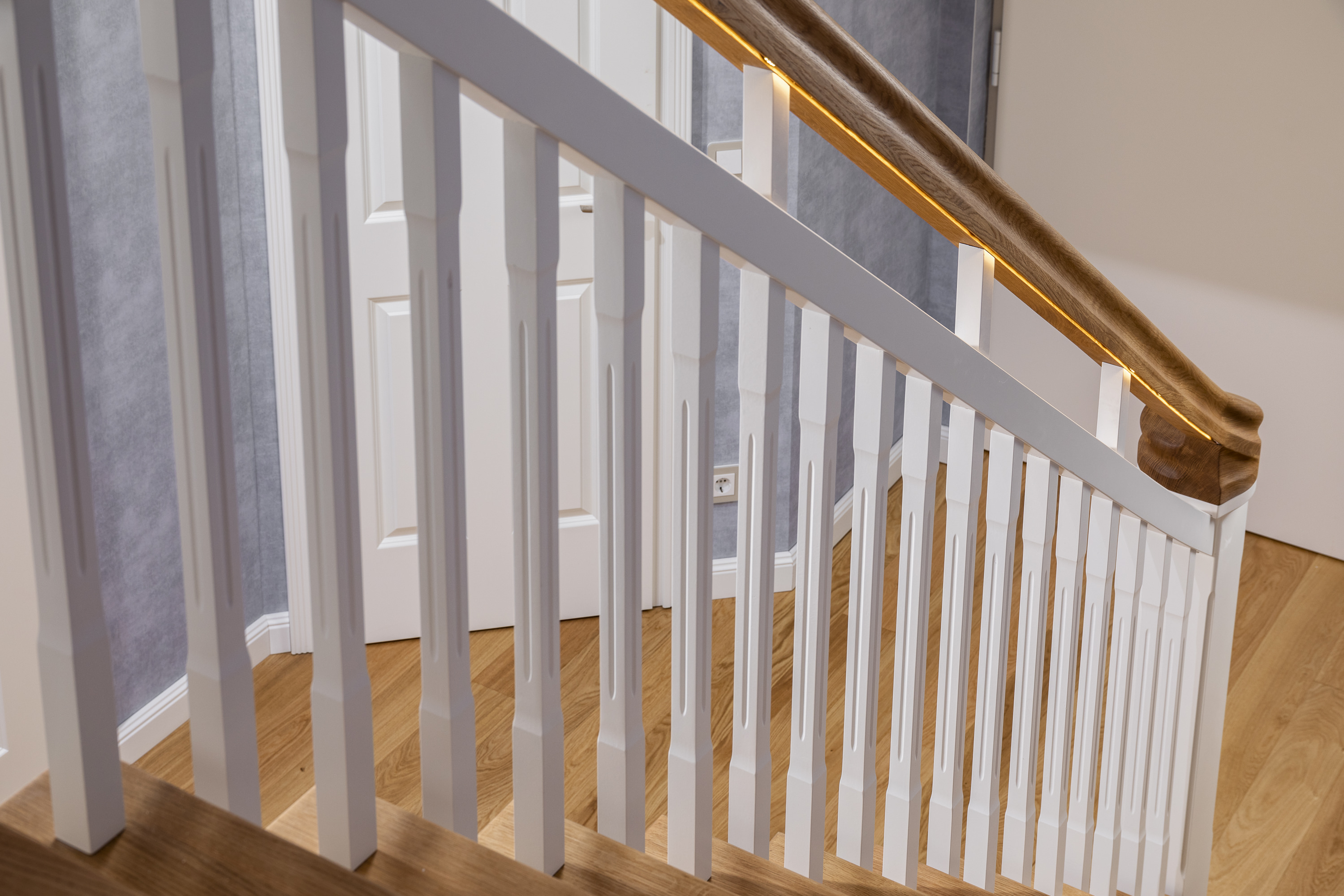 Treppe in Faltwerkoptik. Bauseitige Verkleidung unterhalb der Stufen. Holzart Eiche weiß geölt. Wandhandlauf auf bauseitige Unterkonstruktion aufgeschoben mit Beleuchtung. Statt Brüstung wurde ein Sideboard aufgebaut. (Architektin: Jutta Petersen-Glombek, Hamburg)