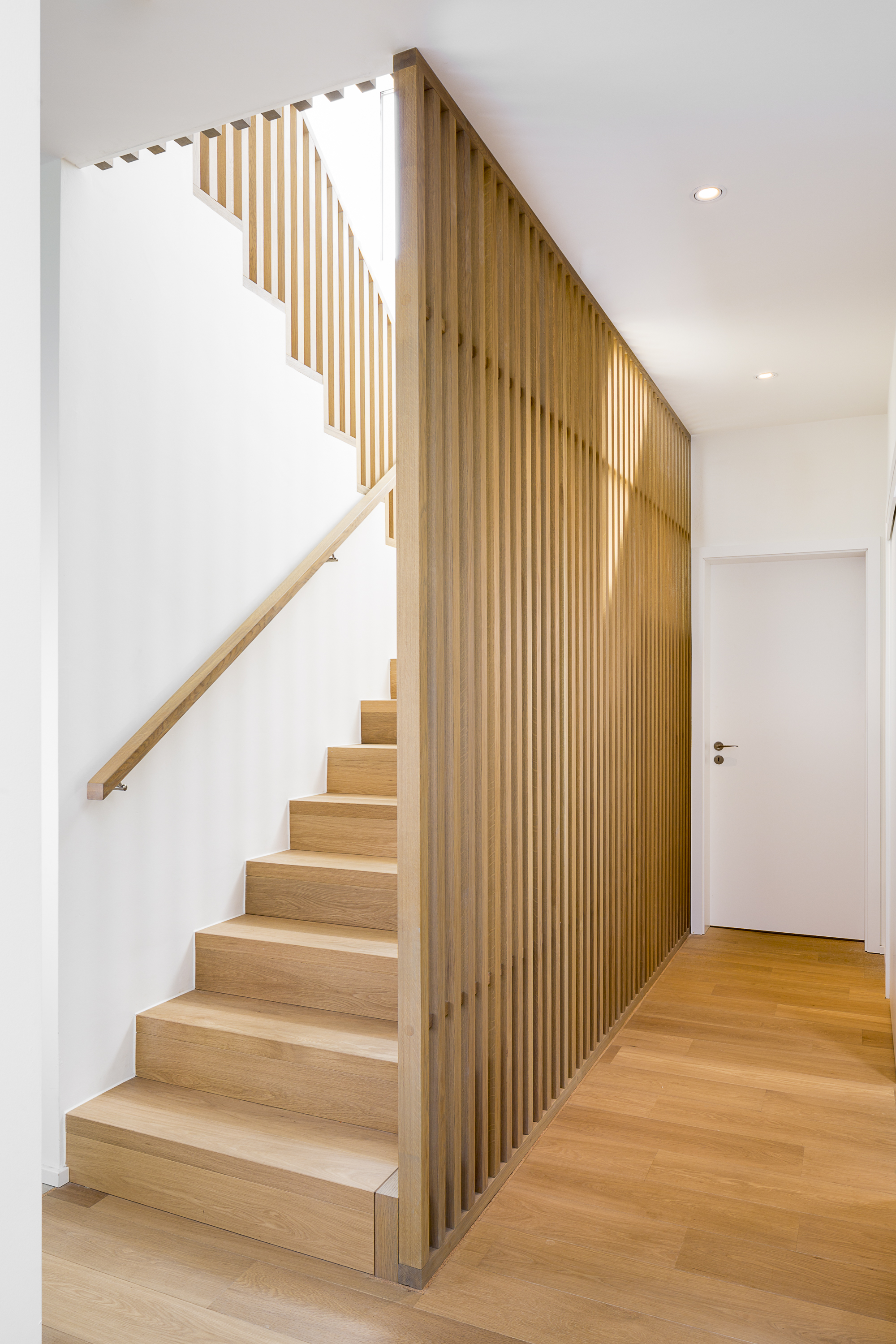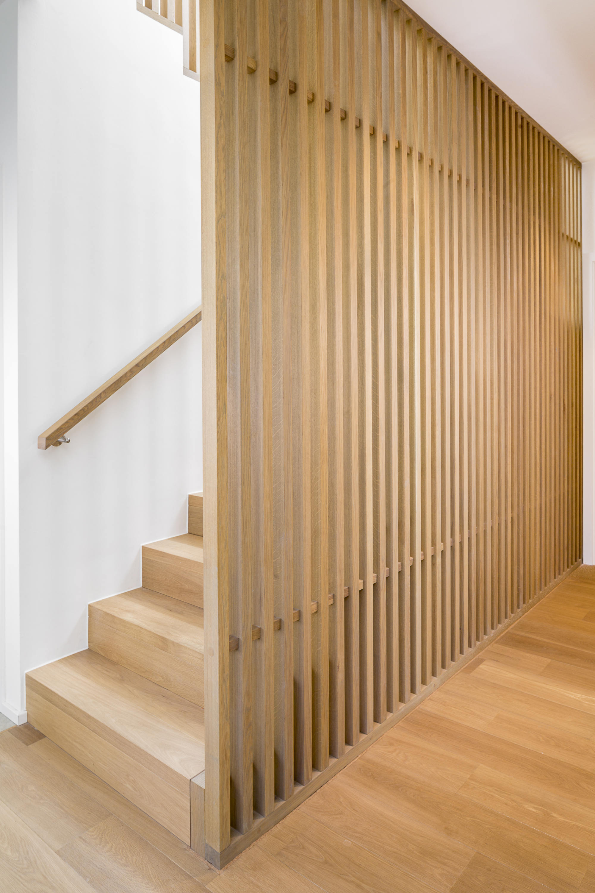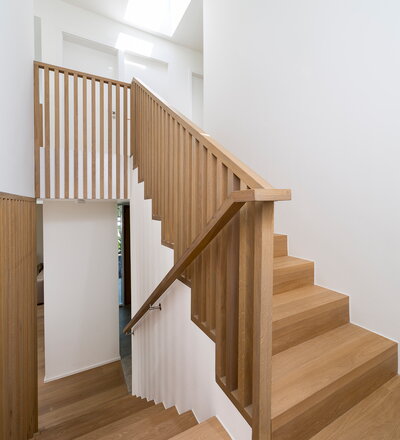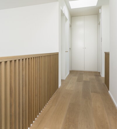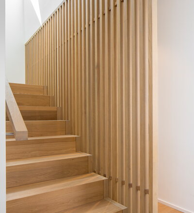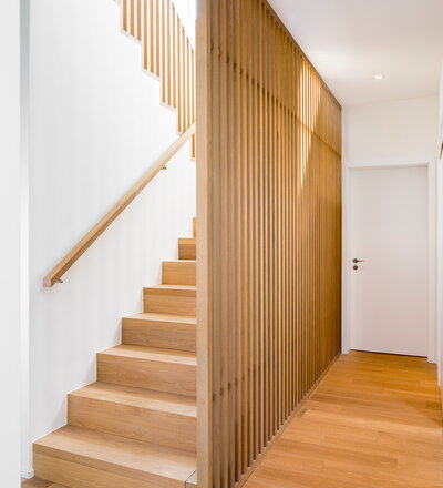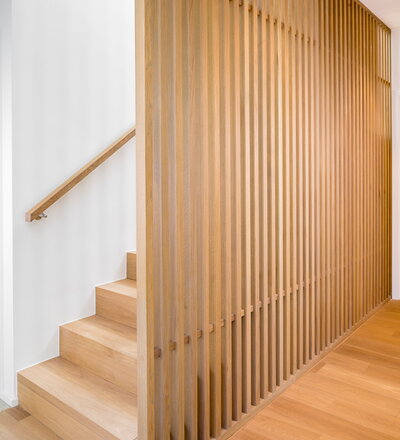 Betonstufenbelegung in der Holzart Eiche geölt, Brüstungsgeländer und Absturzsicherung im asiatischen Stil Eiche geölt.