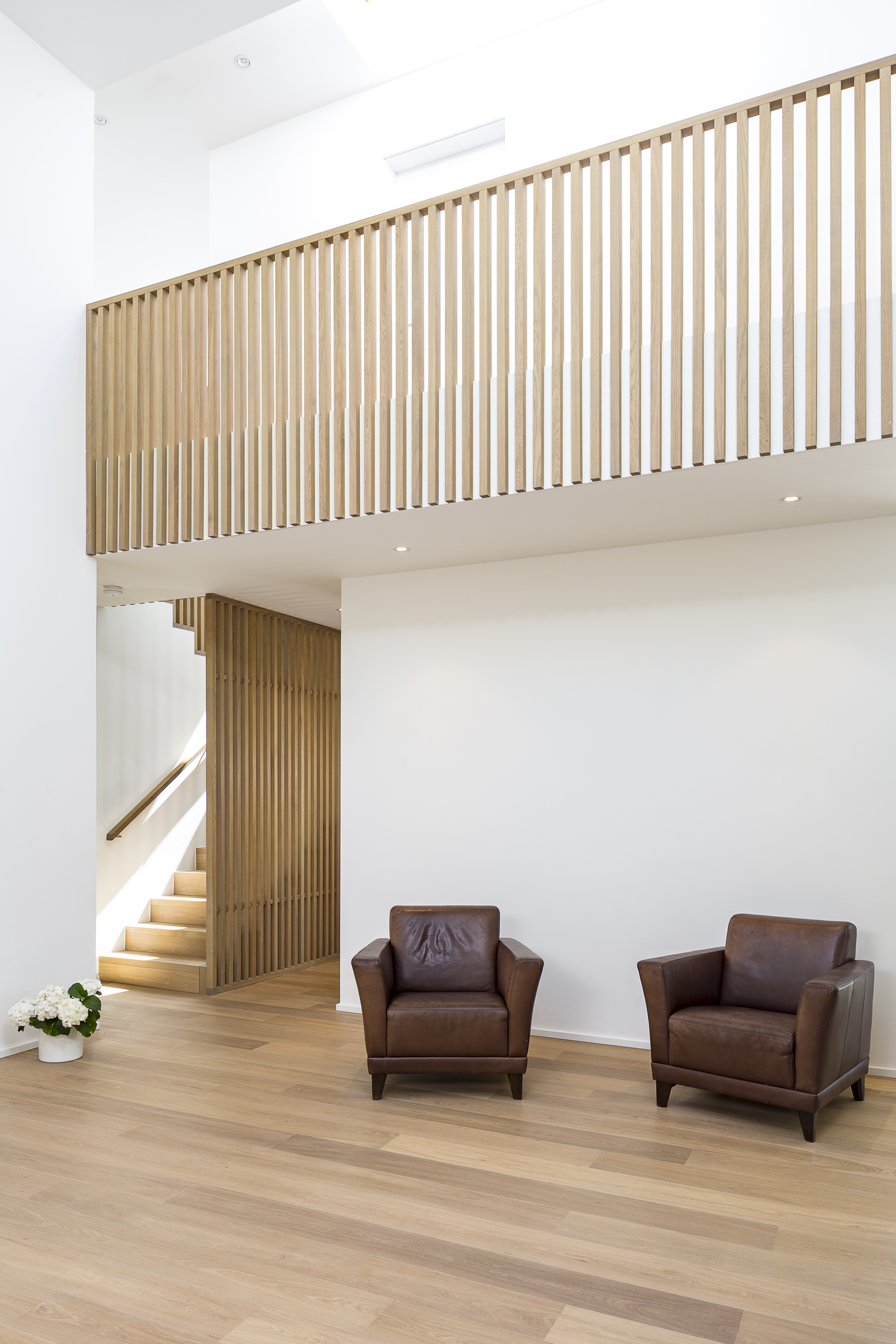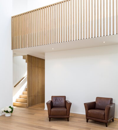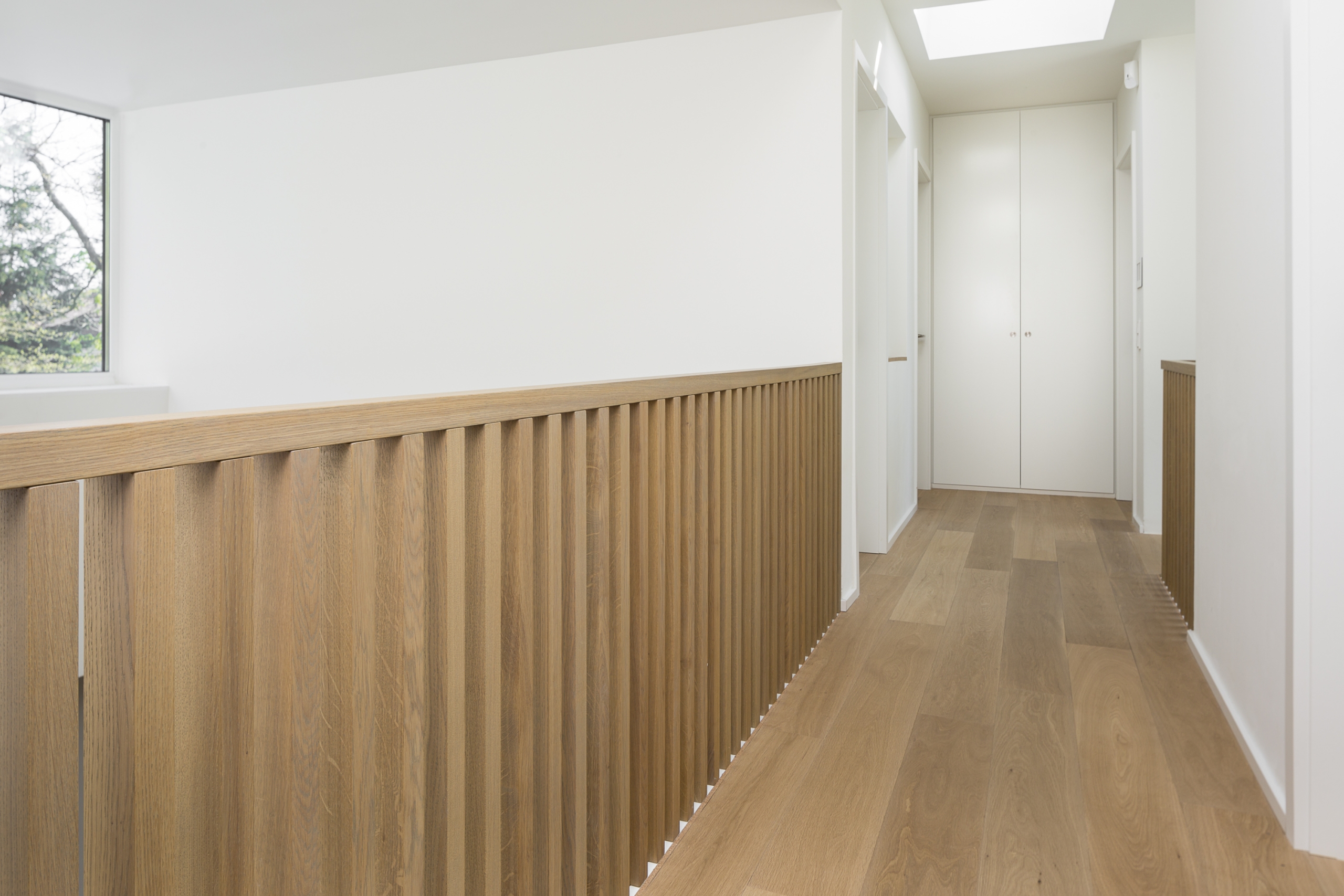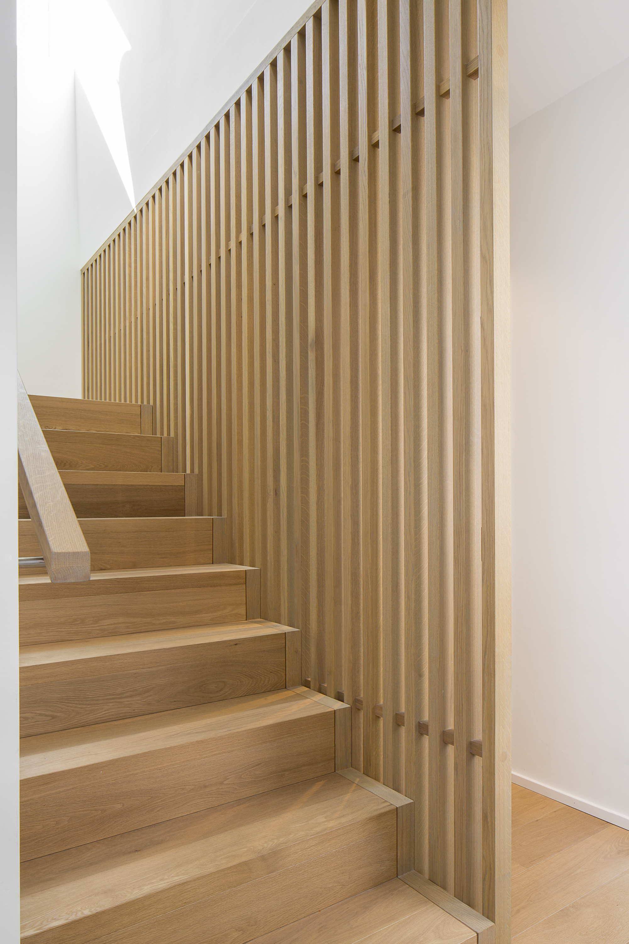 Betonstufenbelegung in der Holzart Eiche geölt, Brüstungsgeländer und Absturzsicherung im asiatischen Stil Eiche geölt.