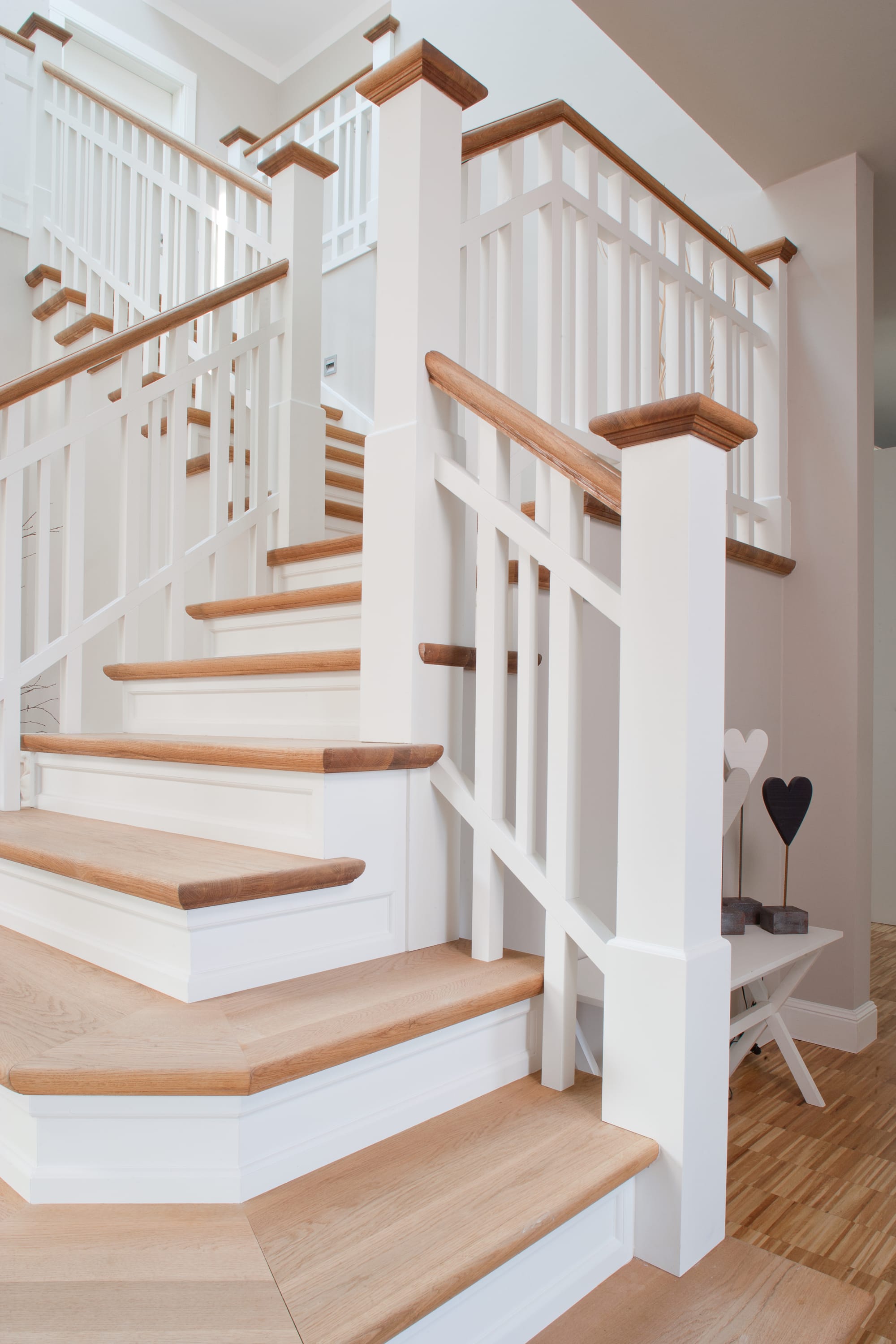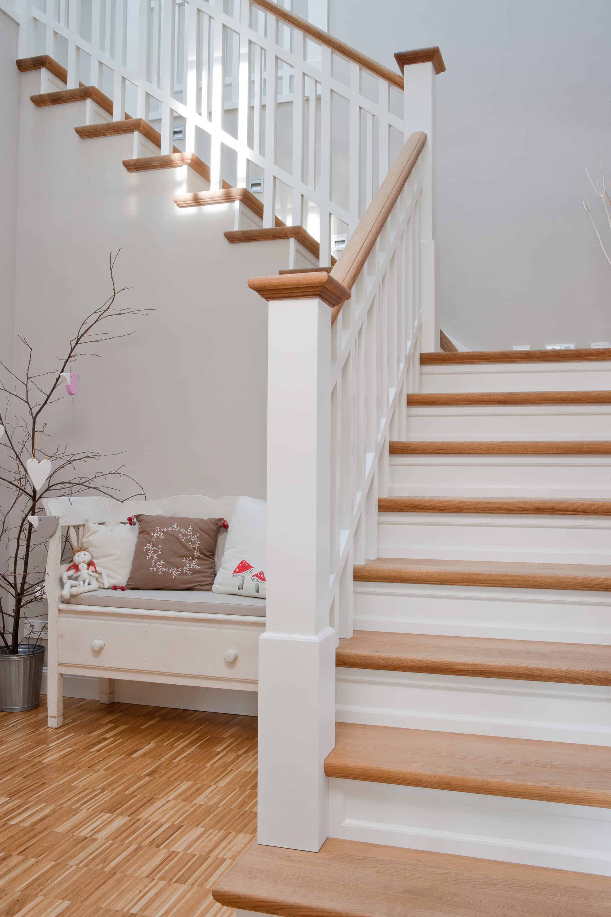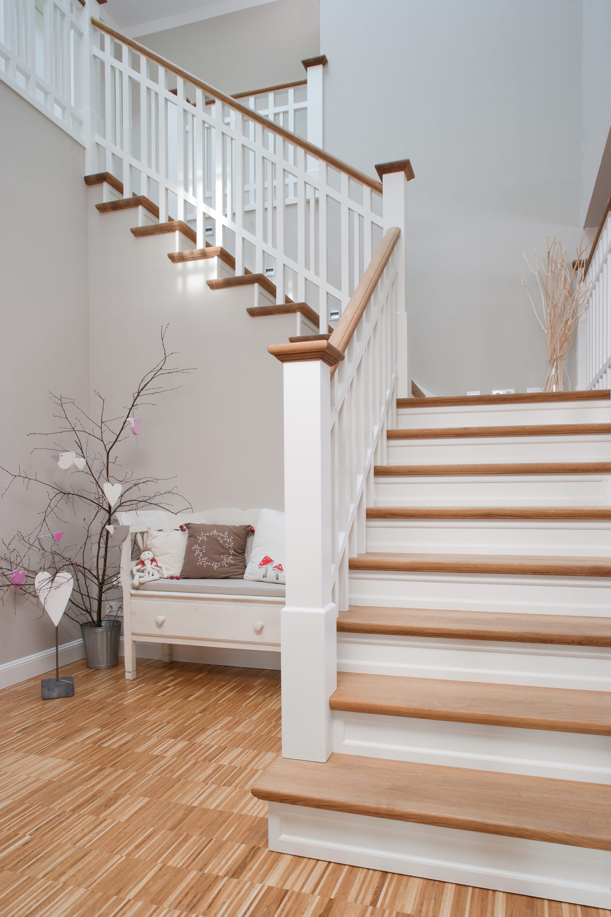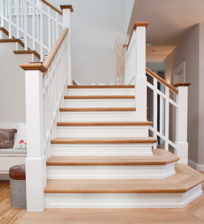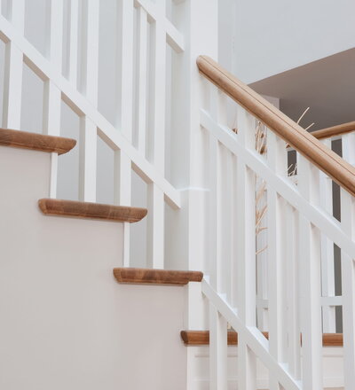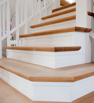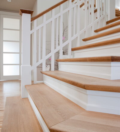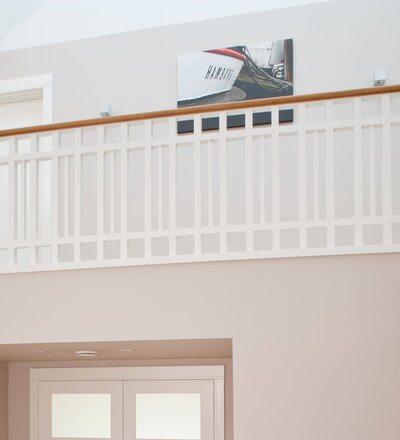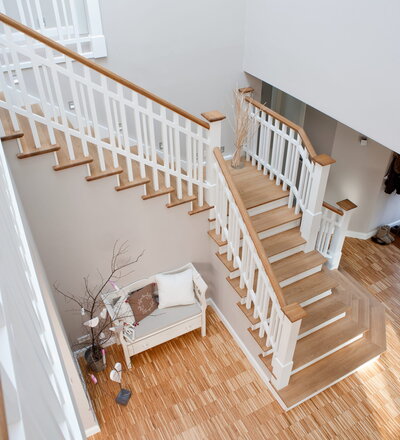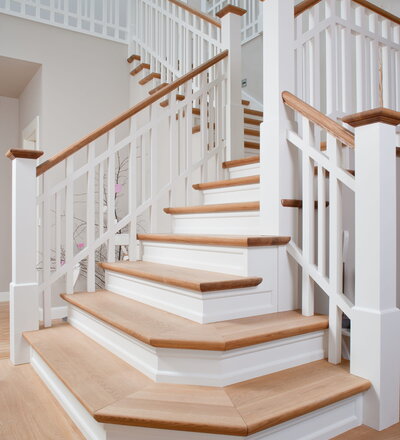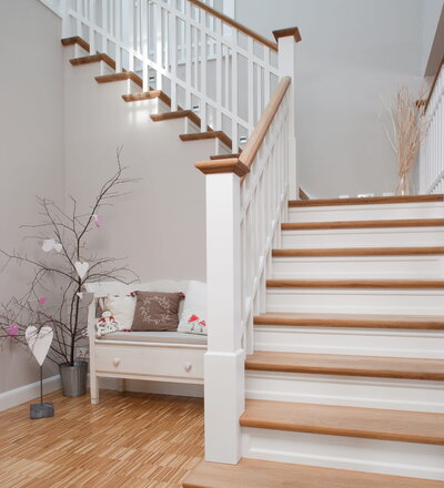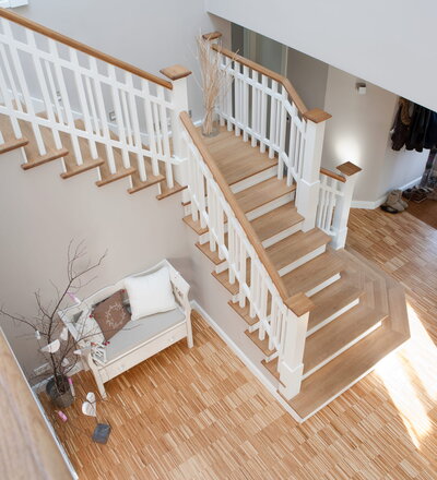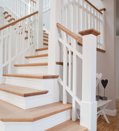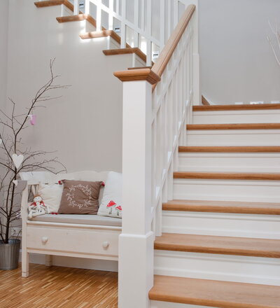 Steigegeländer und Stufenbelegung einer Betontreppe; Setzstufen mit aufgesetzten Profilleisten, aufwendig nach Kundenwunsch gestaltete Geländerkonstruktion