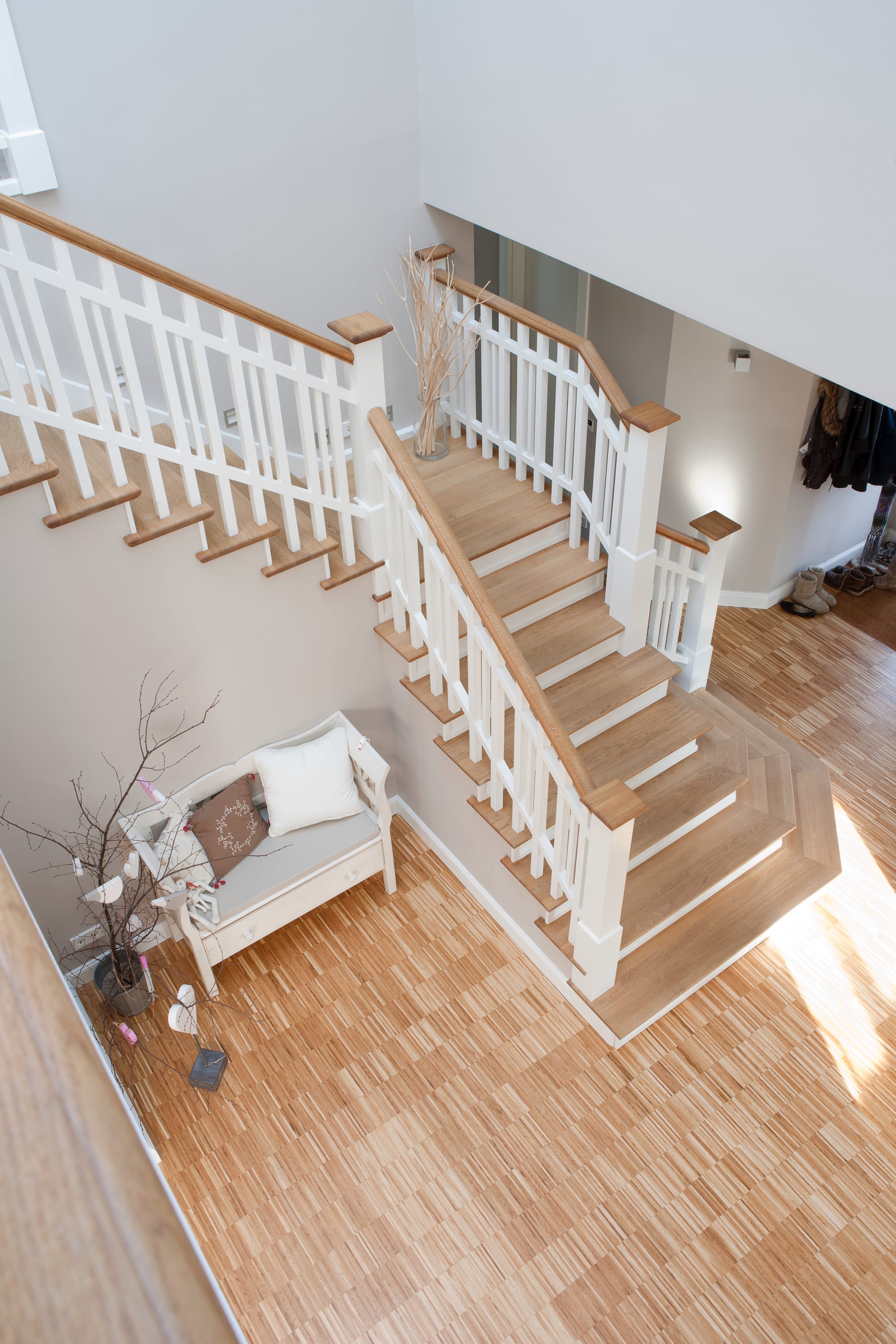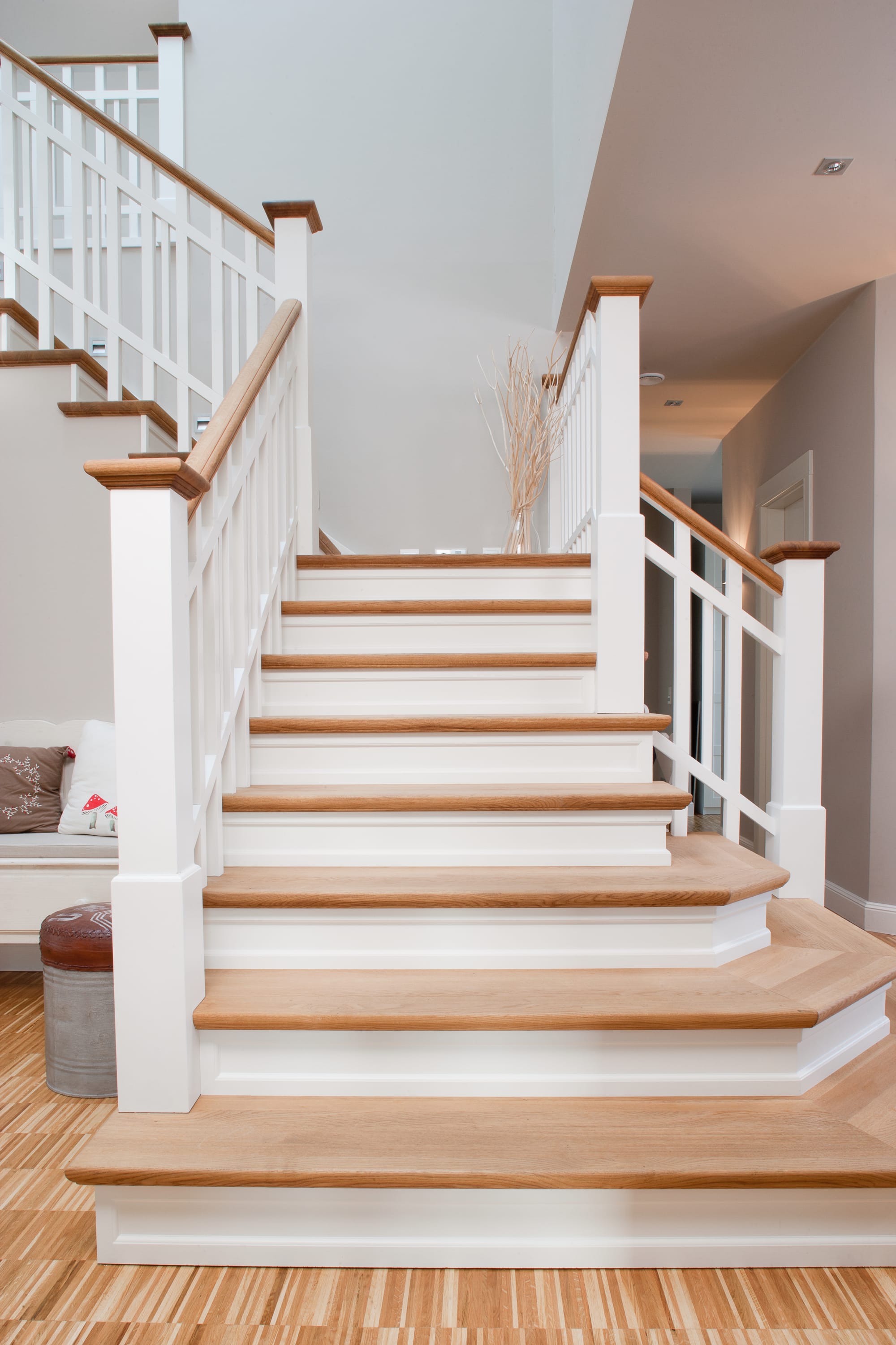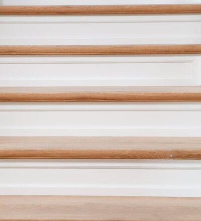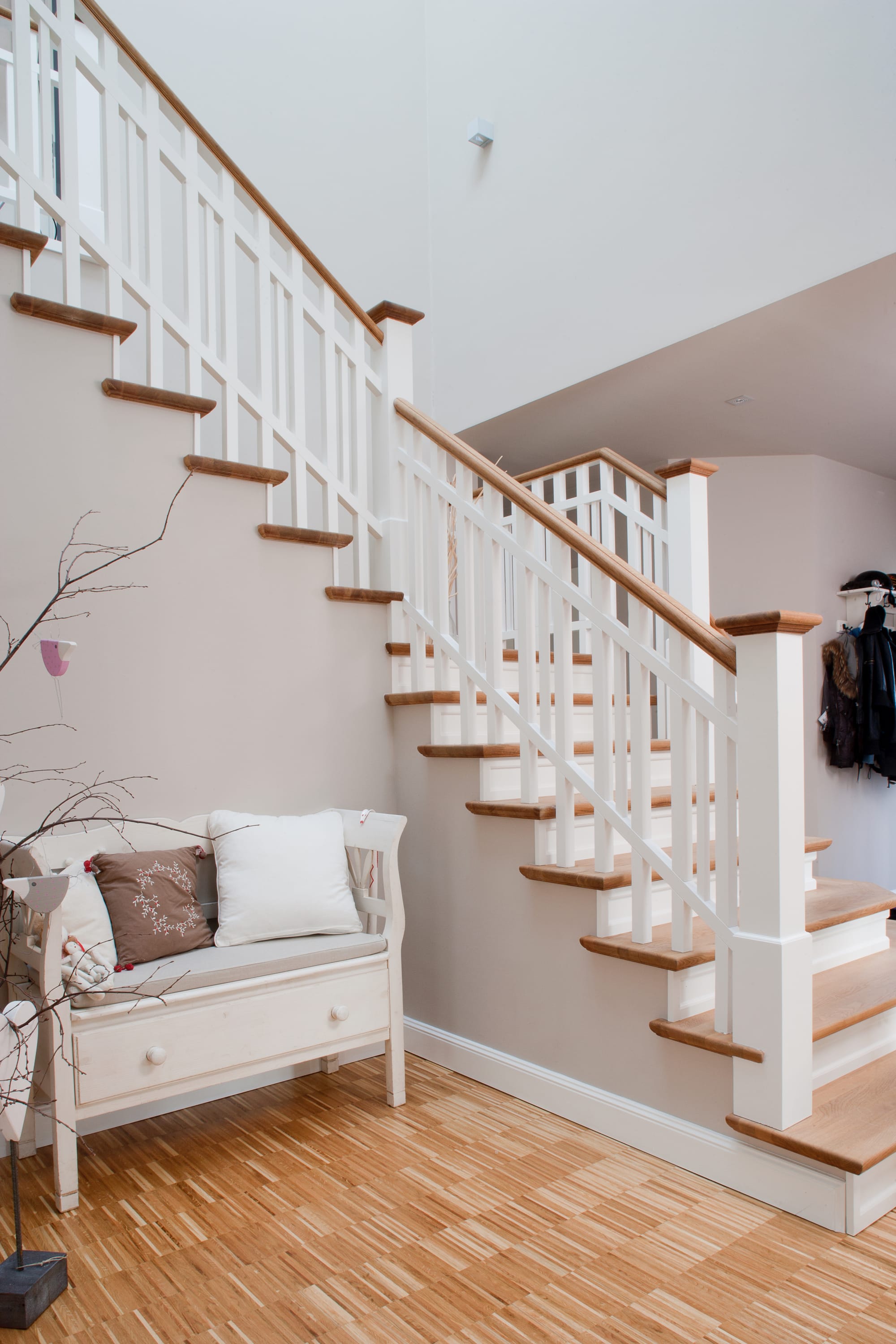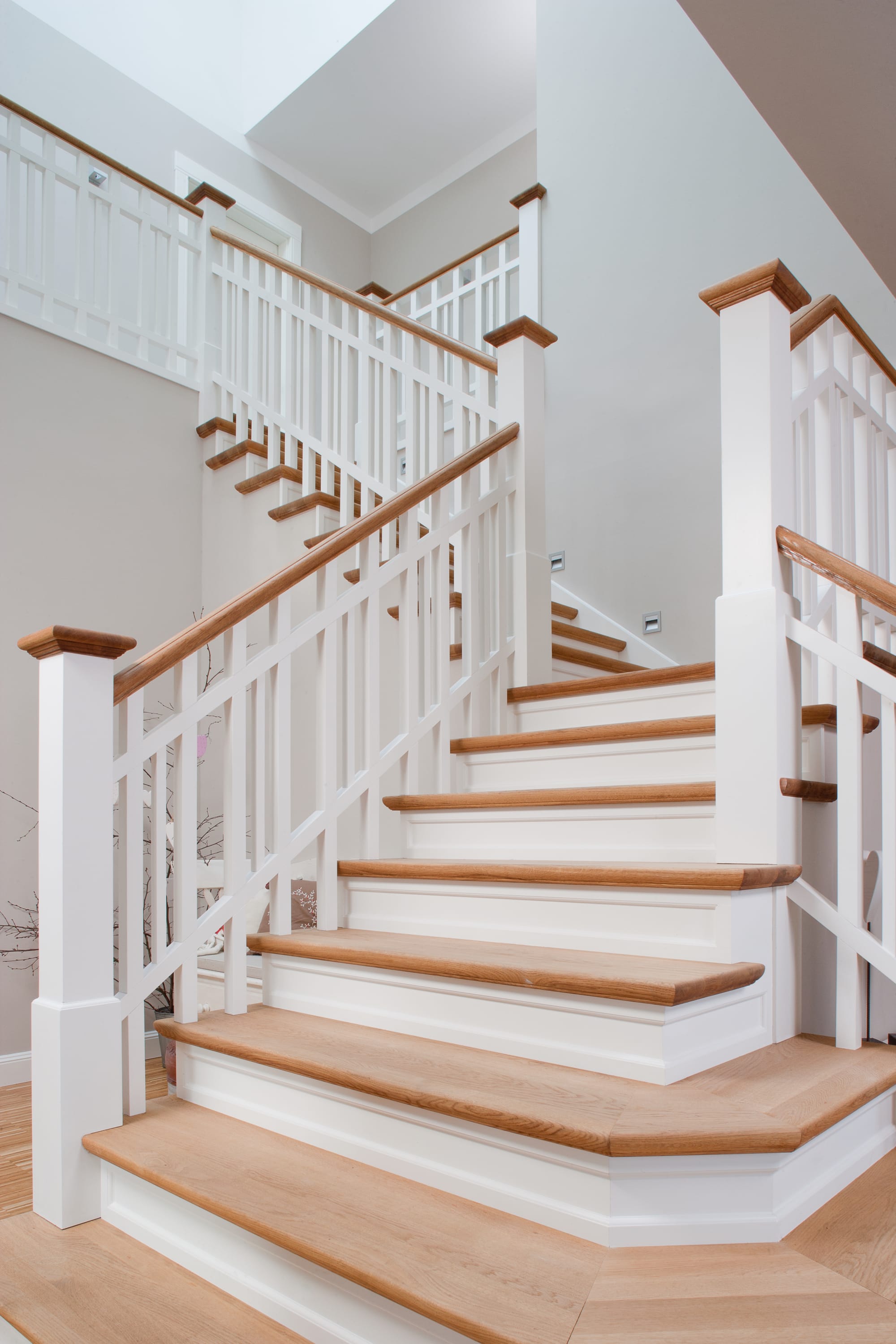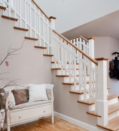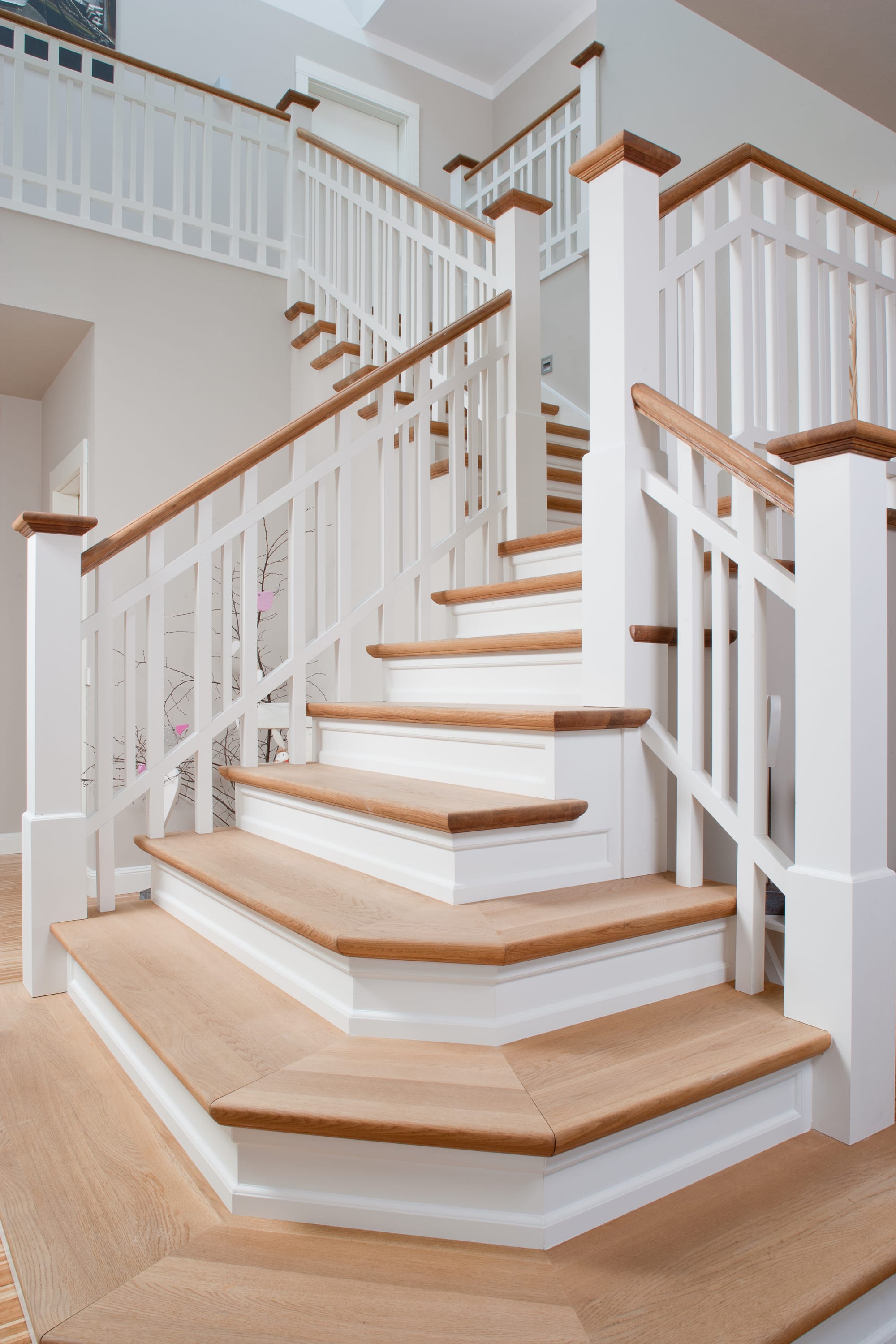 Steigegeländer und Stufenbelegung einer Betontreppe; Setzstufen mit aufgesetzten Profilleisten, aufwendig nach Kundenwunsch gestaltete Geländerkonstruktion