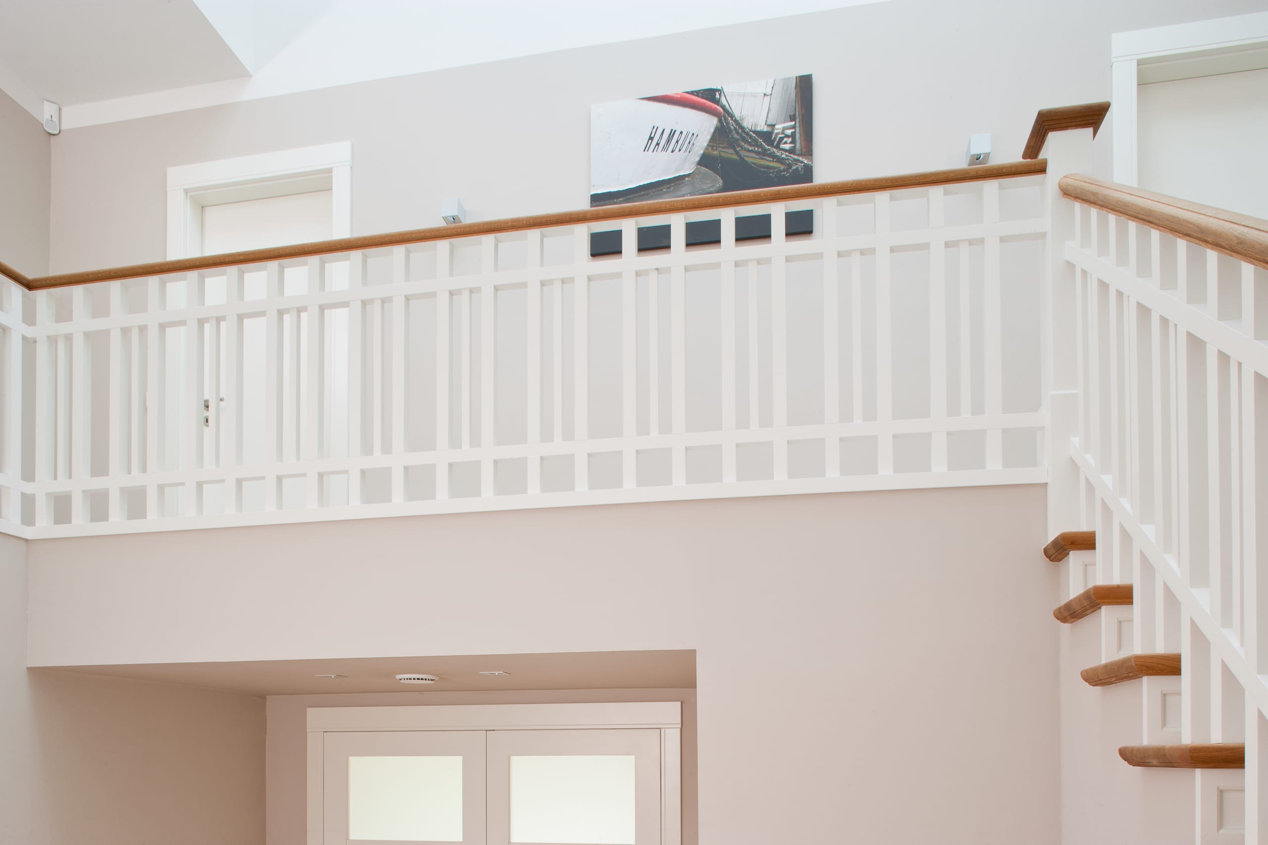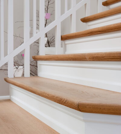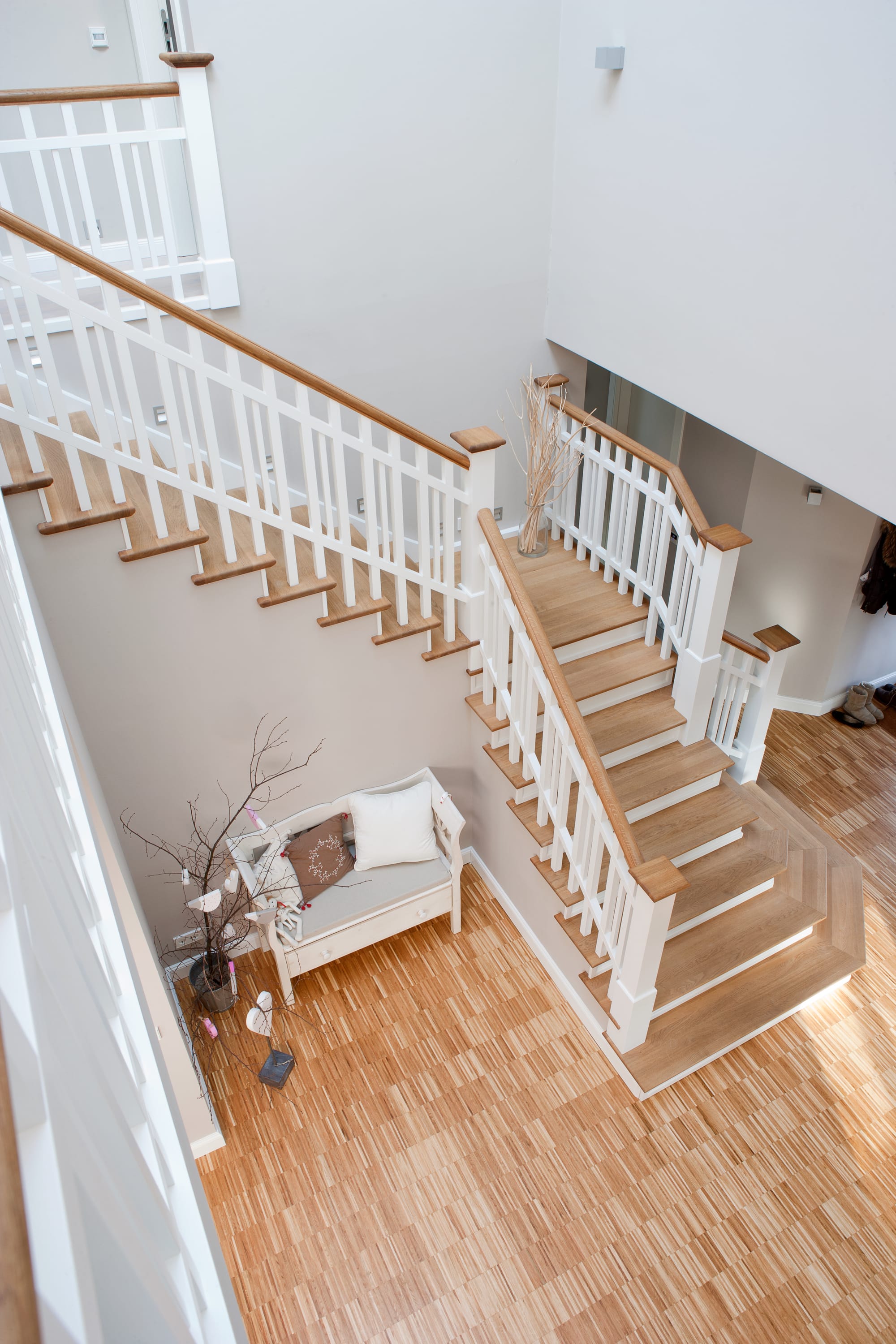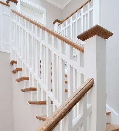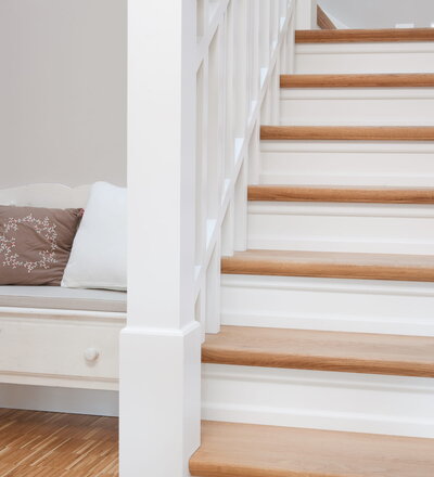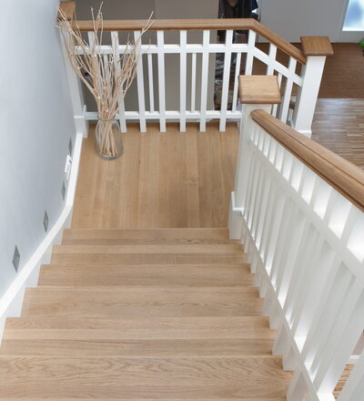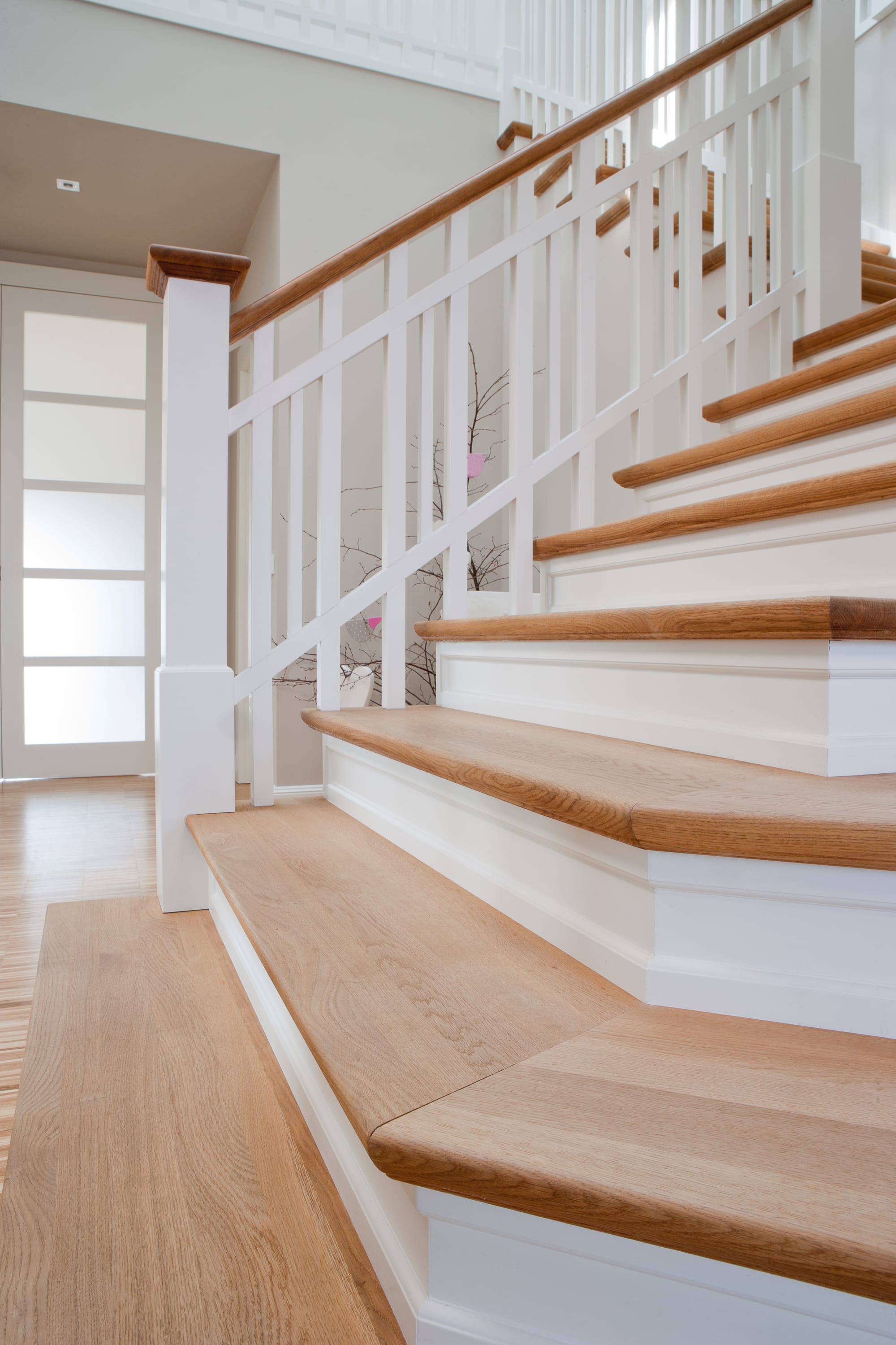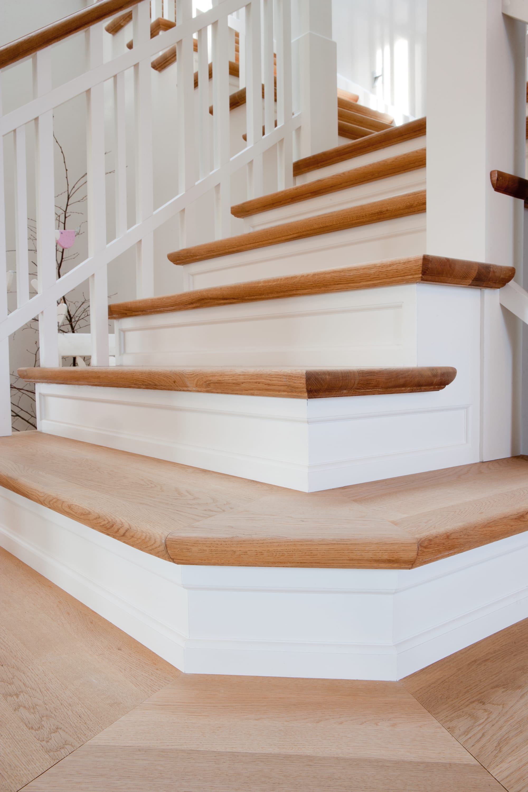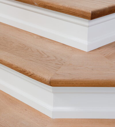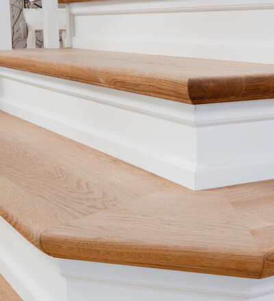 Steigegeländer und Stufenbelegung einer Betontreppe; Setzstufen mit aufgesetzten Profilleisten, aufwendig nach Kundenwunsch gestaltete Geländerkonstruktion