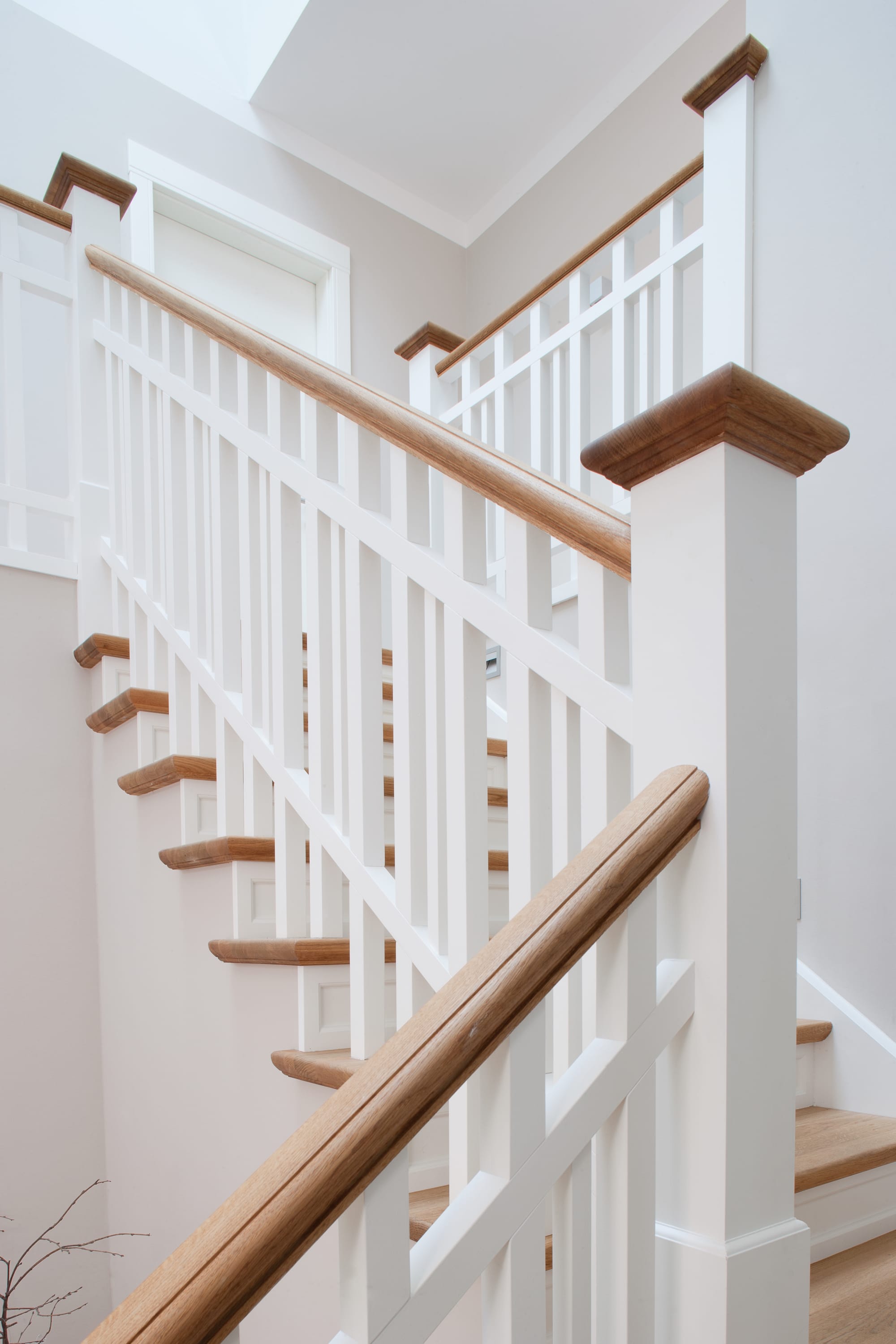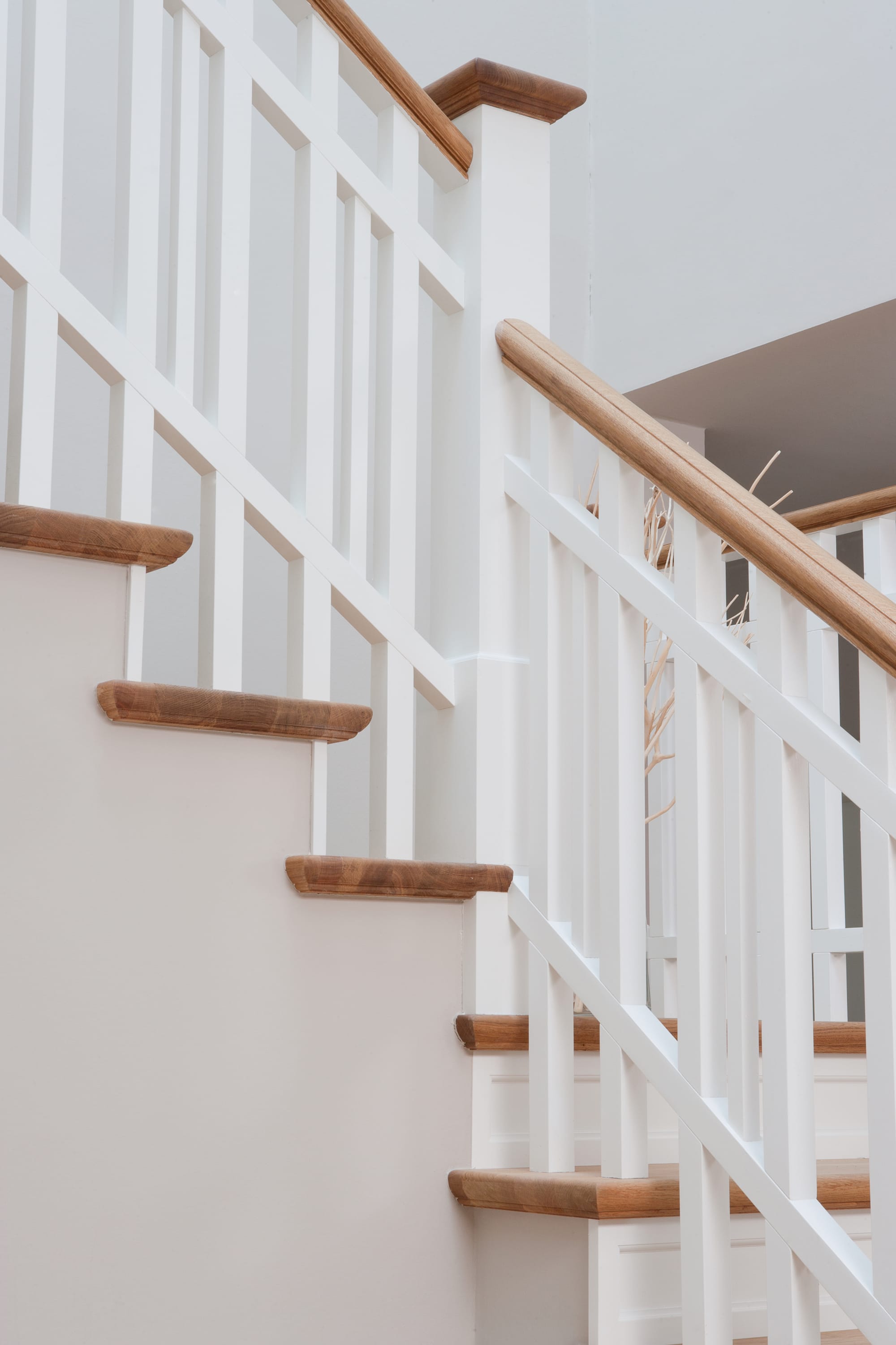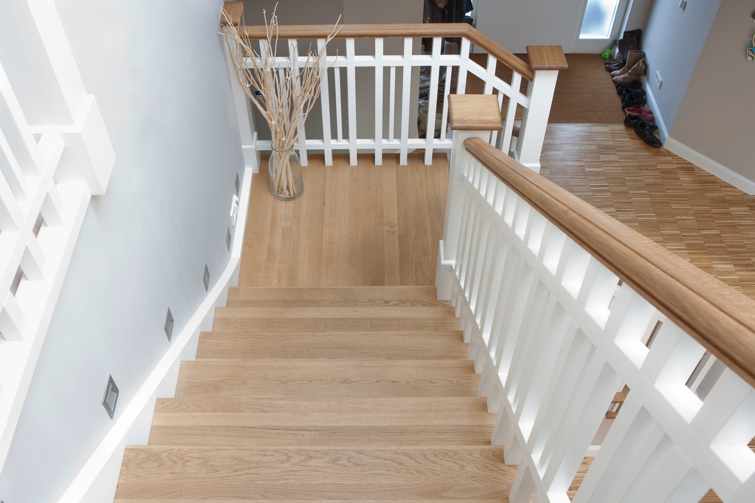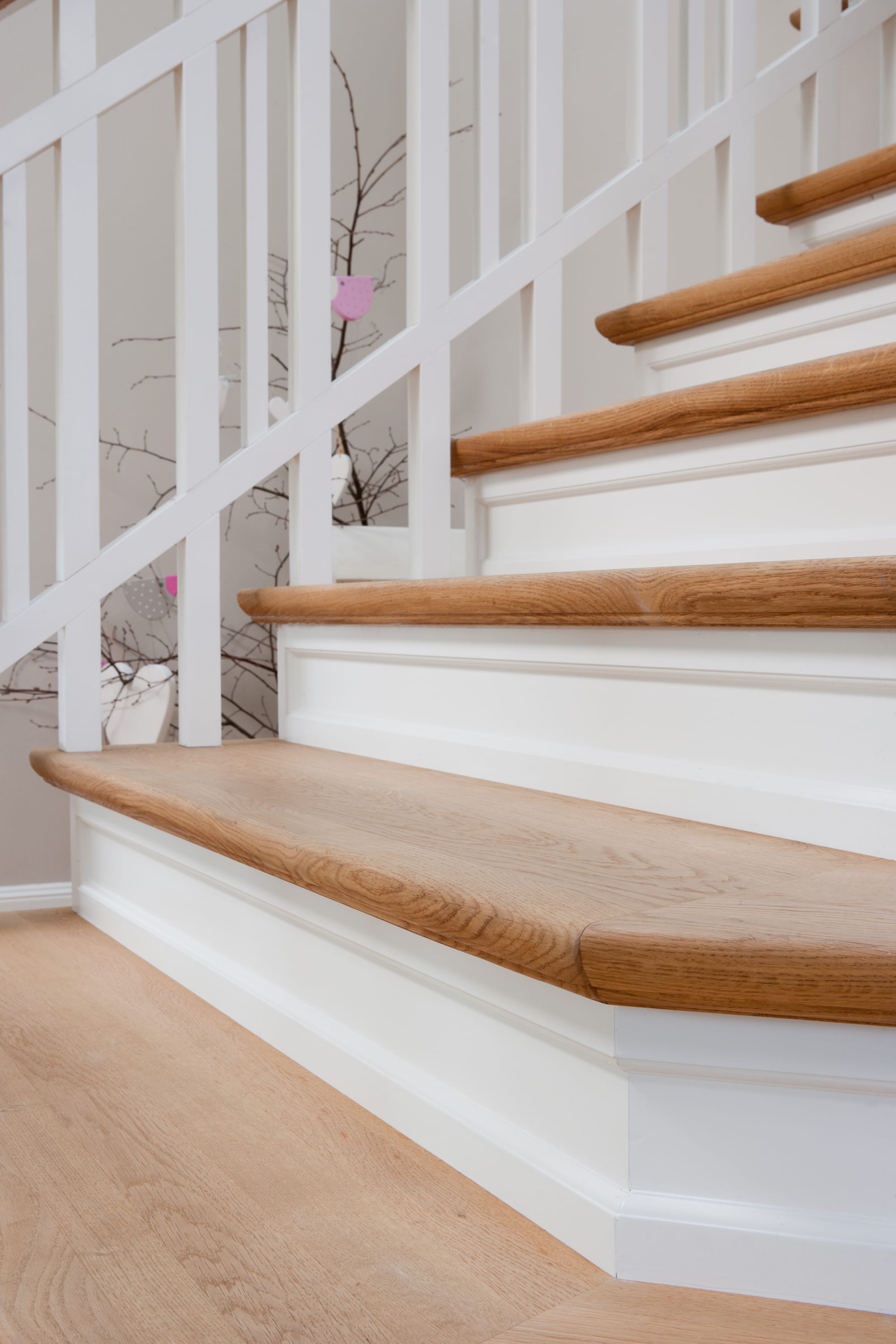 Steigegeländer und Stufenbelegung einer Betontreppe; Setzstufen mit aufgesetzten Profilleisten, aufwendig nach Kundenwunsch gestaltete Geländerkonstruktion