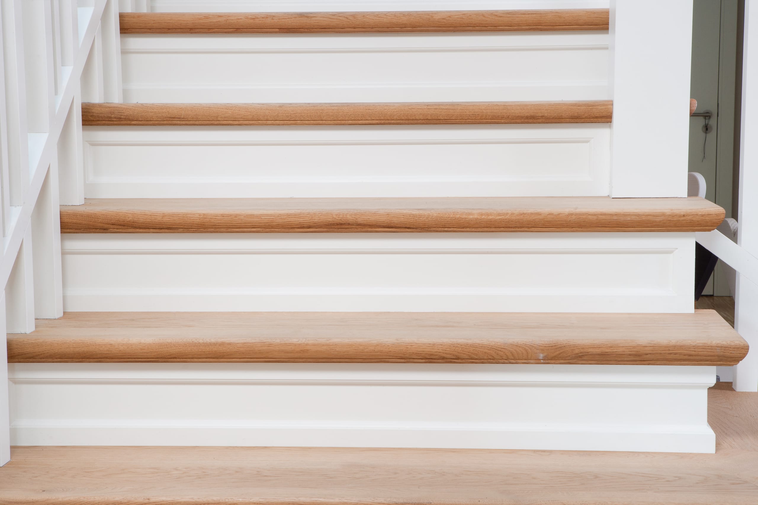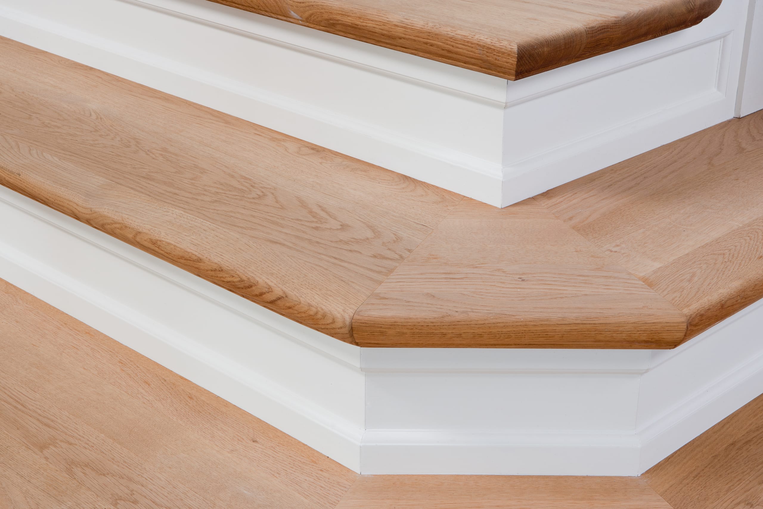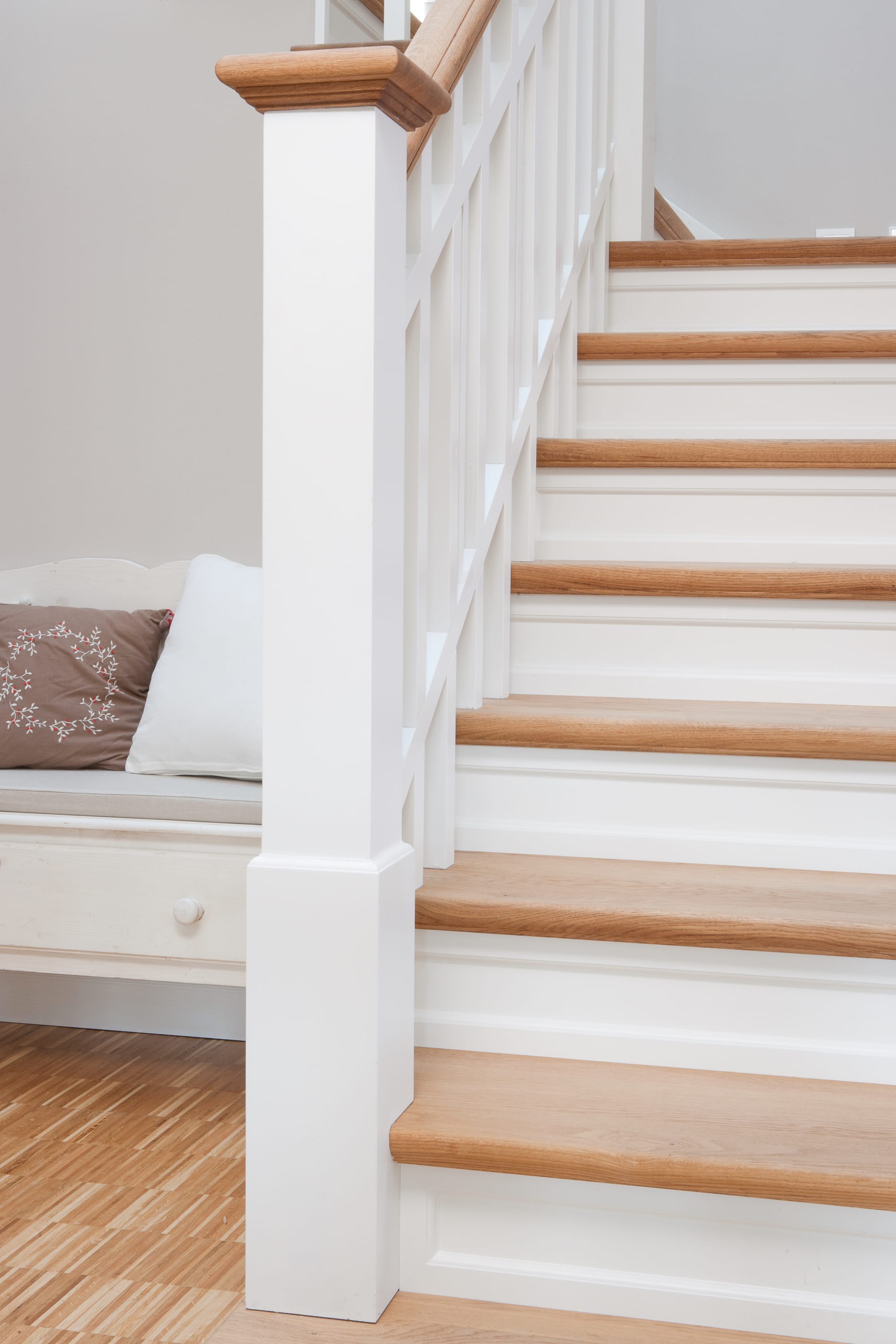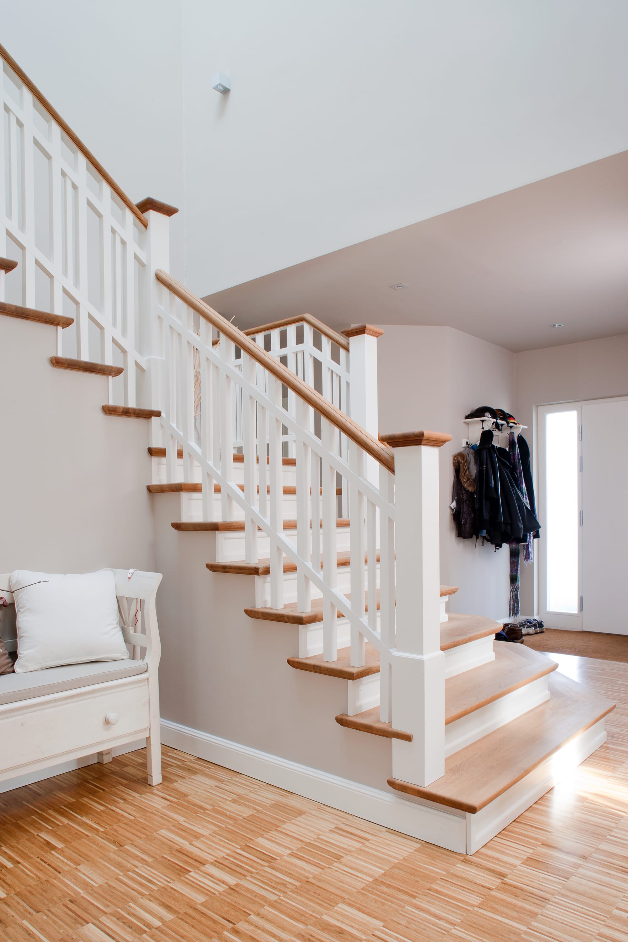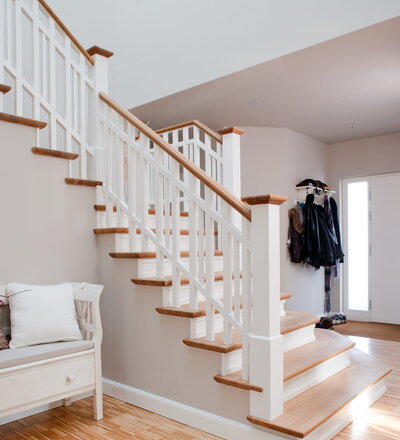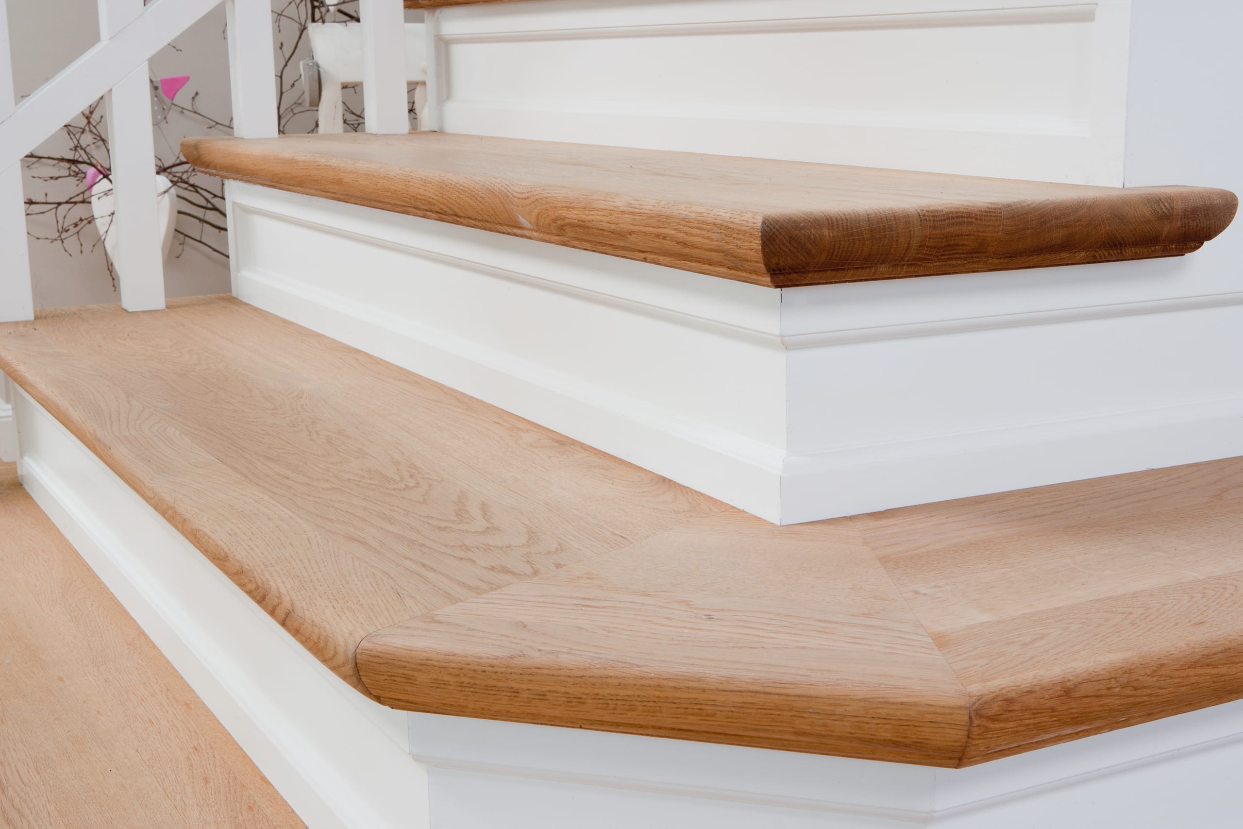 Steigegeländer und Stufenbelegung einer Betontreppe; Setzstufen mit aufgesetzten Profilleisten, aufwendig nach Kundenwunsch gestaltete Geländerkonstruktion