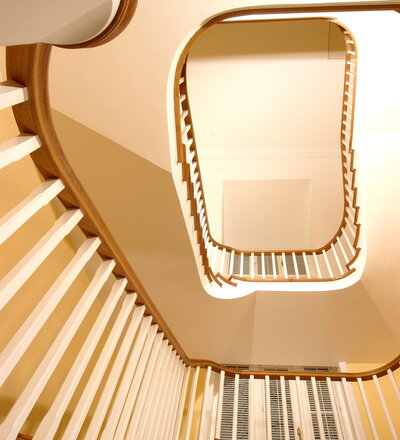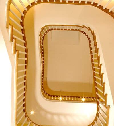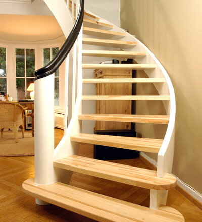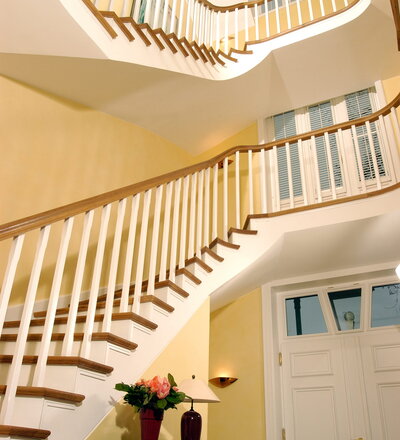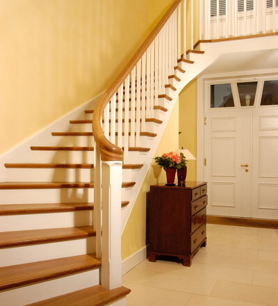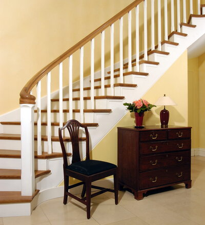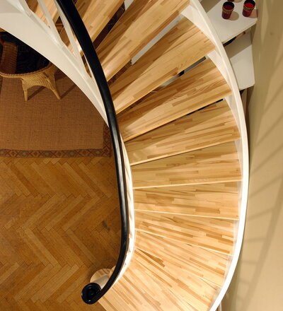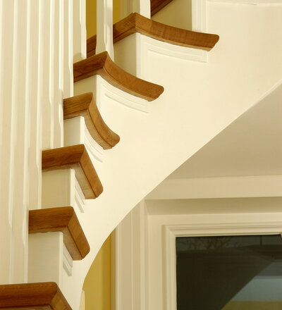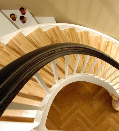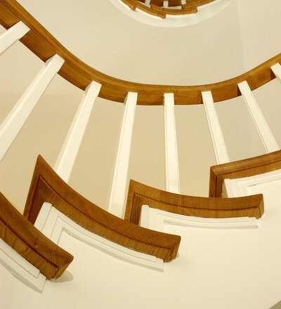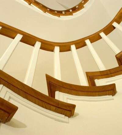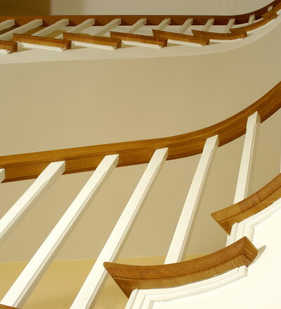 Steigegeländer und Trittstufenbelegung einer Betontreppenanlage; Handlauf am Antrittspfosten als Schnecke auslaufend; Holzart Eiche