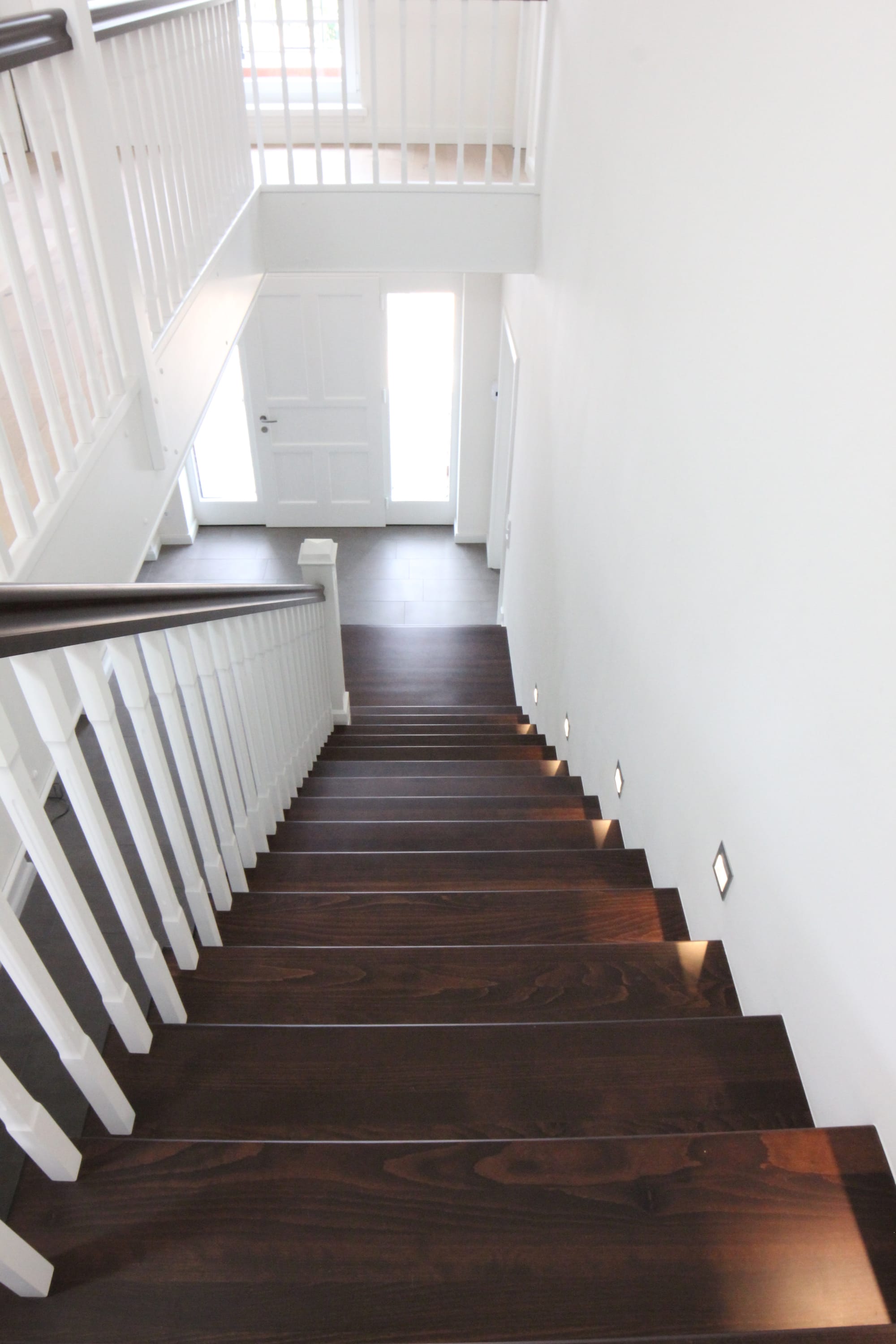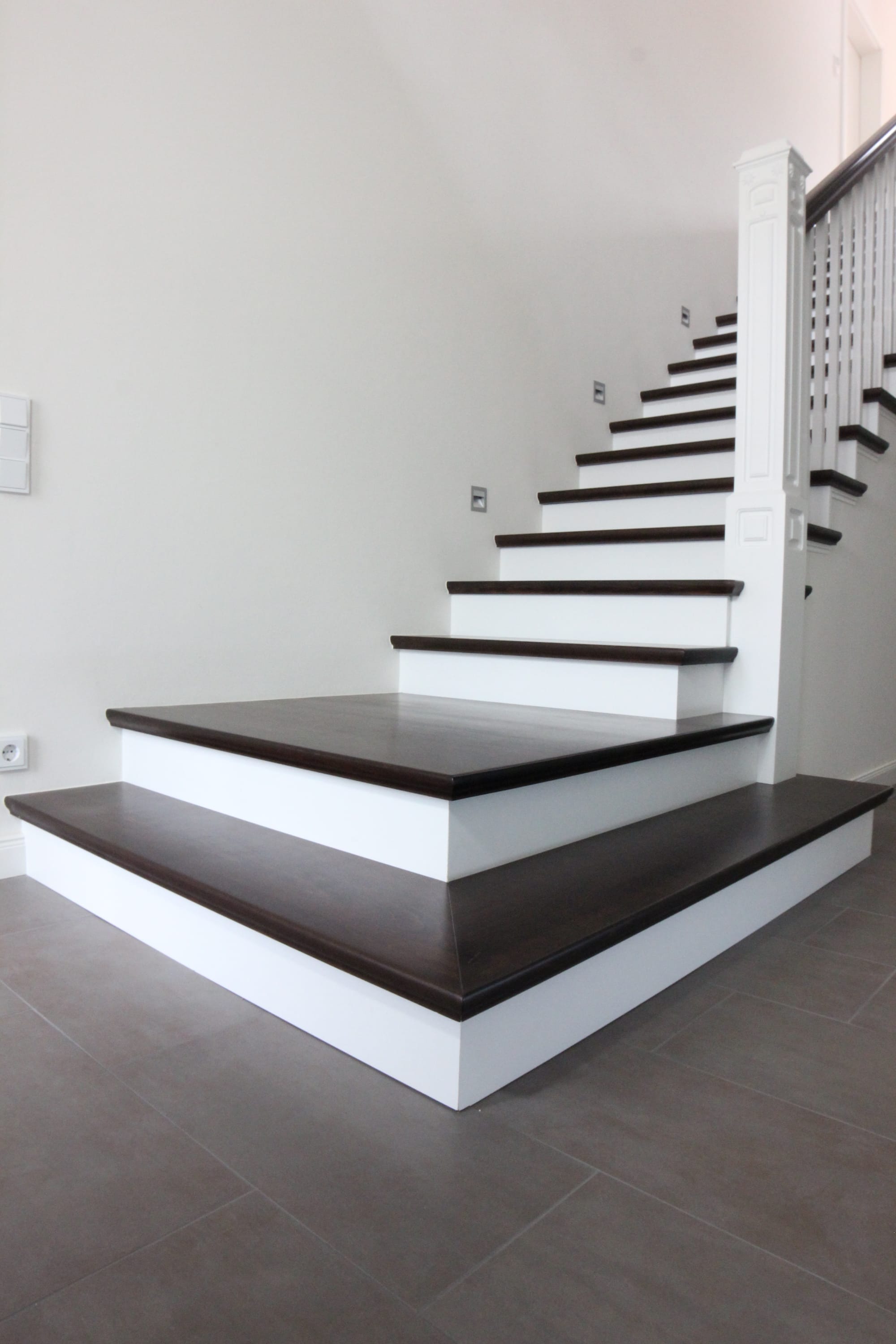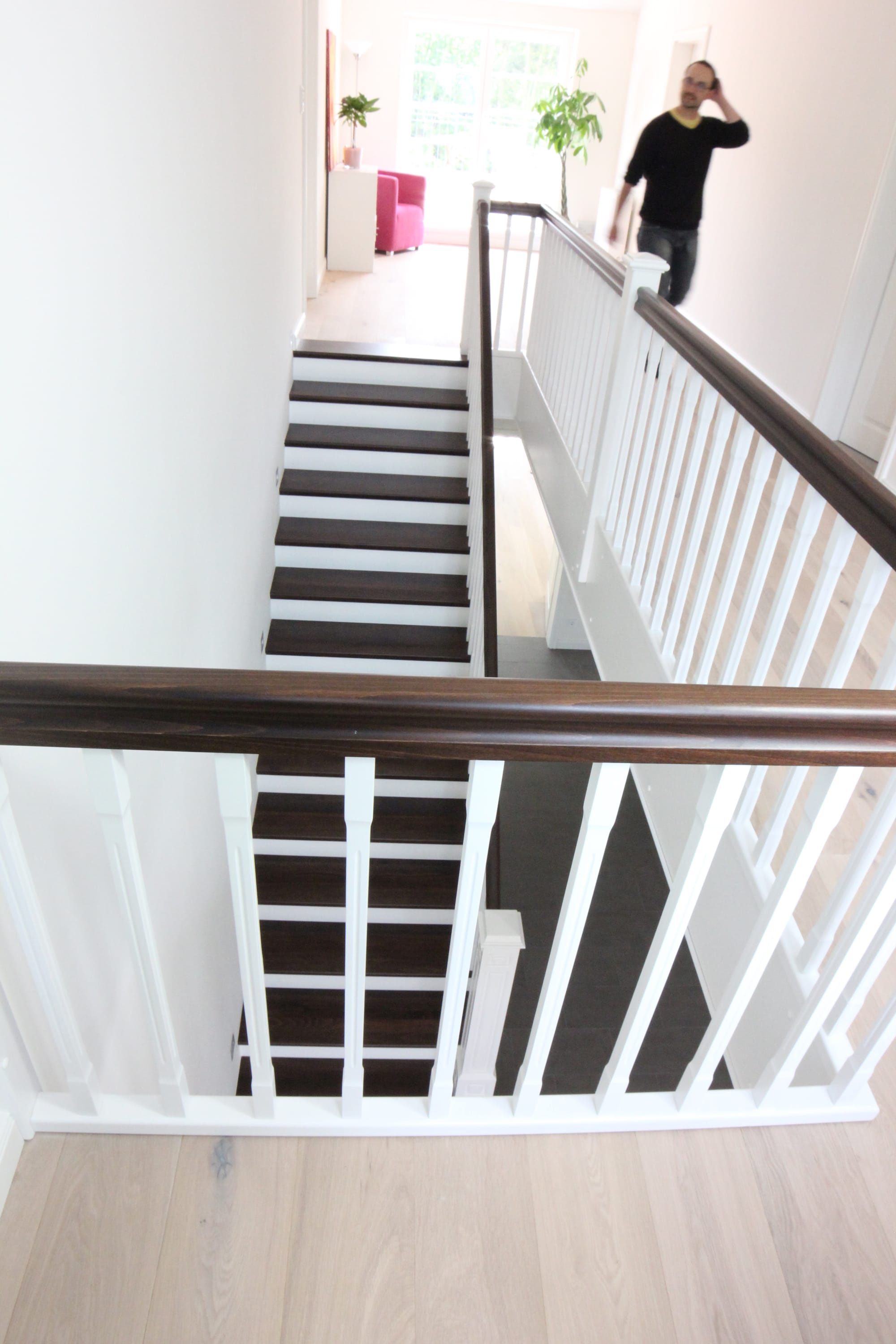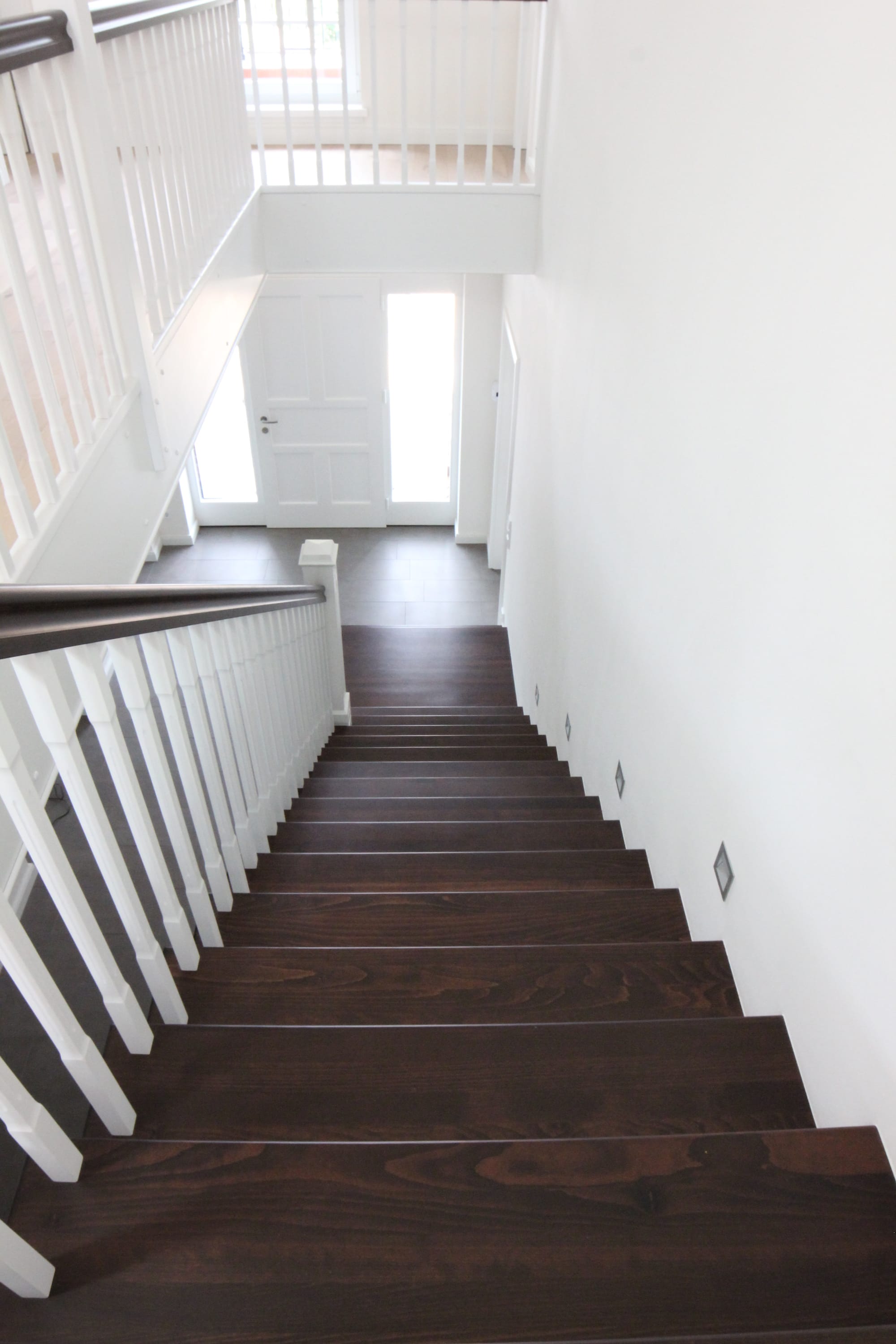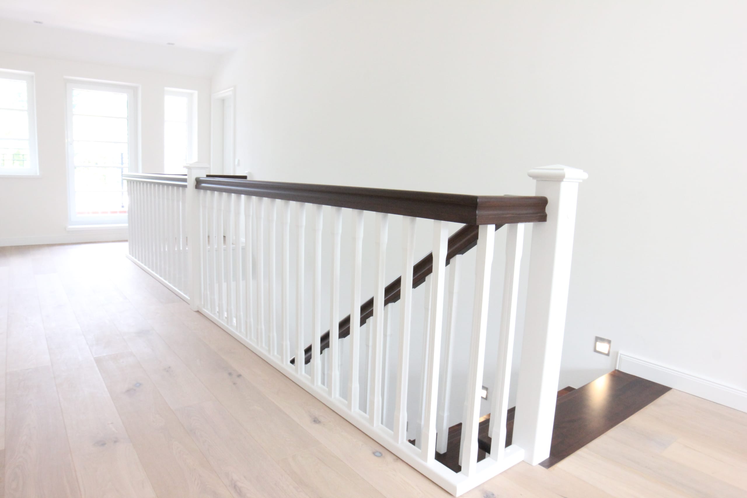 Betontreppenbelegung mit Antrittspodest; Stufen und Handlauf Holzart Buche mosaik auf Nußbaum dunkel gebeizt; Setzstufen, Pfosten (PF7) und Stäbe (EN3) Whitewood weiß endlackiert, Galeriegeländer.