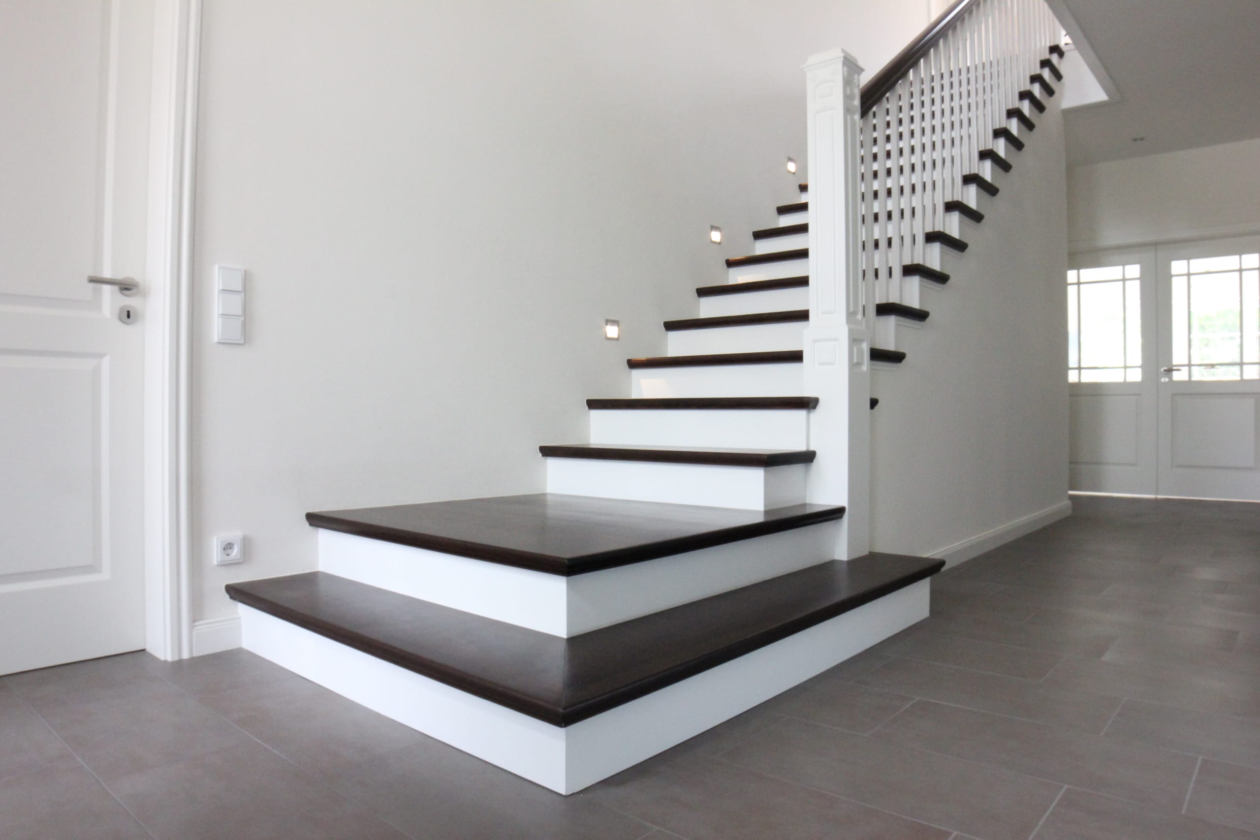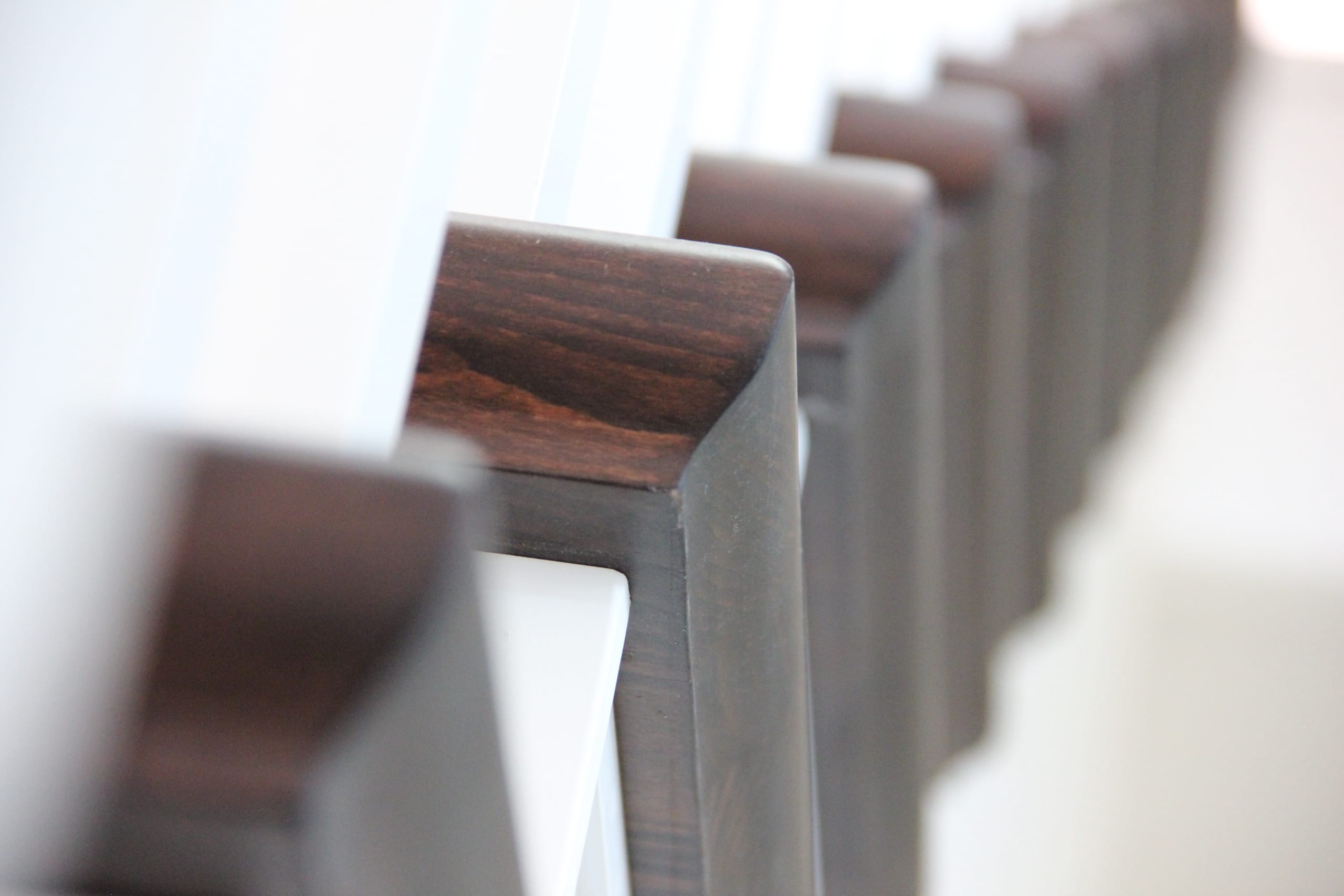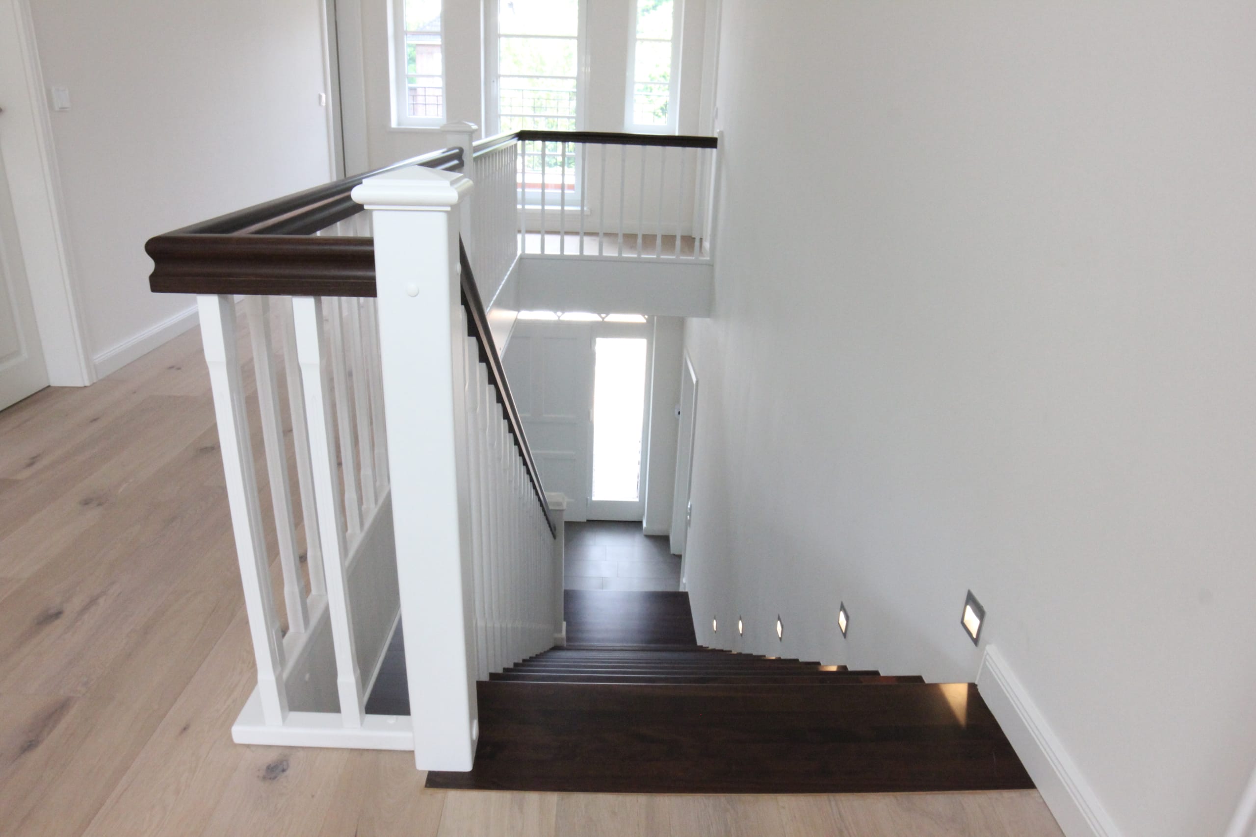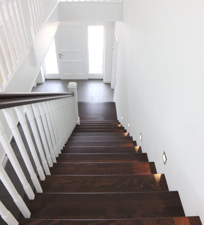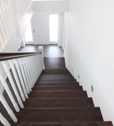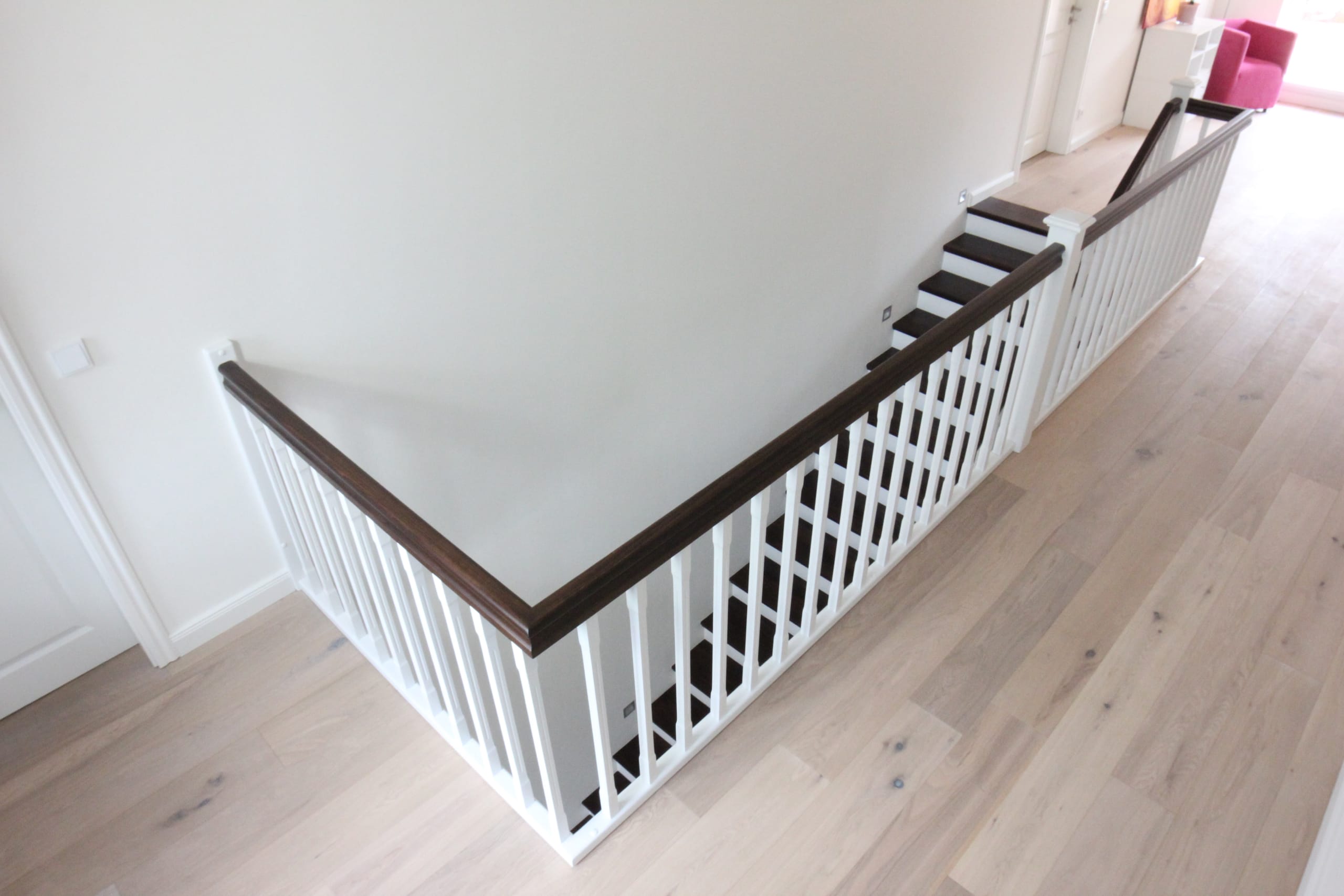 Betontreppenbelegung mit Antrittspodest; Stufen und Handlauf Holzart Buche mosaik auf Nußbaum dunkel gebeizt; Setzstufen, Pfosten (PF7) und Stäbe (EN3) Whitewood weiß endlackiert, Galeriegeländer.