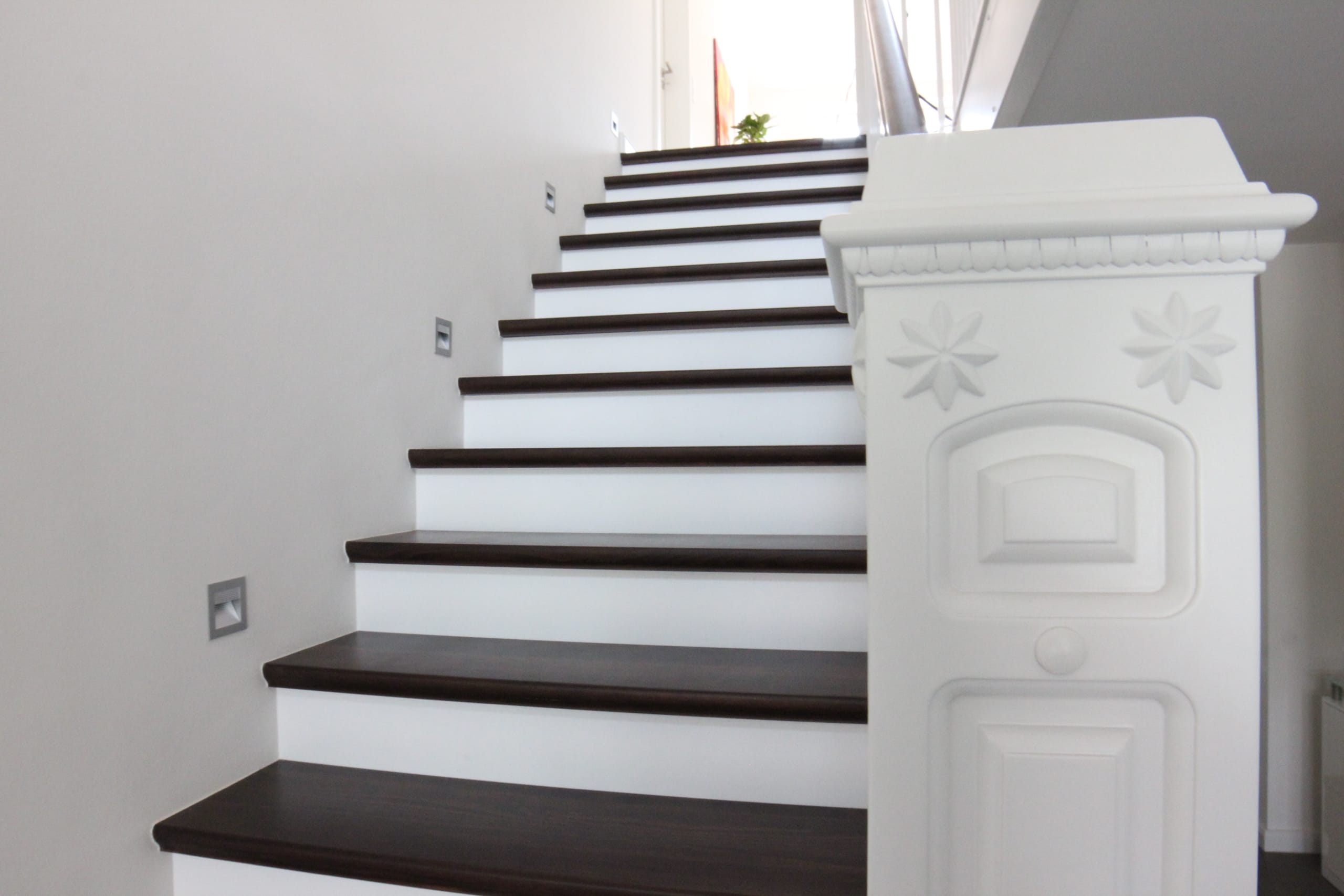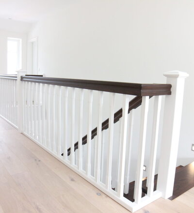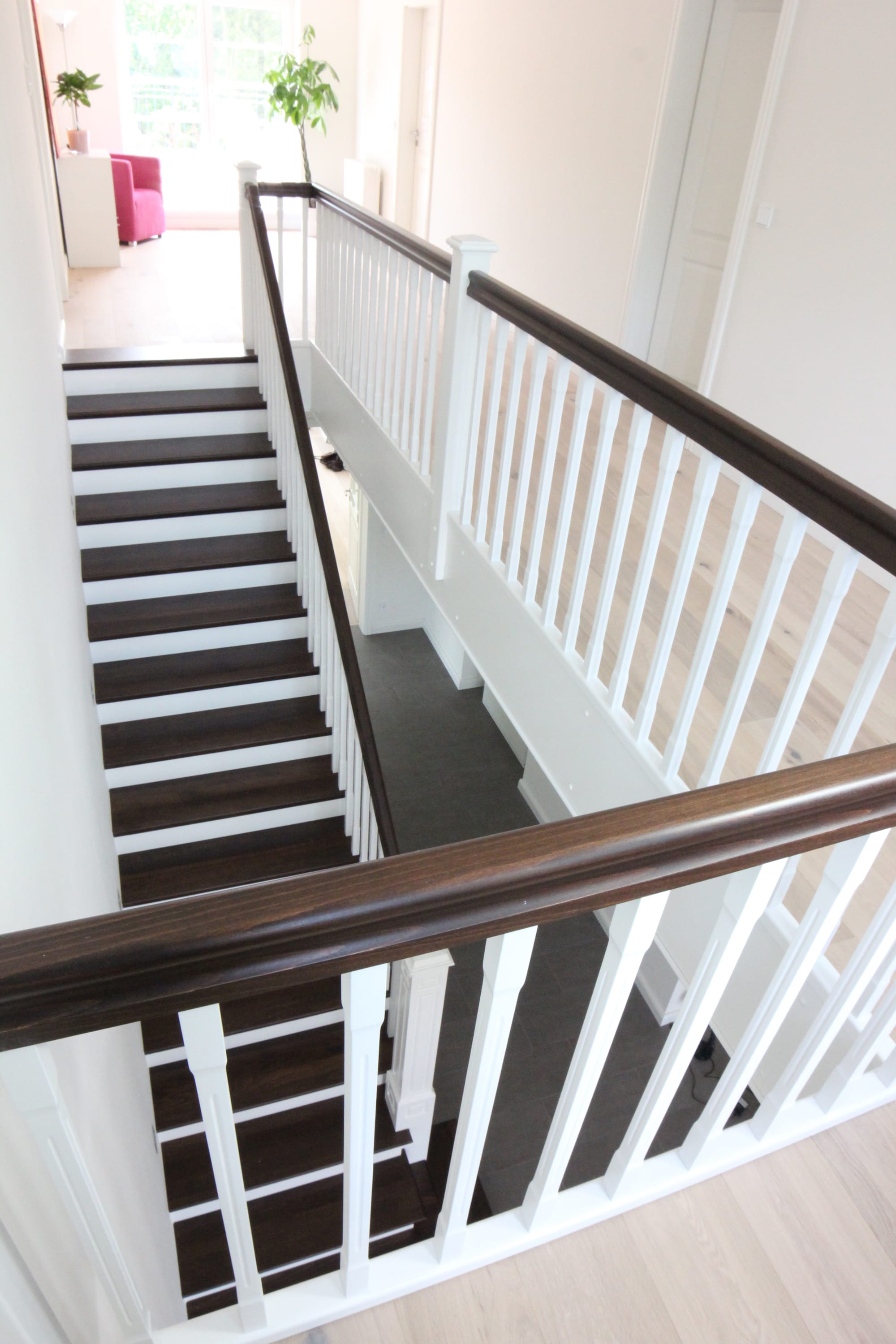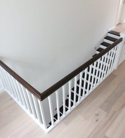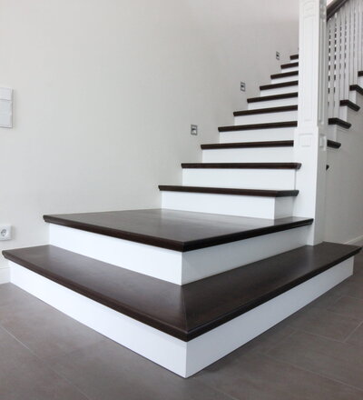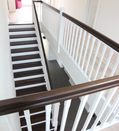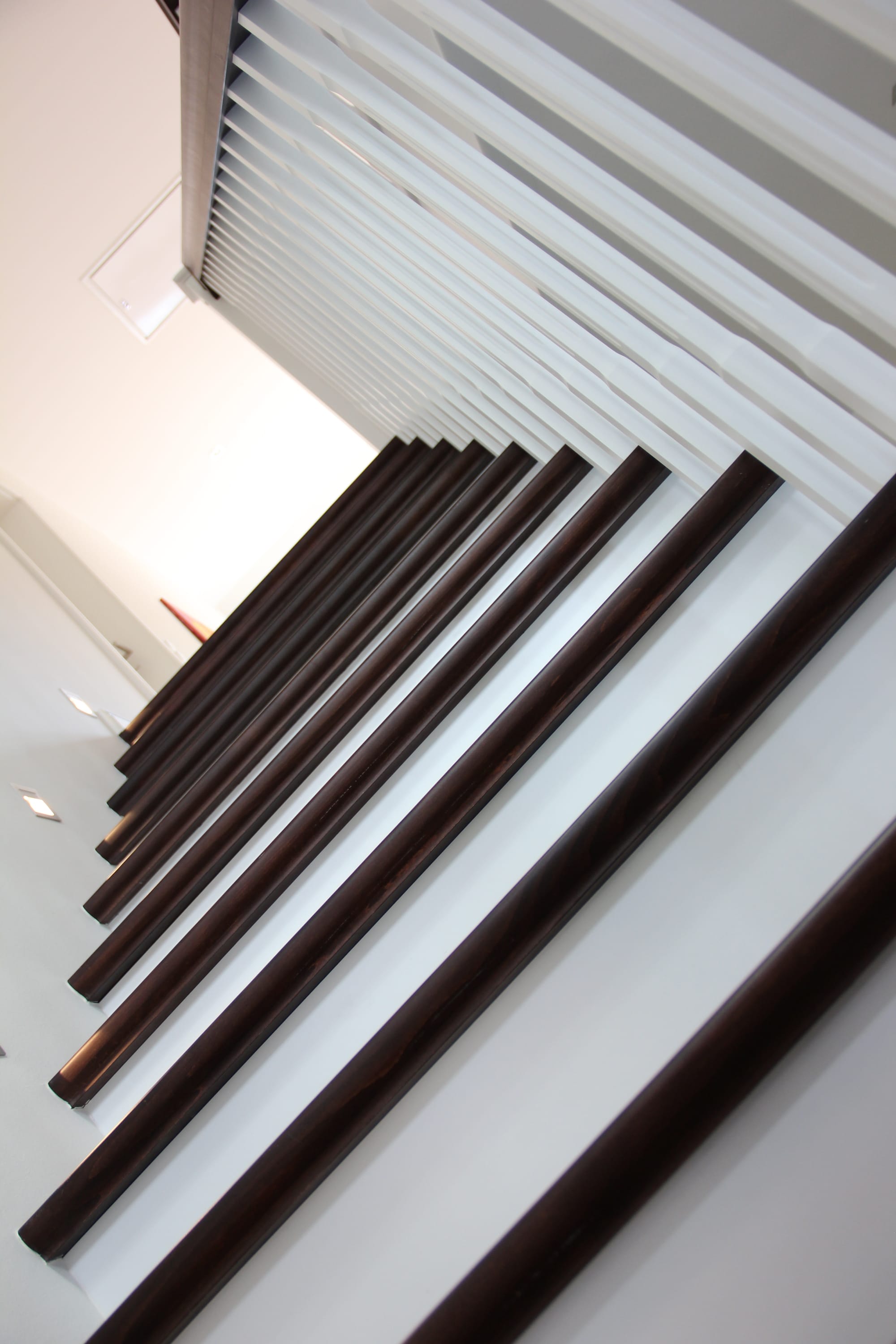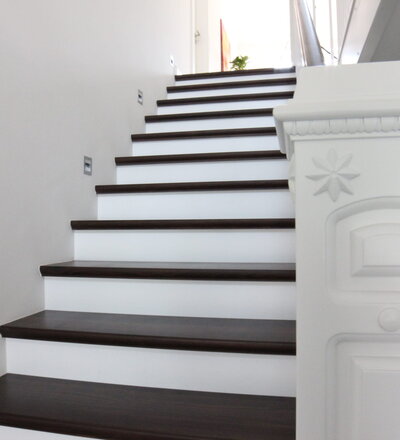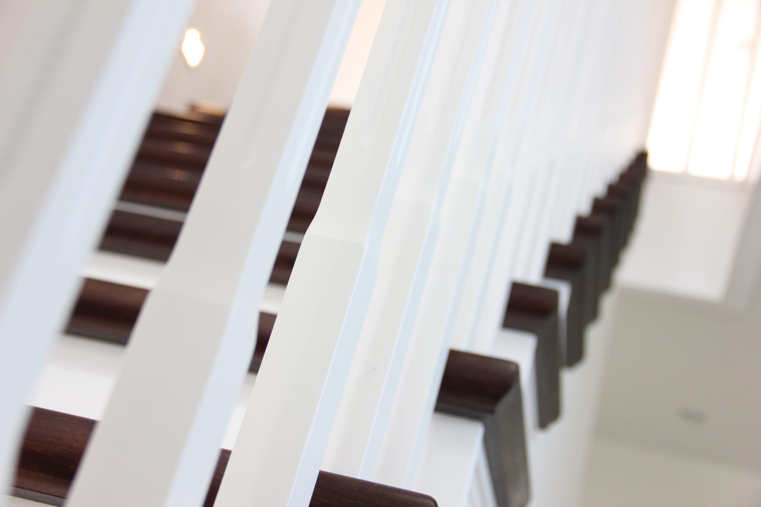 Betontreppenbelegung mit Antrittspodest; Stufen und Handlauf Holzart Buche mosaik auf Nußbaum dunkel gebeizt; Setzstufen, Pfosten (PF7) und Stäbe (EN3) Whitewood weiß endlackiert, Galeriegeländer.