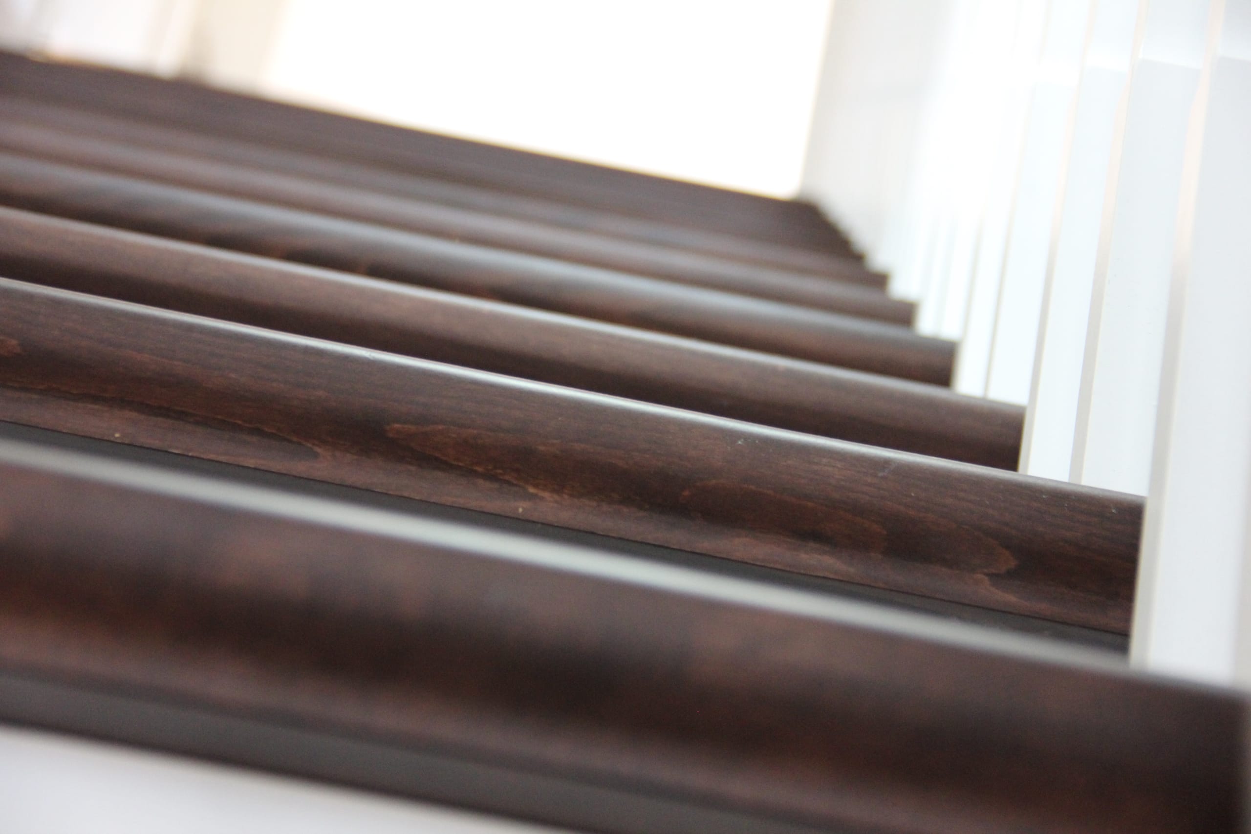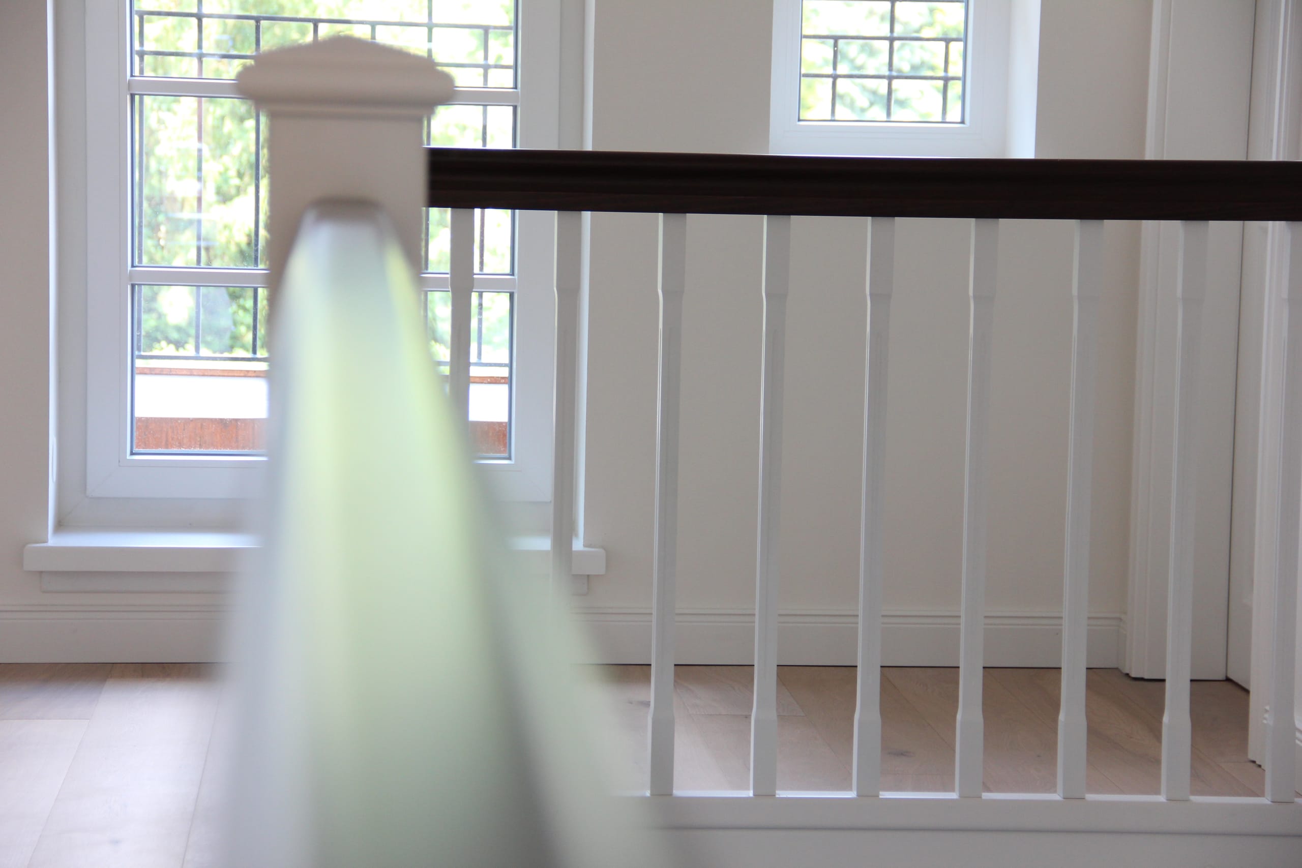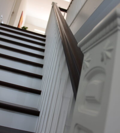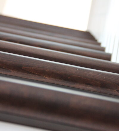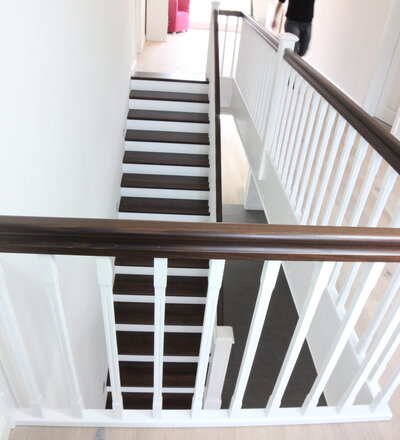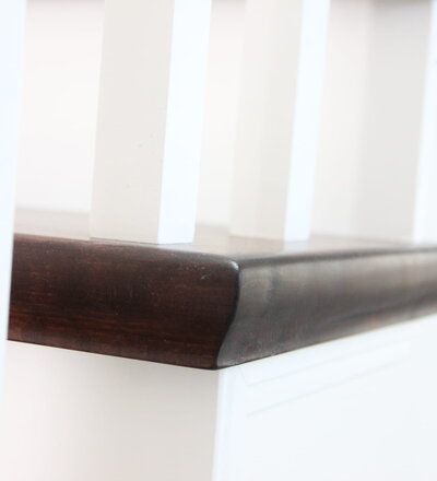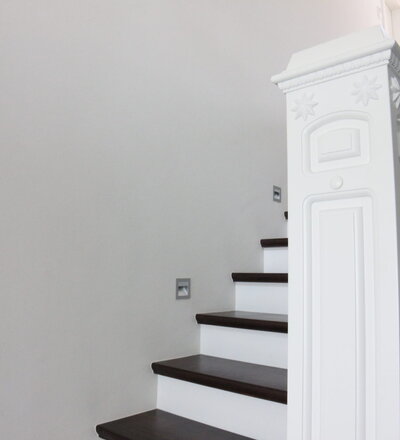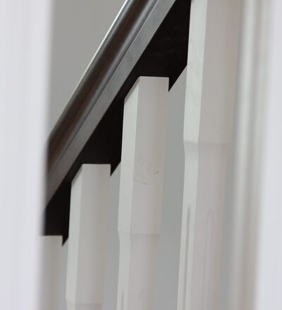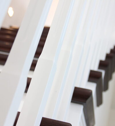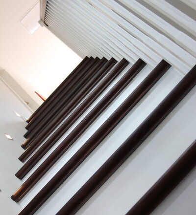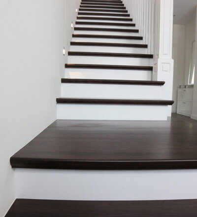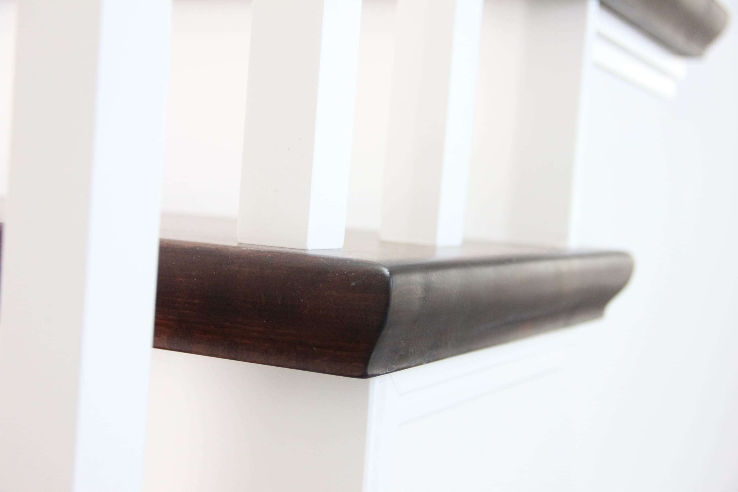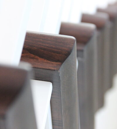 Betontreppenbelegung mit Antrittspodest; Stufen und Handlauf Holzart Buche mosaik auf Nußbaum dunkel gebeizt; Setzstufen, Pfosten (PF7) und Stäbe (EN3) Whitewood weiß endlackiert, Galeriegeländer.