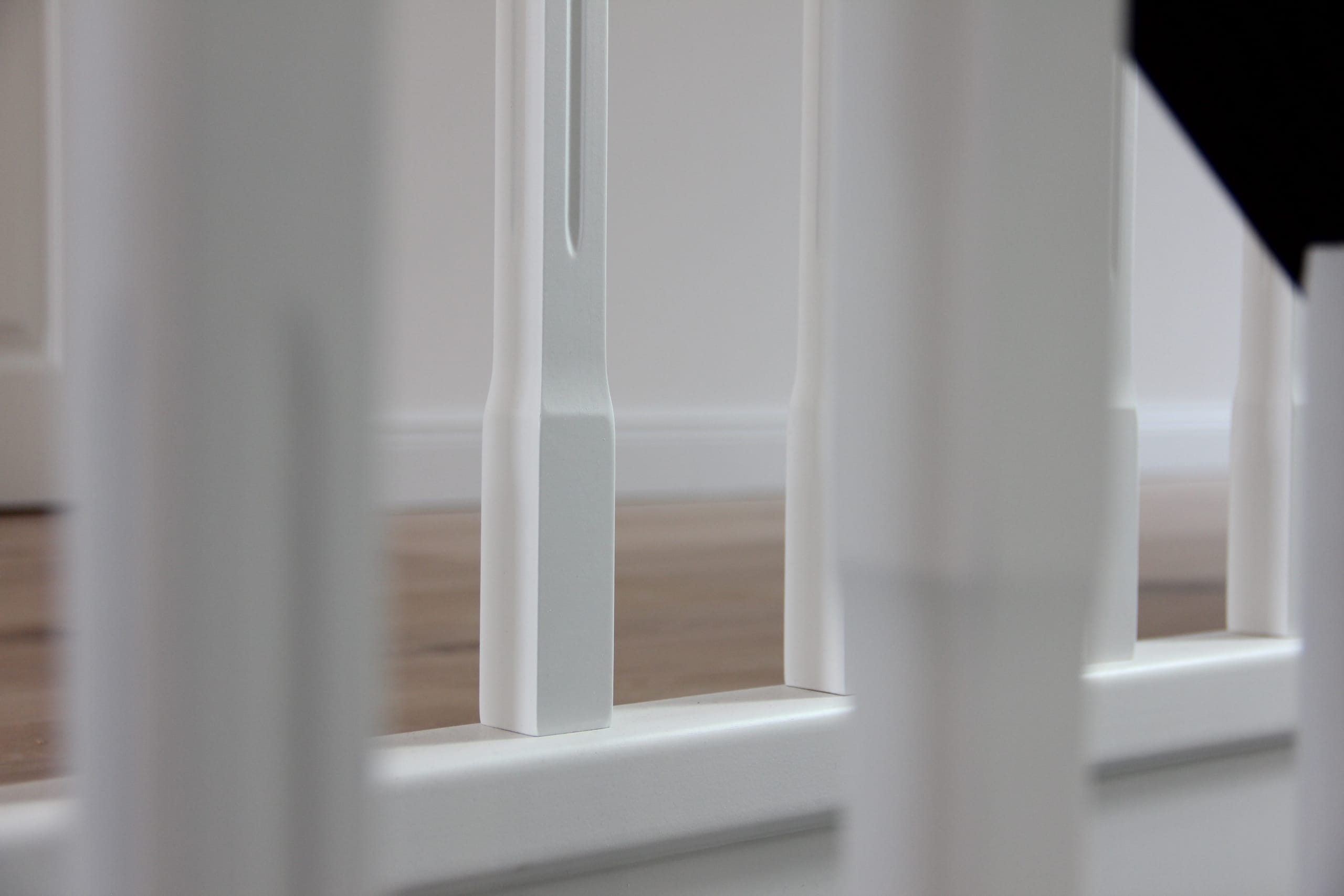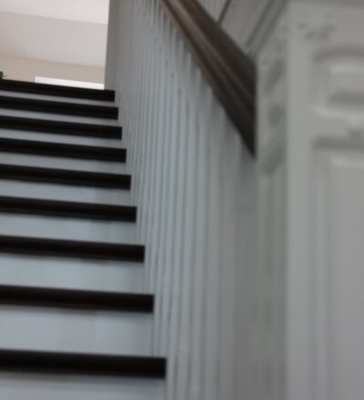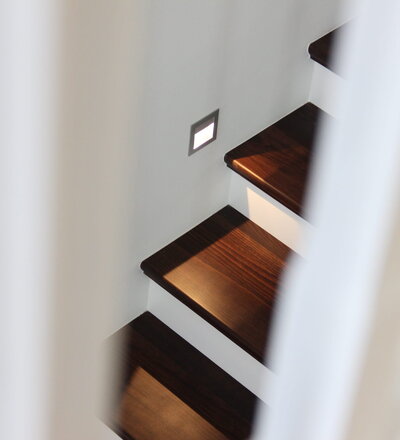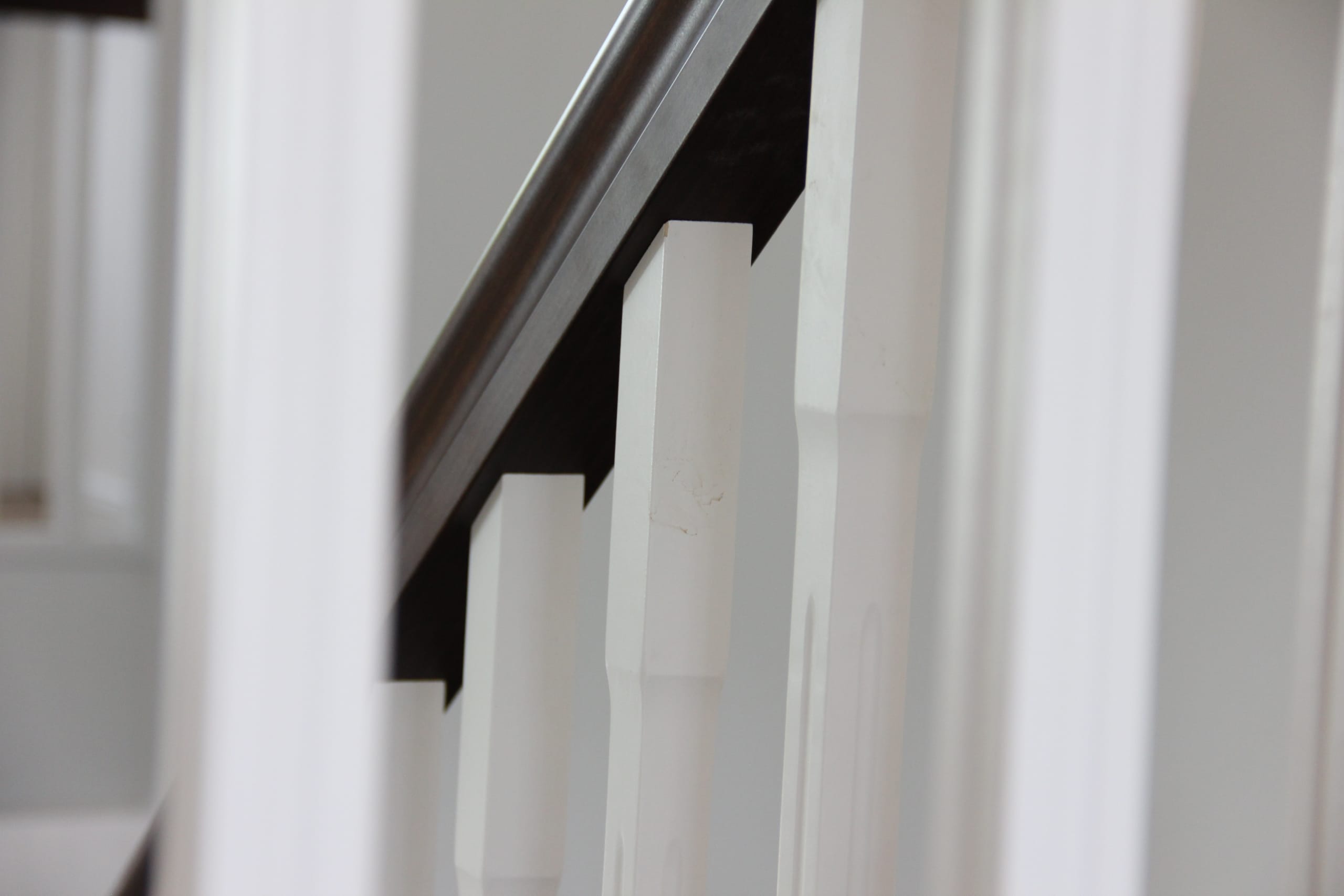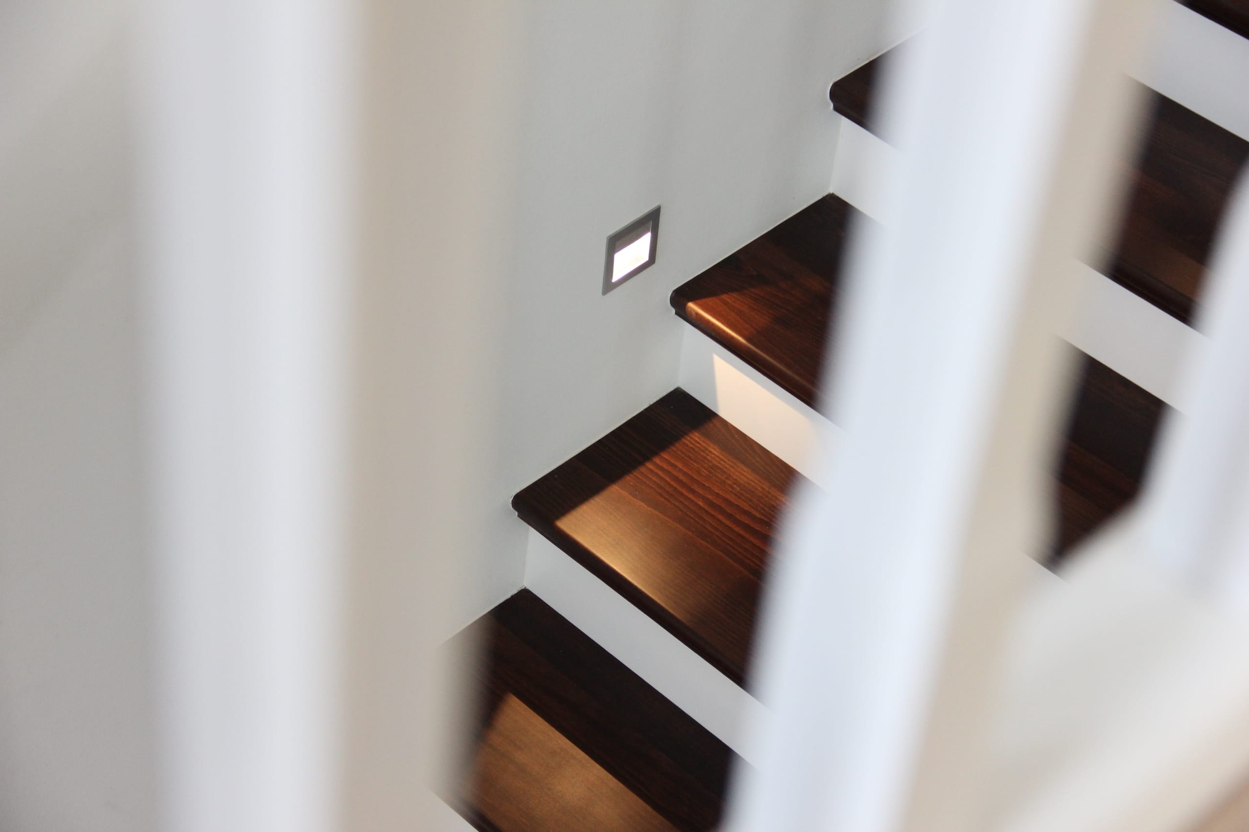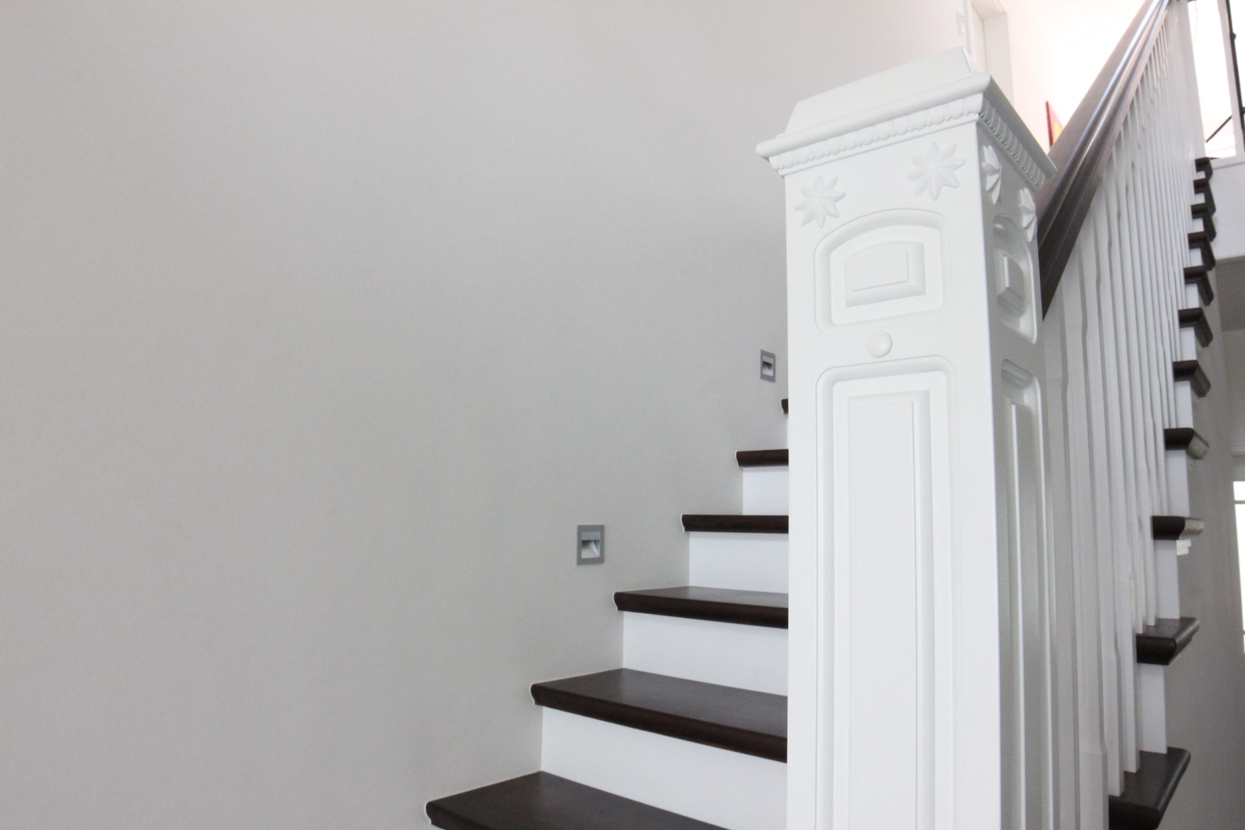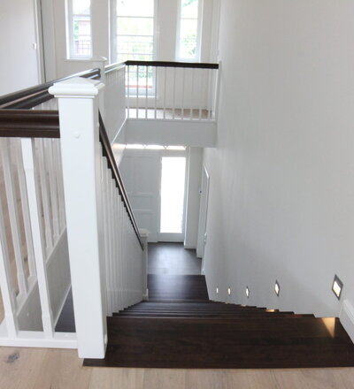 Betontreppenbelegung mit Antrittspodest; Stufen und Handlauf Holzart Buche mosaik auf Nußbaum dunkel gebeizt; Setzstufen, Pfosten (PF7) und Stäbe (EN3) Whitewood weiß endlackiert, Galeriegeländer.