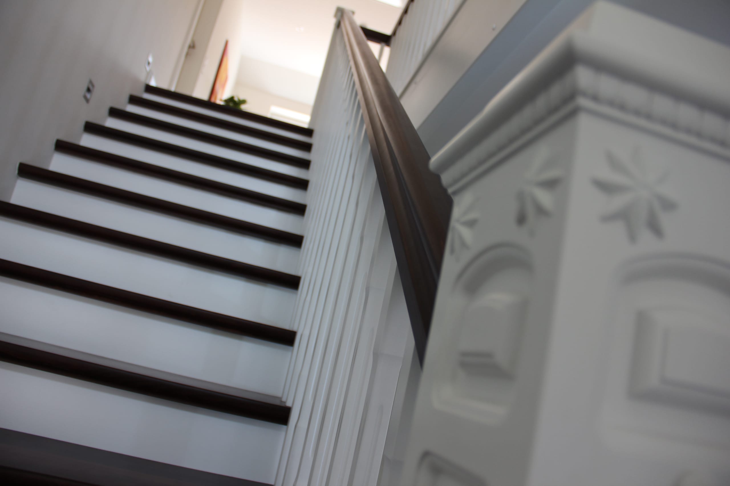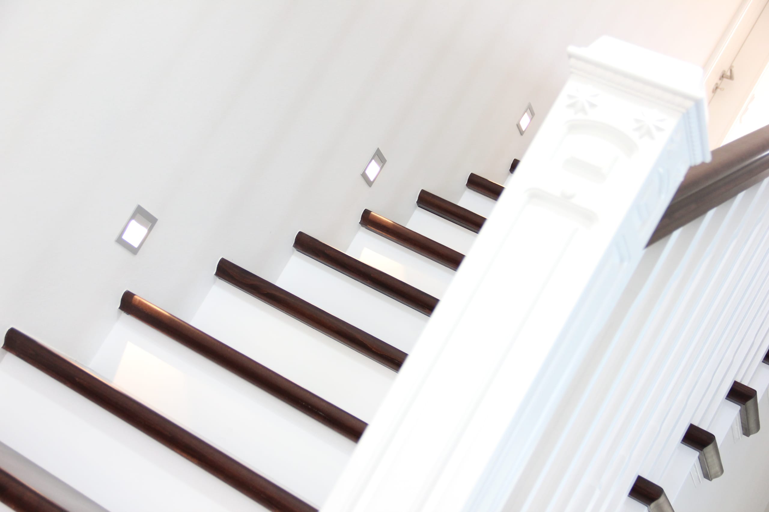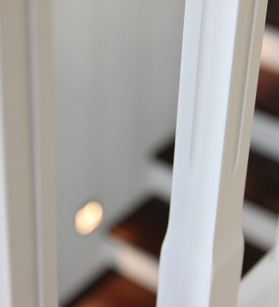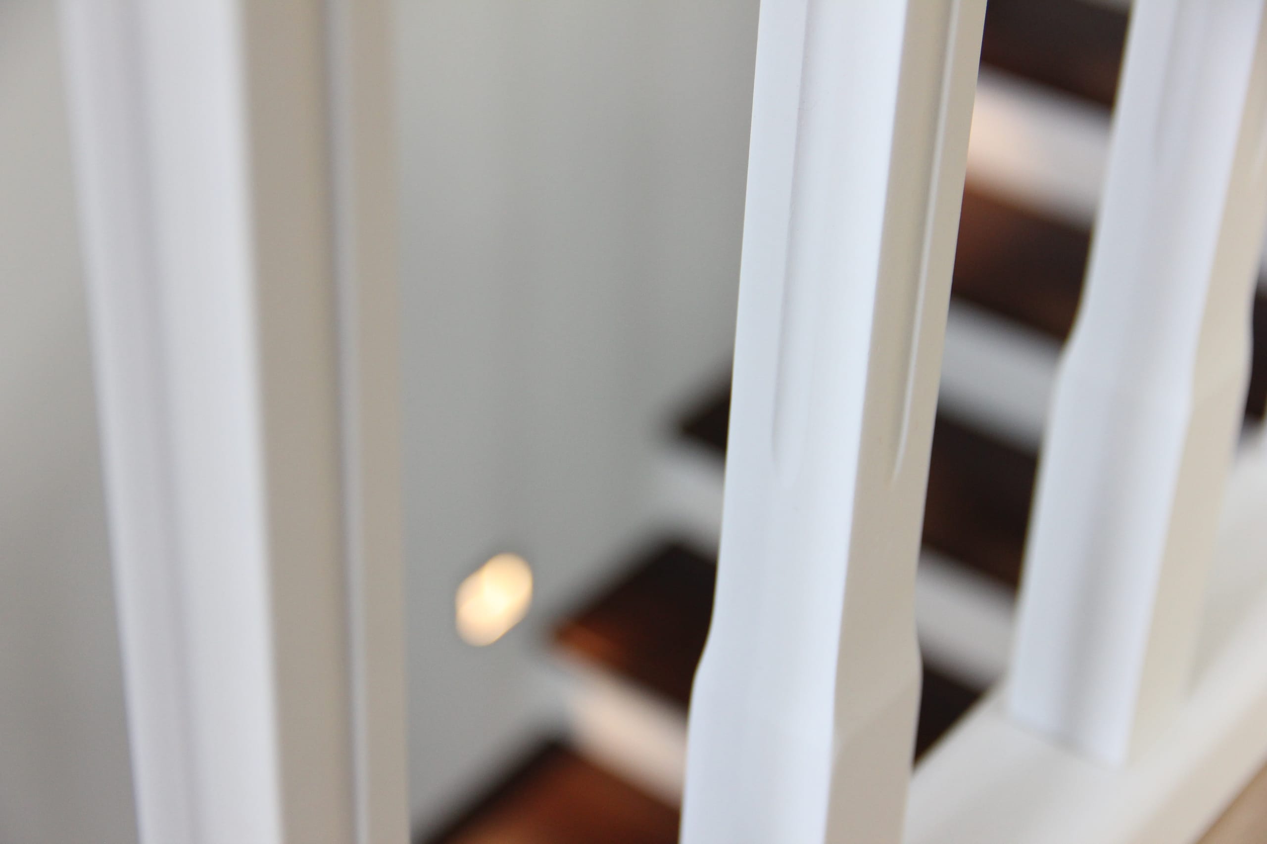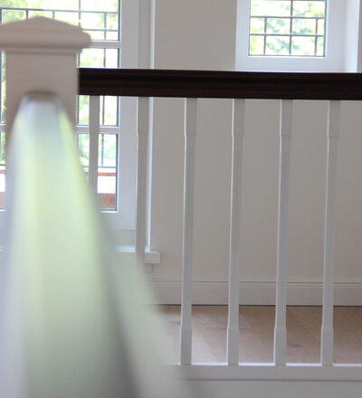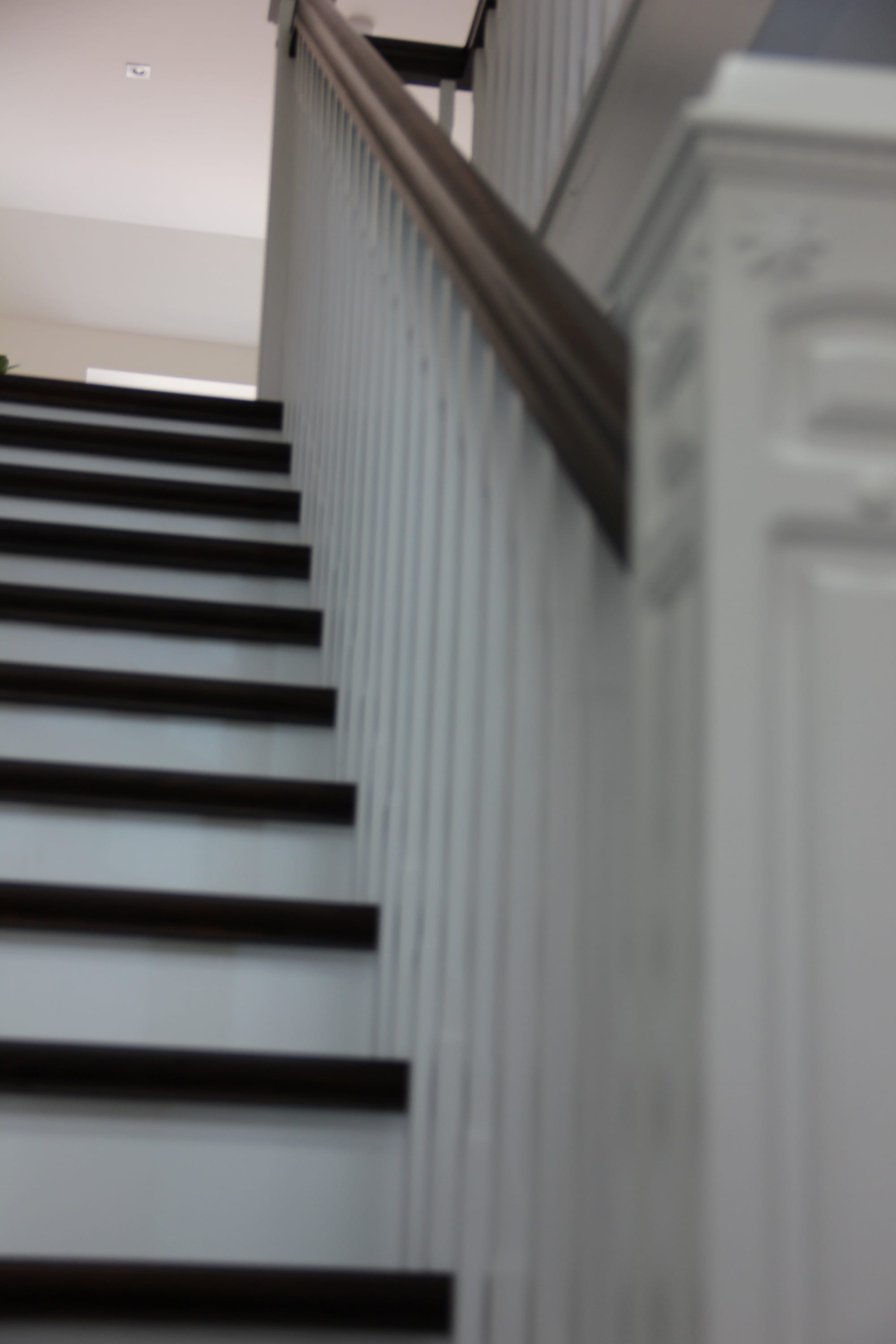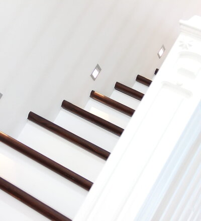 Betontreppenbelegung mit Antrittspodest; Stufen und Handlauf Holzart Buche mosaik auf Nußbaum dunkel gebeizt; Setzstufen, Pfosten (PF7) und Stäbe (EN3) Whitewood weiß endlackiert, Galeriegeländer.
