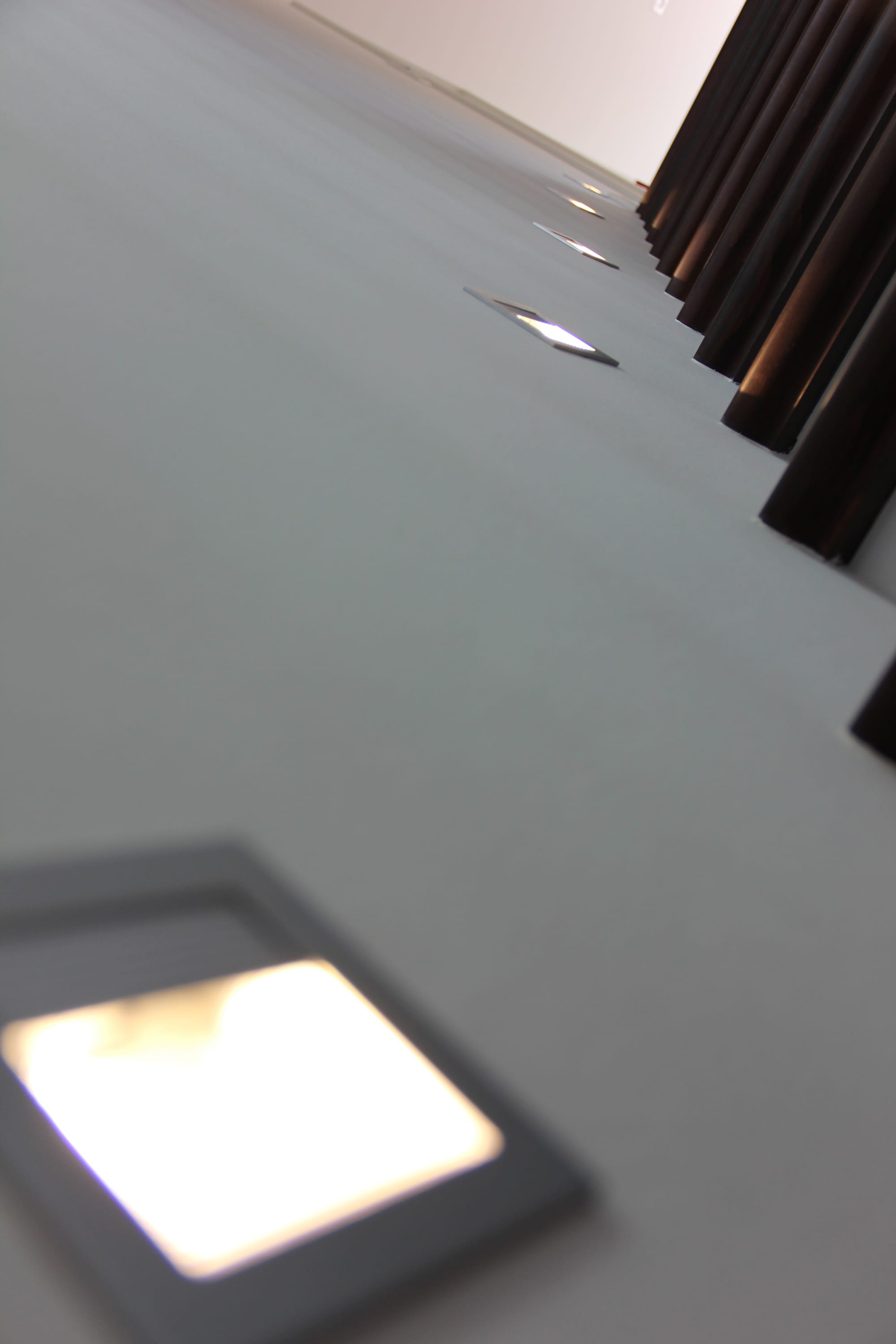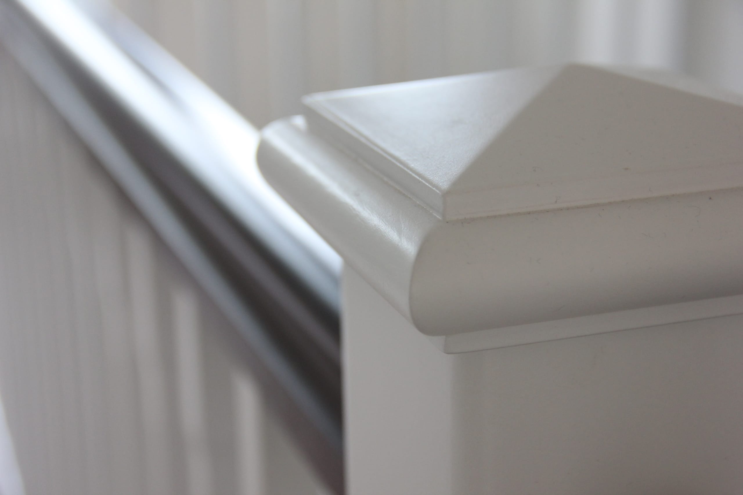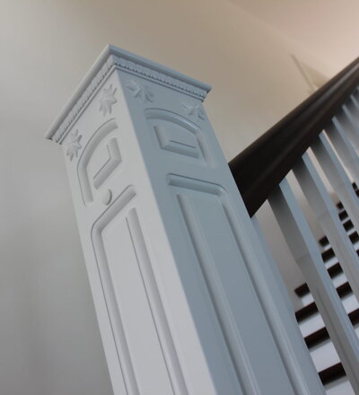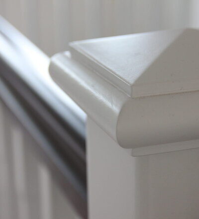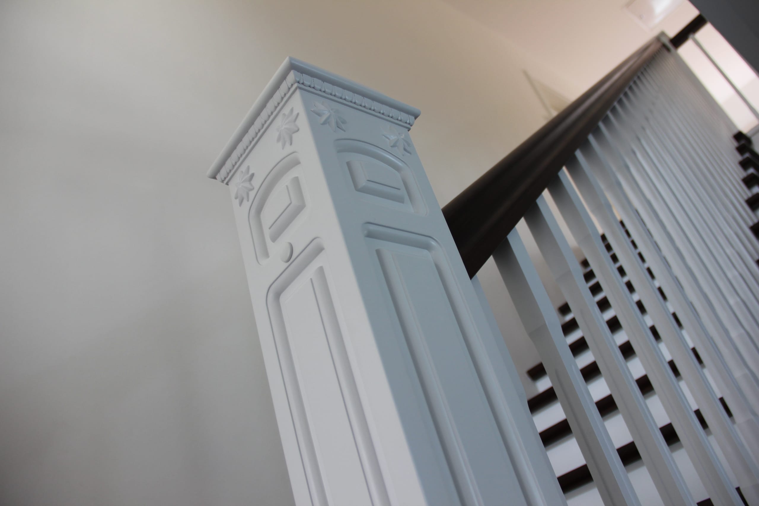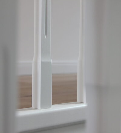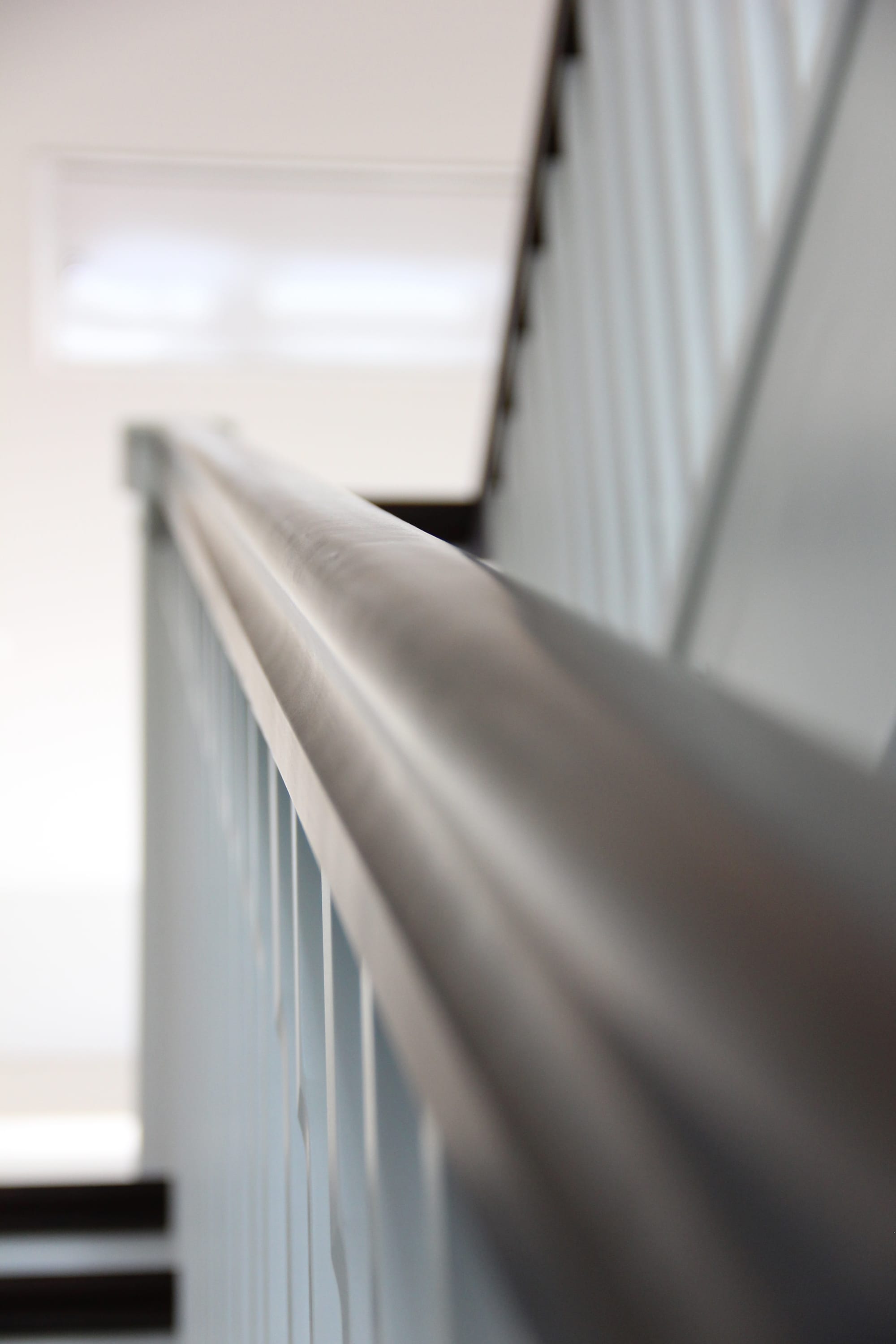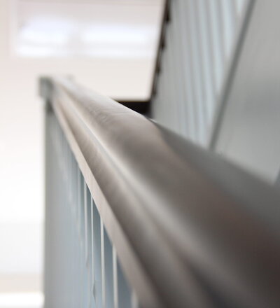 Betontreppenbelegung mit Antrittspodest; Stufen und Handlauf Holzart Buche mosaik auf Nußbaum dunkel gebeizt; Setzstufen, Pfosten (PF7) und Stäbe (EN3) Whitewood weiß endlackiert, Galeriegeländer.