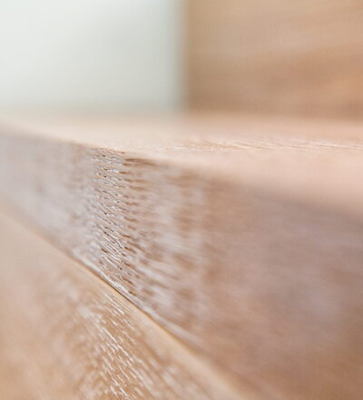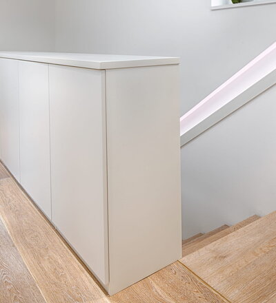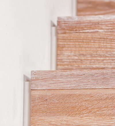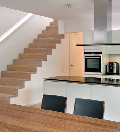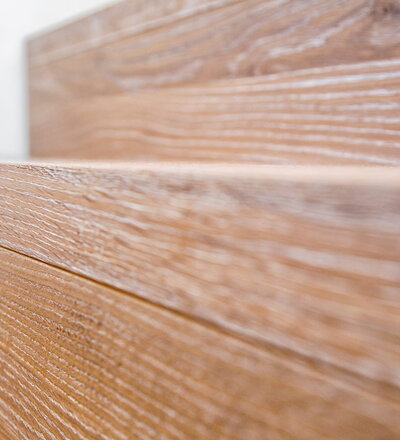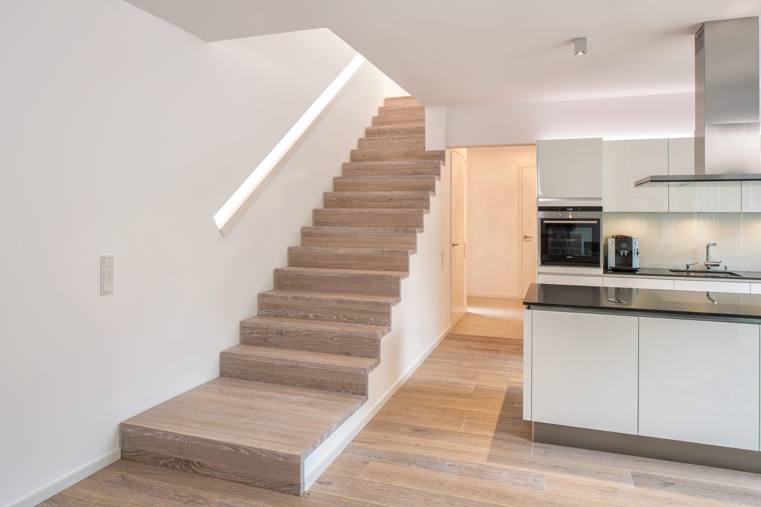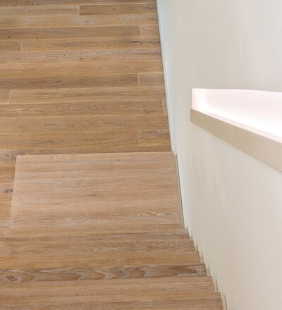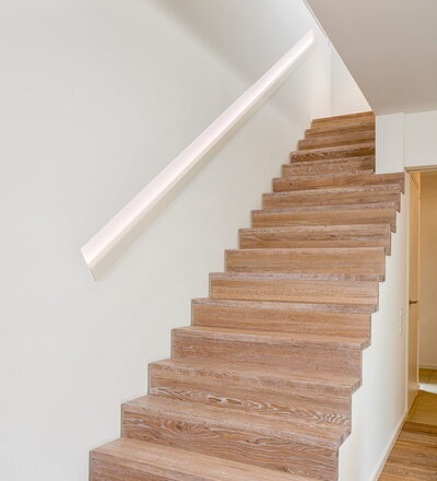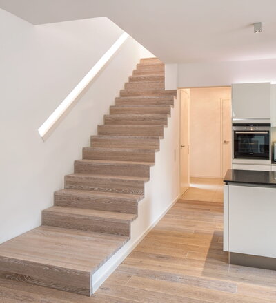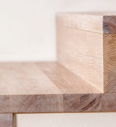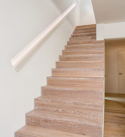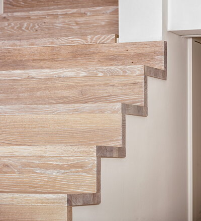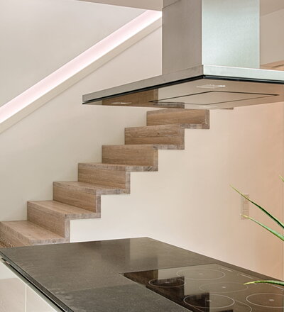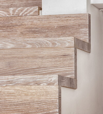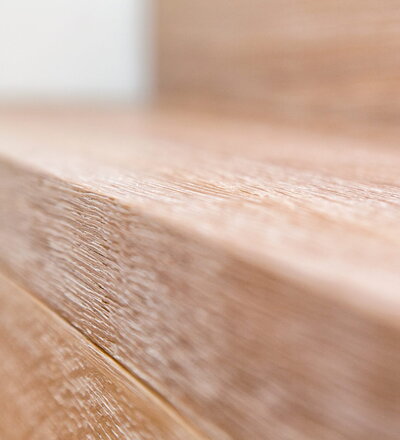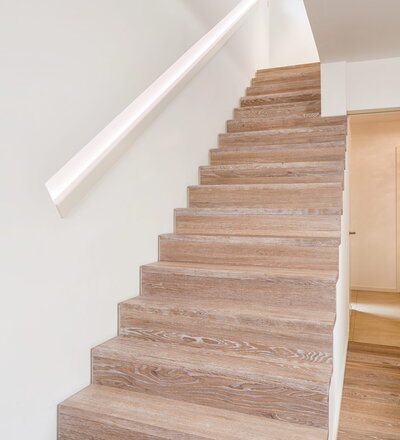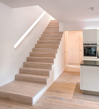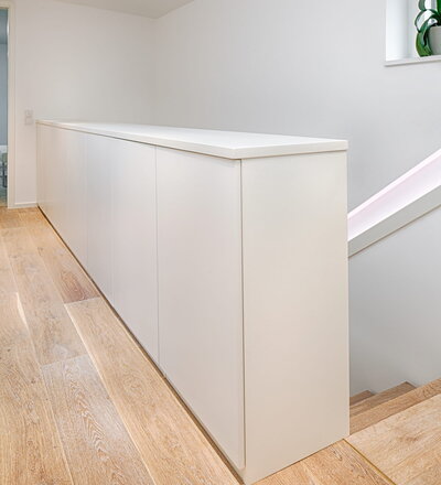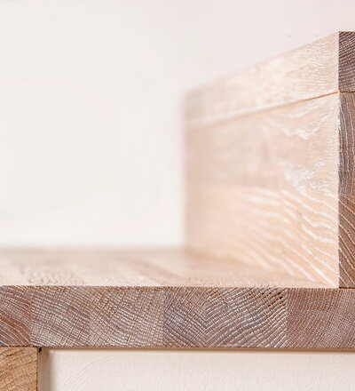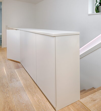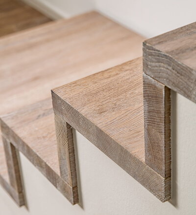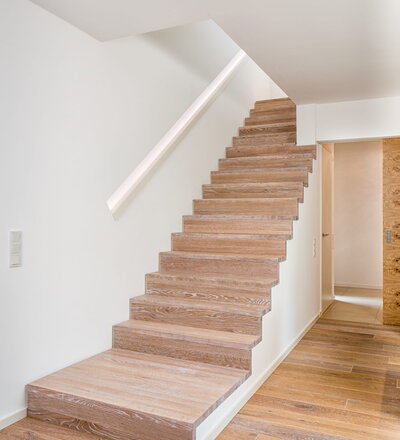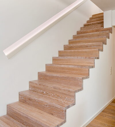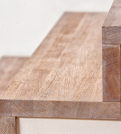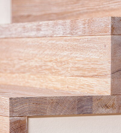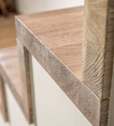 Stufen und Handlauf in der Holzart Akazie mosaik geölt, Wangen verkleidet, eingebautes Regalsystem unter der Treppe