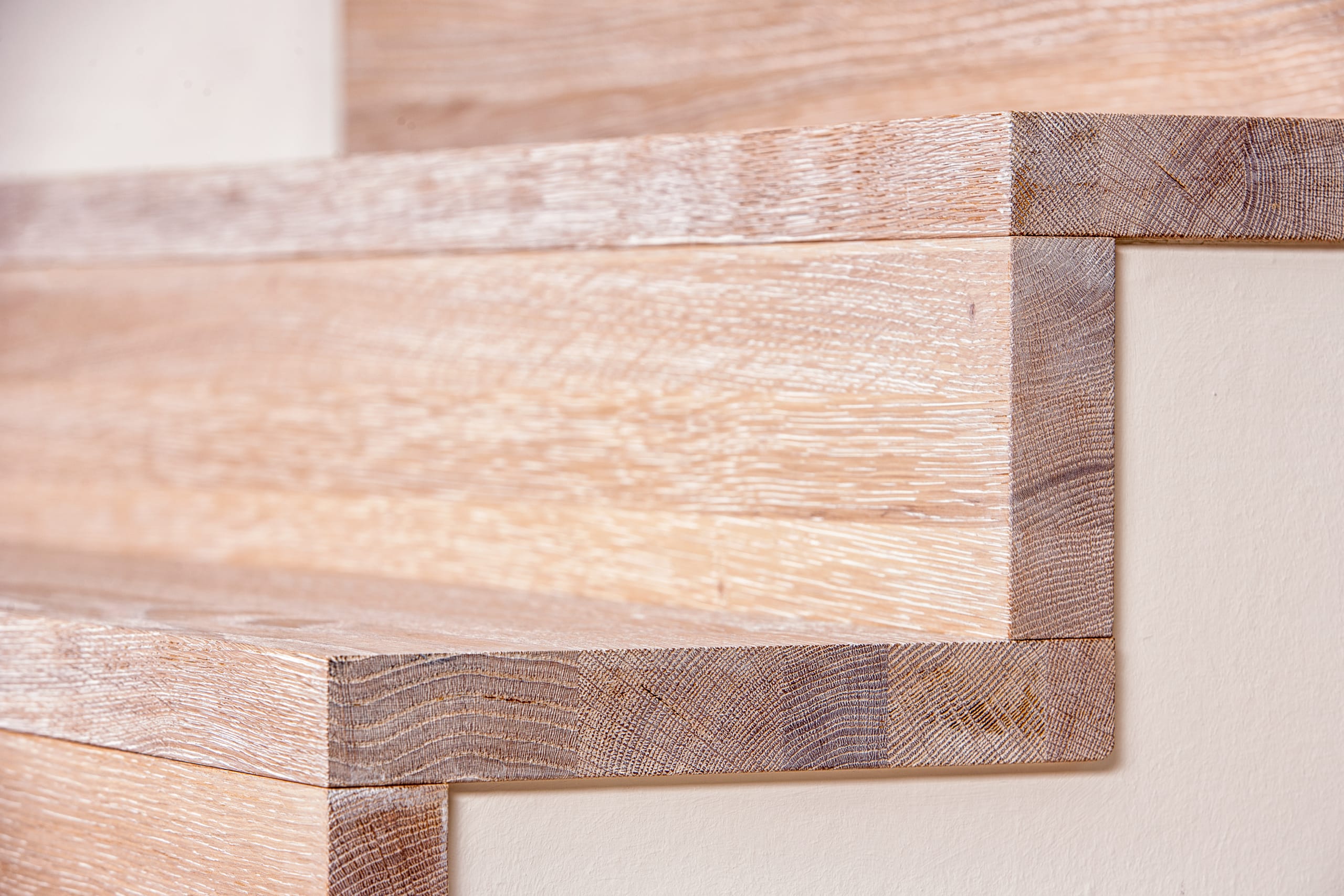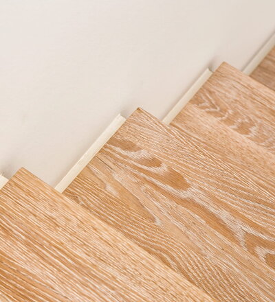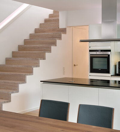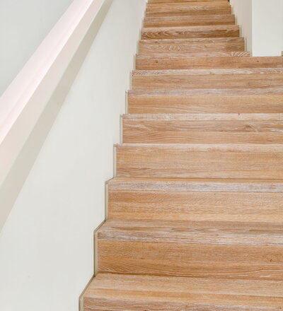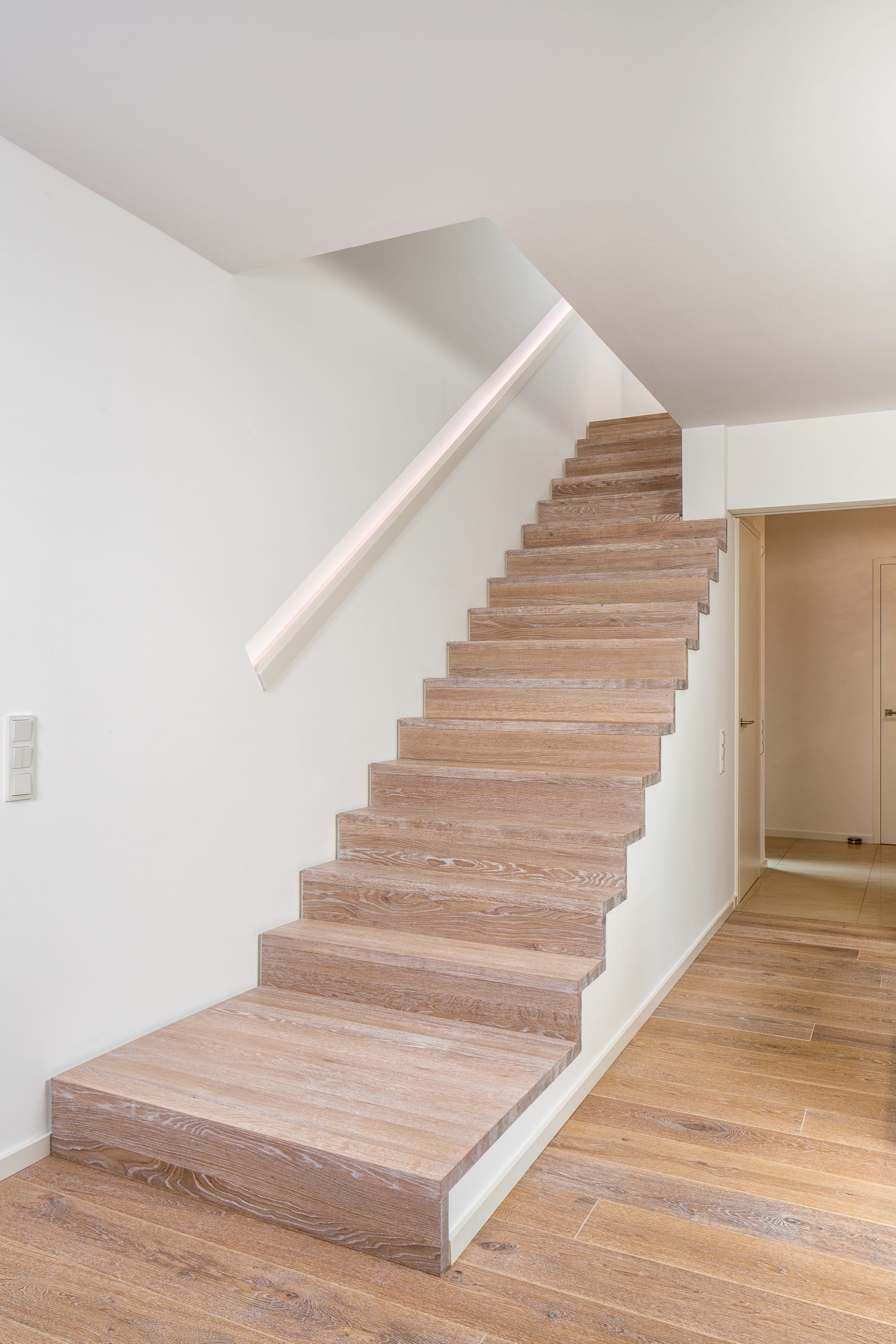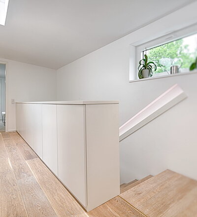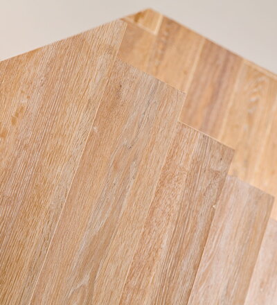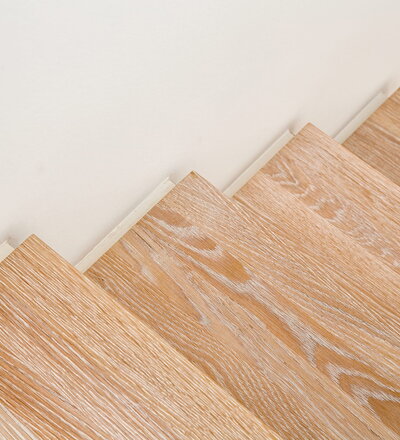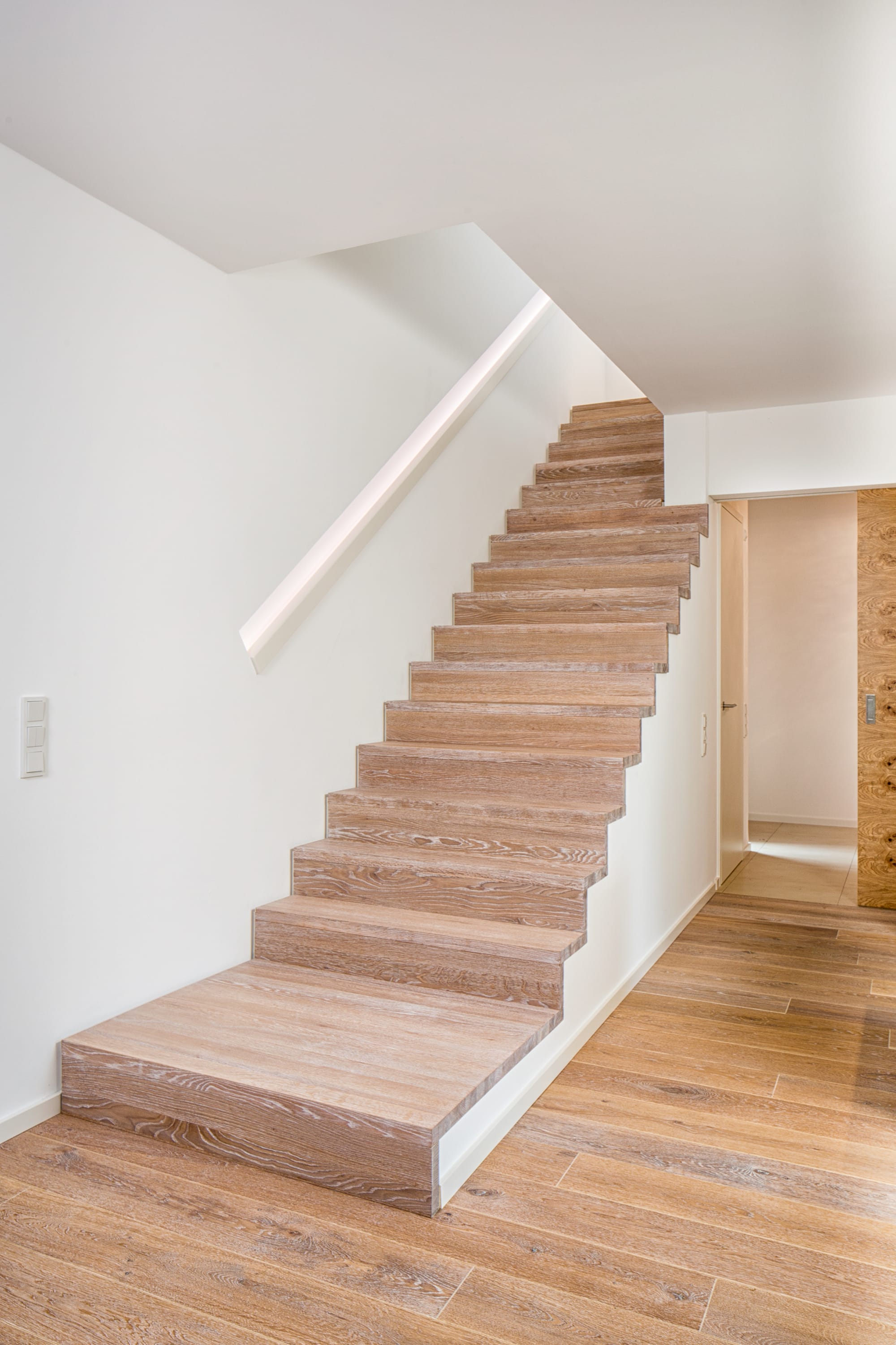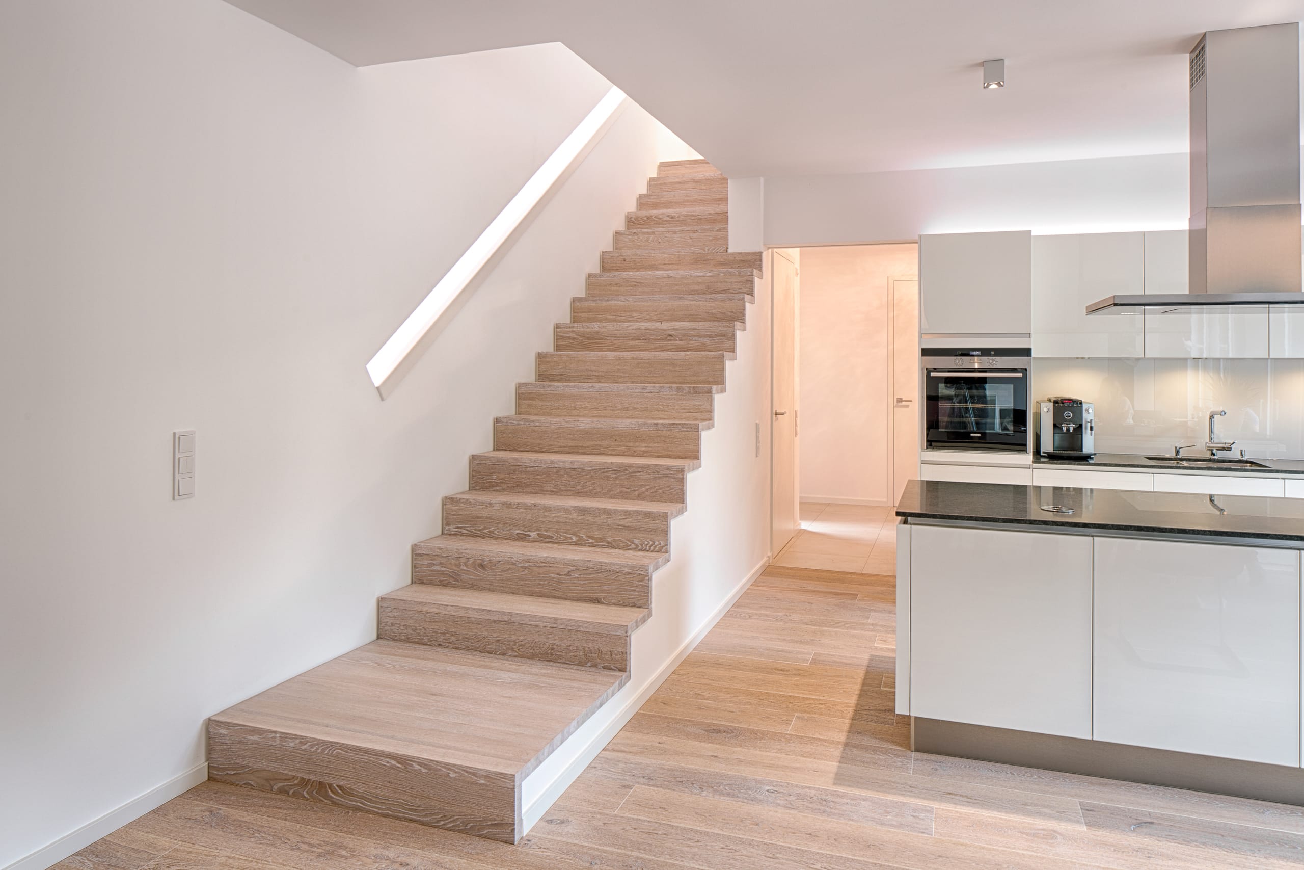Stufen und Handlauf in der Holzart Akazie mosaik geölt, Wangen verkleidet, eingebautes Regalsystem unter der Treppe