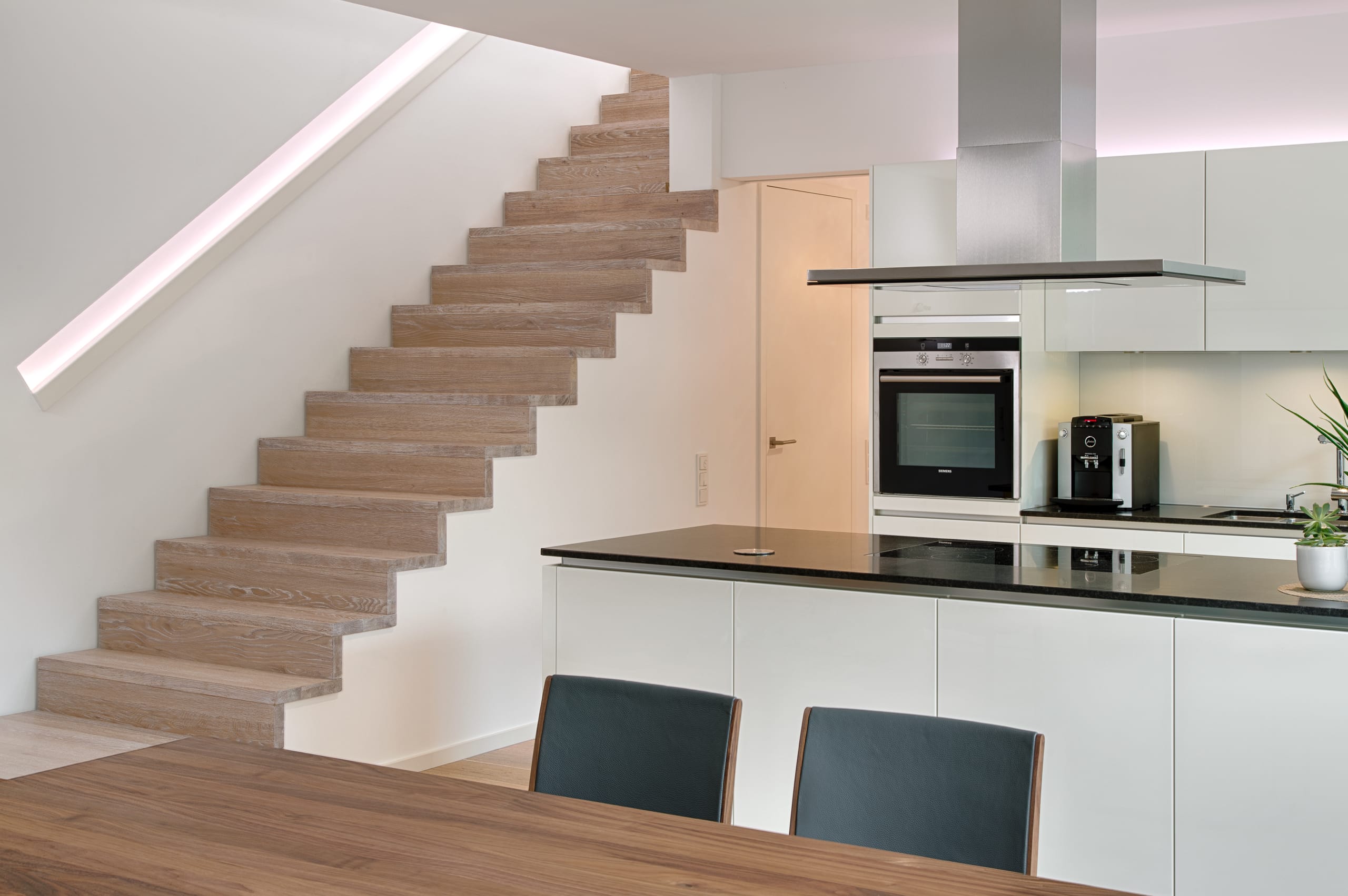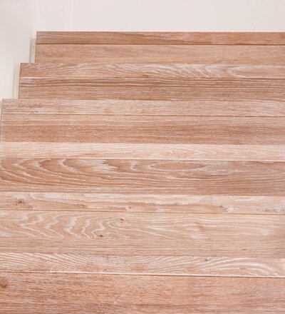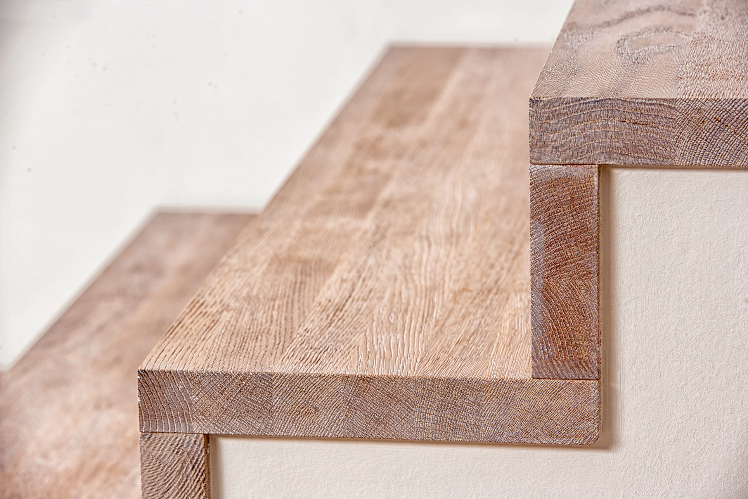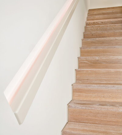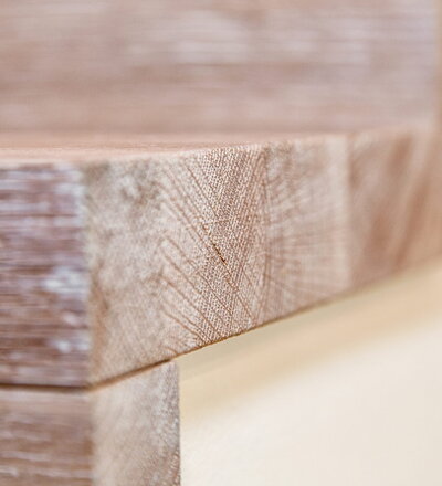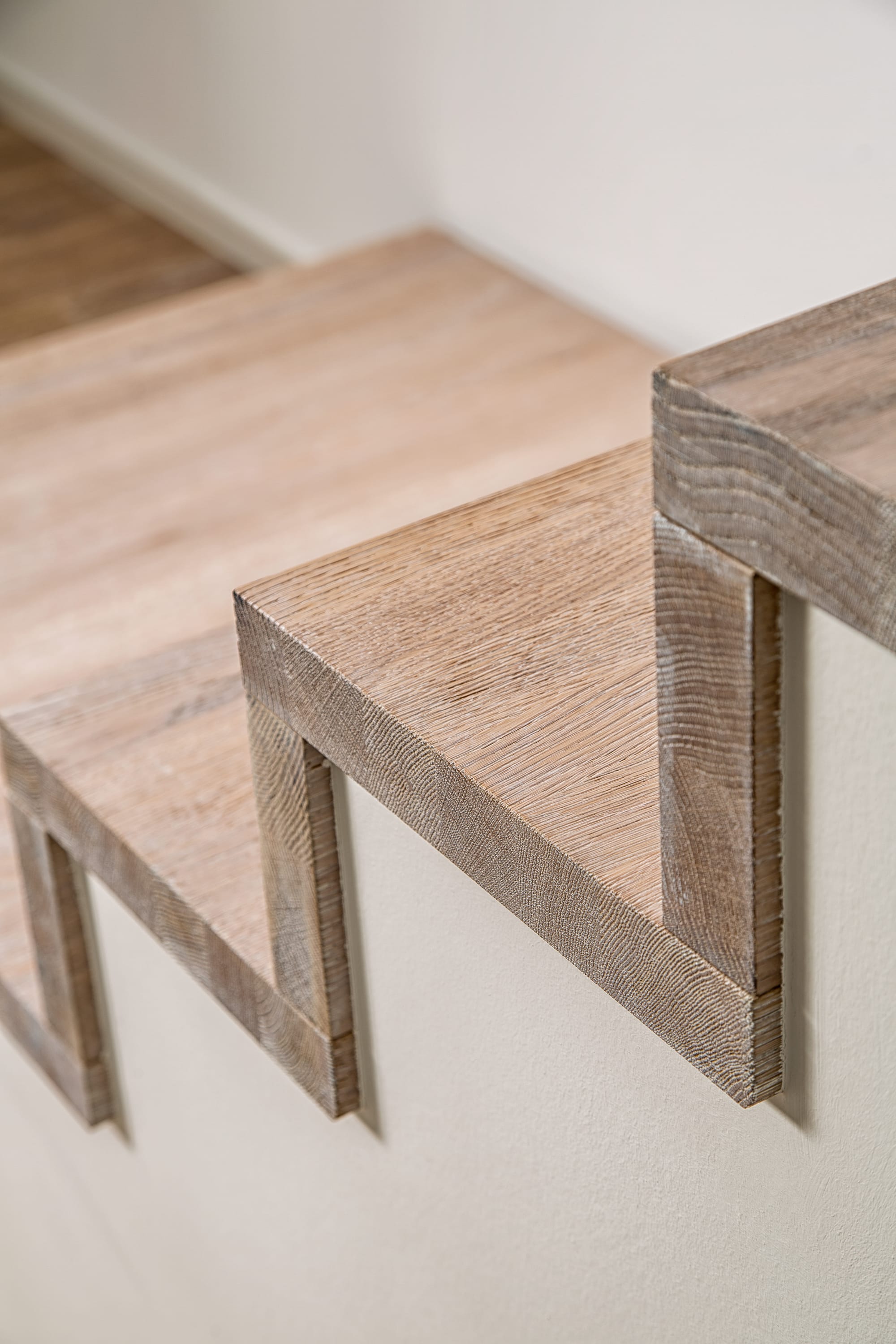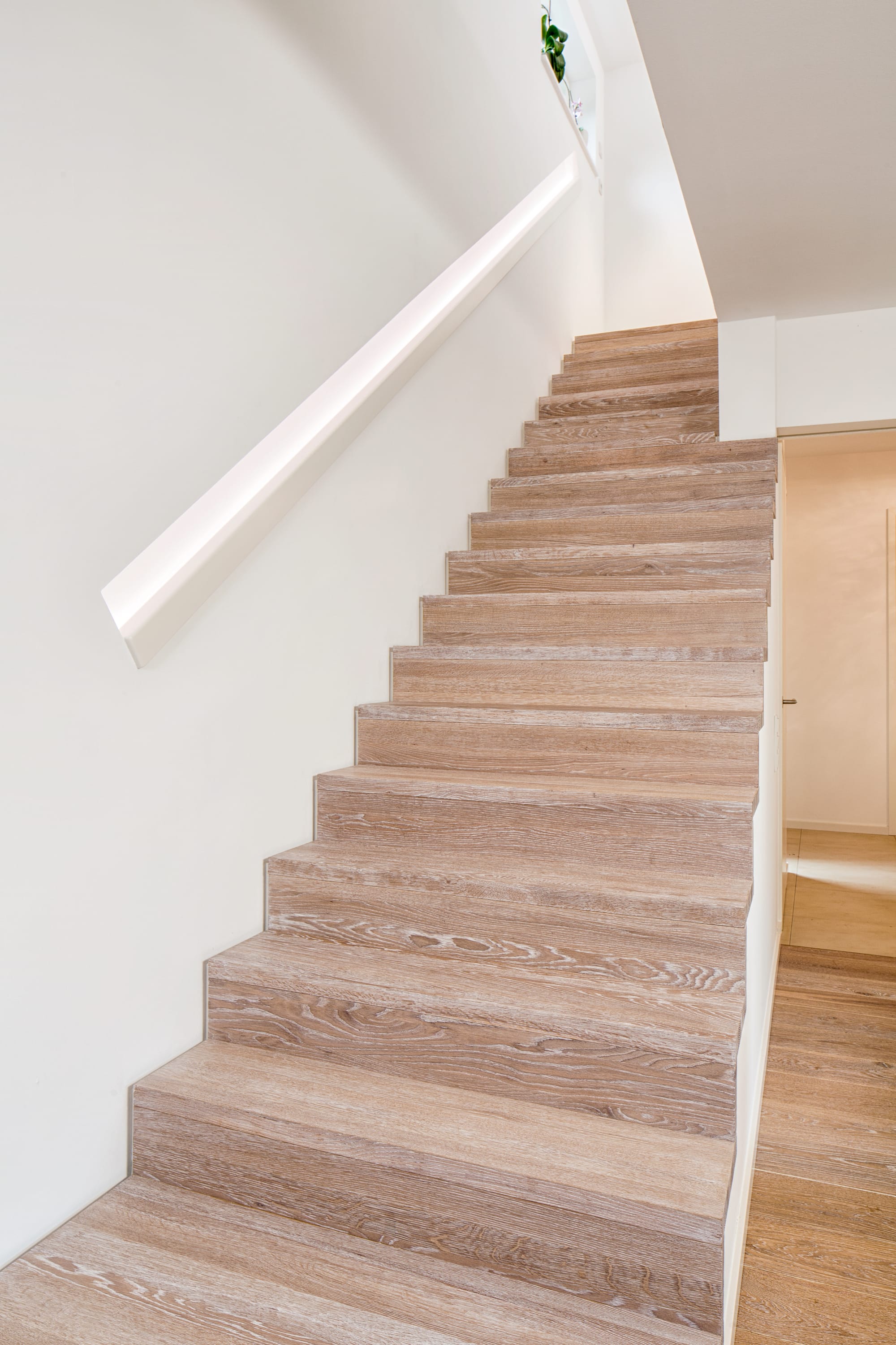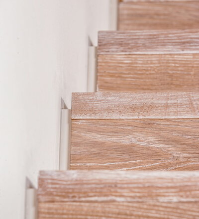 Stufen und Handlauf in der Holzart Akazie mosaik geölt, Wangen verkleidet, eingebautes Regalsystem unter der Treppe