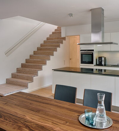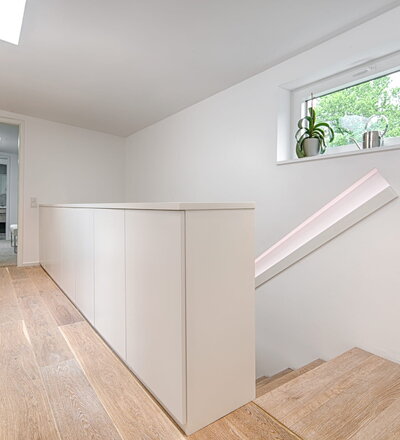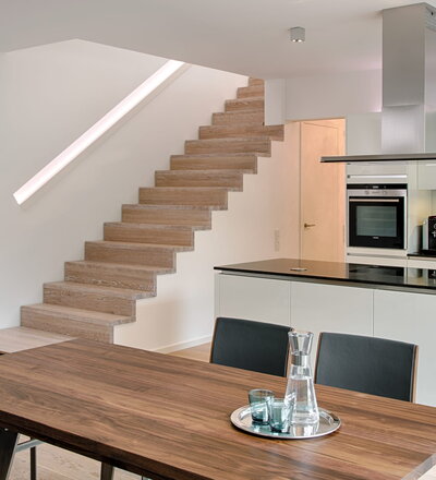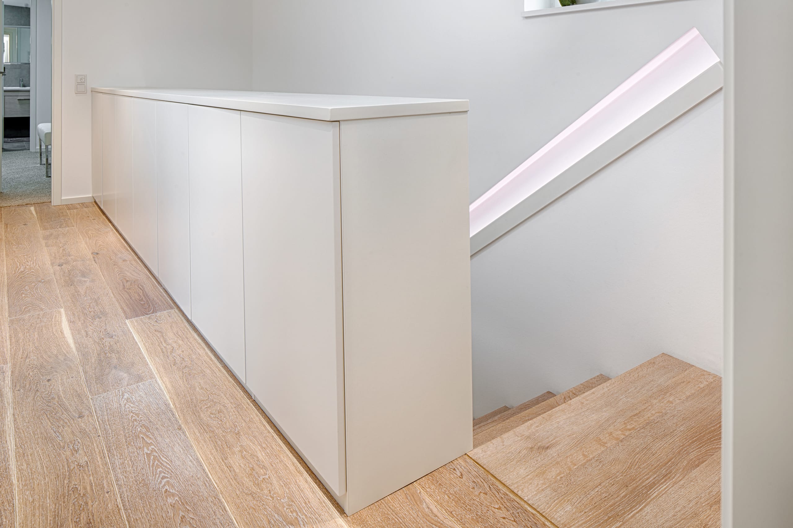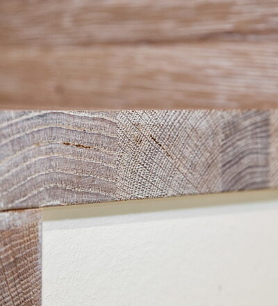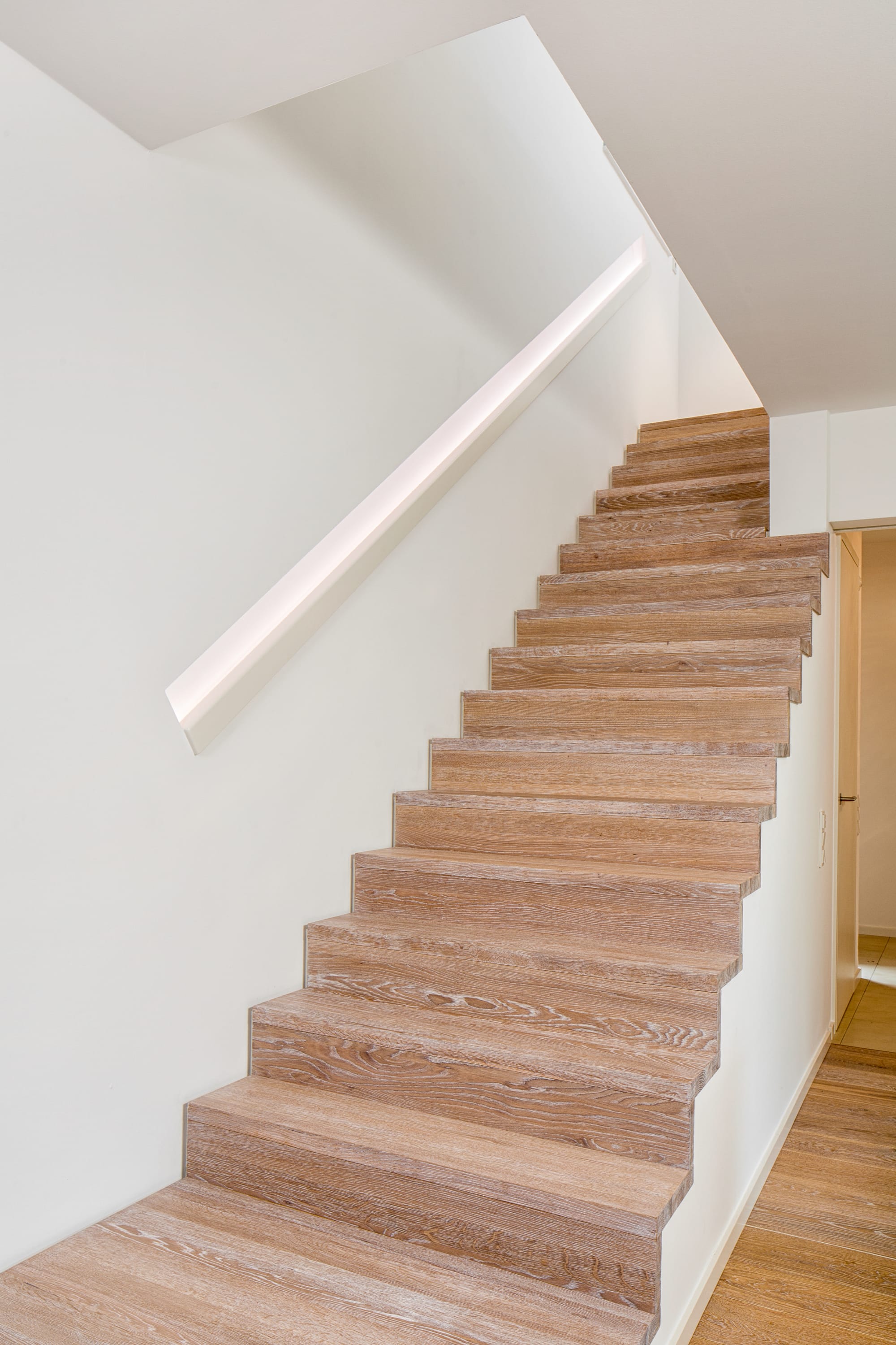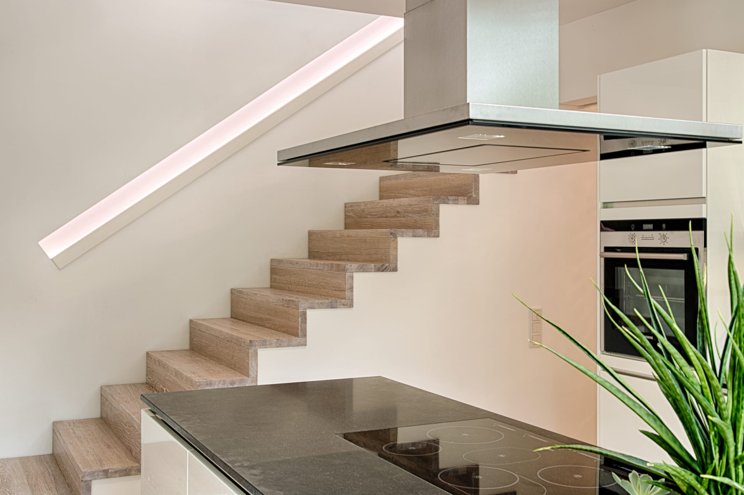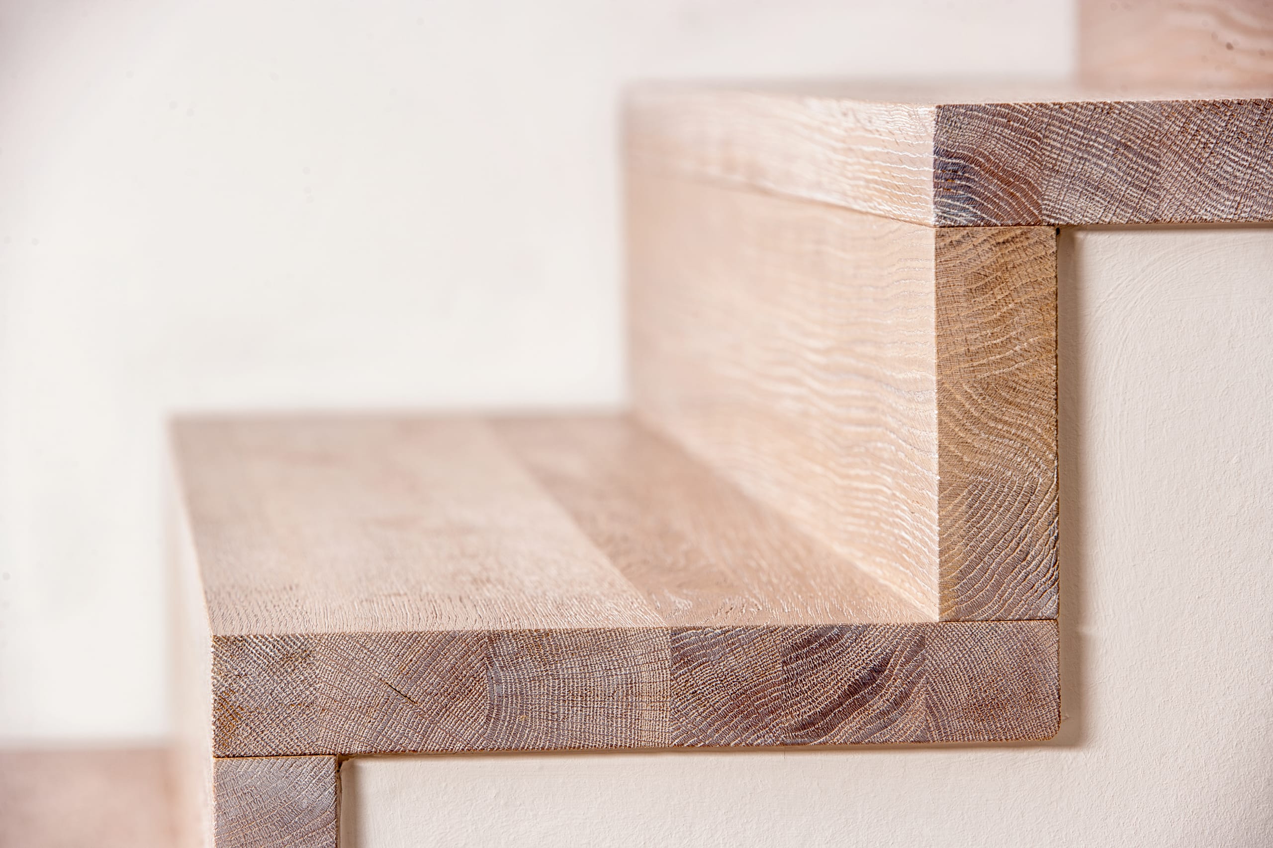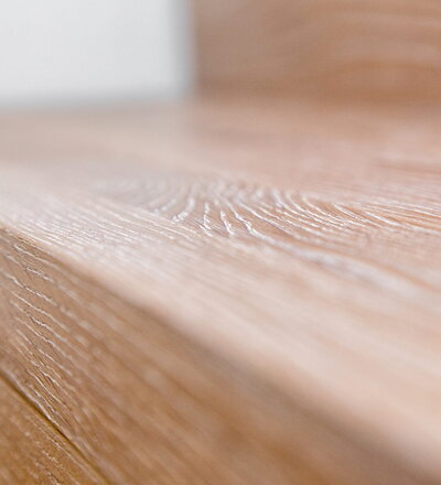 Stufen und Handlauf in der Holzart Akazie mosaik geölt, Wangen verkleidet, eingebautes Regalsystem unter der Treppe