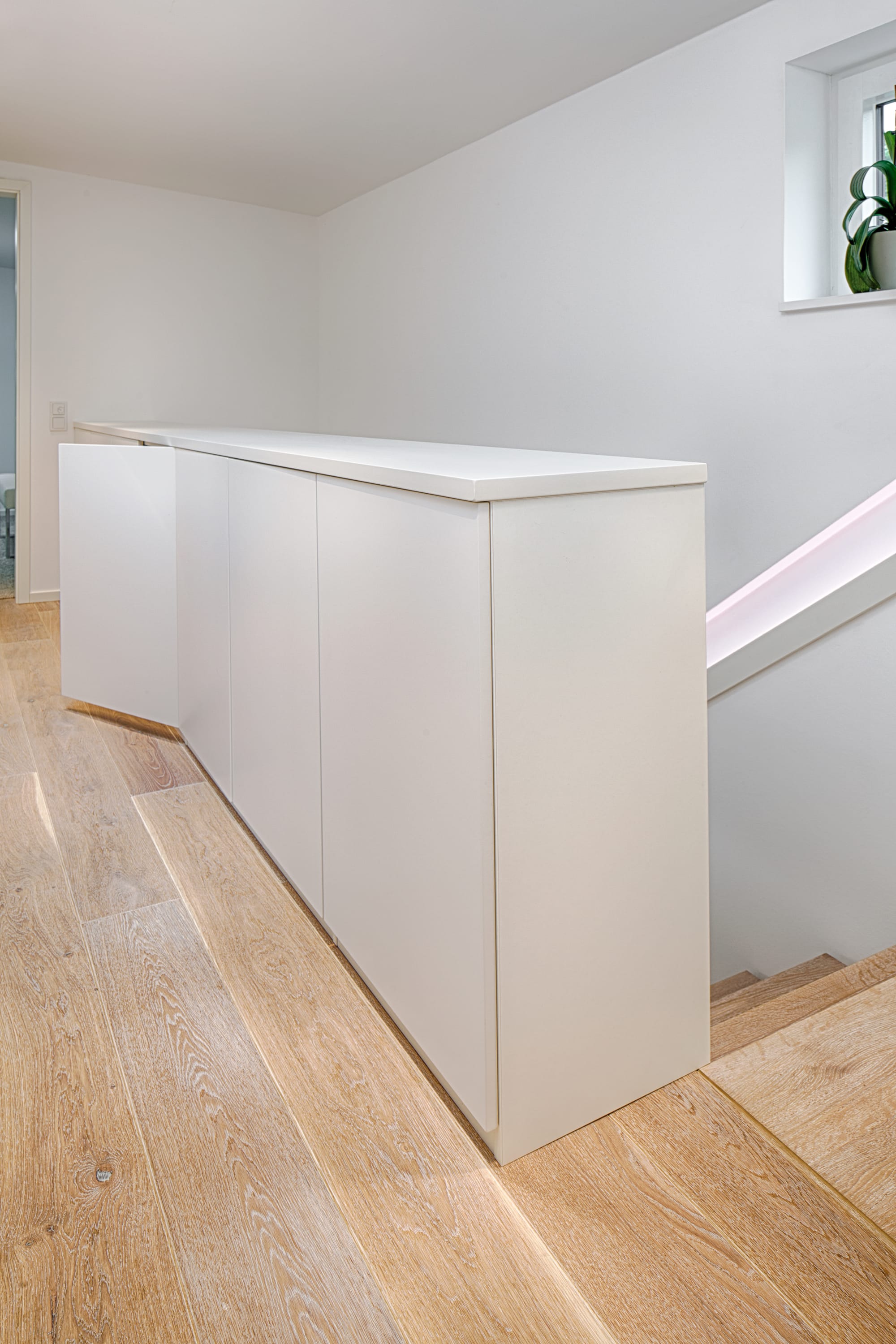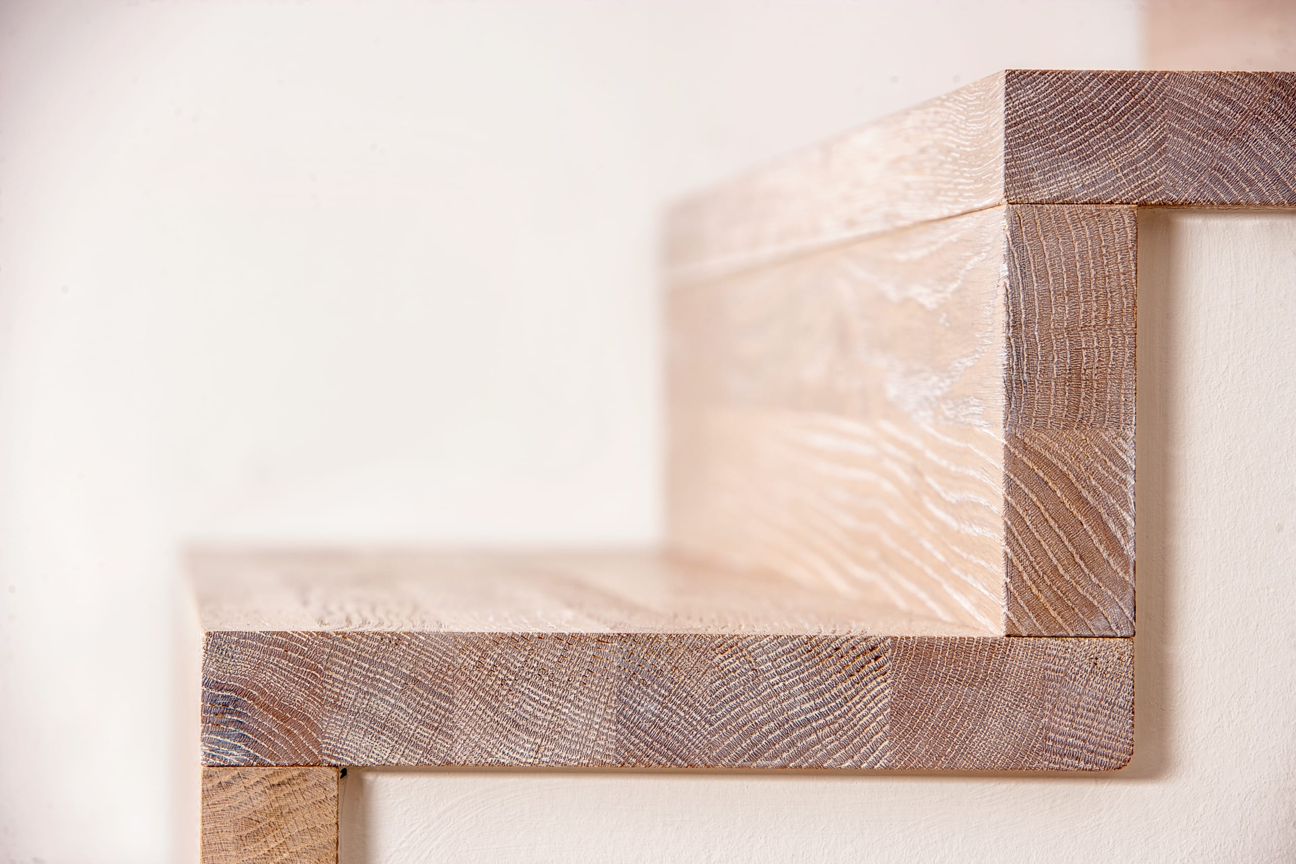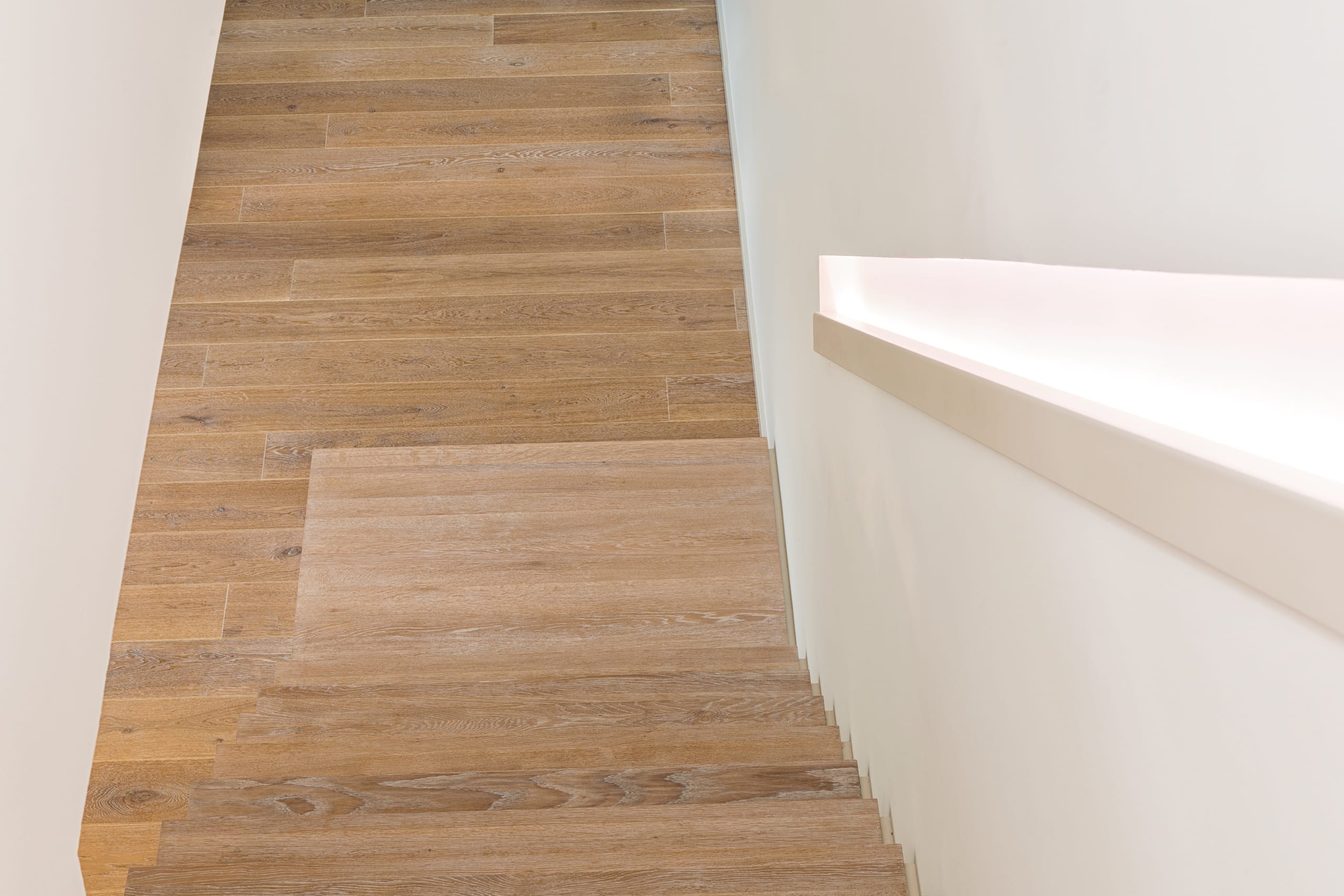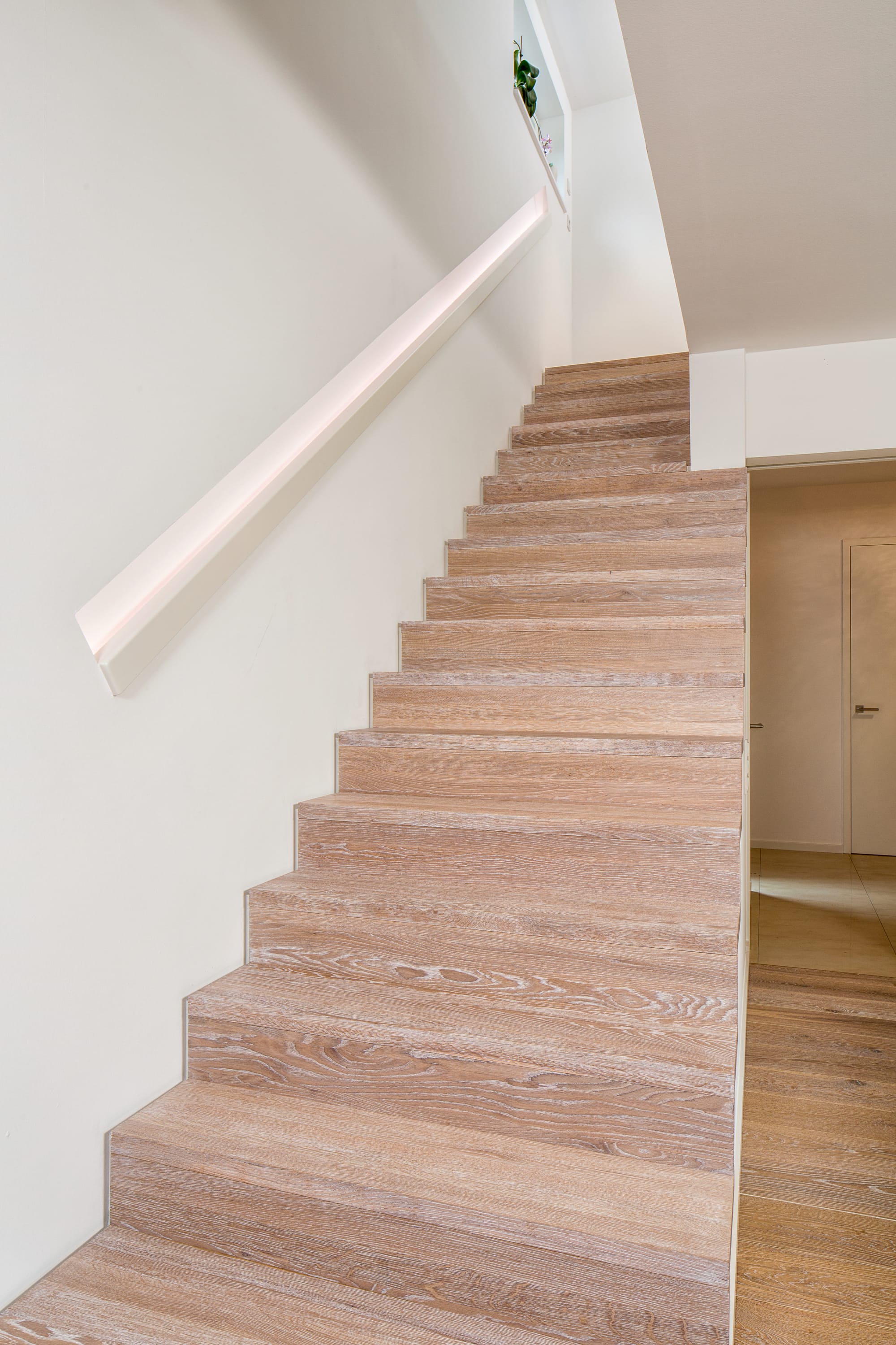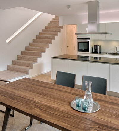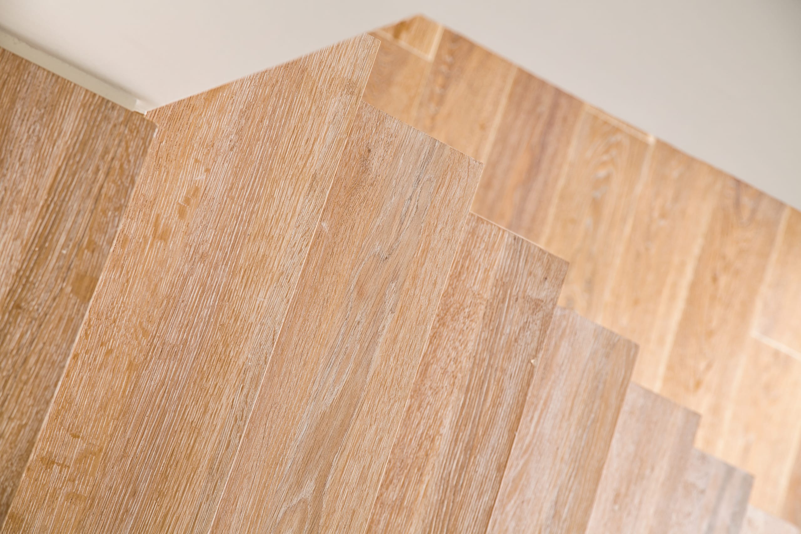 Stufen und Handlauf in der Holzart Akazie mosaik geölt, Wangen verkleidet, eingebautes Regalsystem unter der Treppe