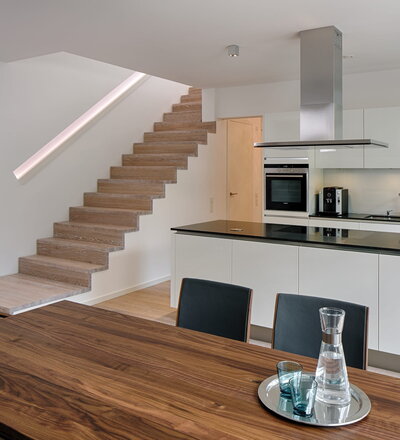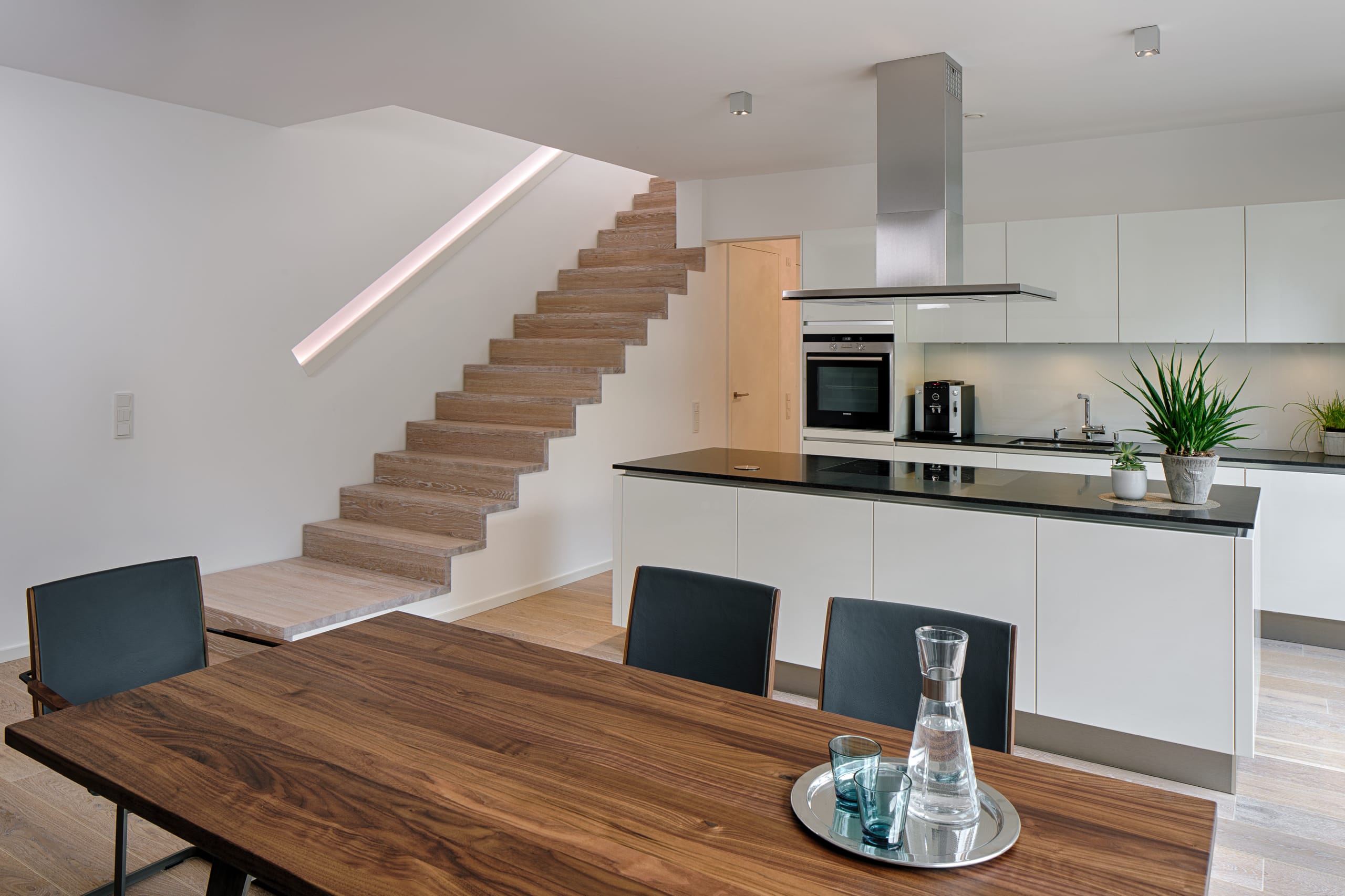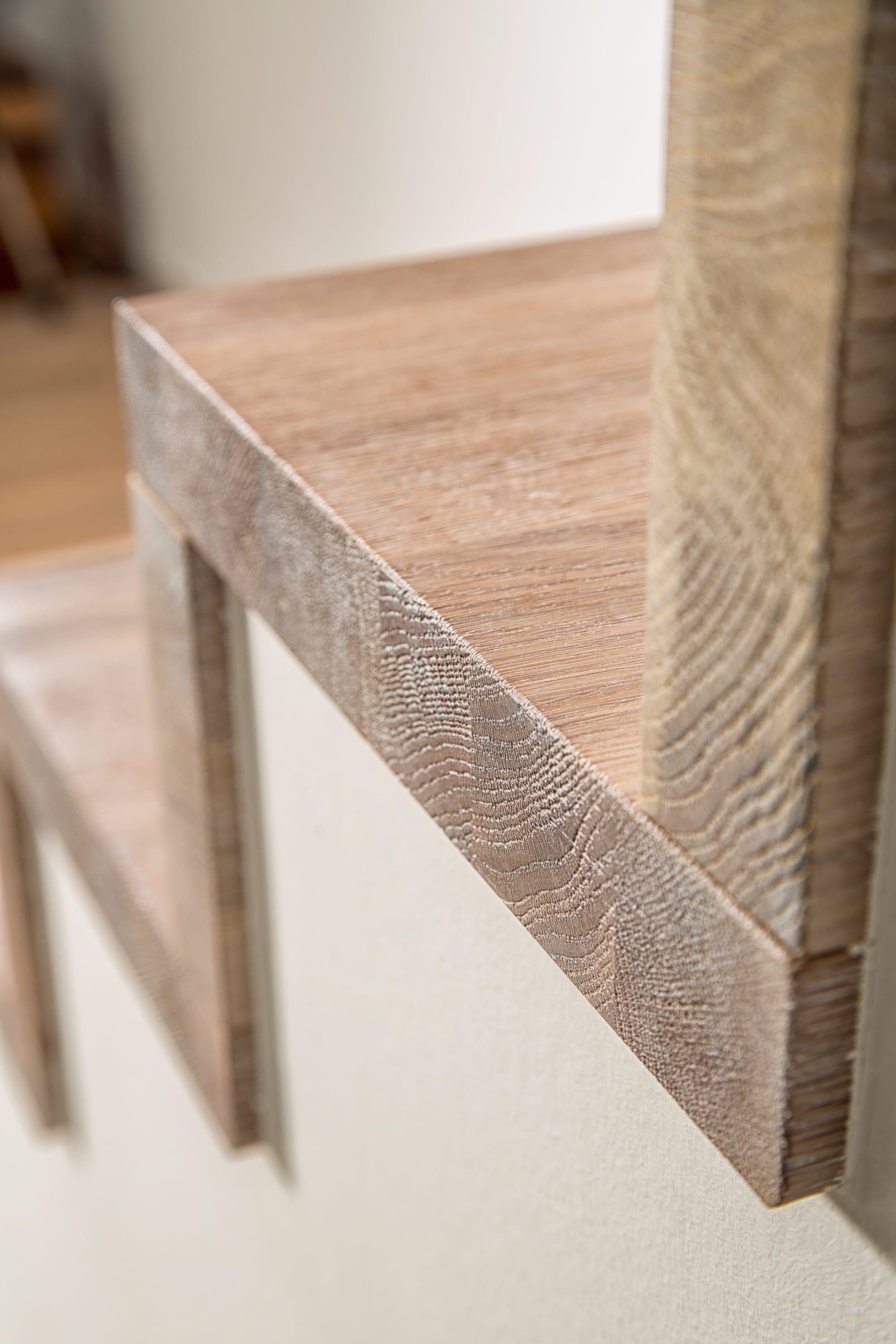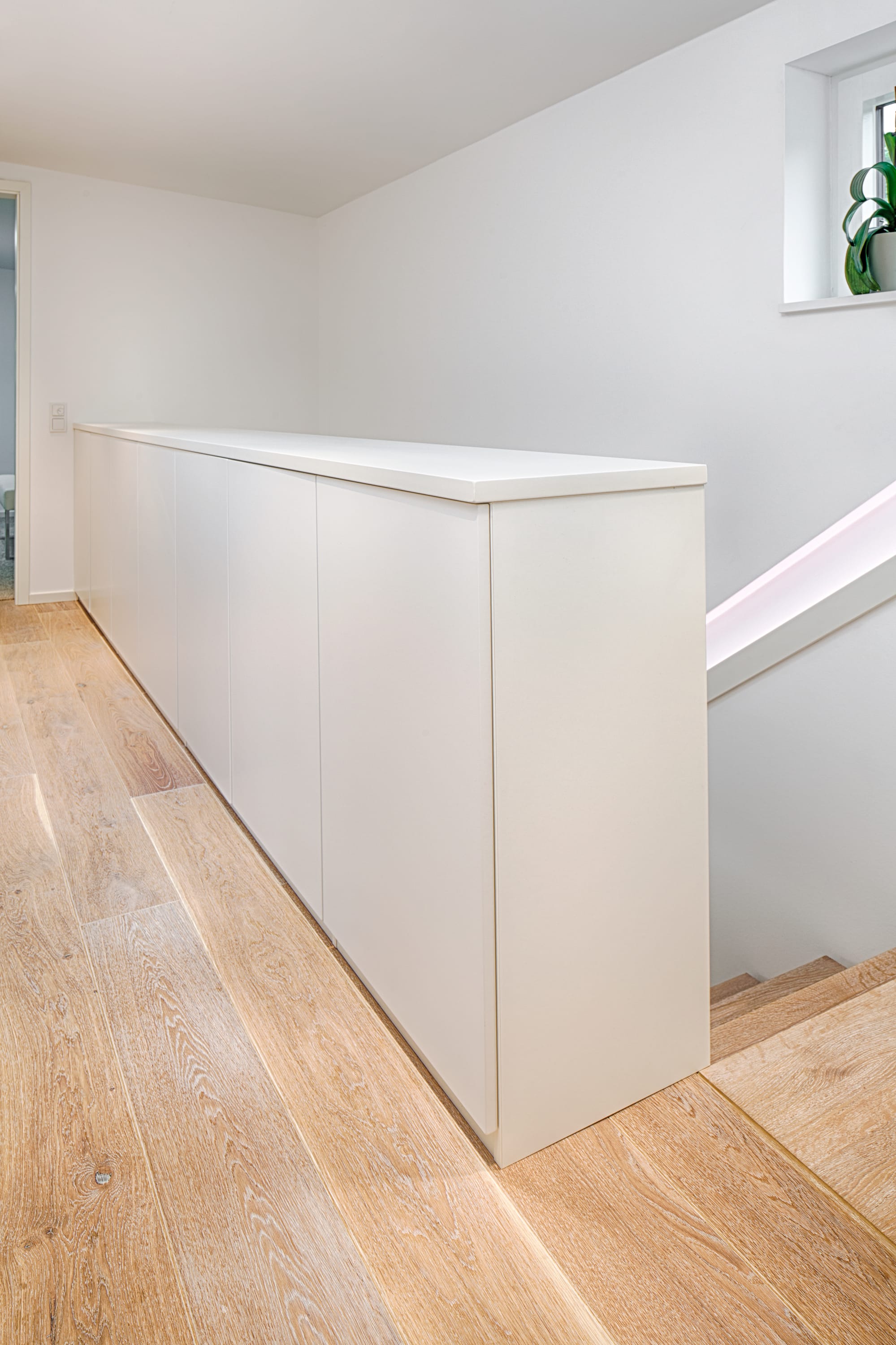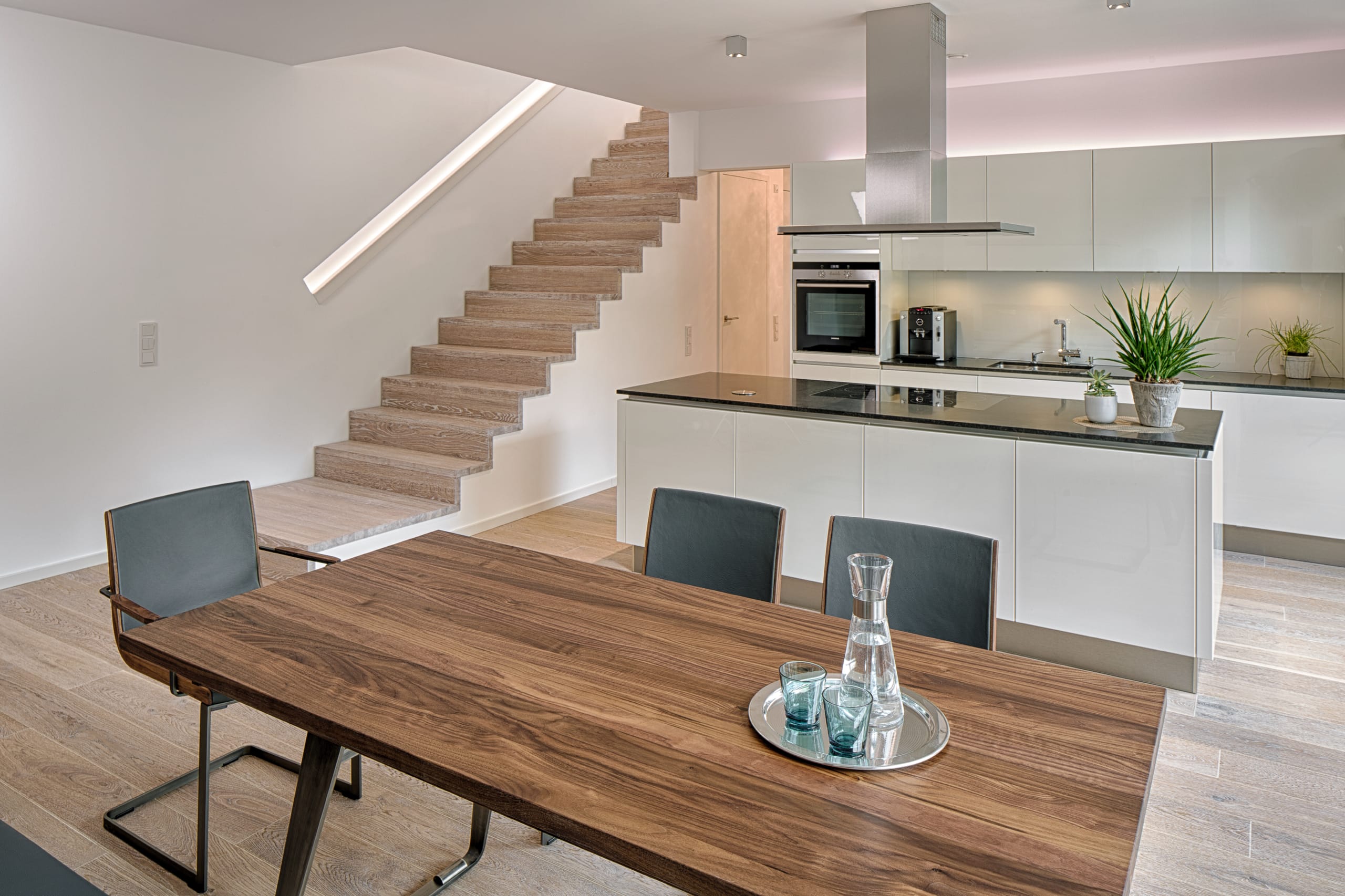 Stufen und Handlauf in der Holzart Akazie mosaik geölt, Wangen verkleidet, eingebautes Regalsystem unter der Treppe
