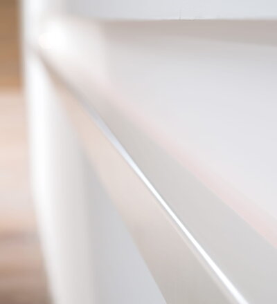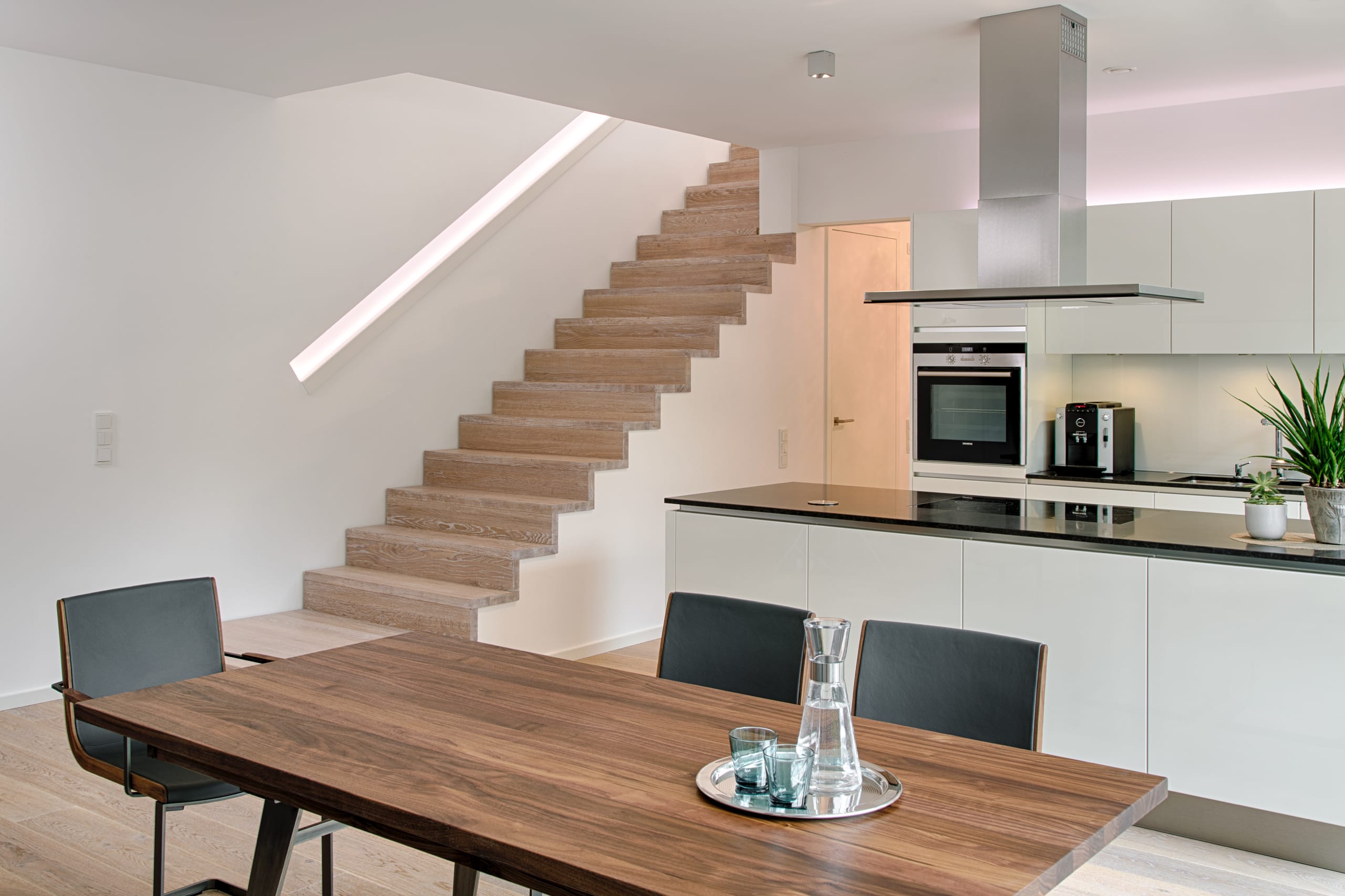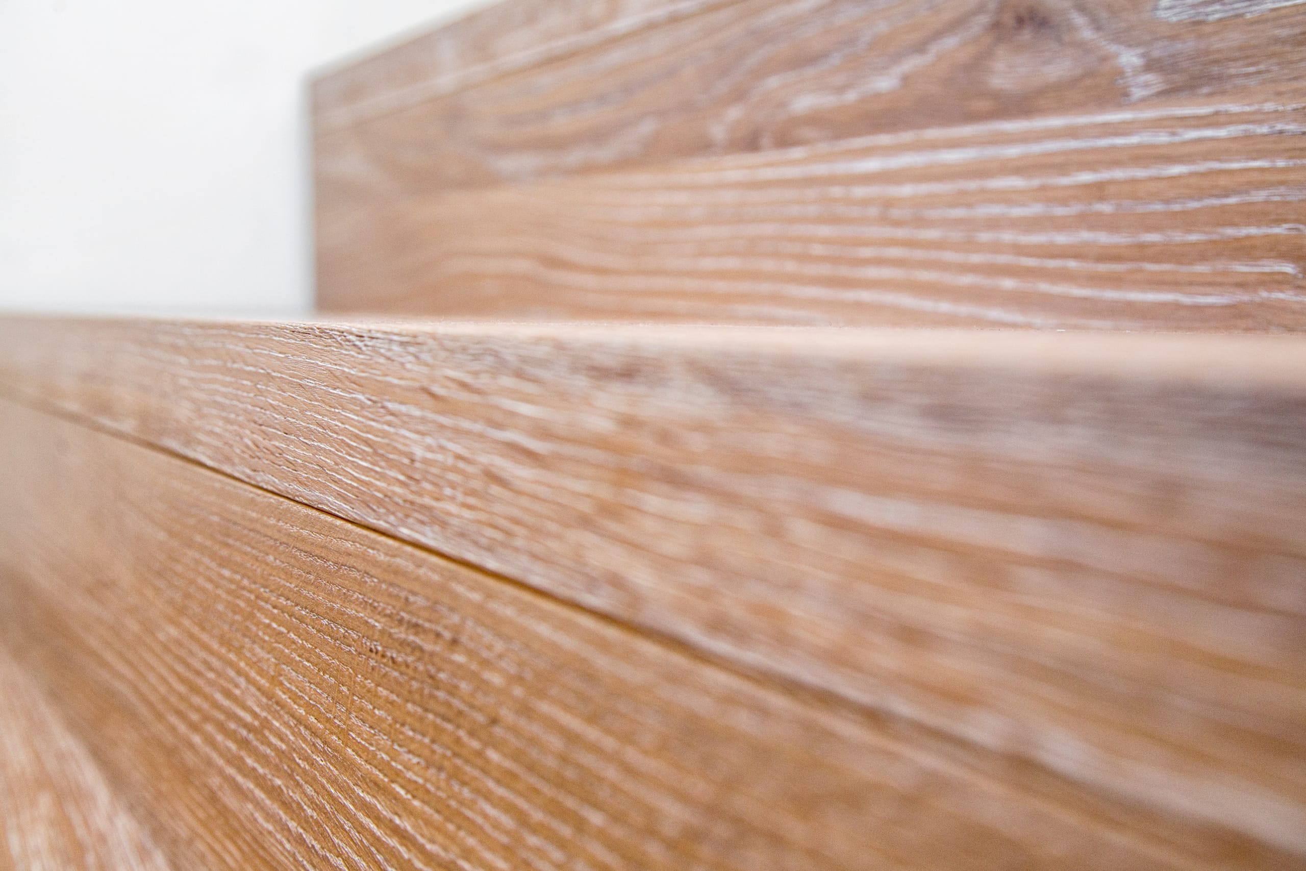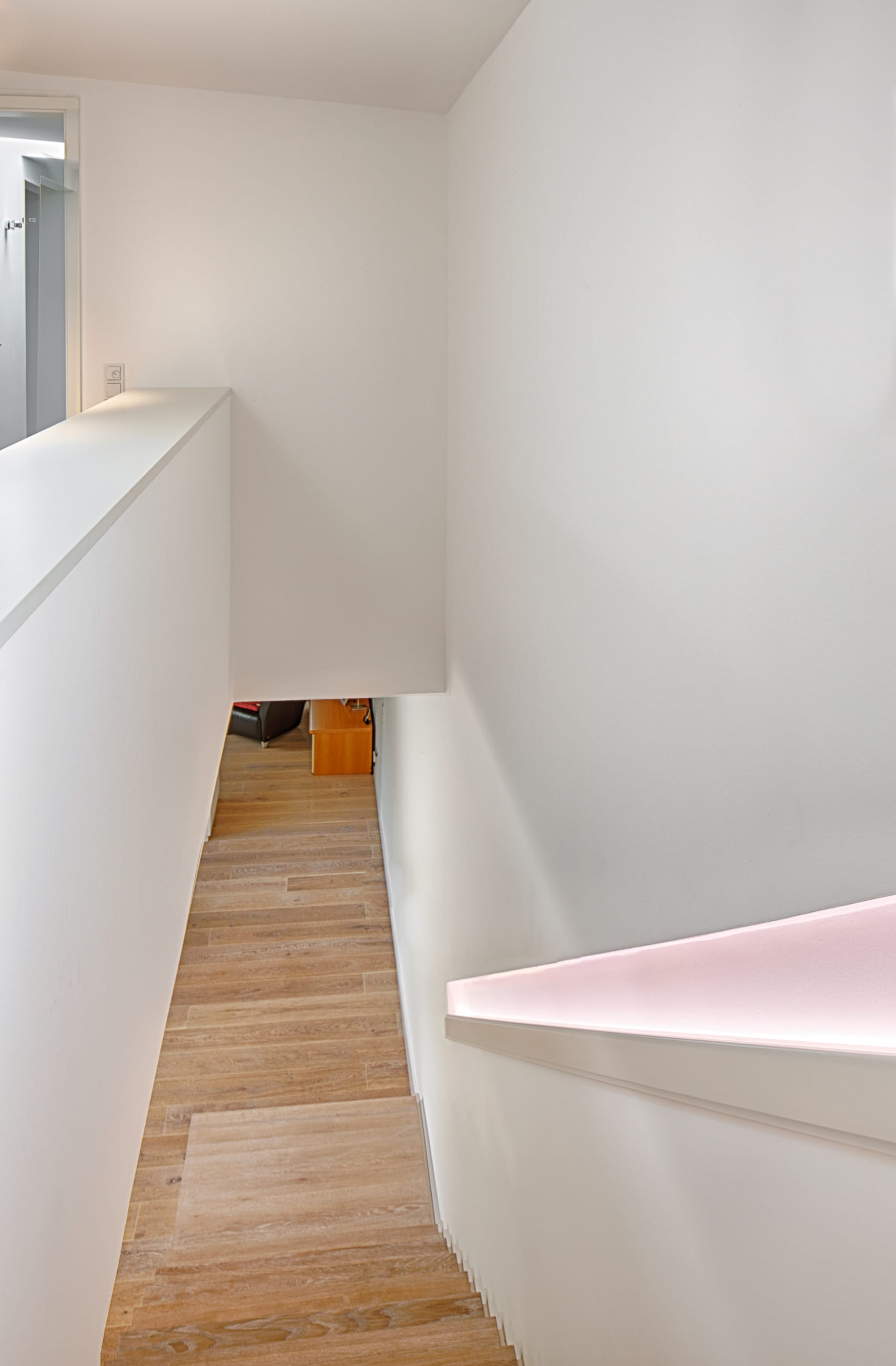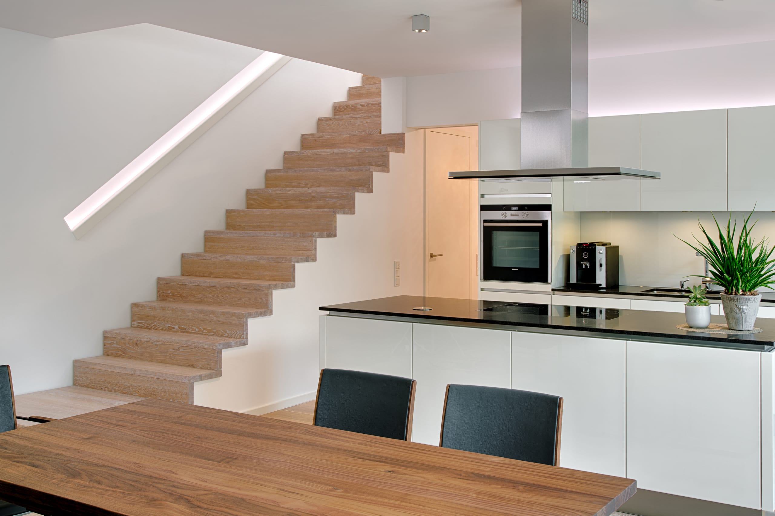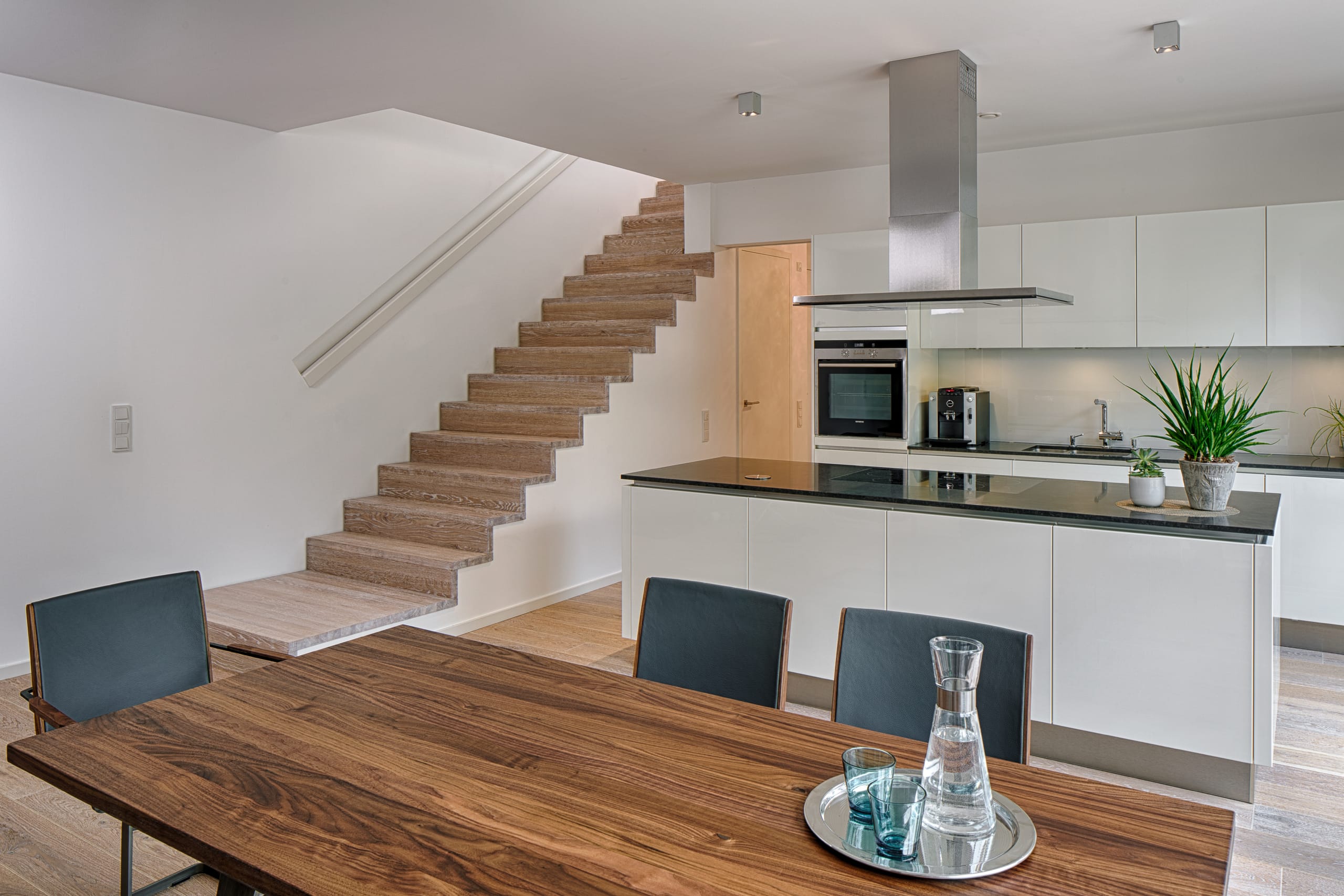 Stufen und Handlauf in der Holzart Akazie mosaik geölt, Wangen verkleidet, eingebautes Regalsystem unter der Treppe