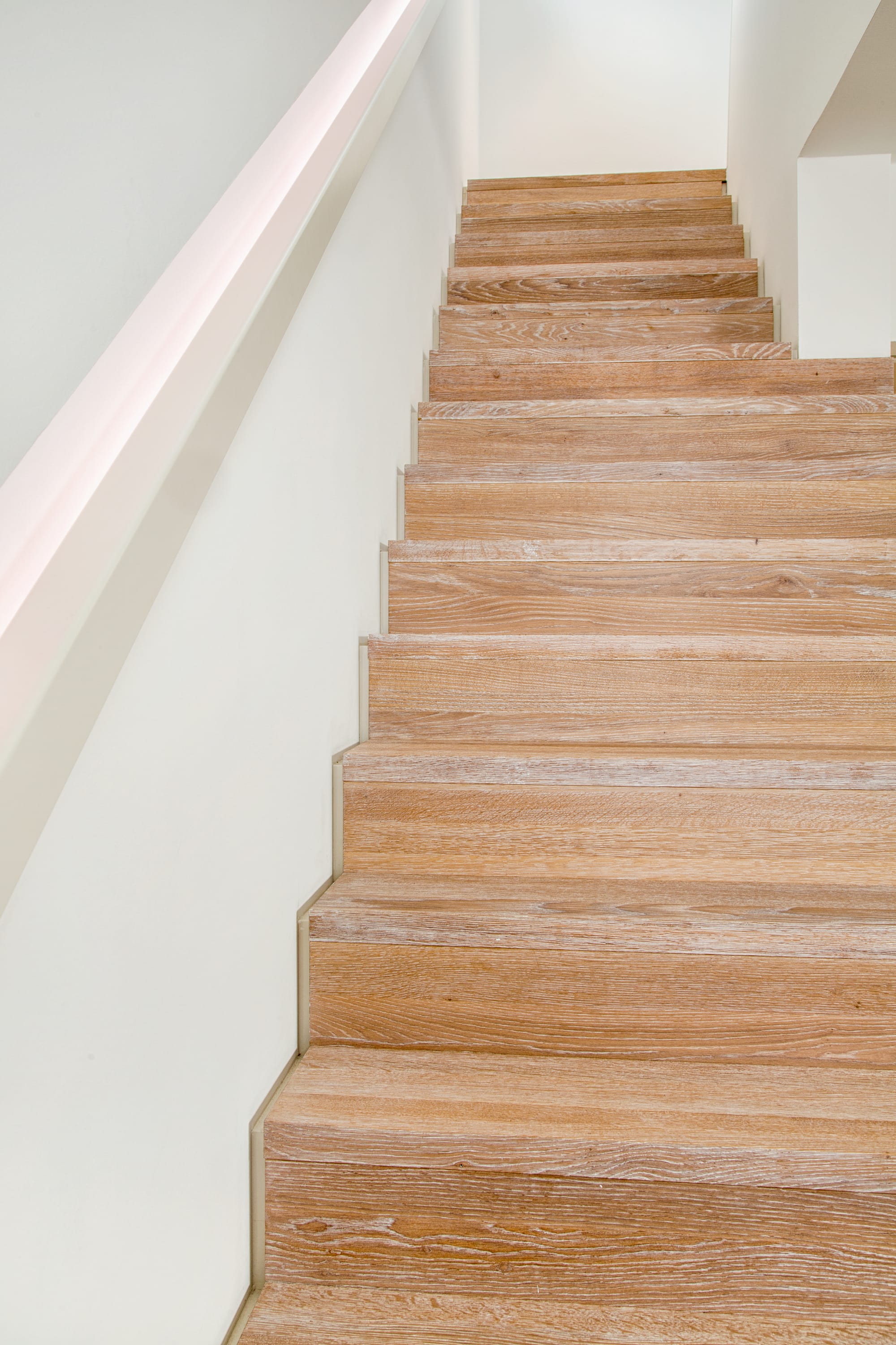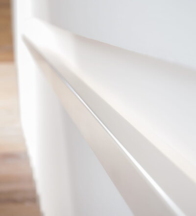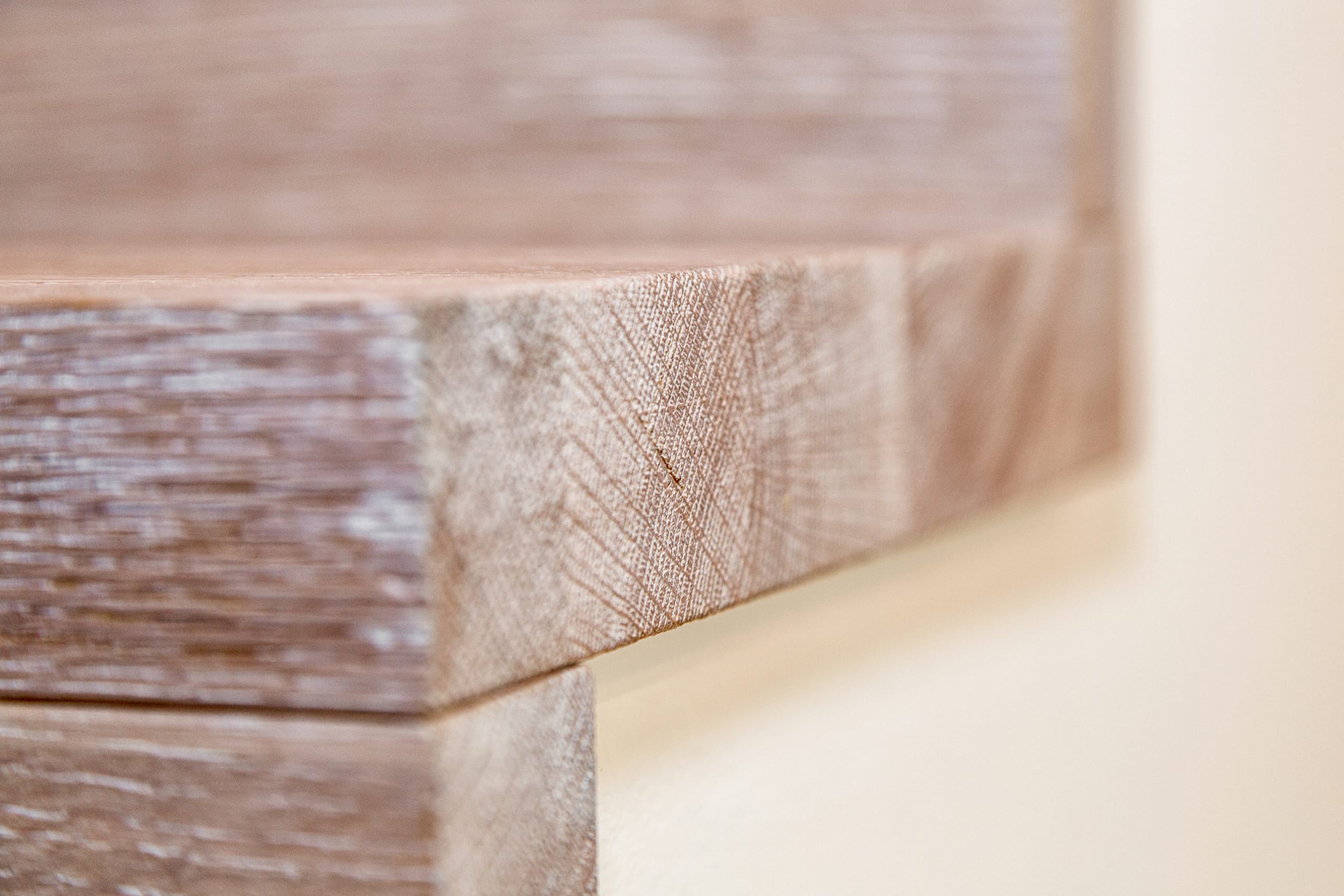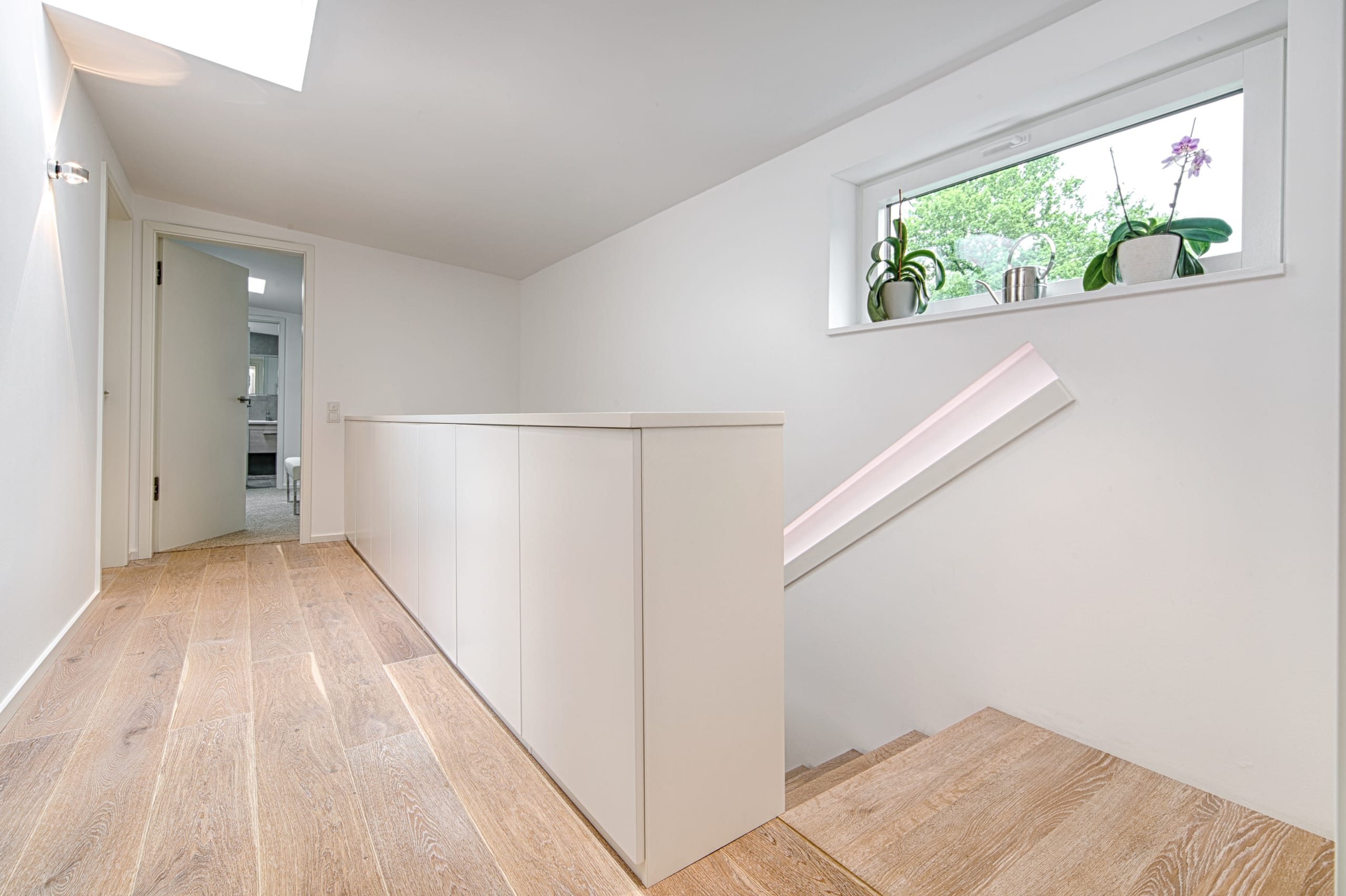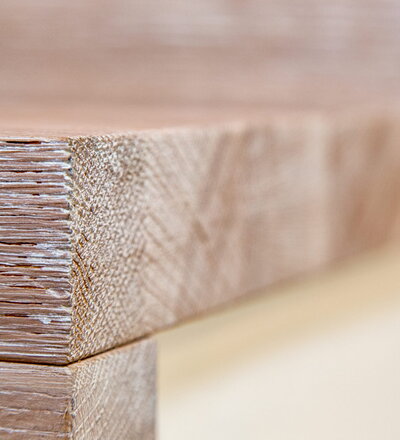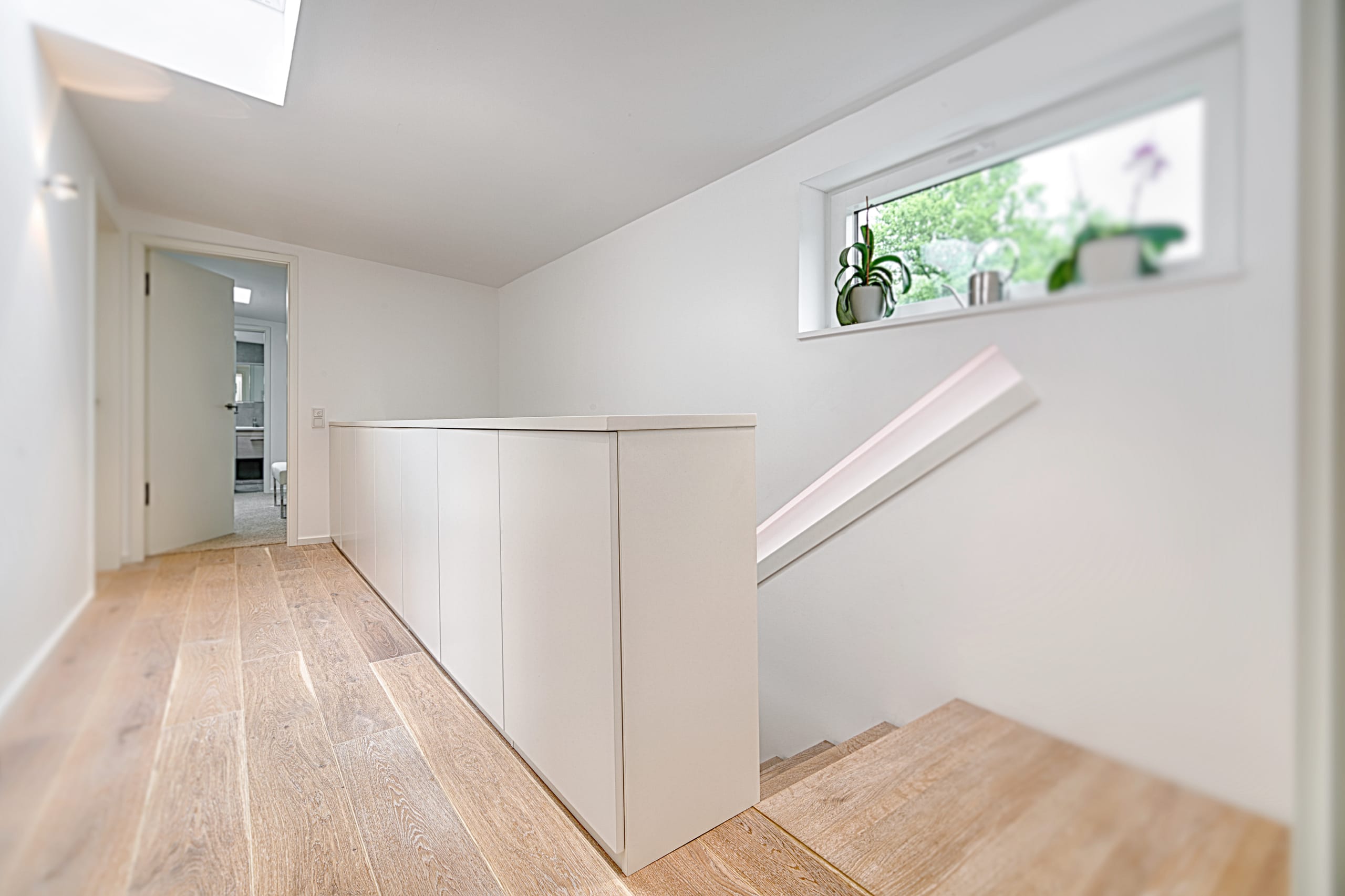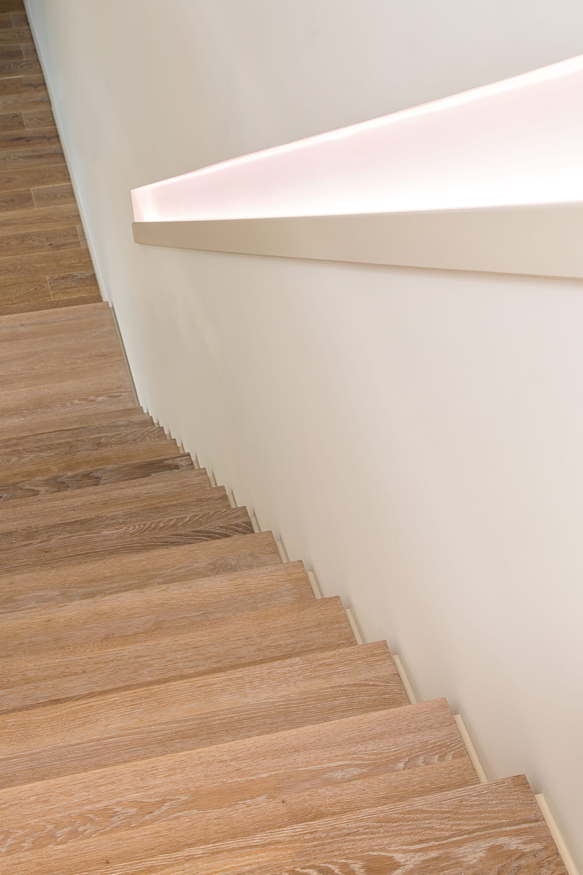 Stufen und Handlauf in der Holzart Akazie mosaik geölt, Wangen verkleidet, eingebautes Regalsystem unter der Treppe