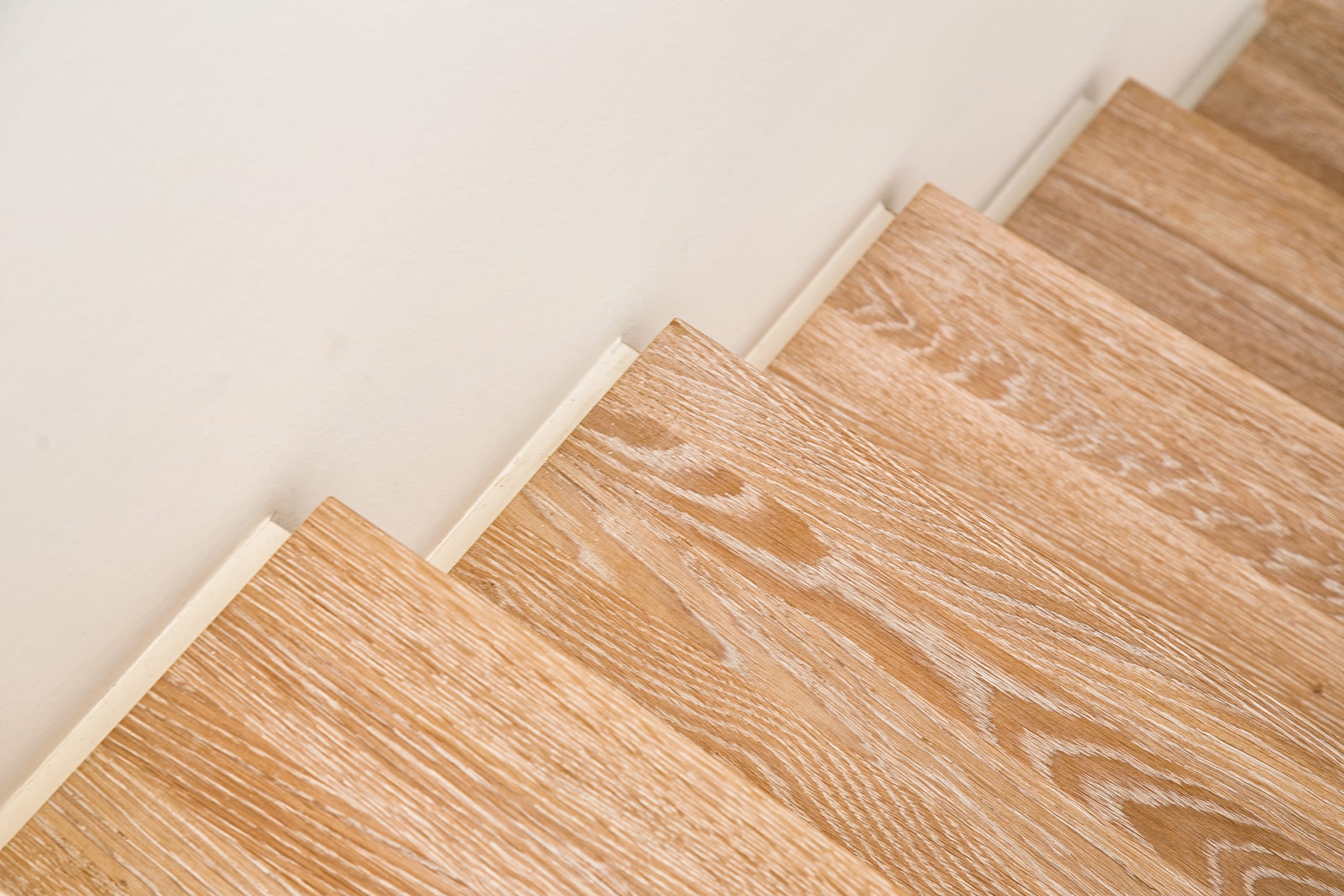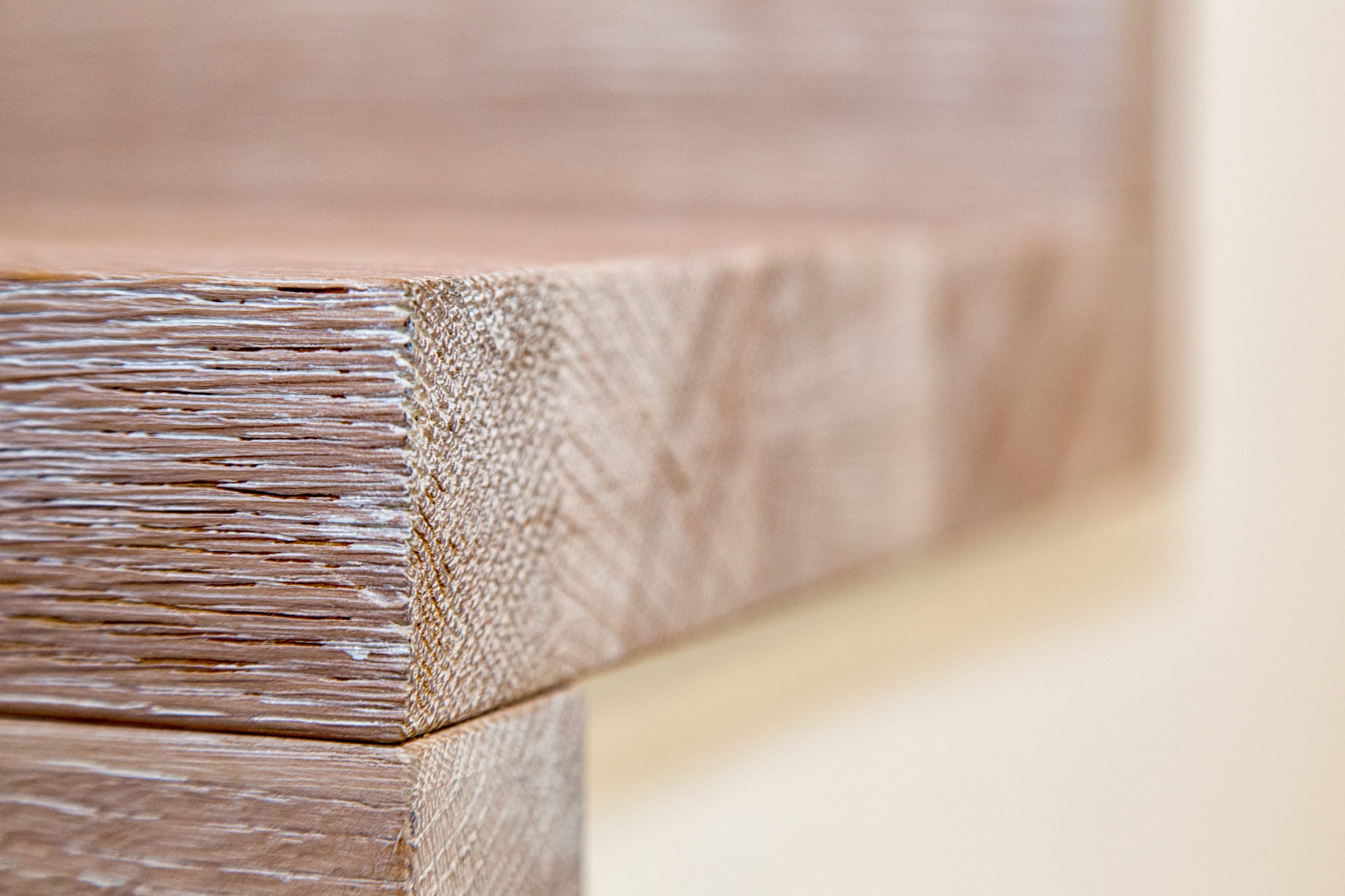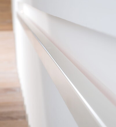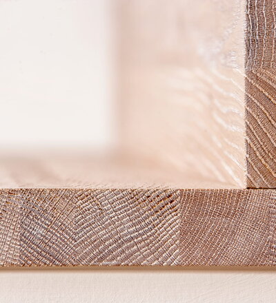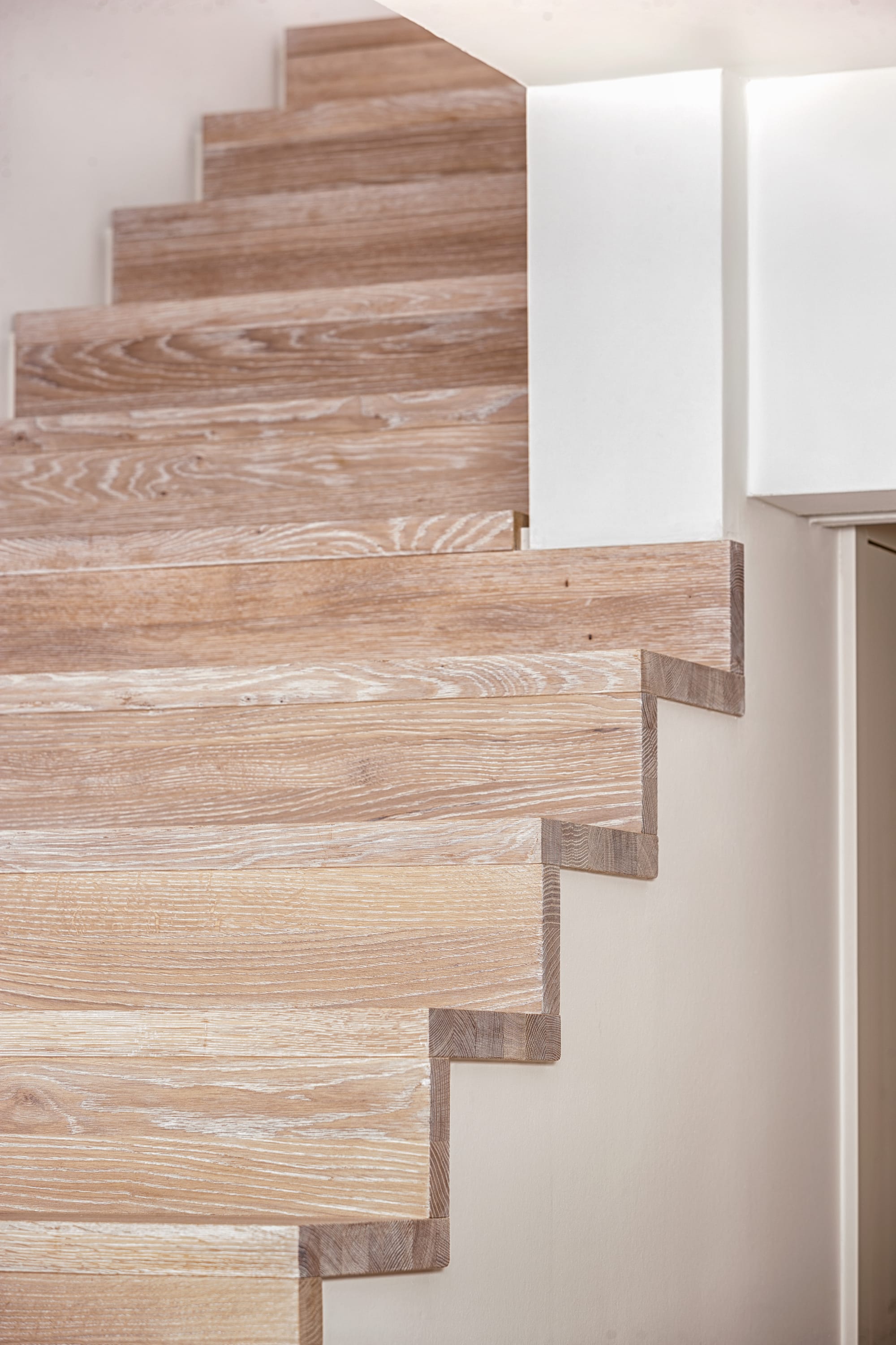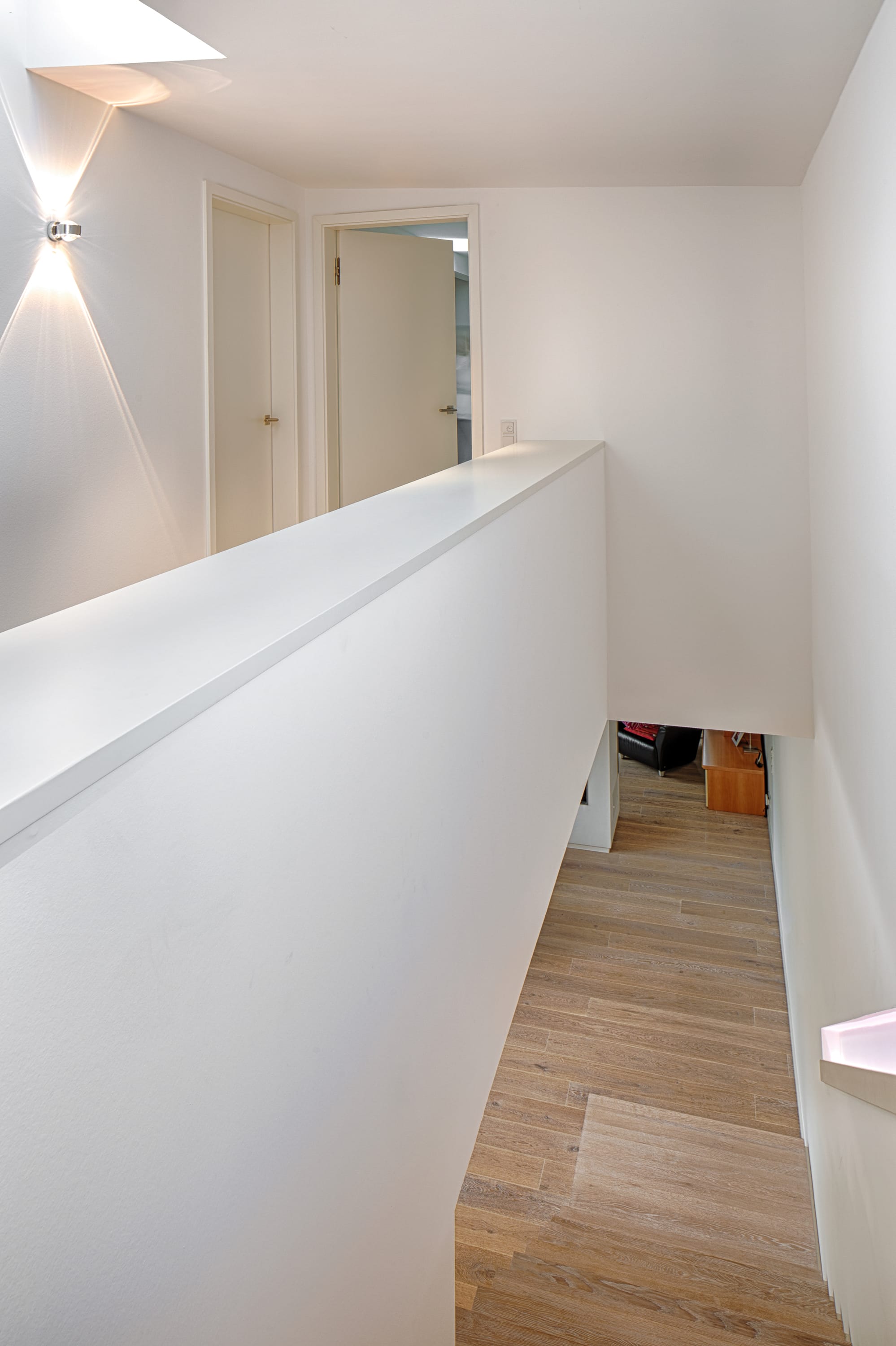 Stufen und Handlauf in der Holzart Akazie mosaik geölt, Wangen verkleidet, eingebautes Regalsystem unter der Treppe