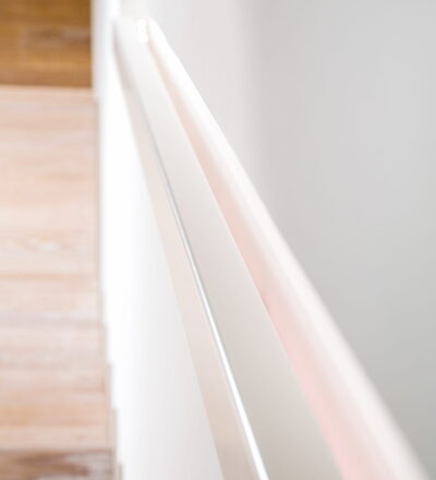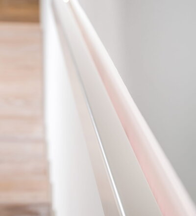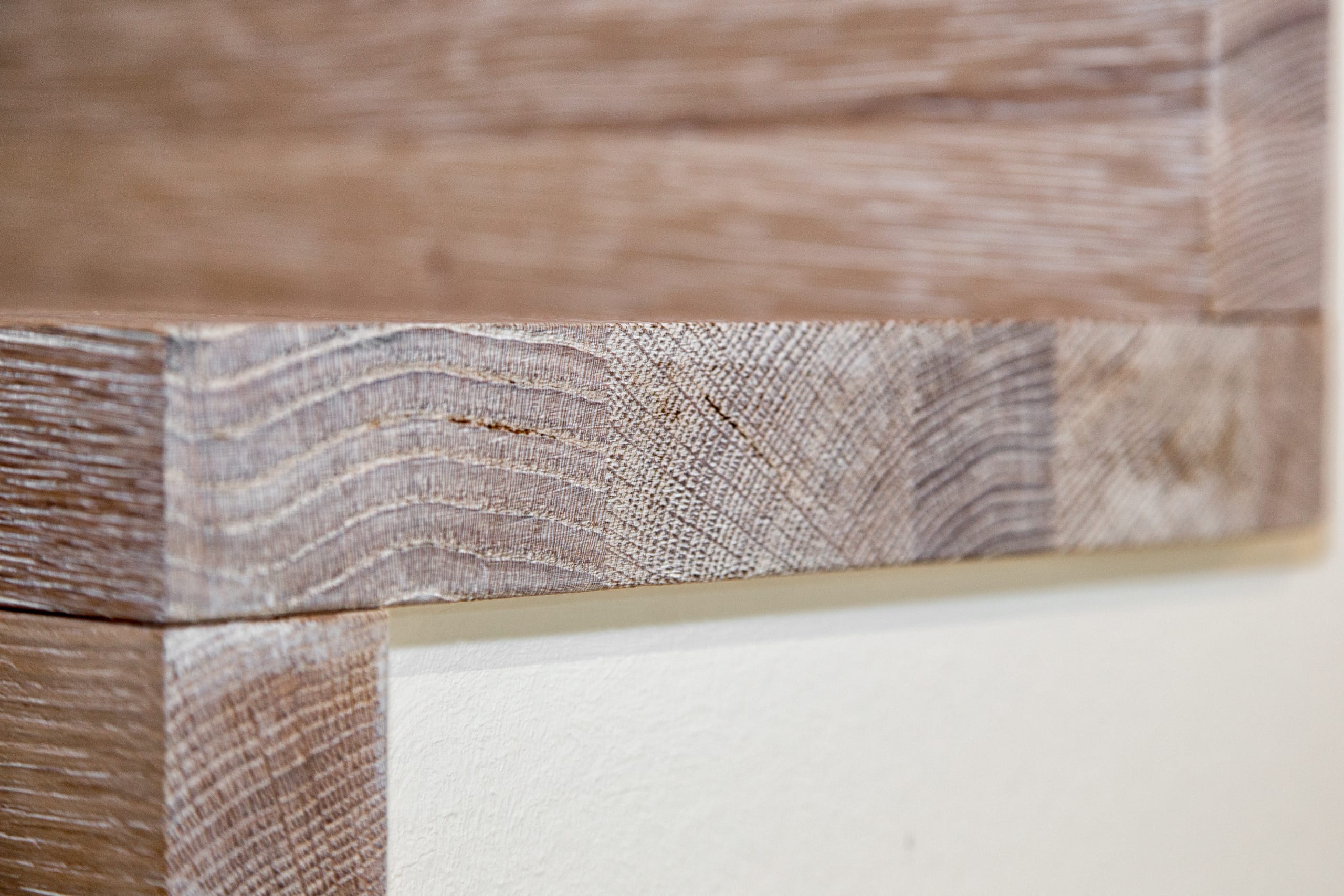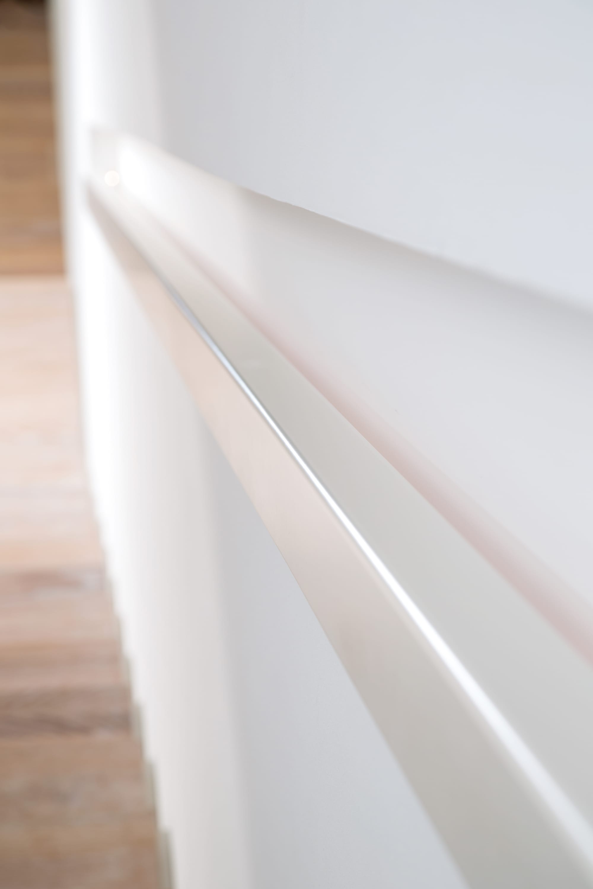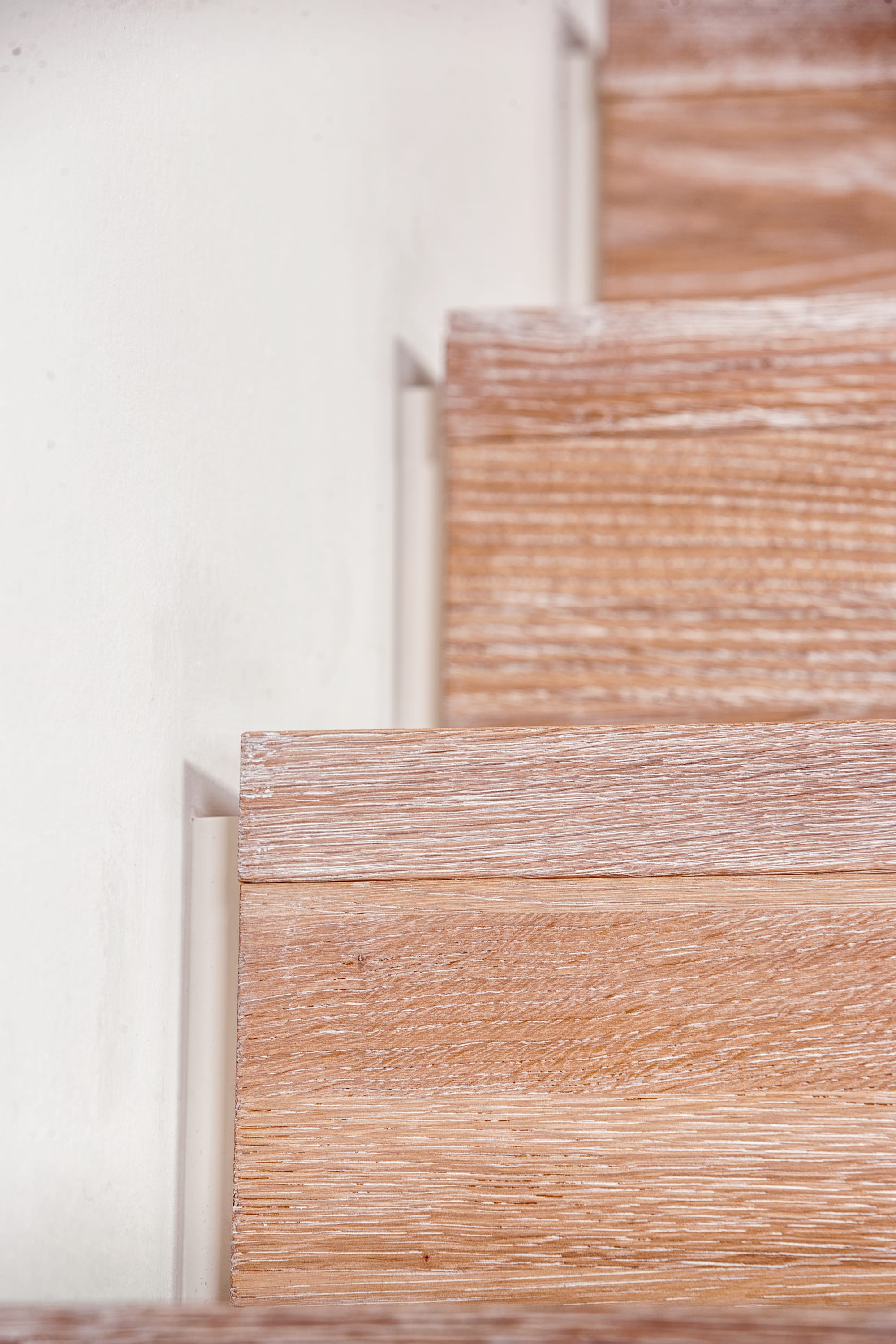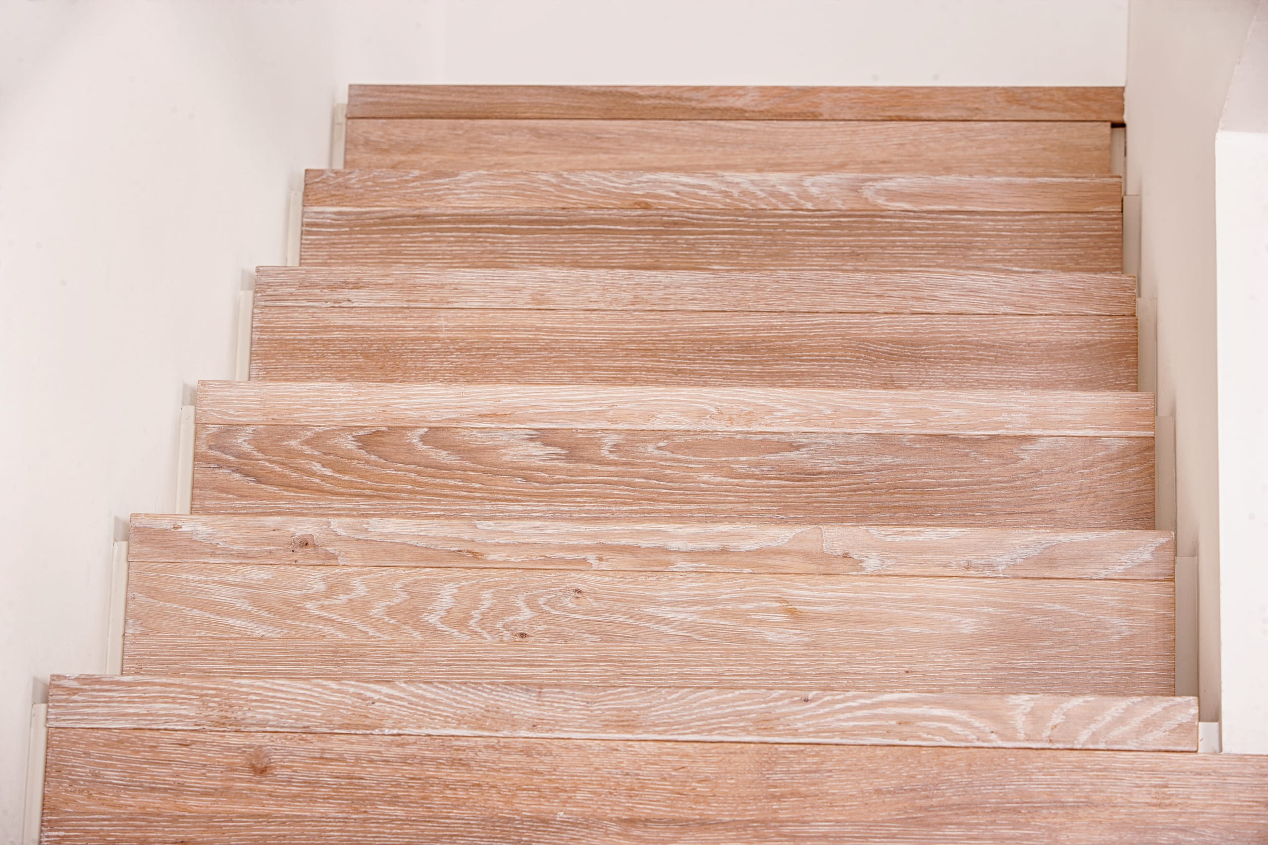 Stufen und Handlauf in der Holzart Akazie mosaik geölt, Wangen verkleidet, eingebautes Regalsystem unter der Treppe