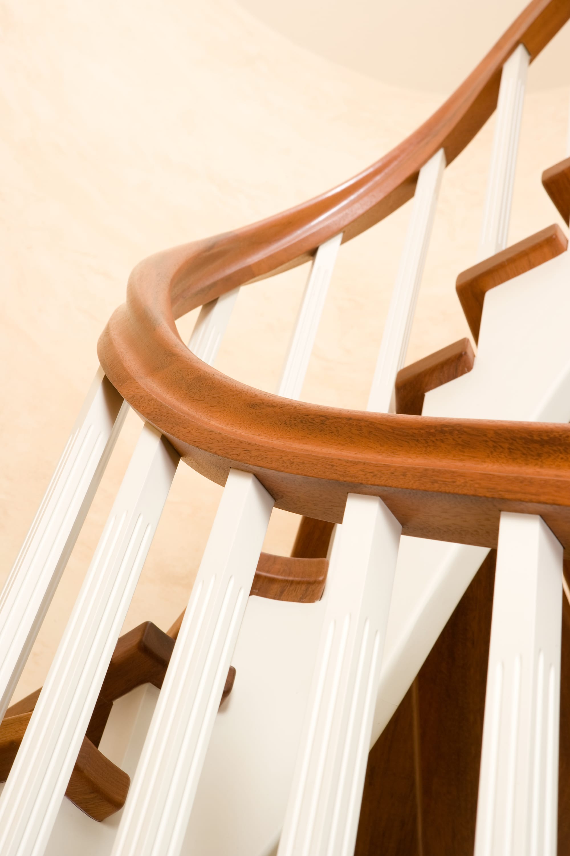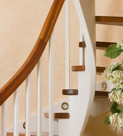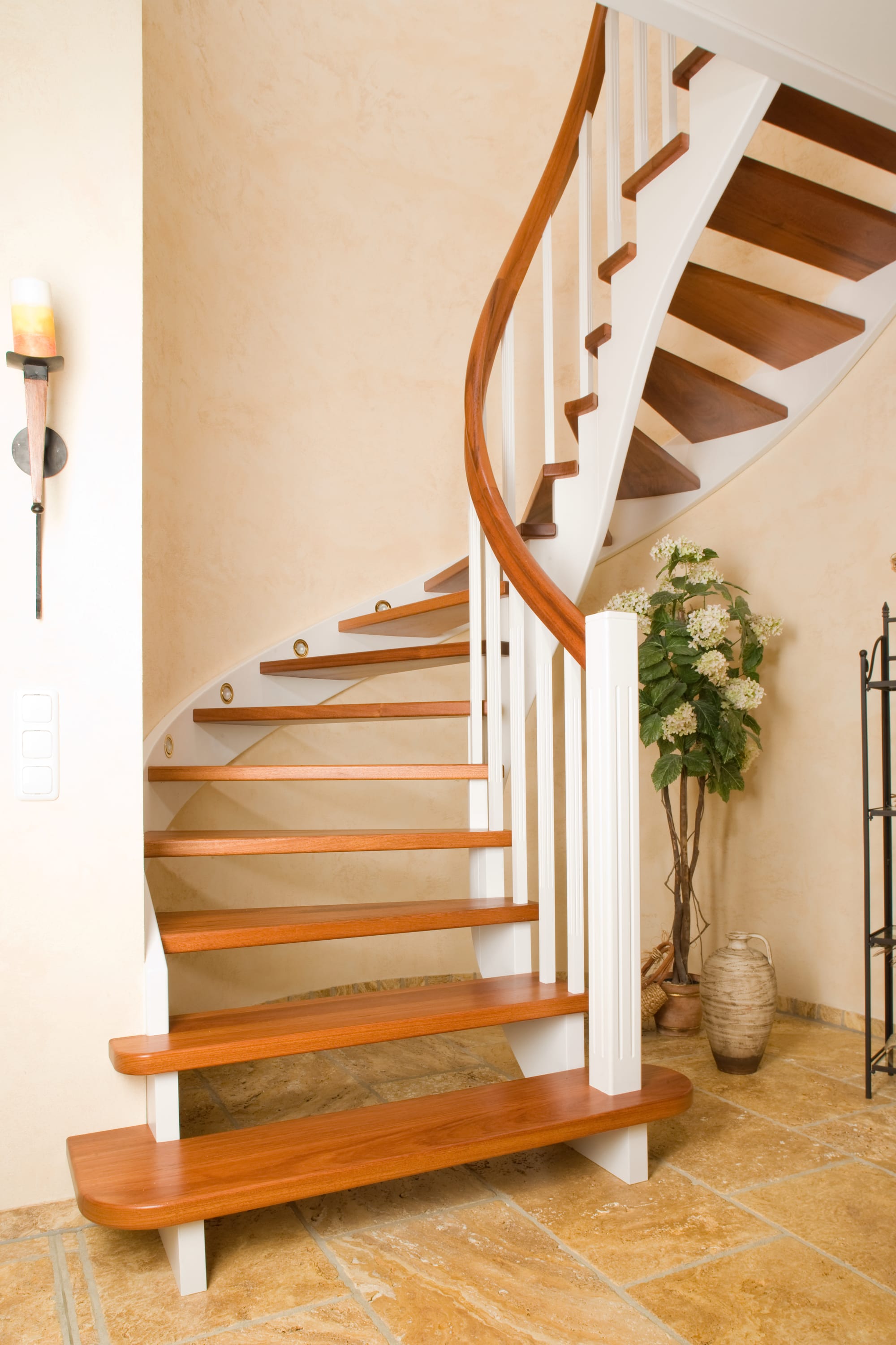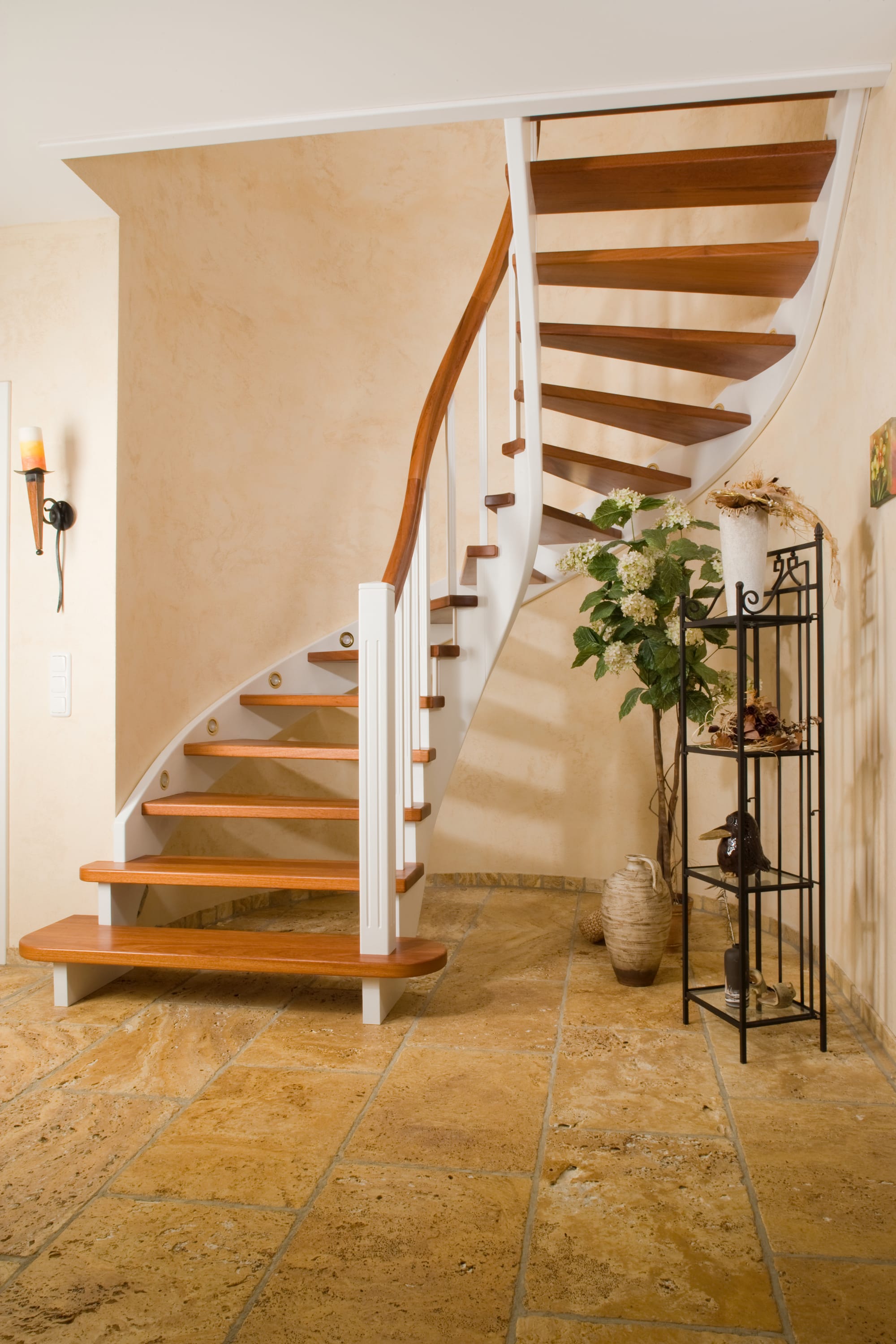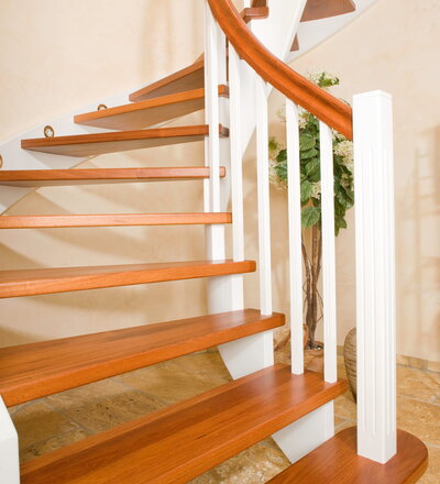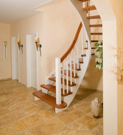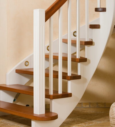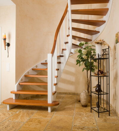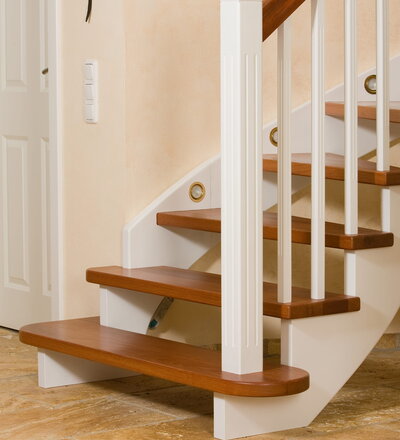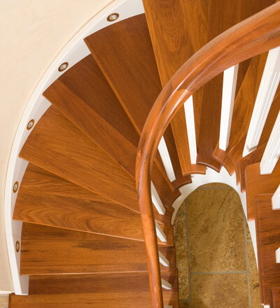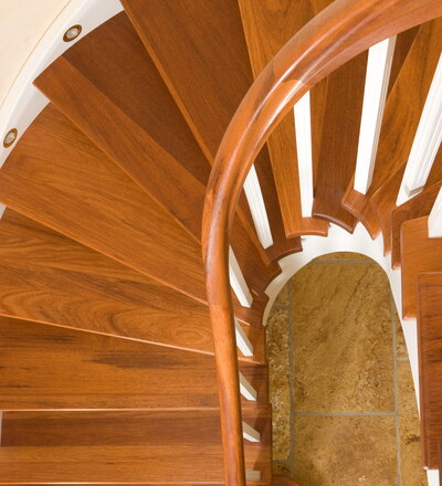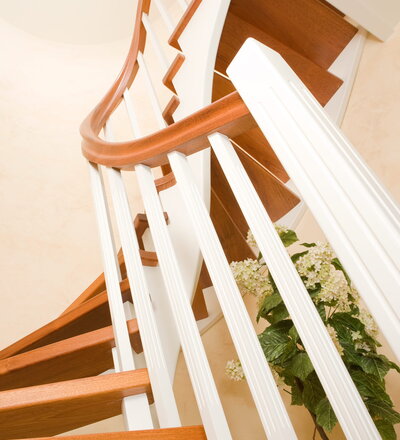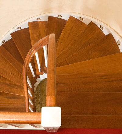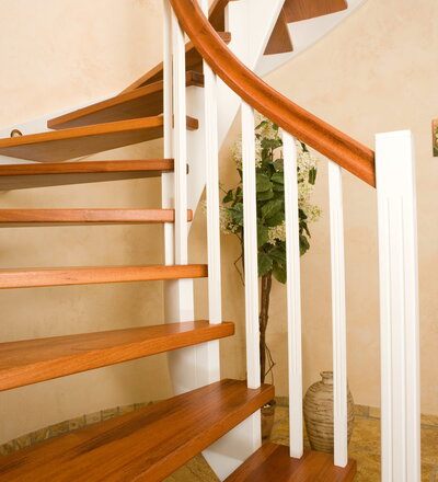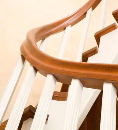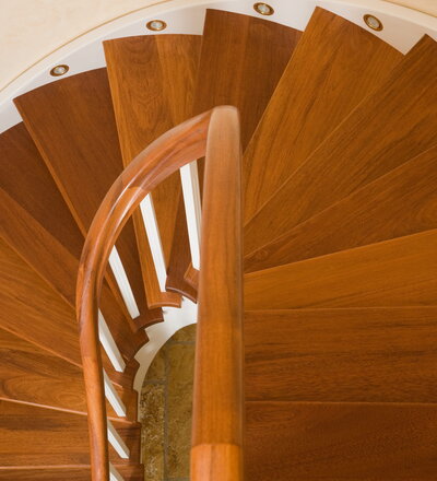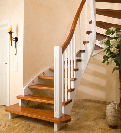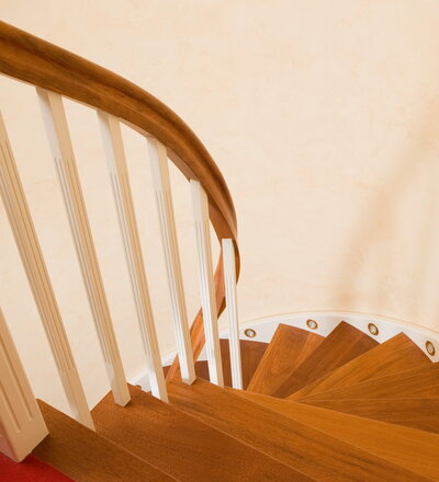 Wangentreppe wandseitig an einen runden Treppenschacht angepasst; freiseitig aufgesattelt mit schwungvollem Innengeländer; Holzart Merbau