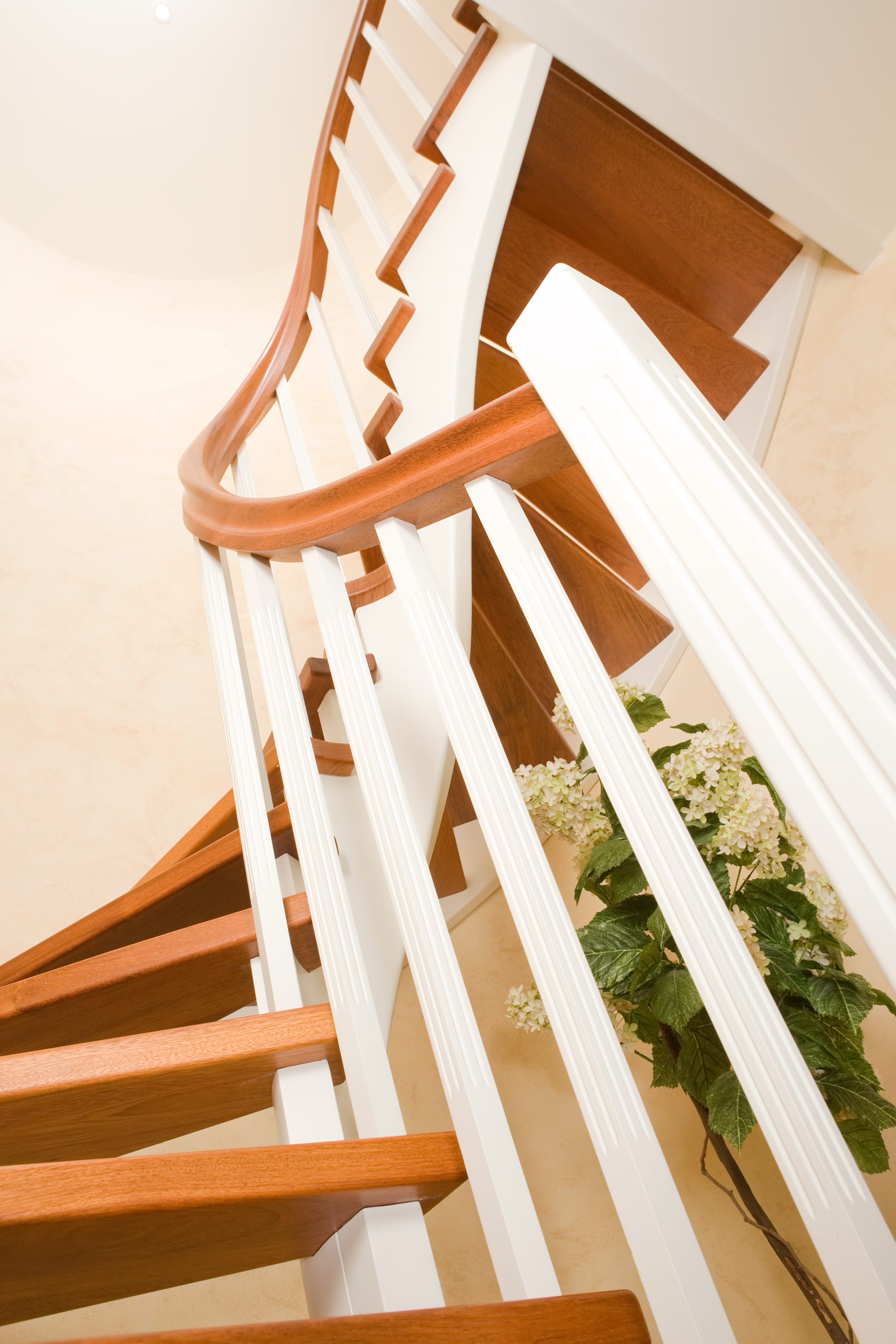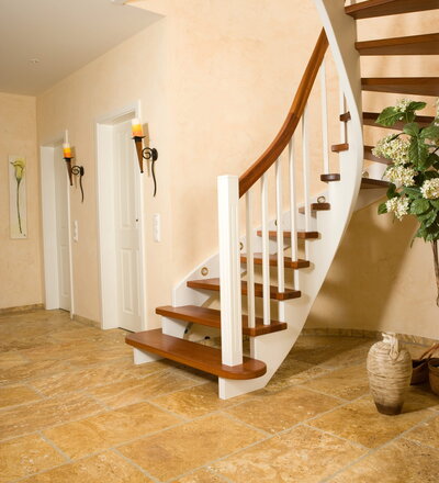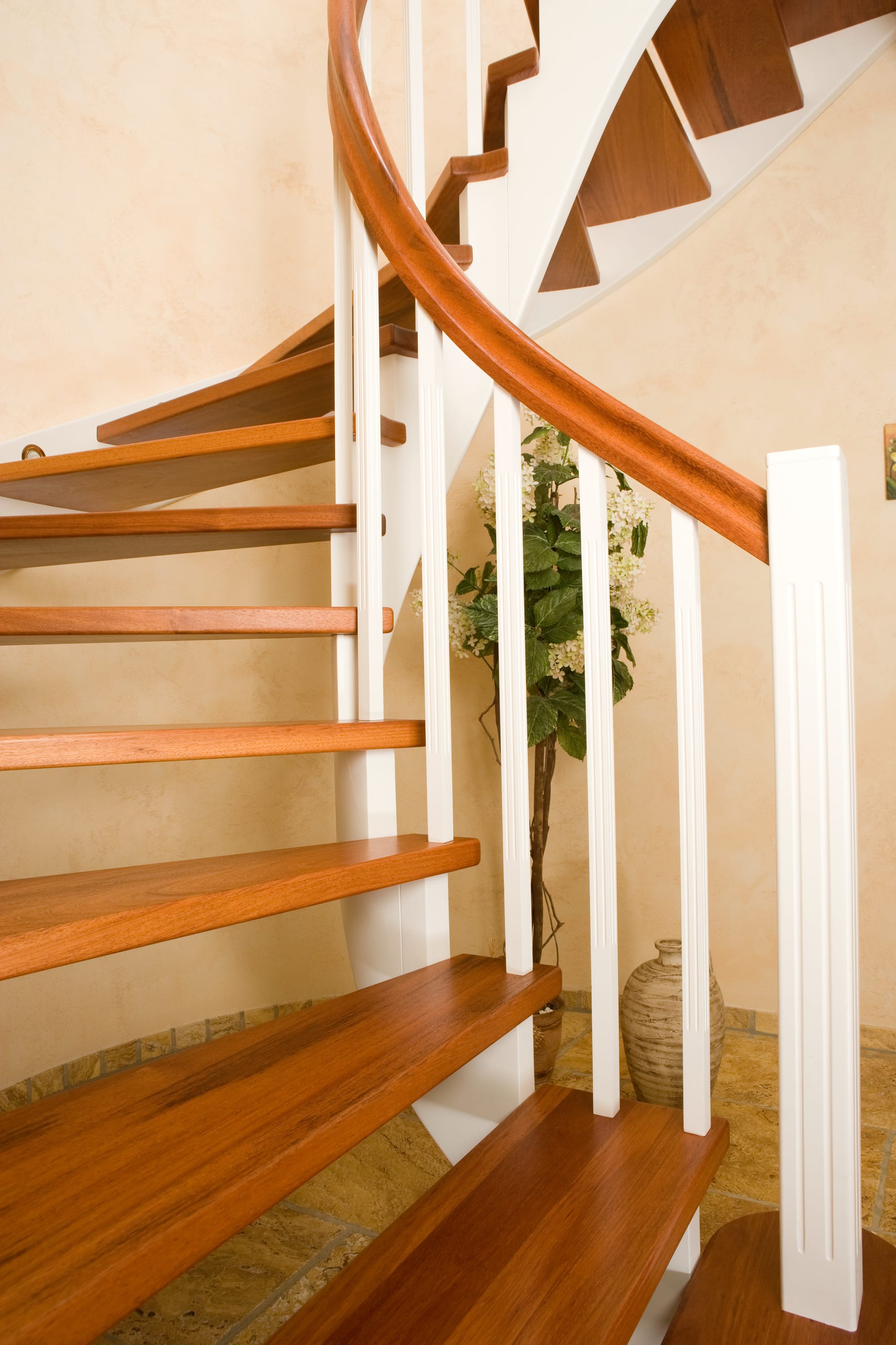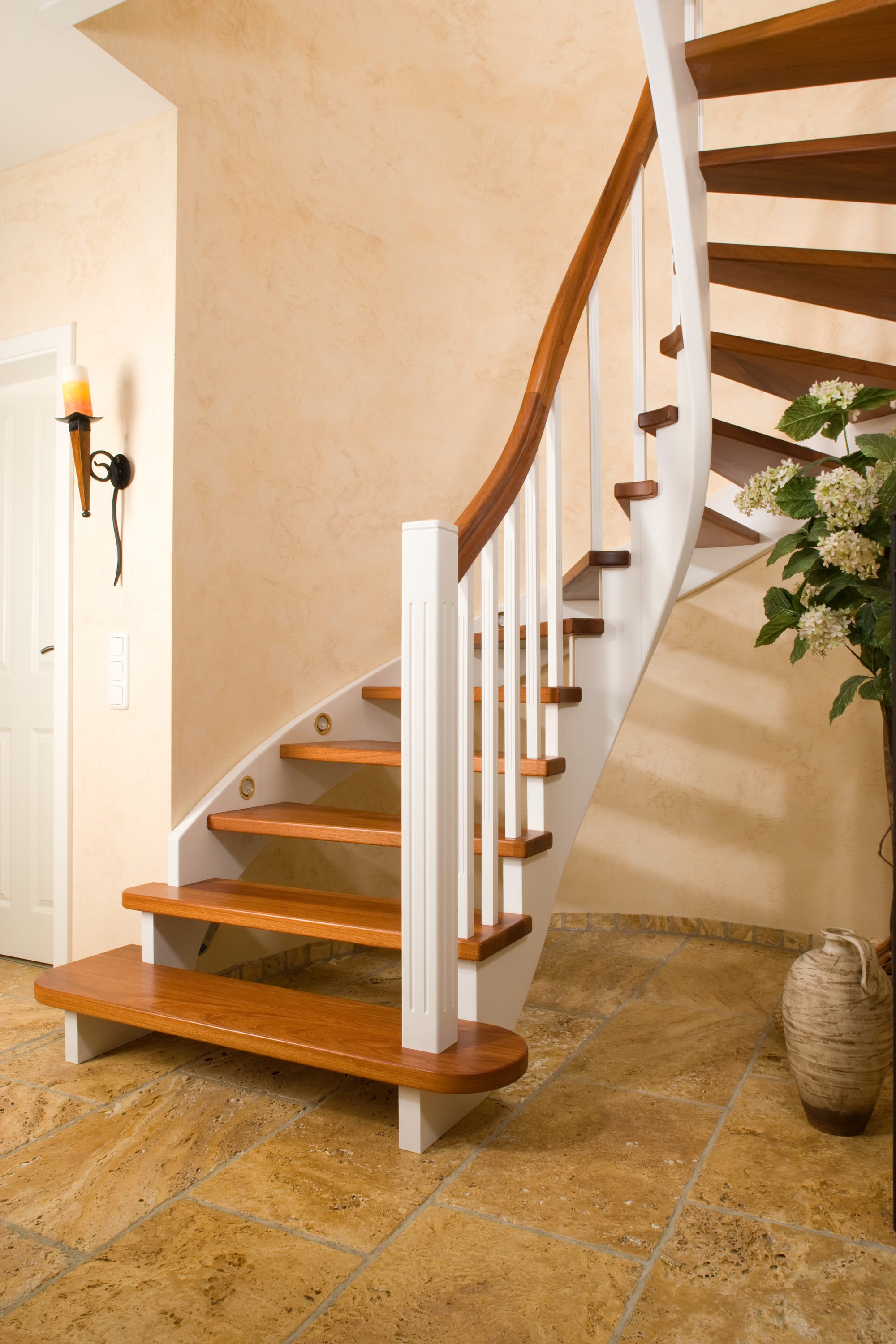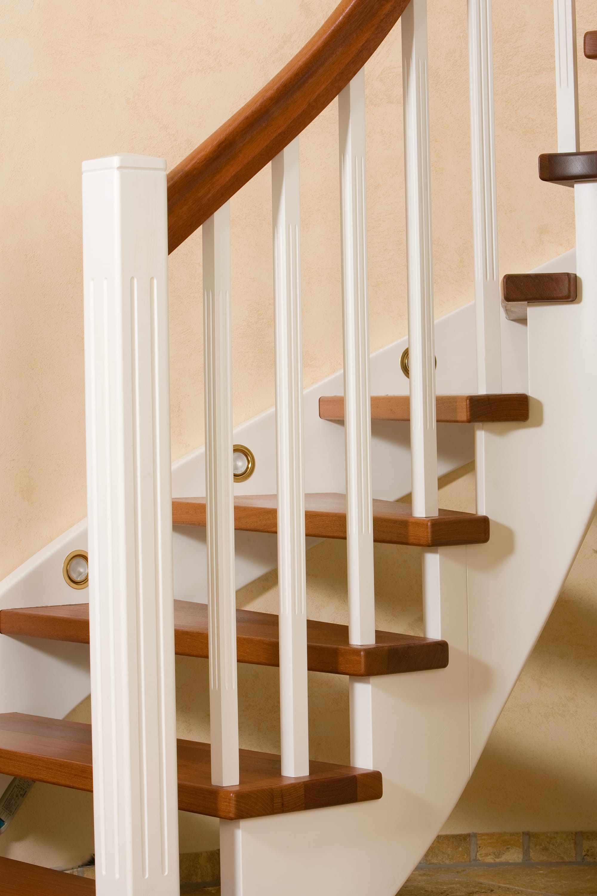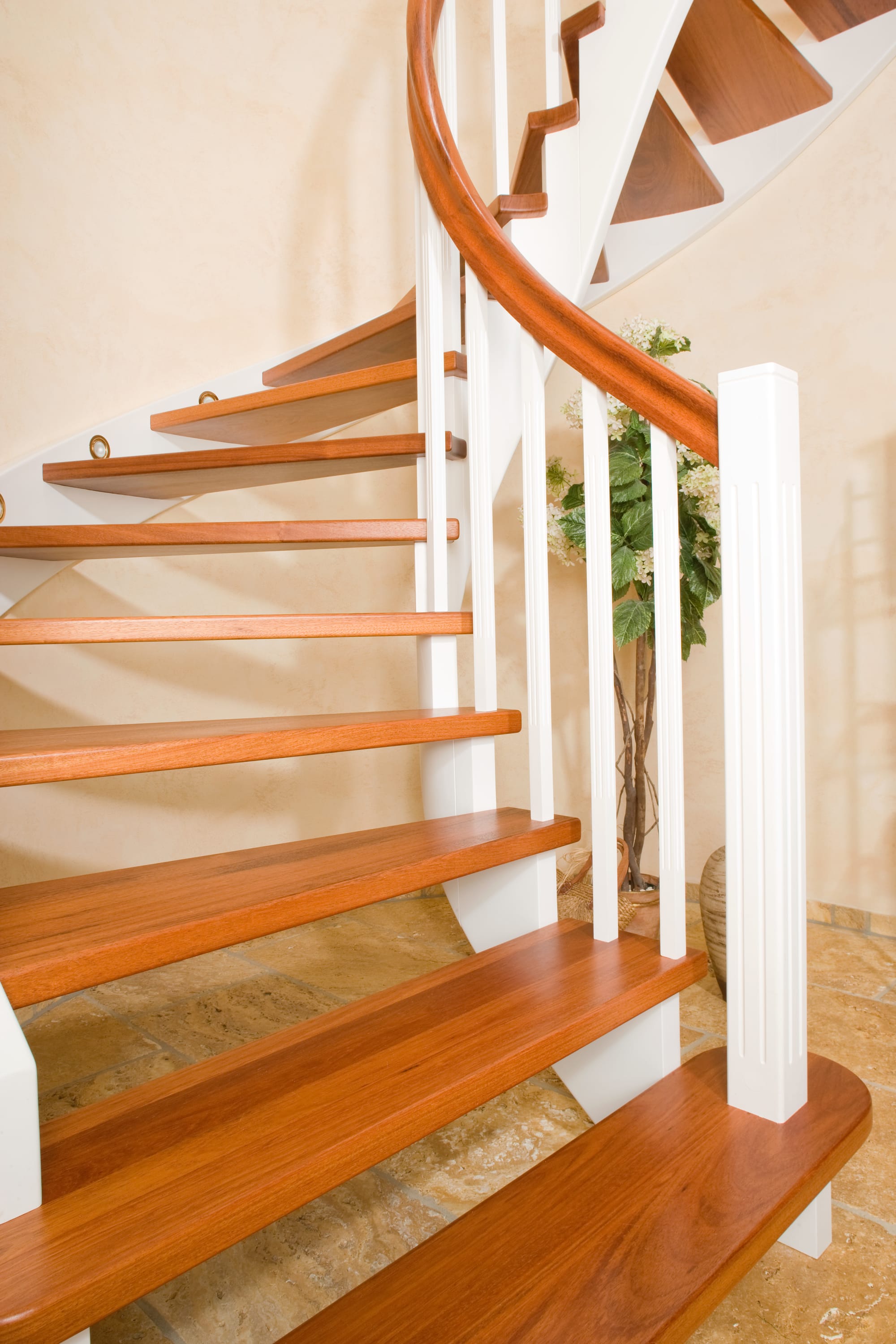 Wangentreppe wandseitig an einen runden Treppenschacht angepasst; freiseitig aufgesattelt mit schwungvollem Innengeländer; Holzart Merbau