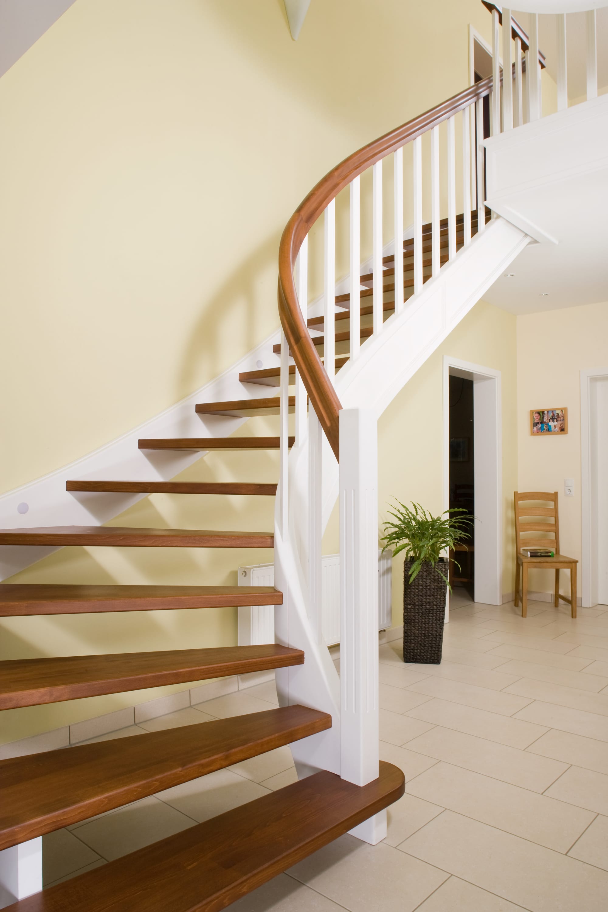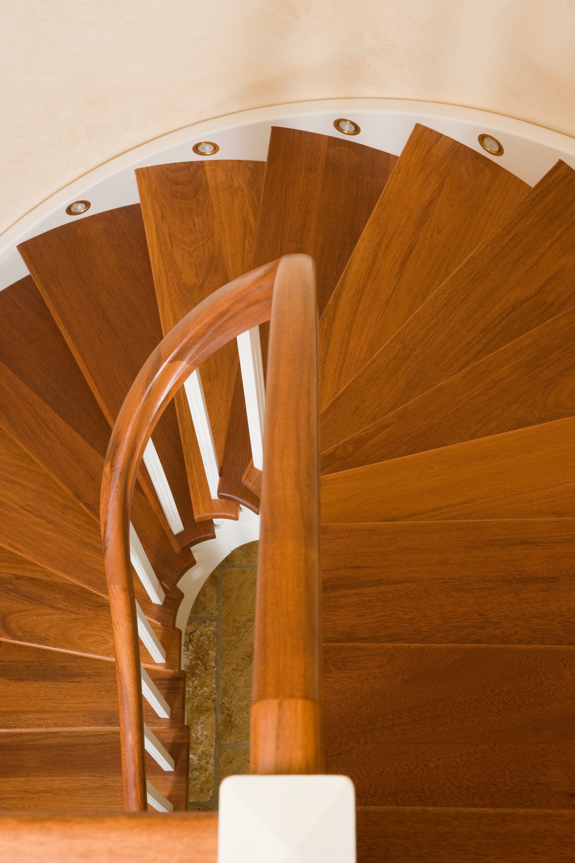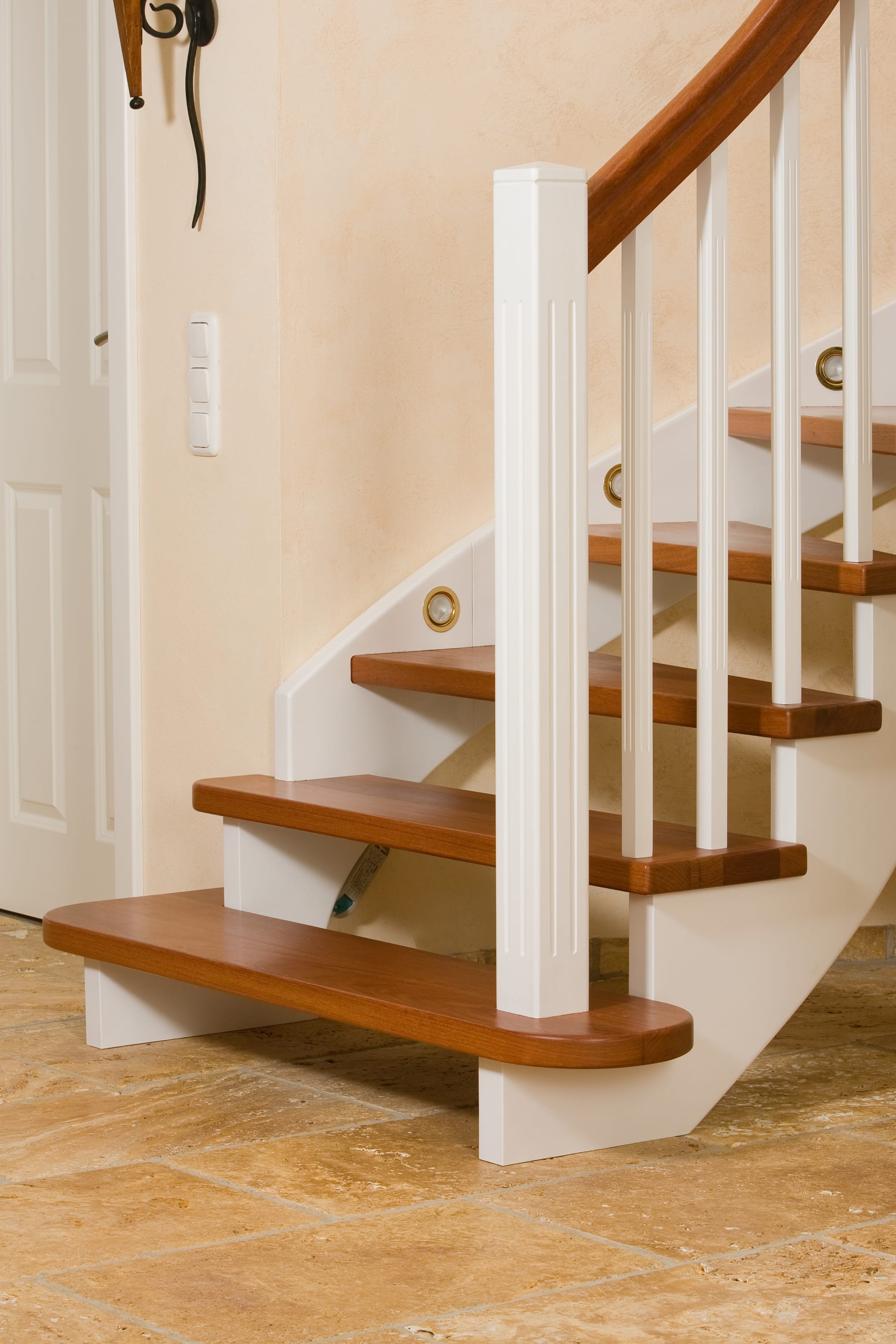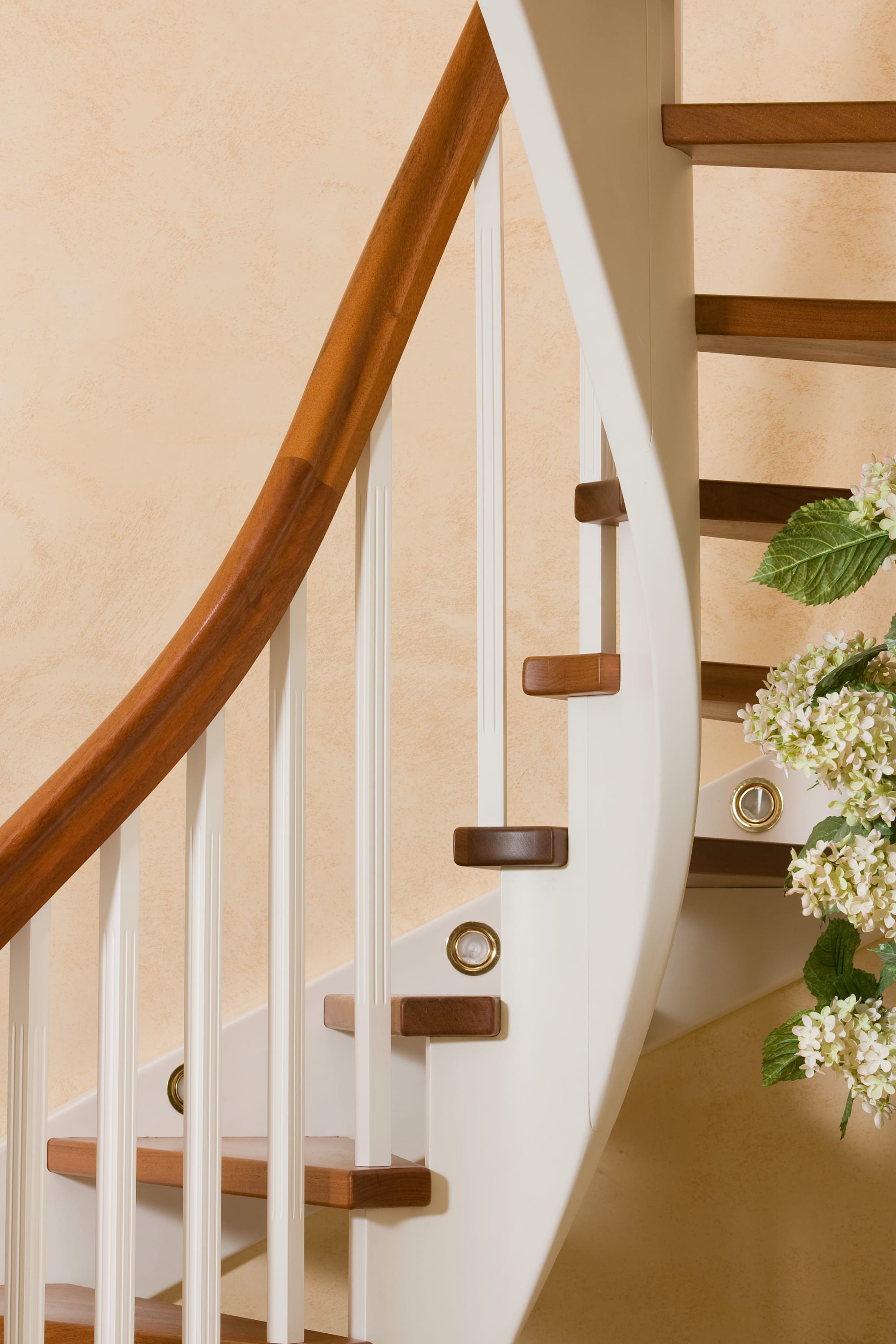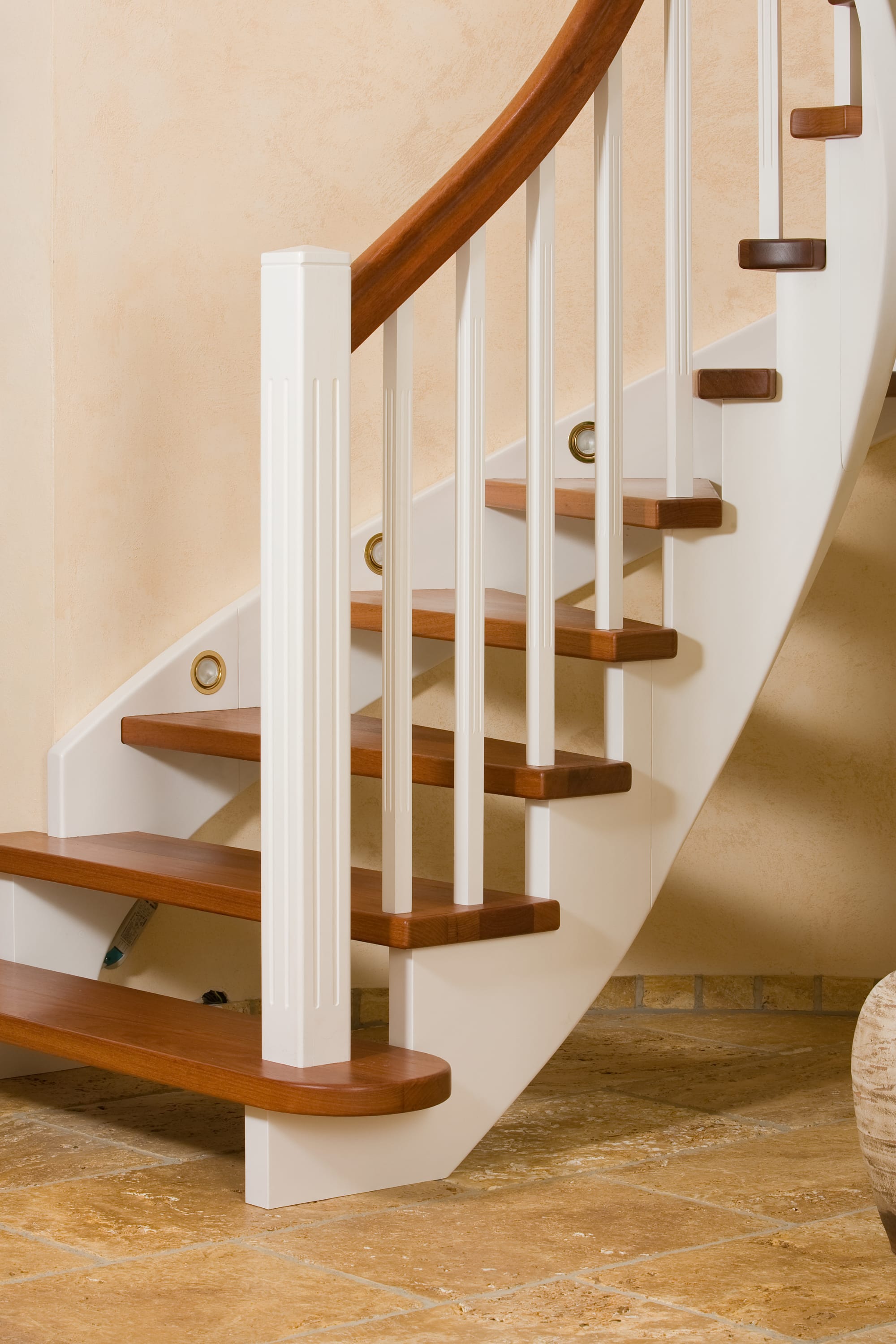 Wangentreppe wandseitig an einen runden Treppenschacht angepasst; freiseitig aufgesattelt mit schwungvollem Innengeländer; Holzart Merbau