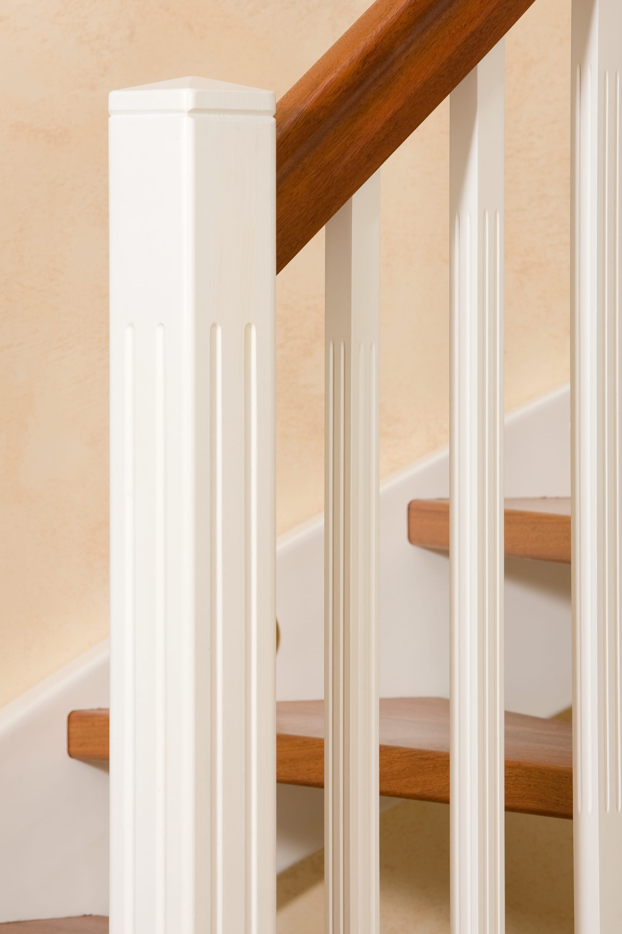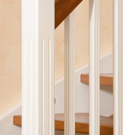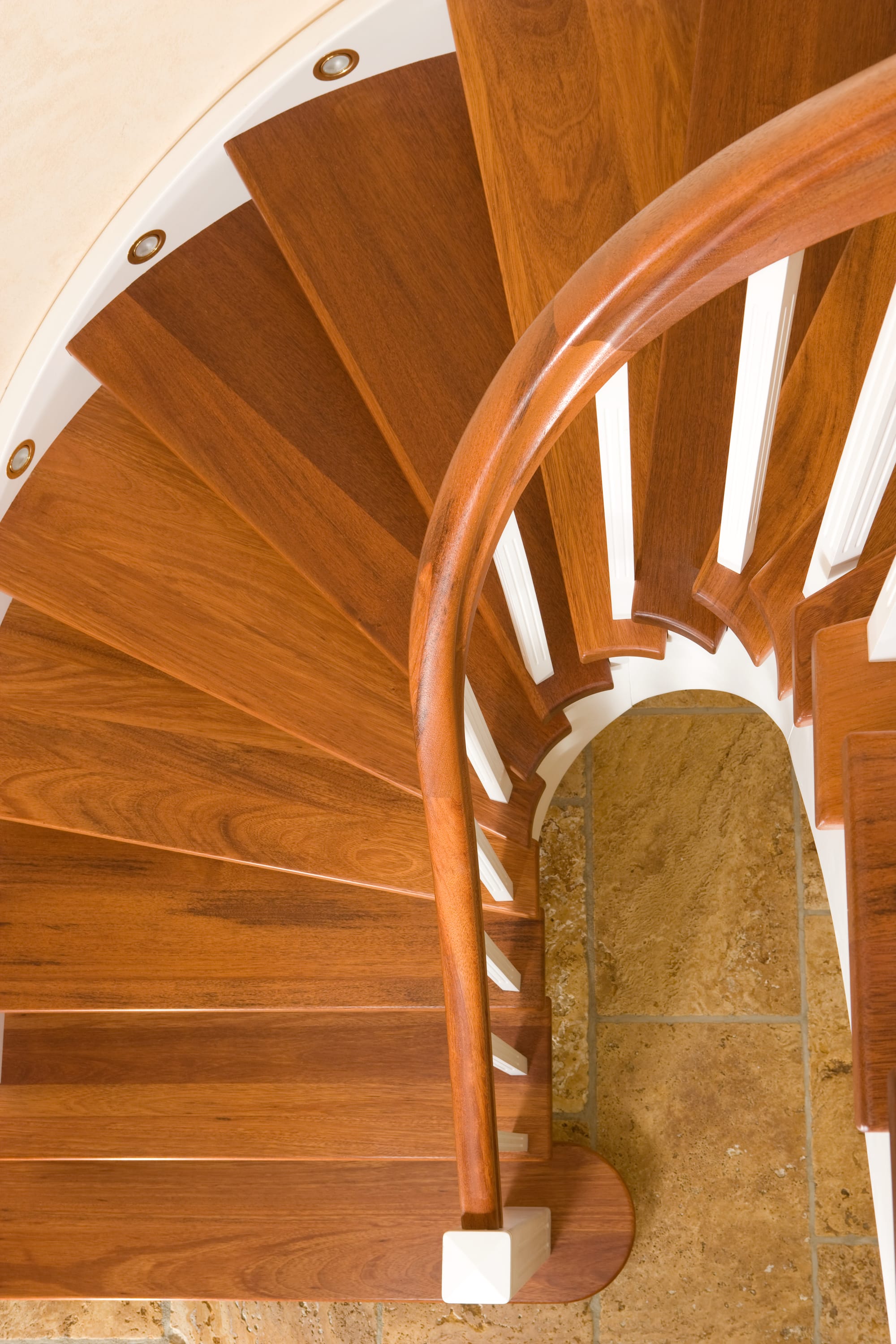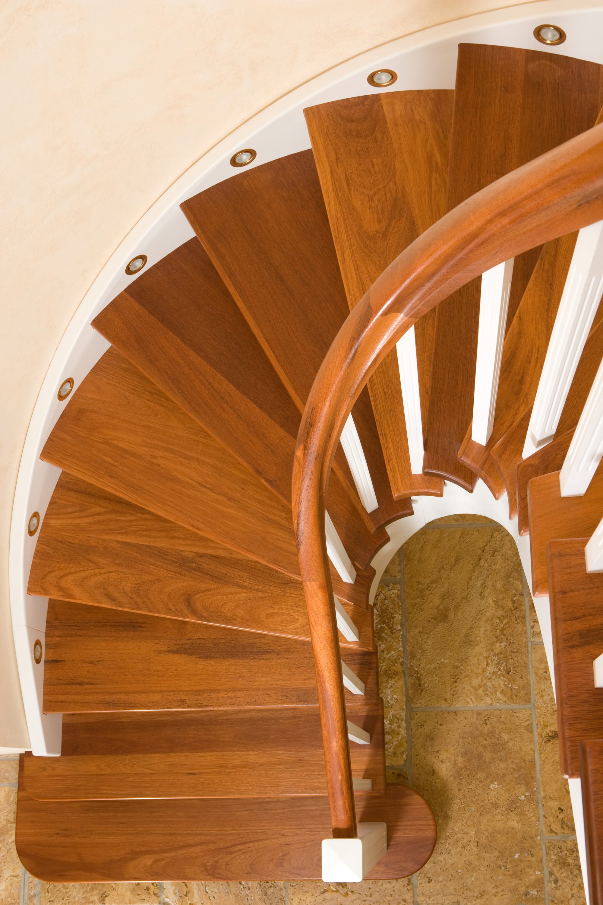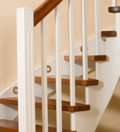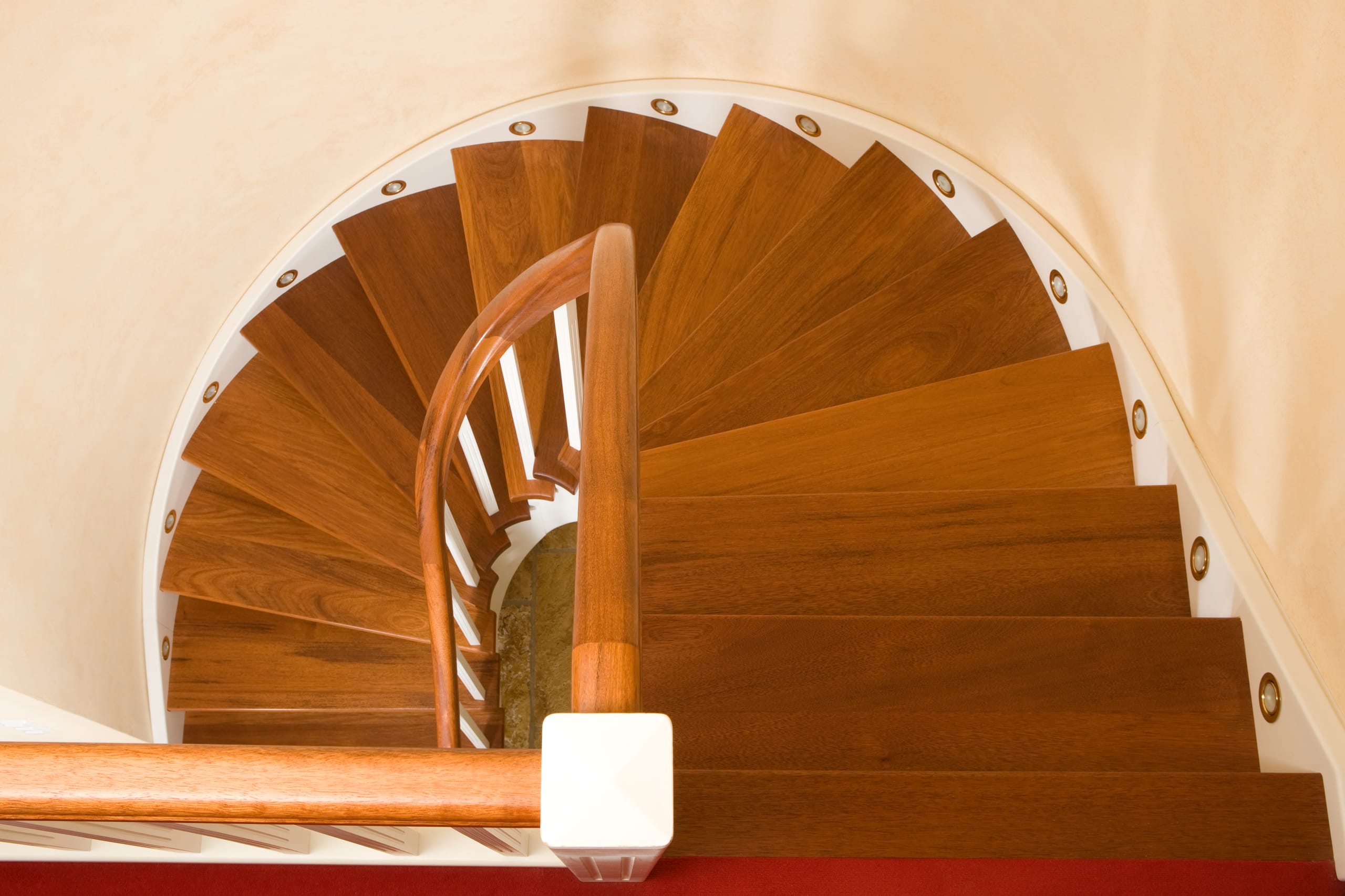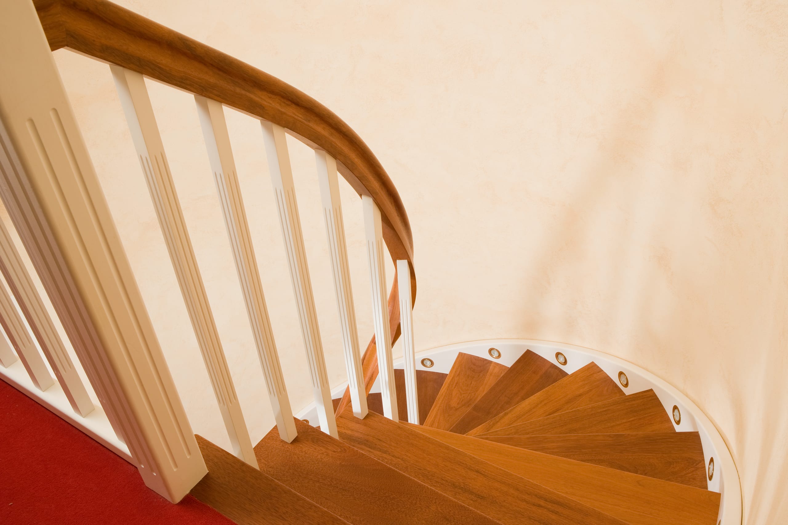 Wangentreppe wandseitig an einen runden Treppenschacht angepasst; freiseitig aufgesattelt mit schwungvollem Innengeländer; Holzart Merbau