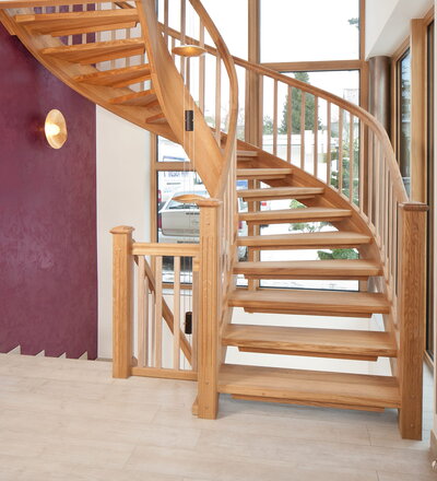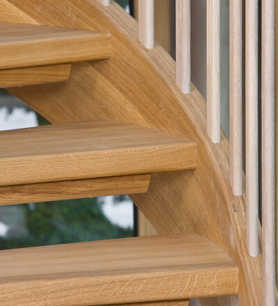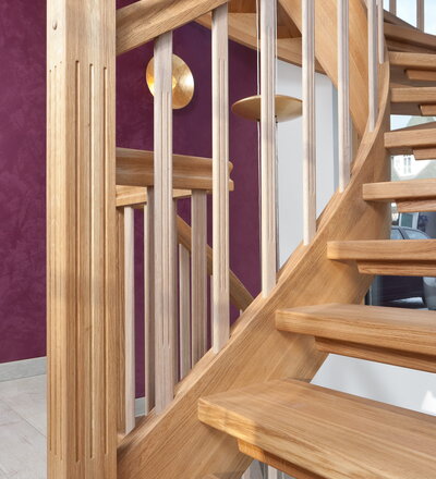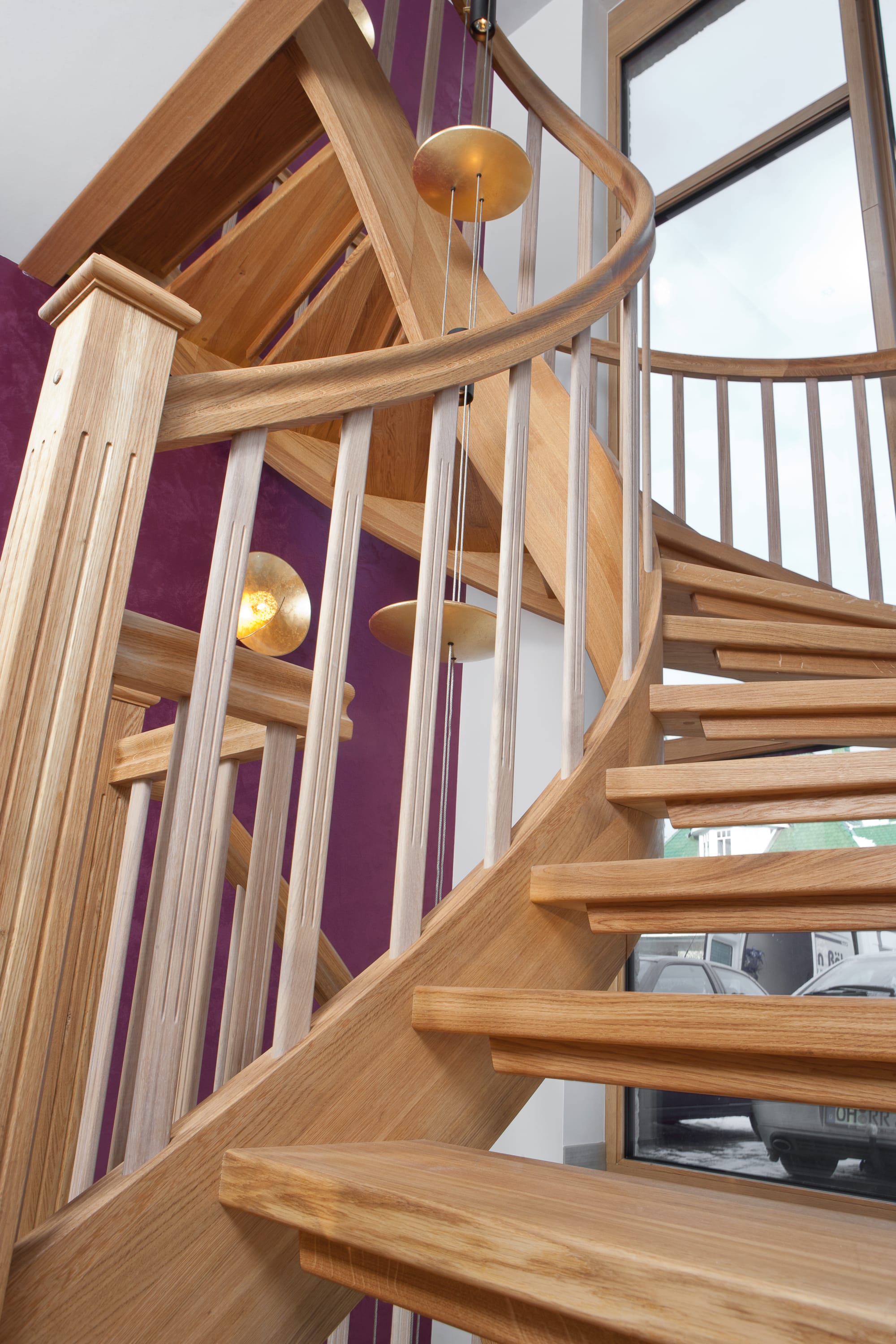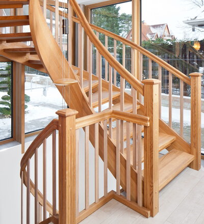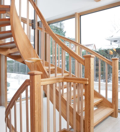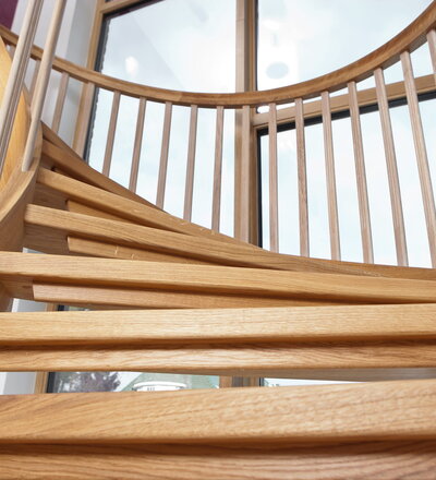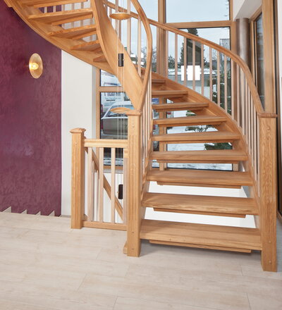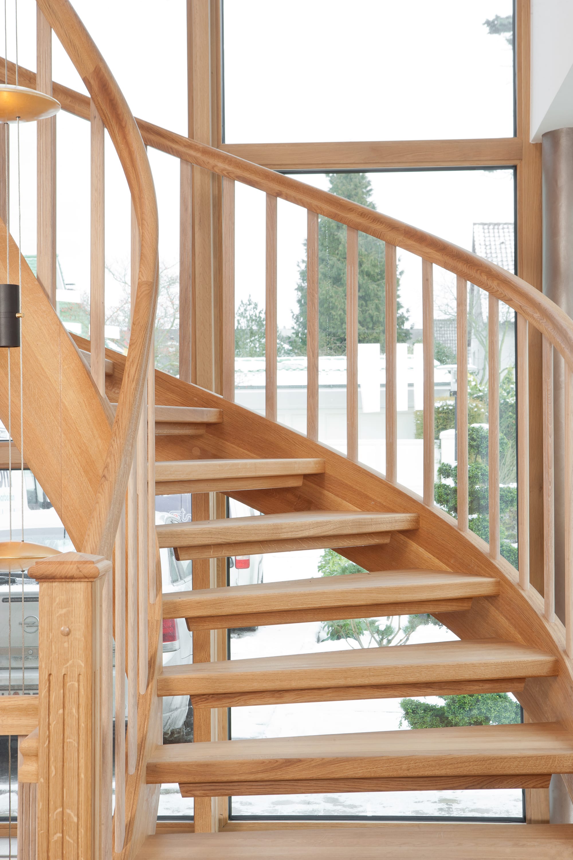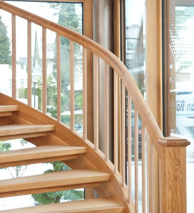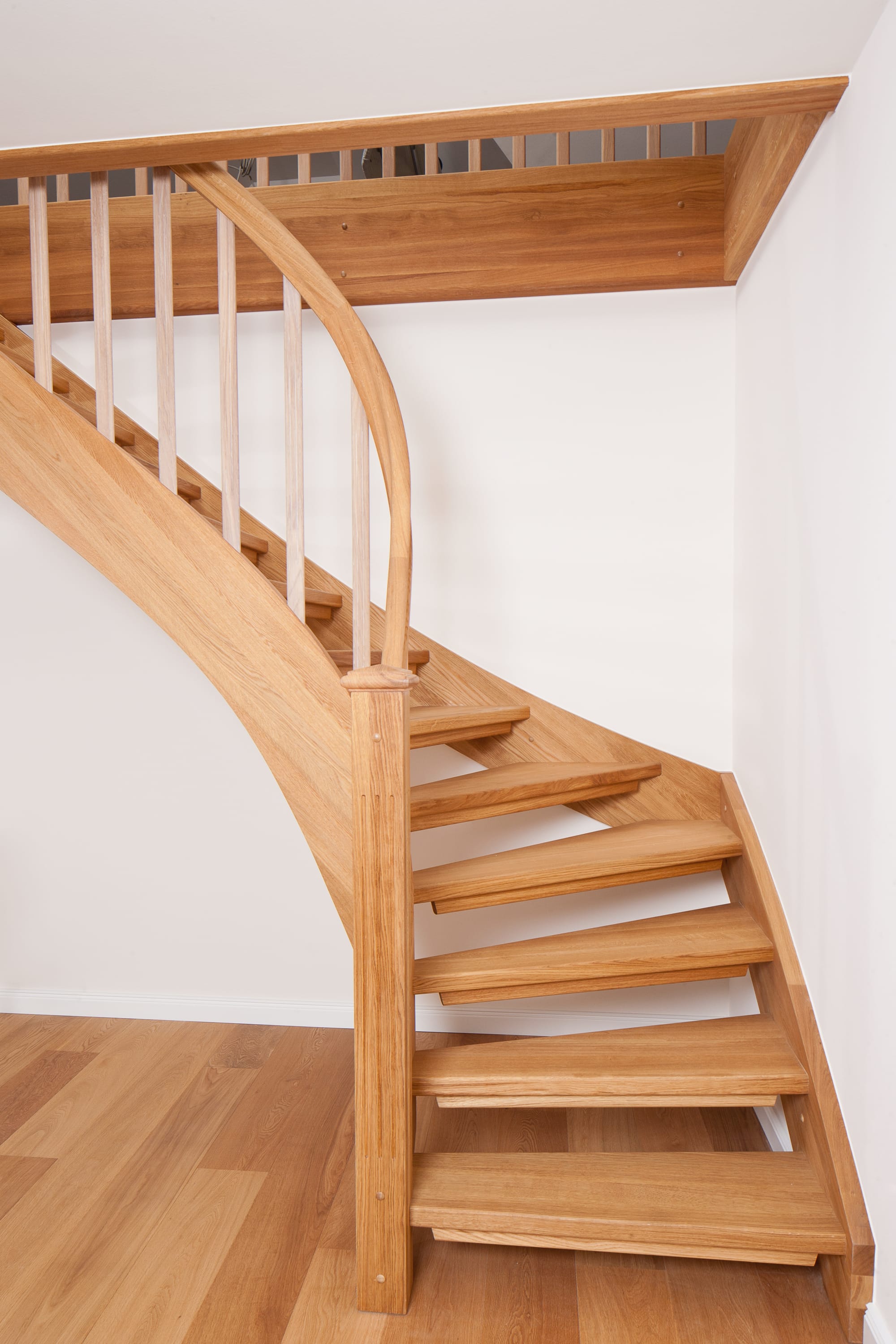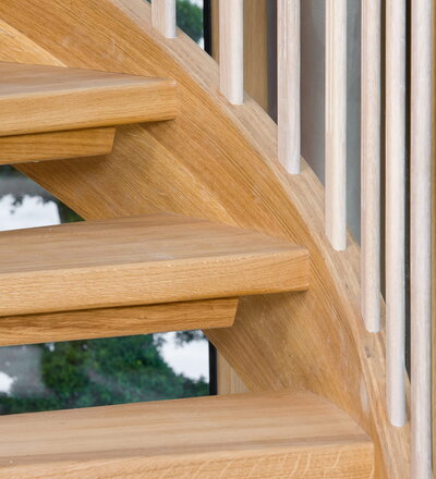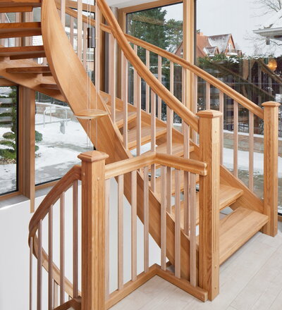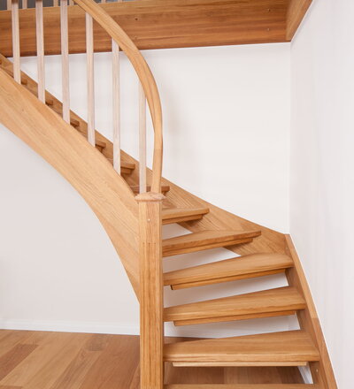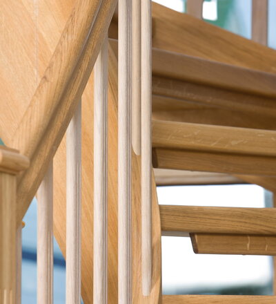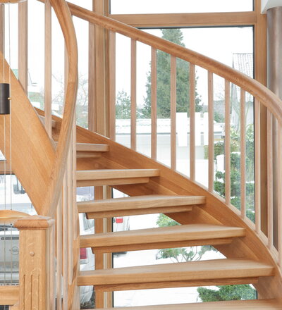 1/2 gewendelte offene Bogen-Wangentreppe Holzart Eiche geölt, Stäbe weiß transparent gewachst