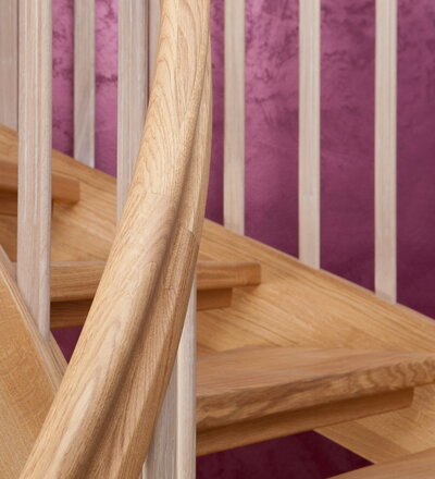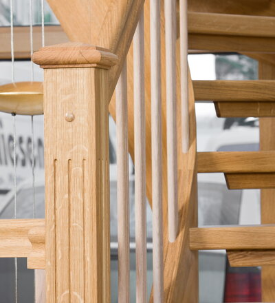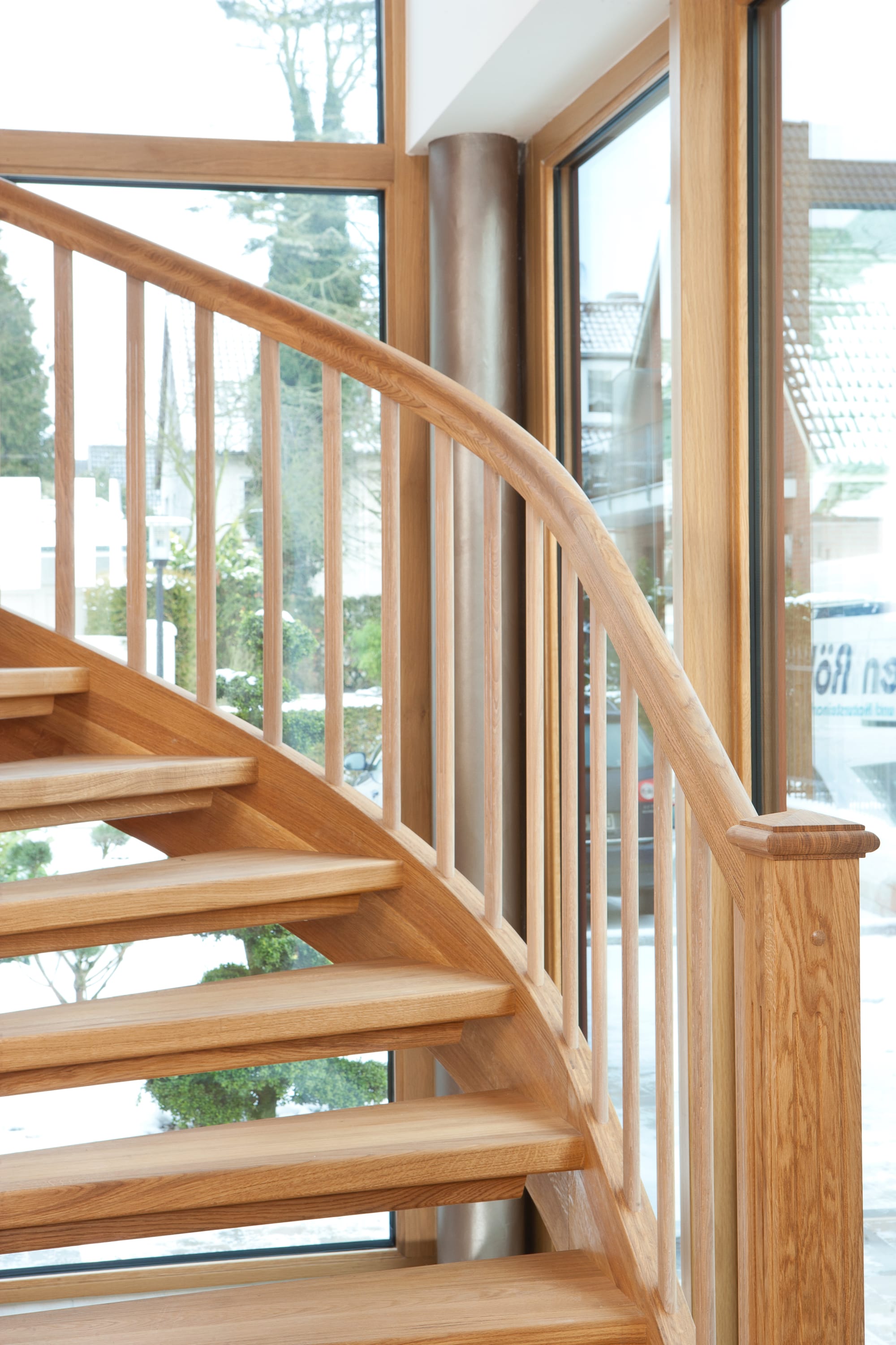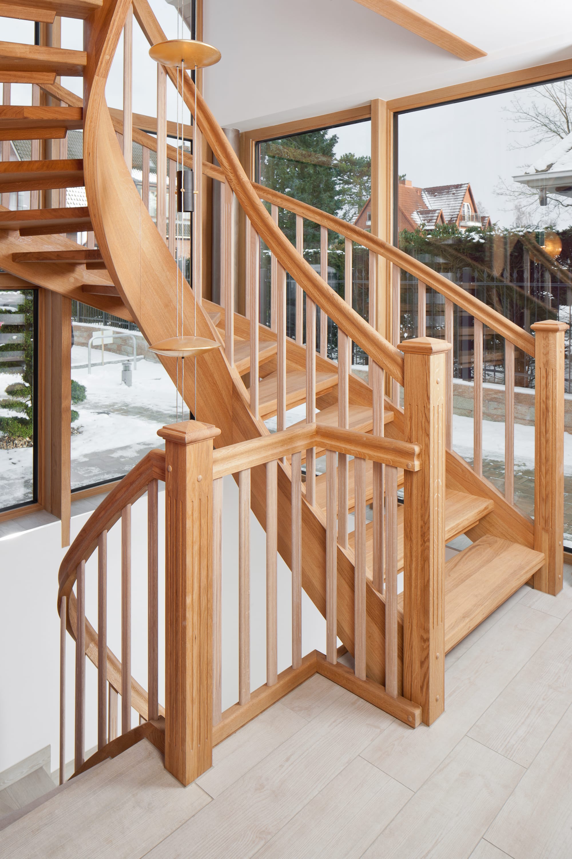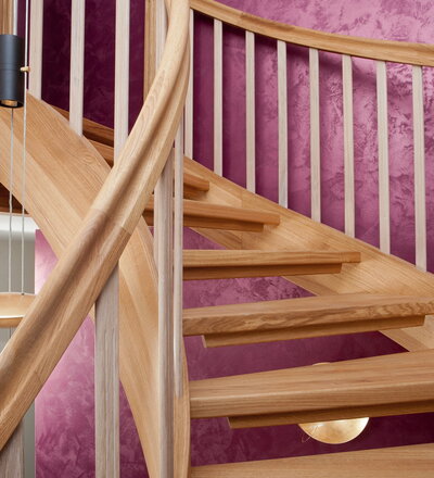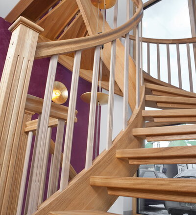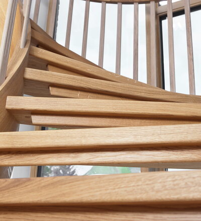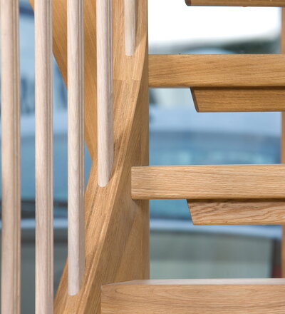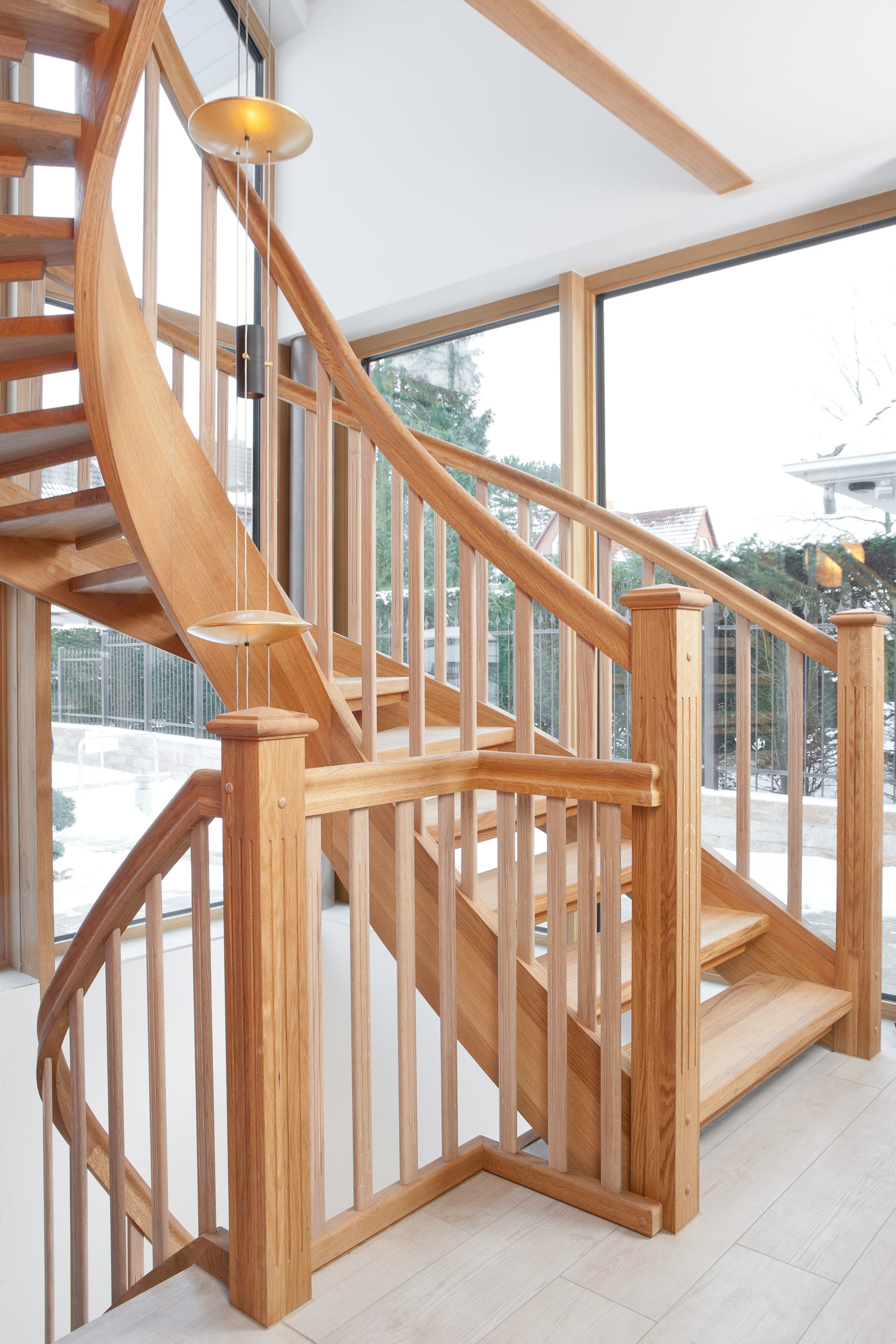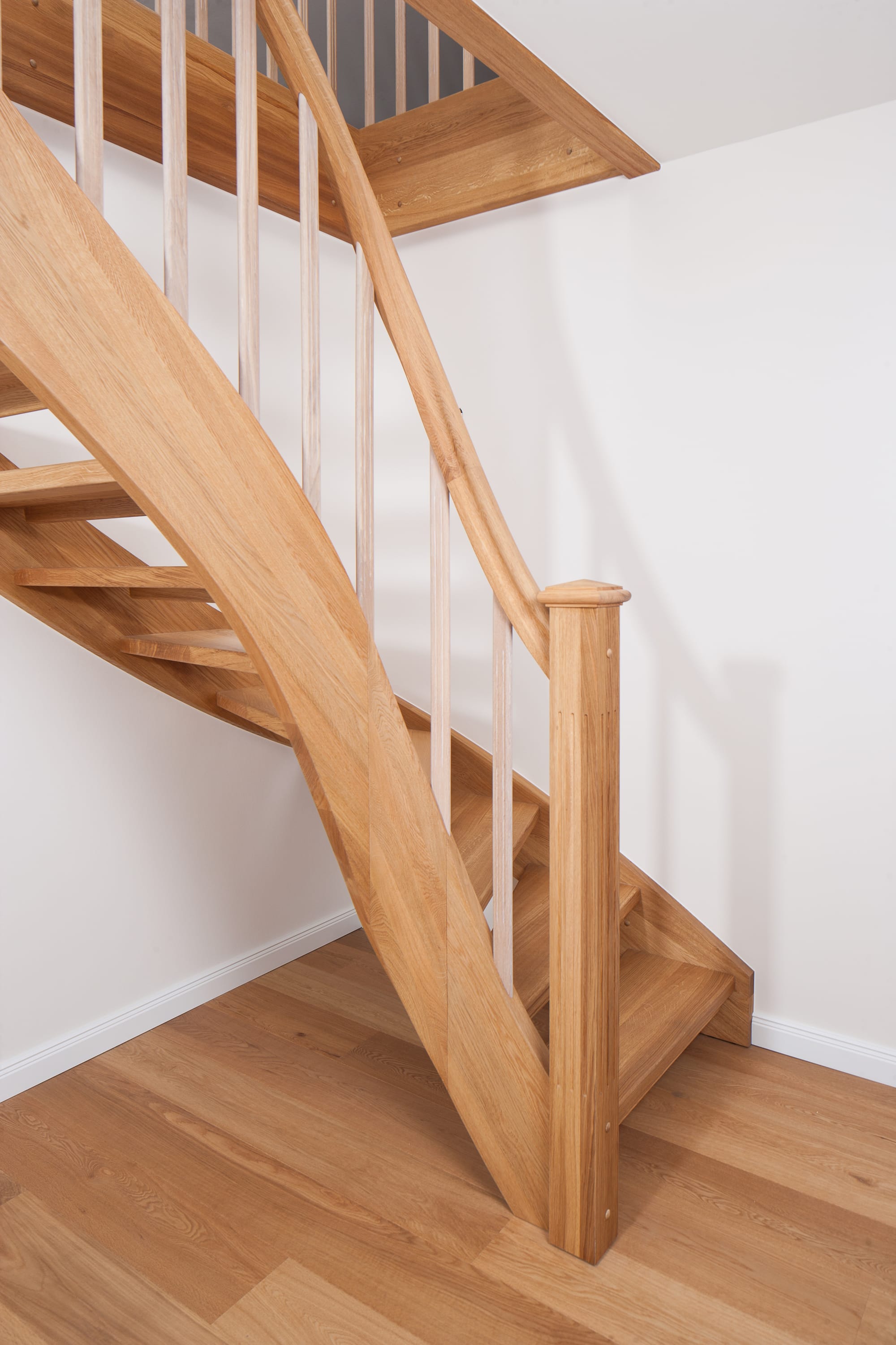 1/2 gewendelte offene Bogen-Wangentreppe Holzart Eiche geölt, Stäbe weiß transparent gewachst