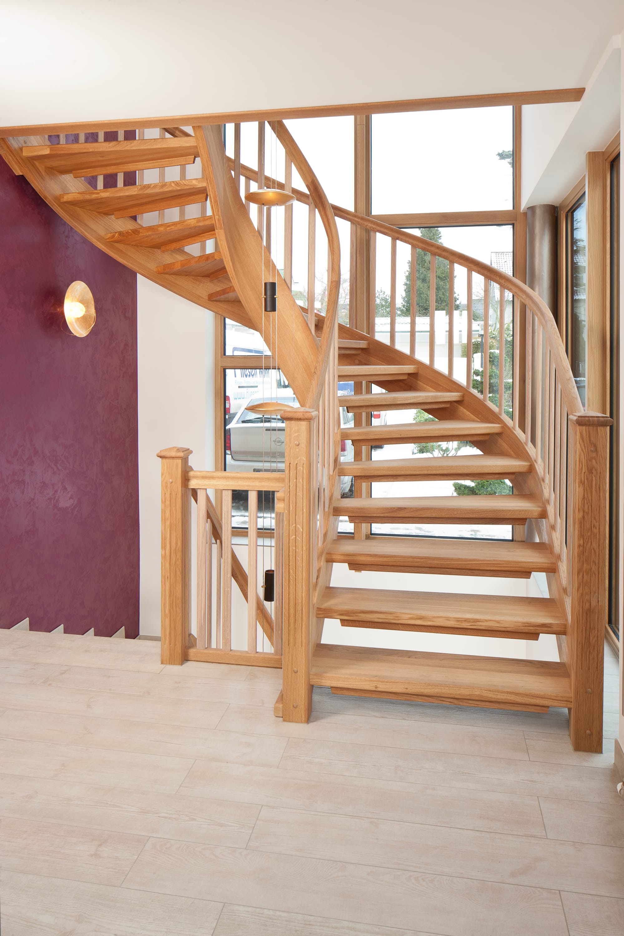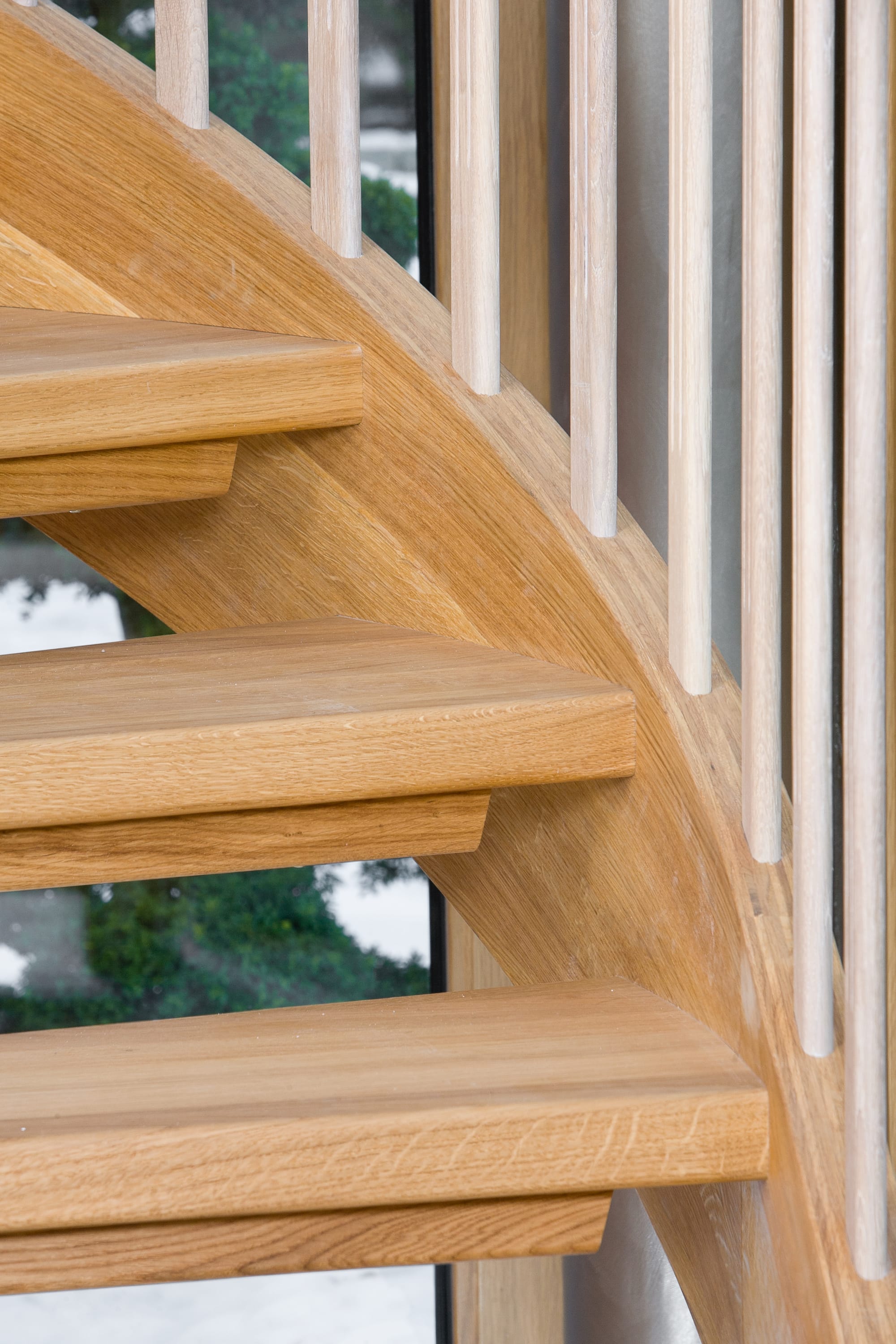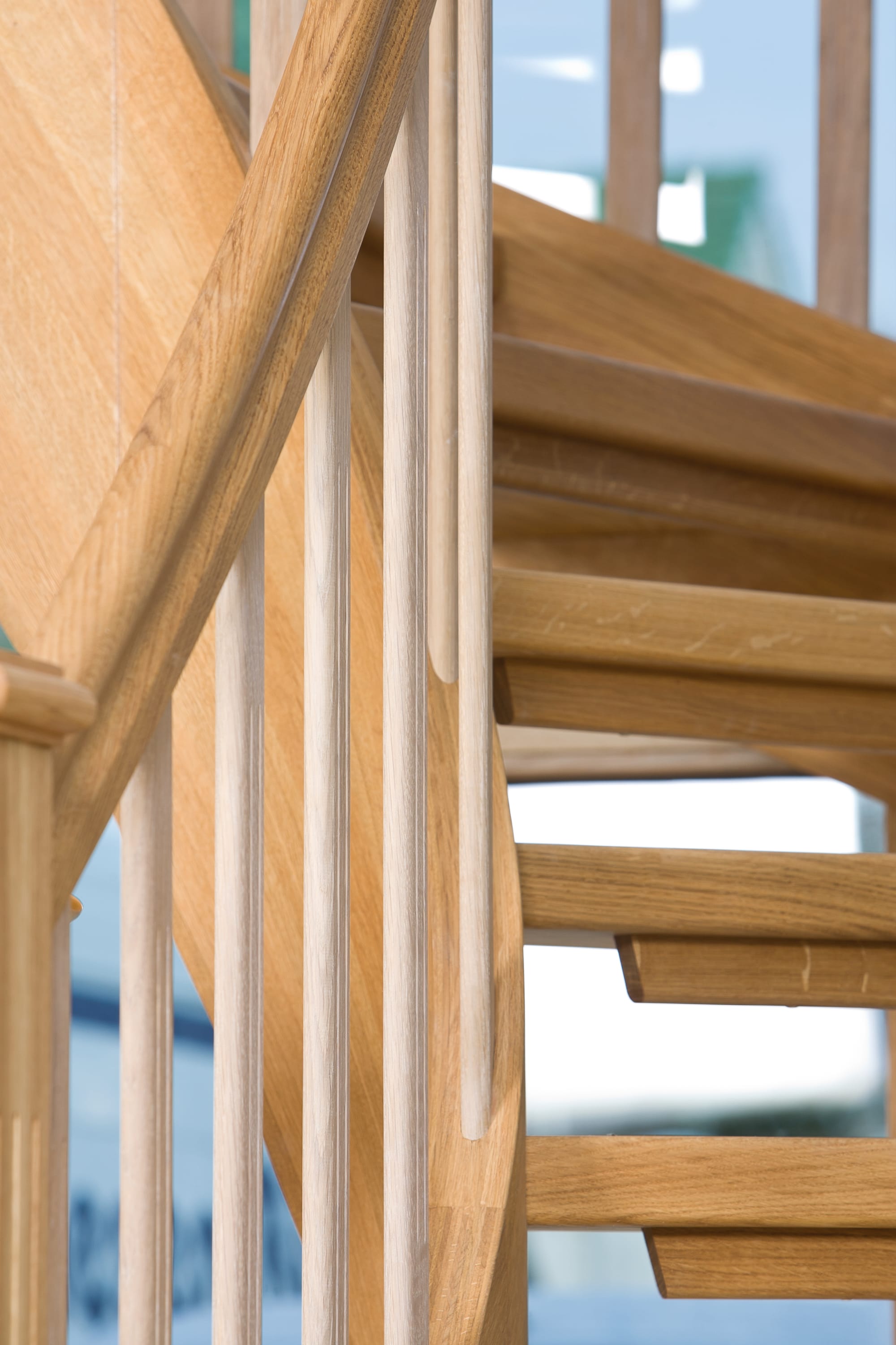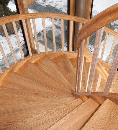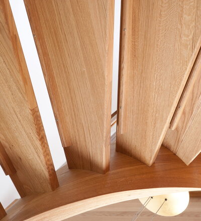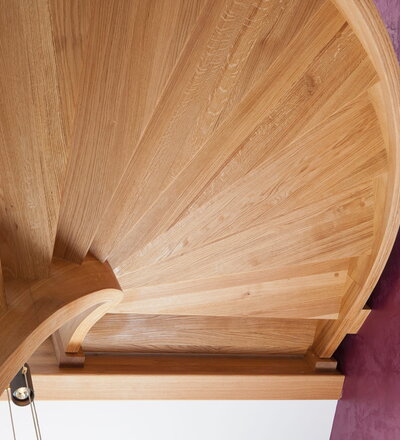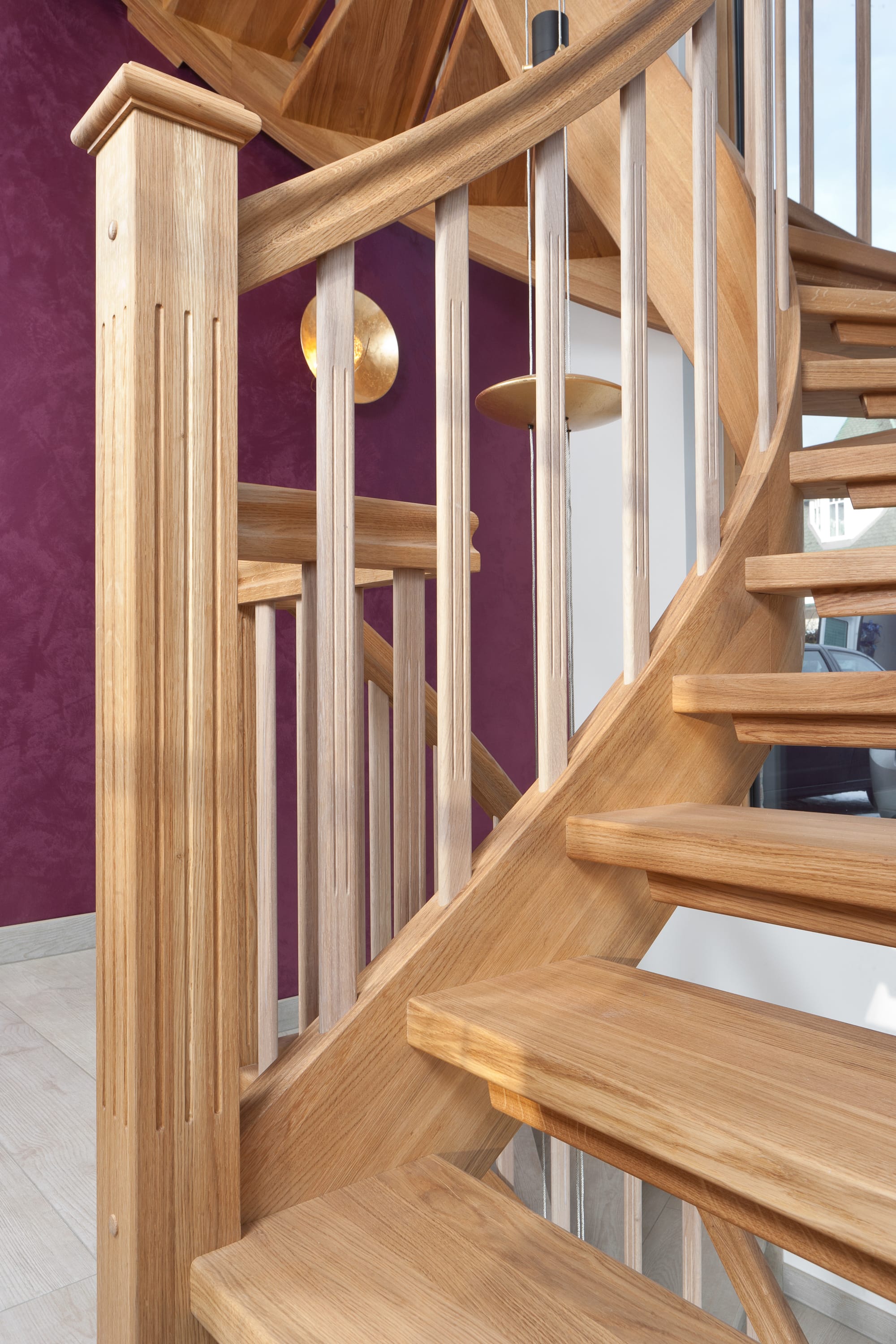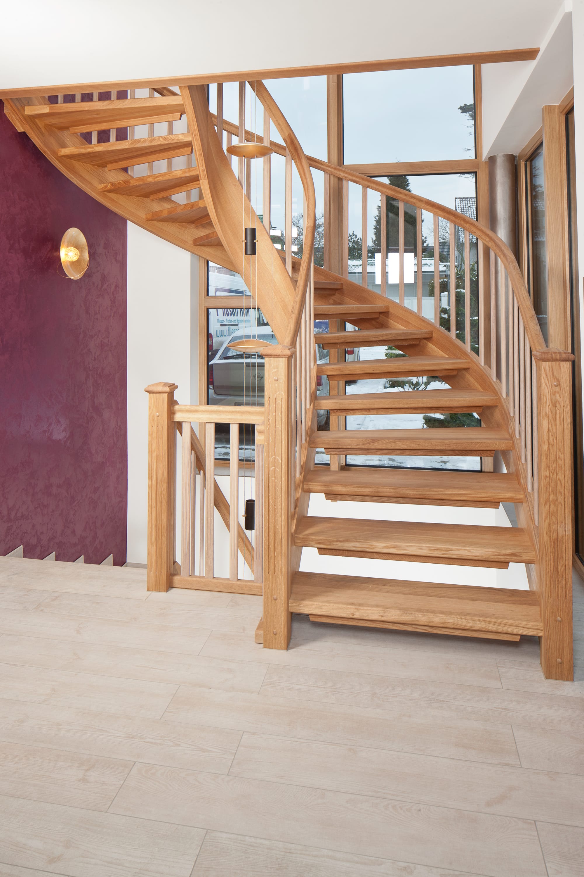 1/2 gewendelte offene Bogen-Wangentreppe Holzart Eiche geölt, Stäbe weiß transparent gewachst