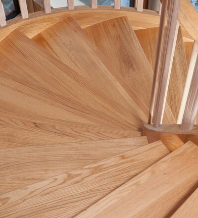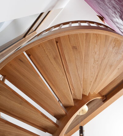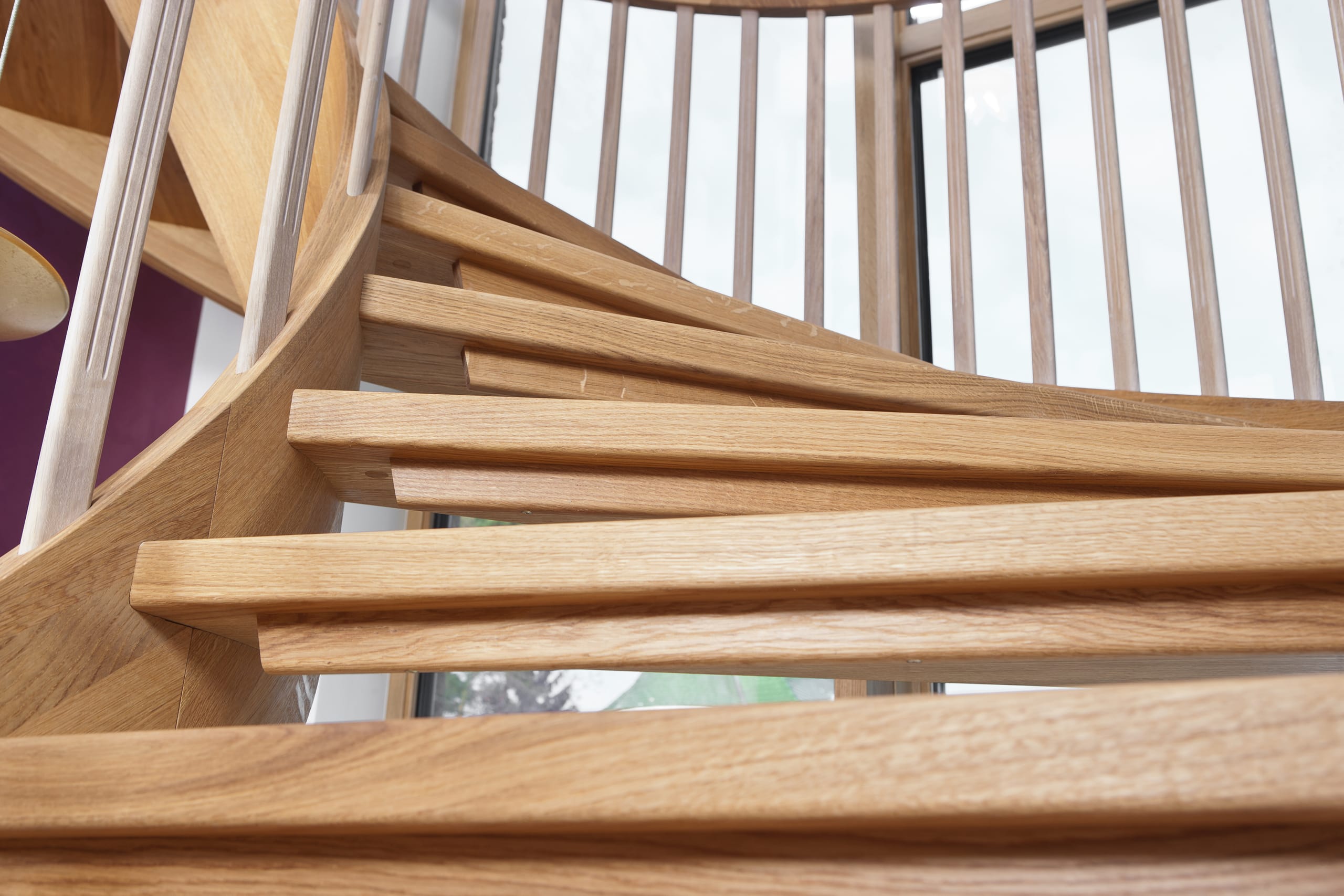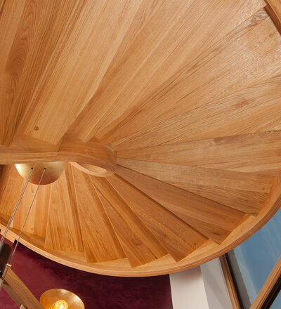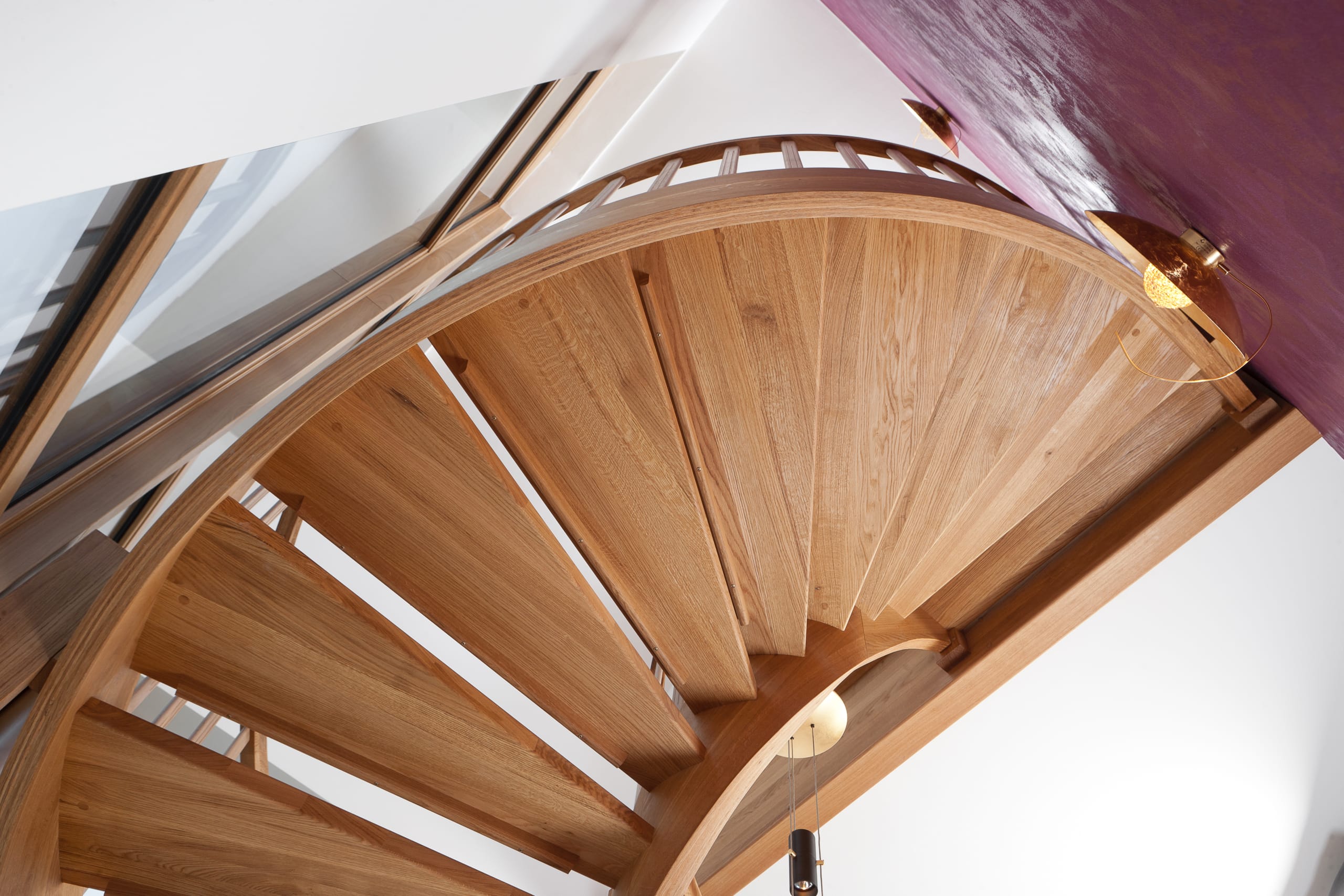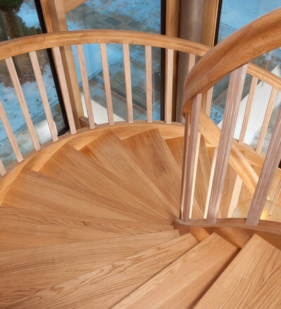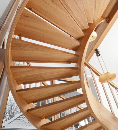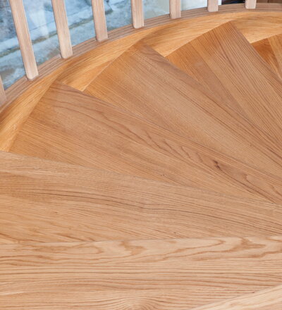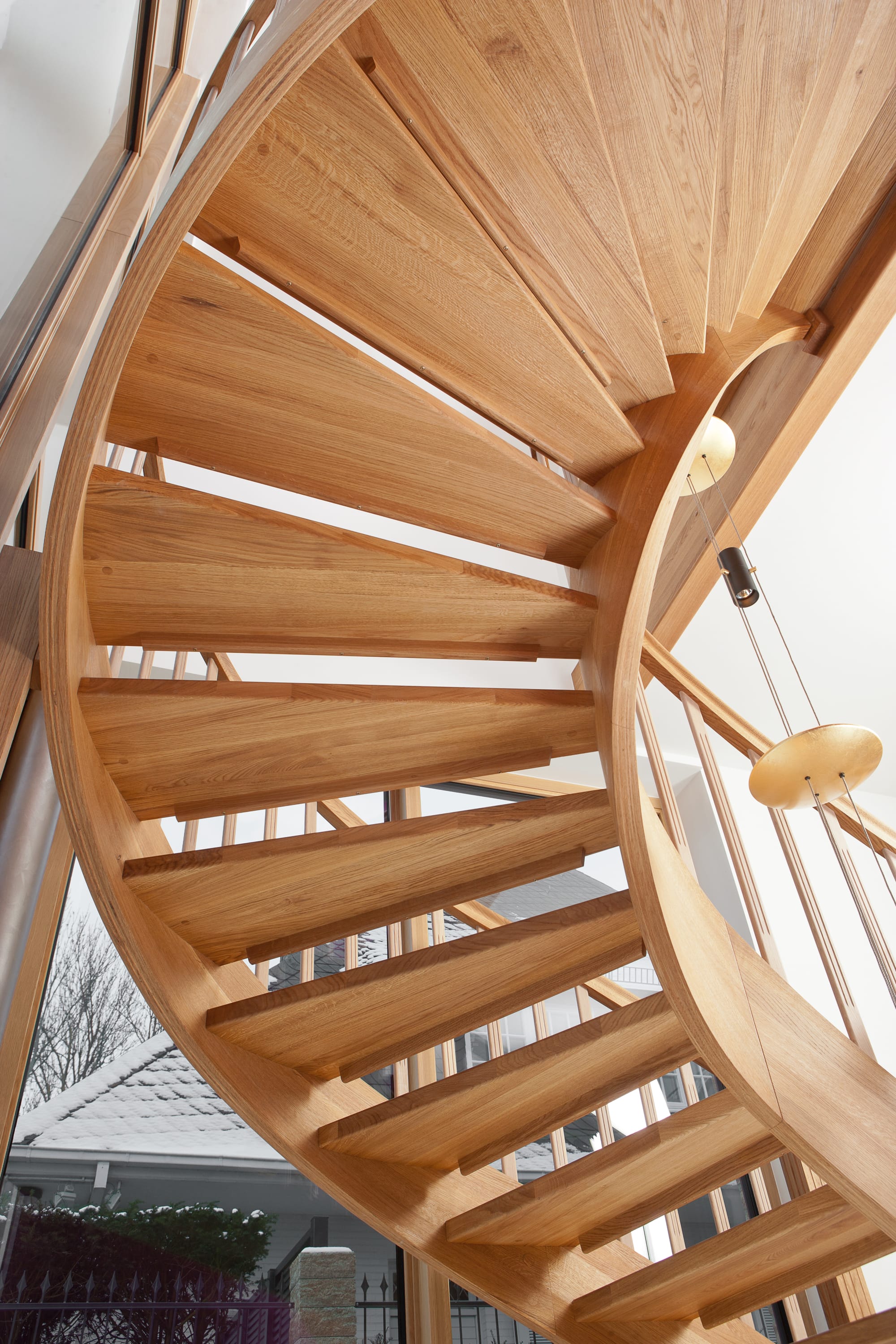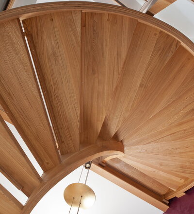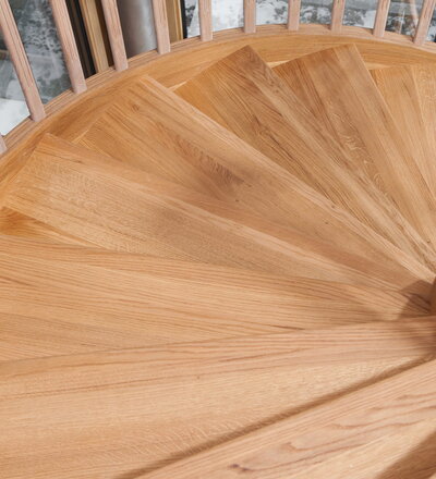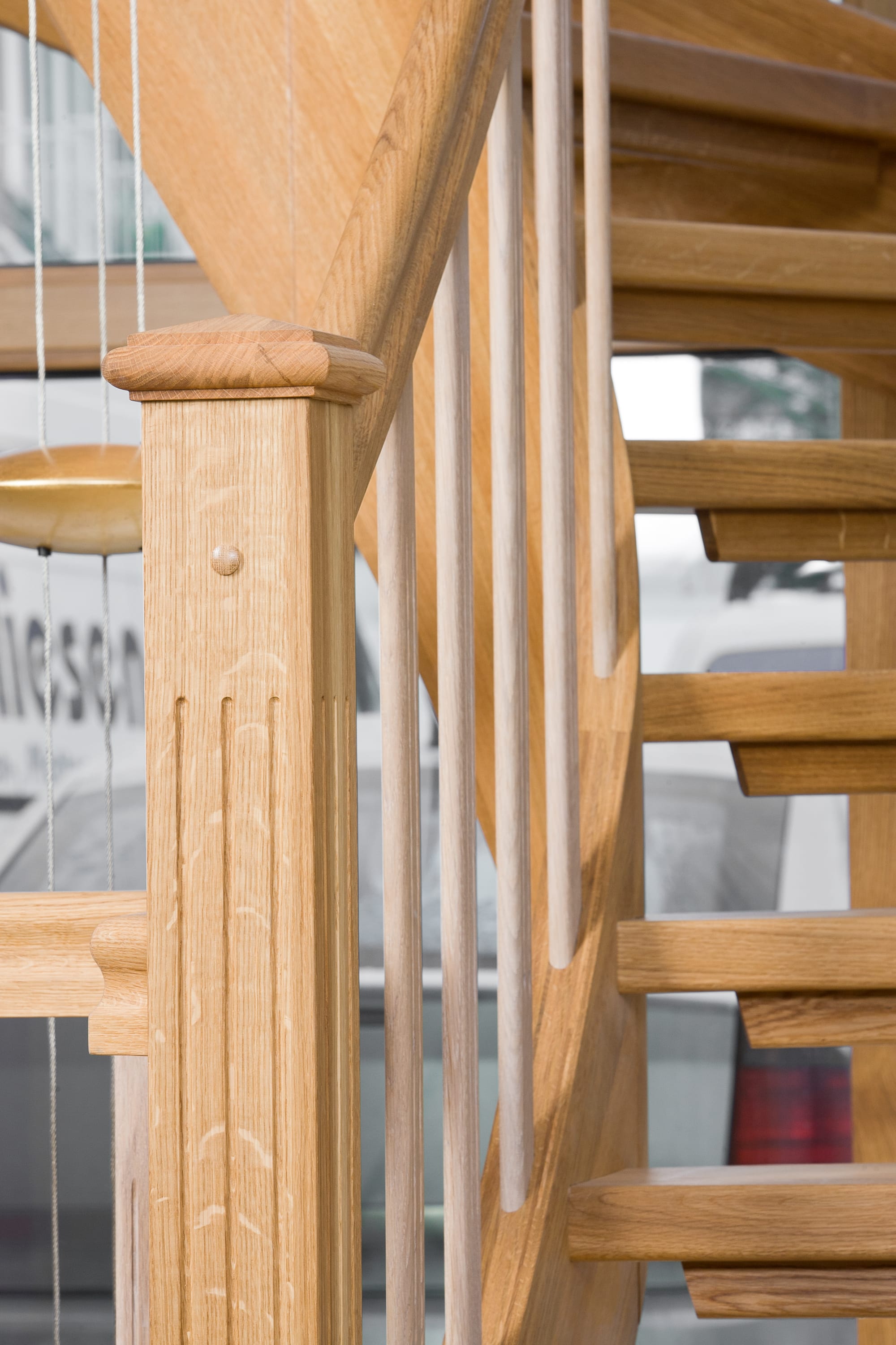 1/2 gewendelte offene Bogen-Wangentreppe Holzart Eiche geölt, Stäbe weiß transparent gewachst