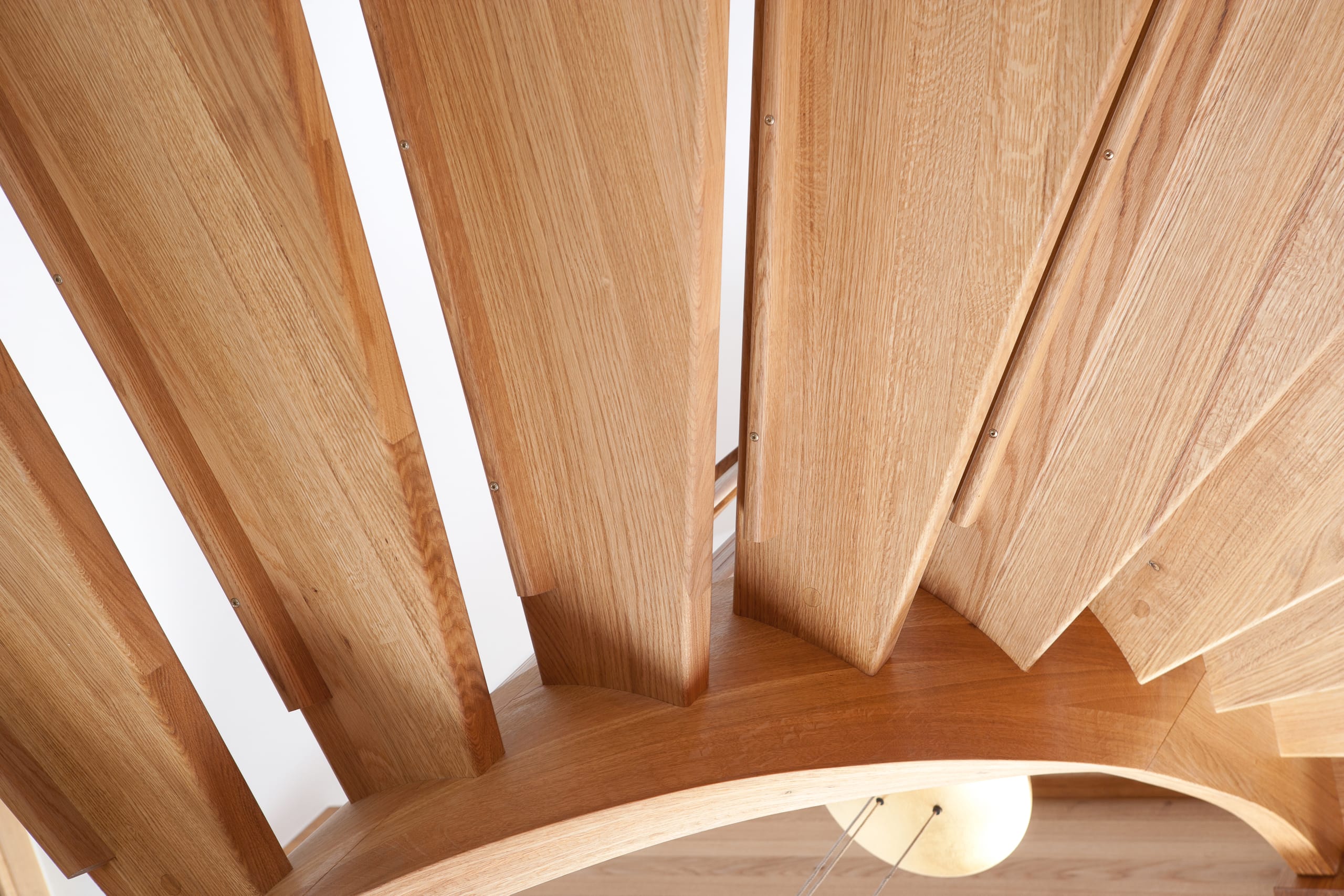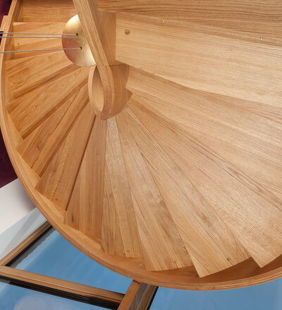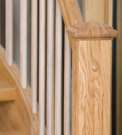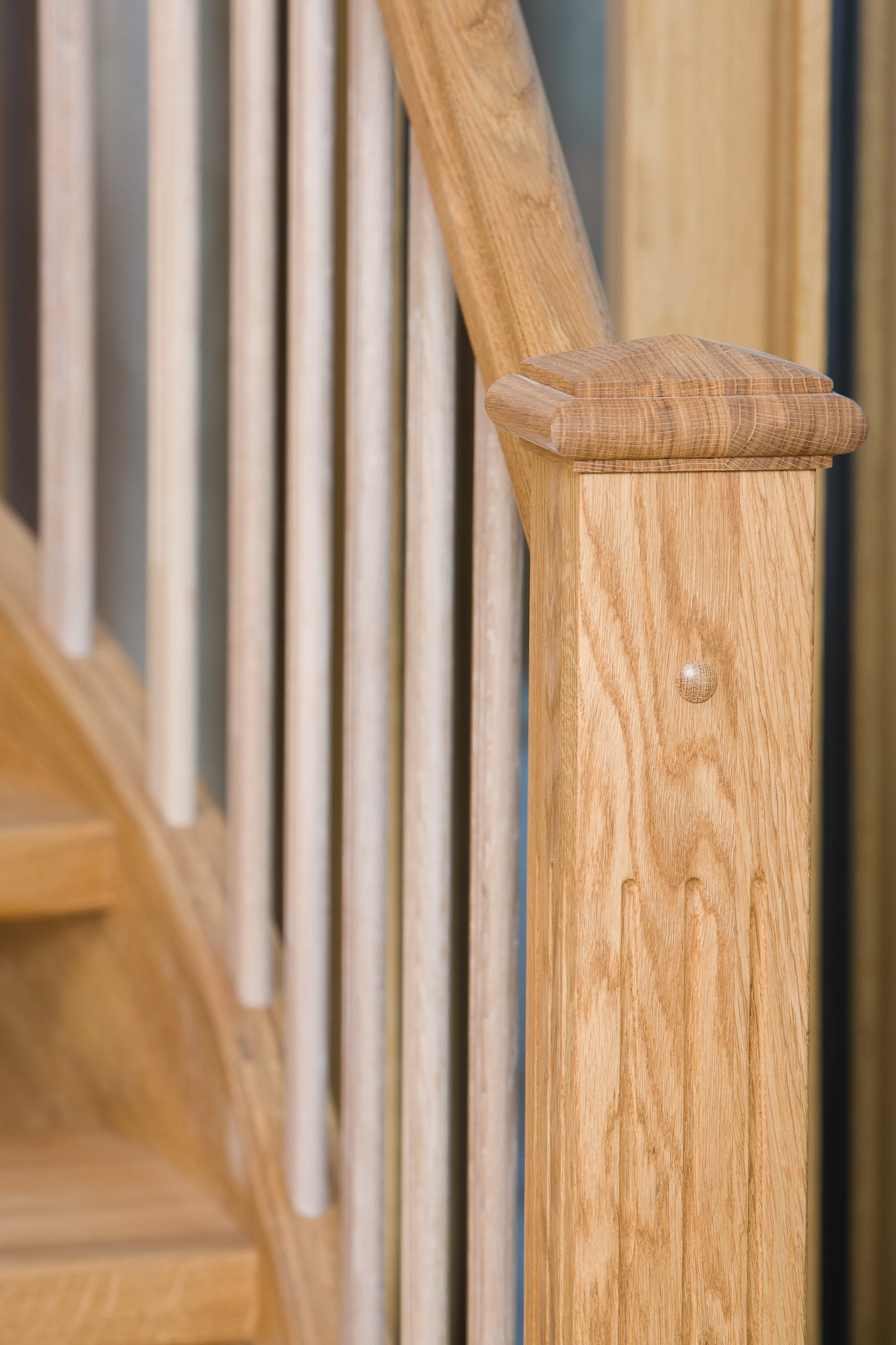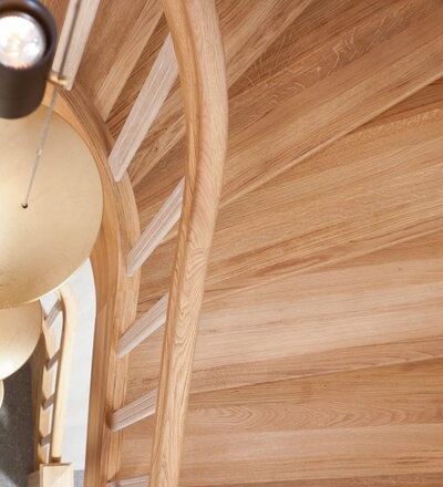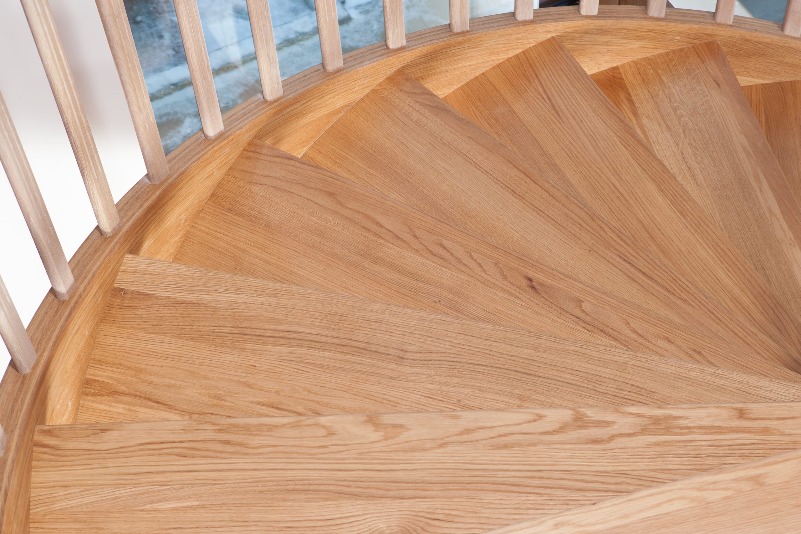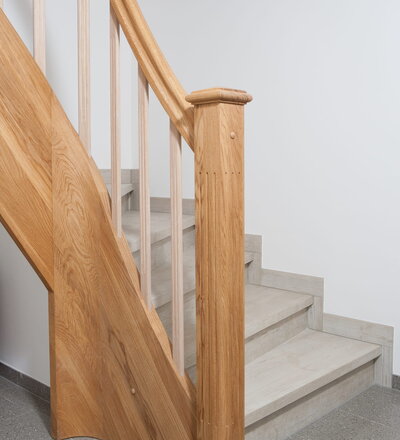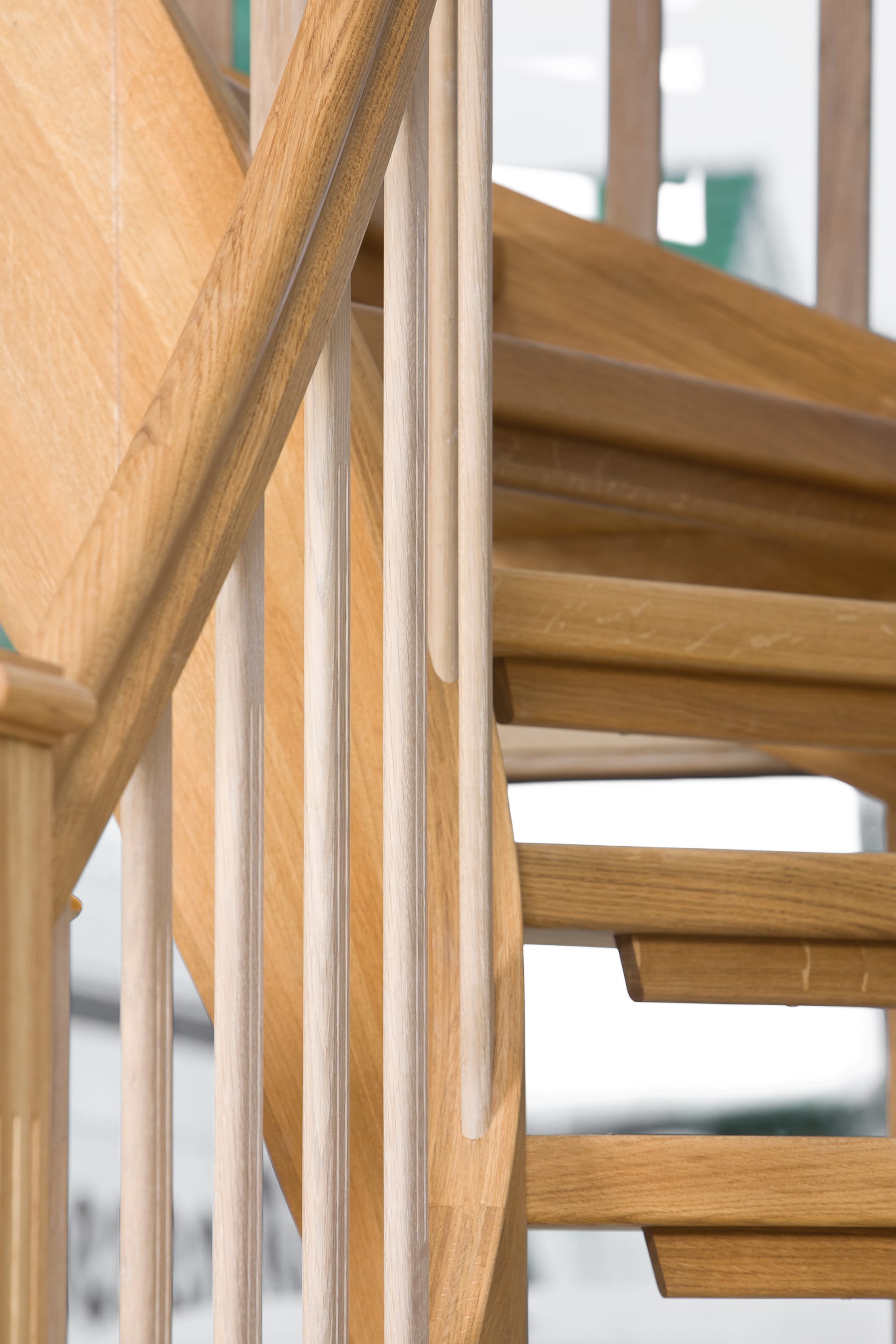 1/2 gewendelte offene Bogen-Wangentreppe Holzart Eiche geölt, Stäbe weiß transparent gewachst