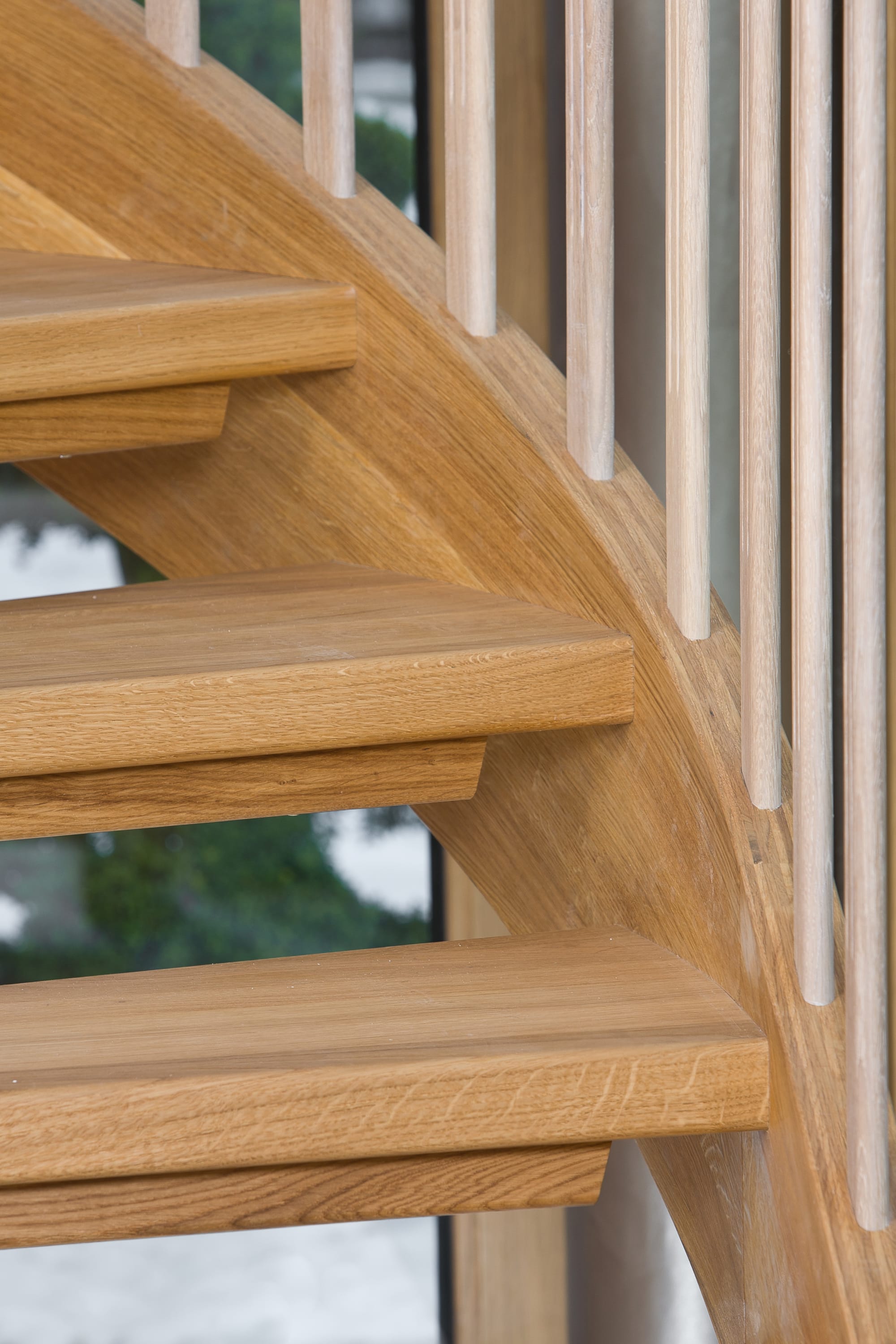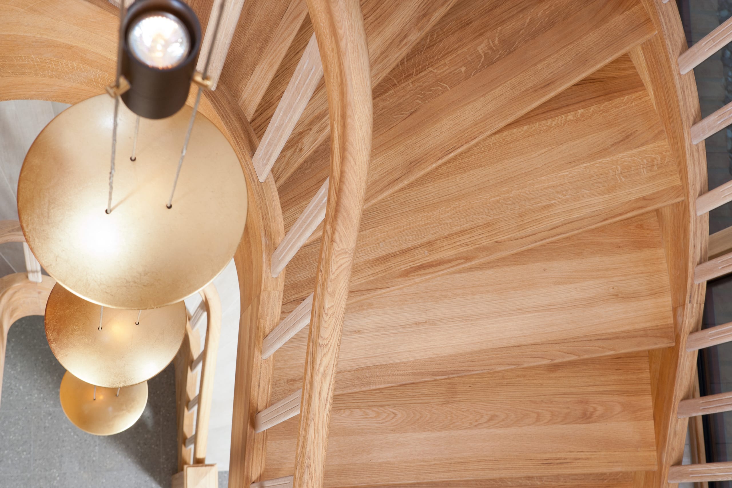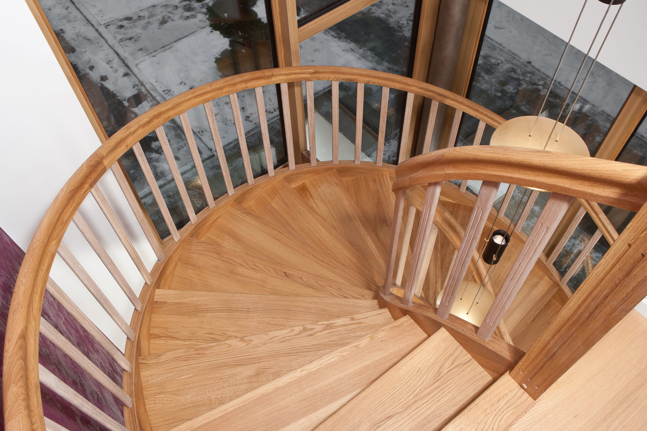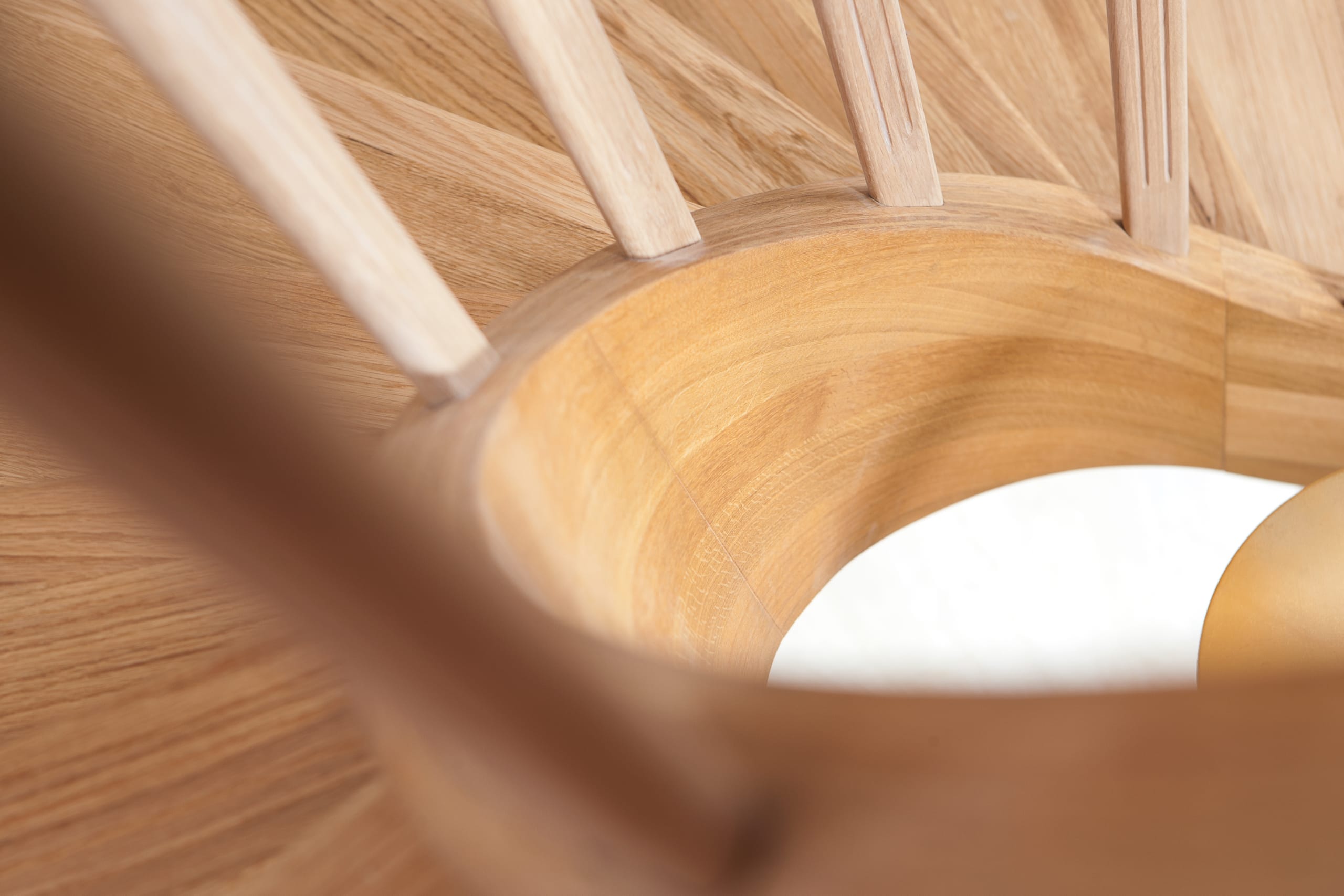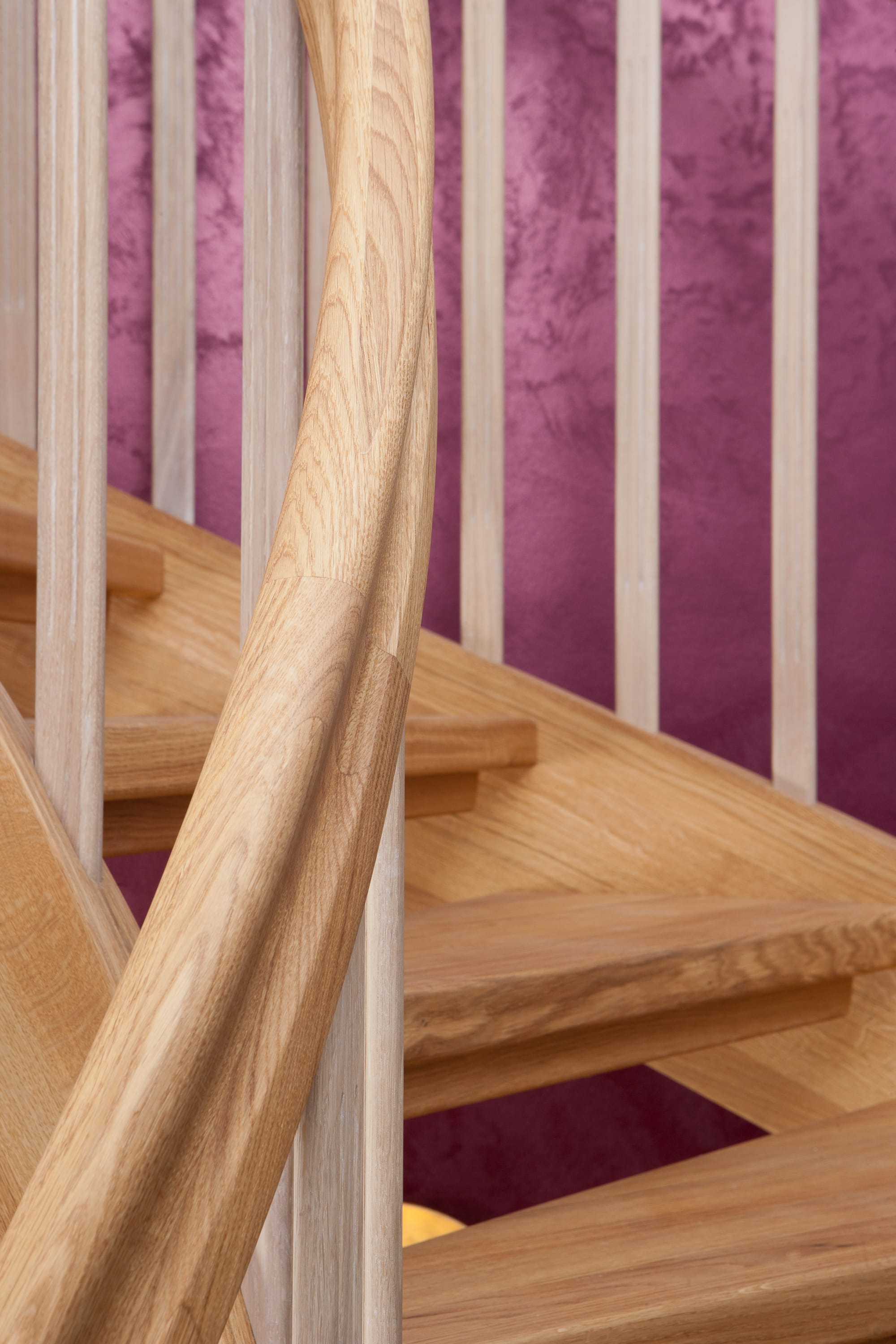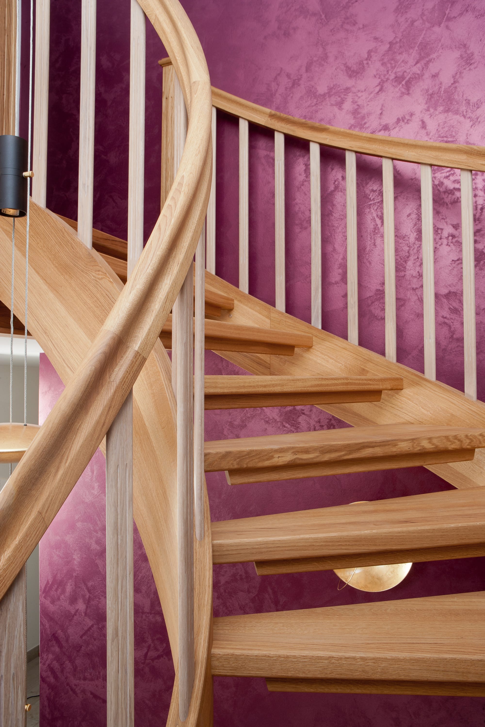 1/2 gewendelte offene Bogen-Wangentreppe Holzart Eiche geölt, Stäbe weiß transparent gewachst