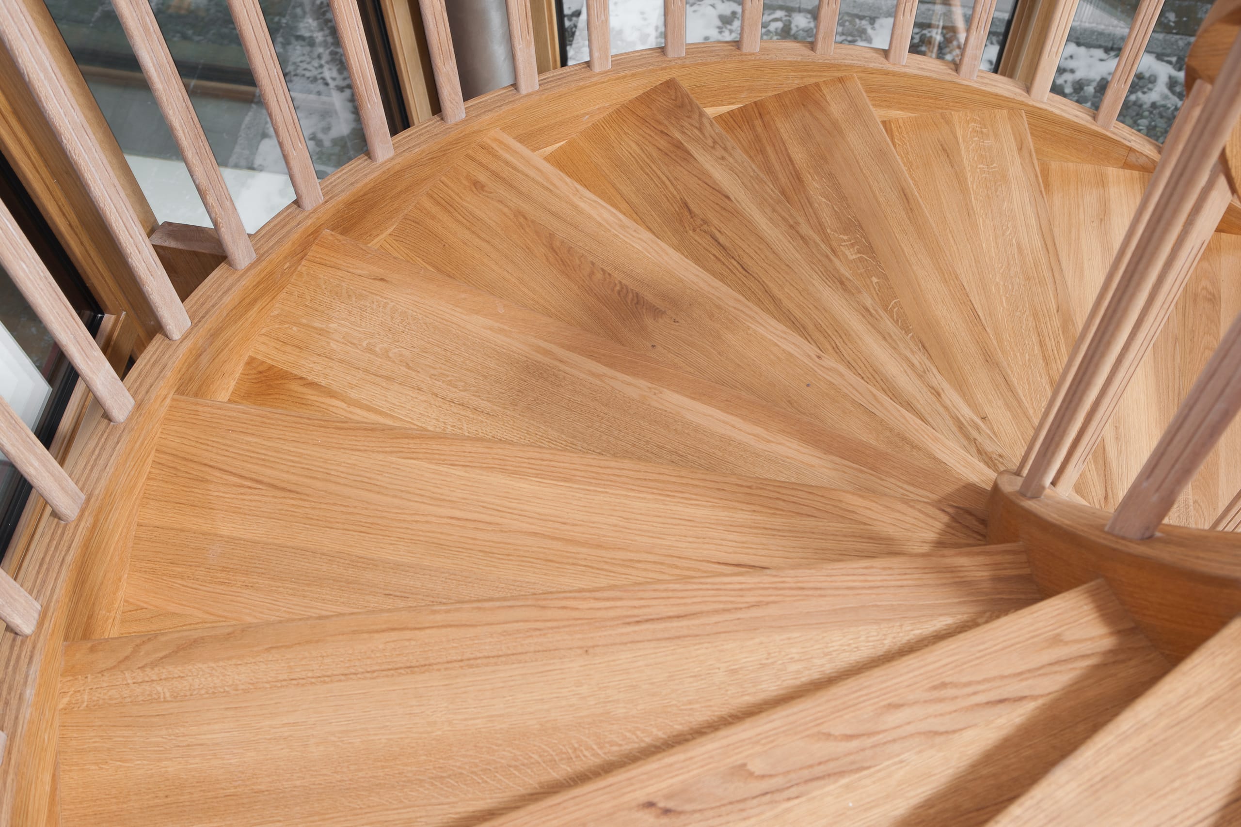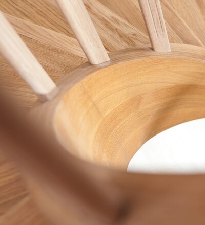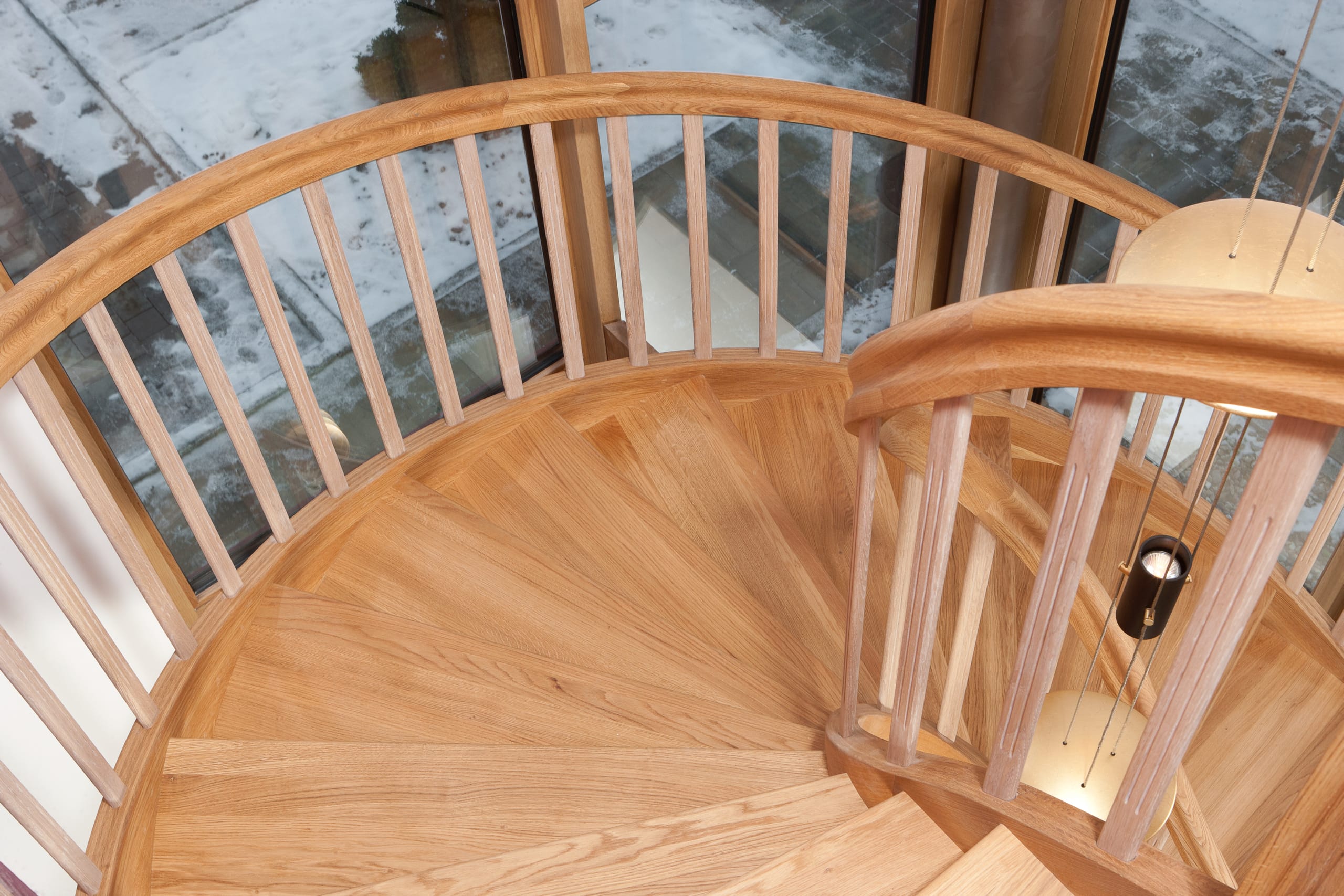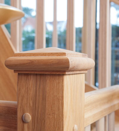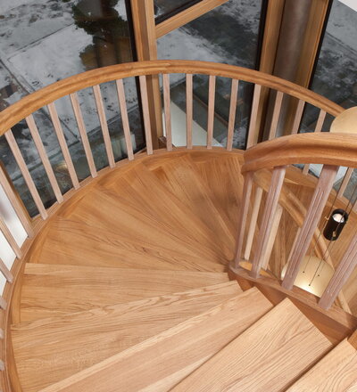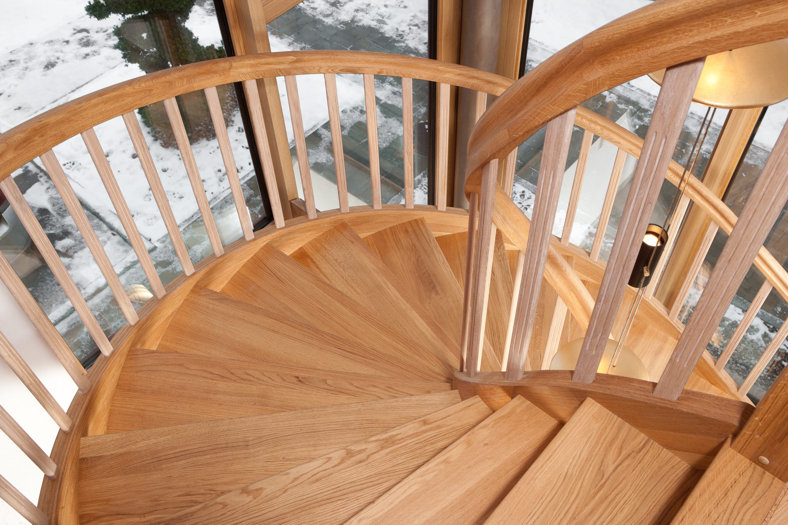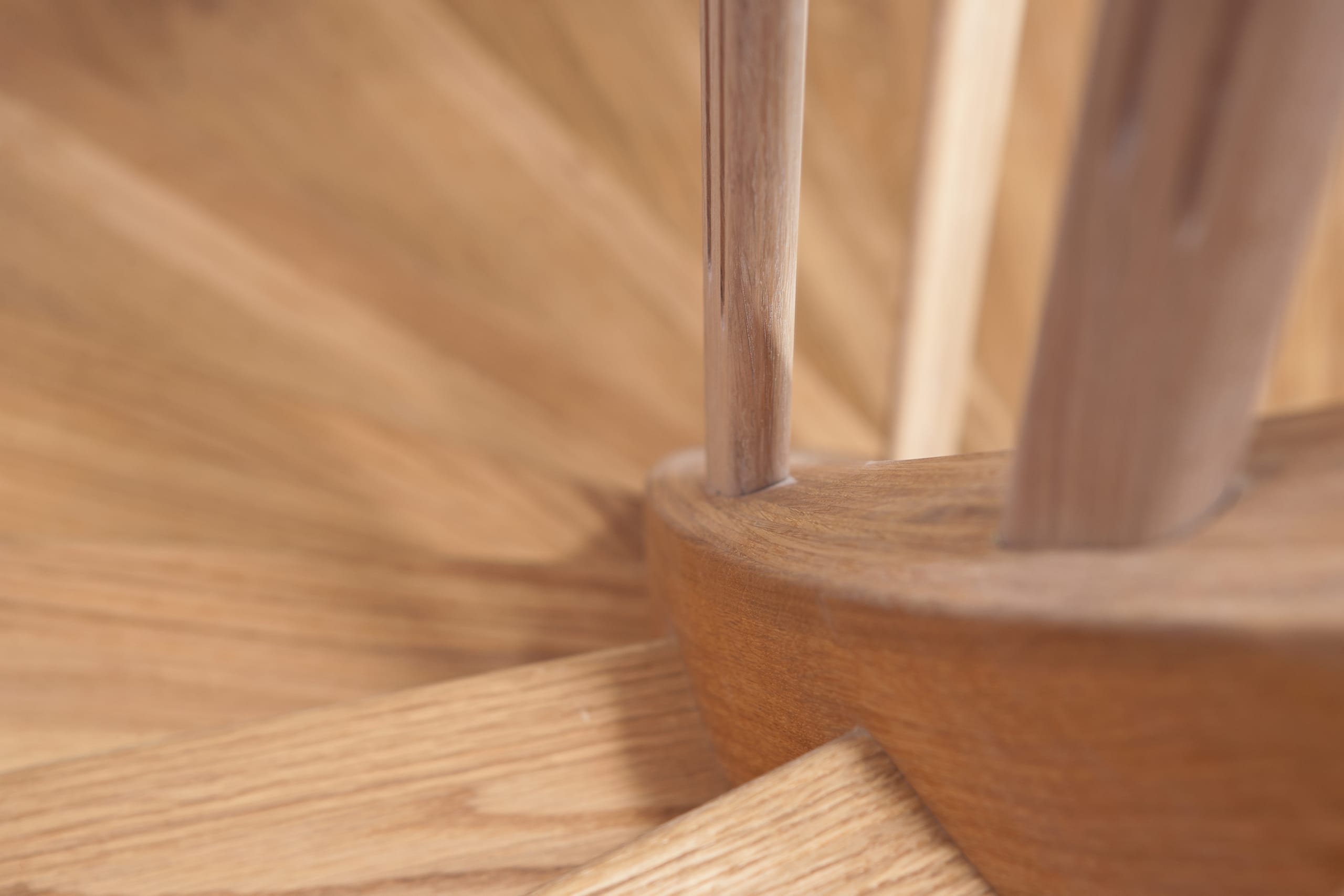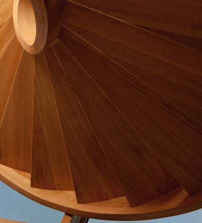 1/2 gewendelte offene Bogen-Wangentreppe Holzart Eiche geölt, Stäbe weiß transparent gewachst