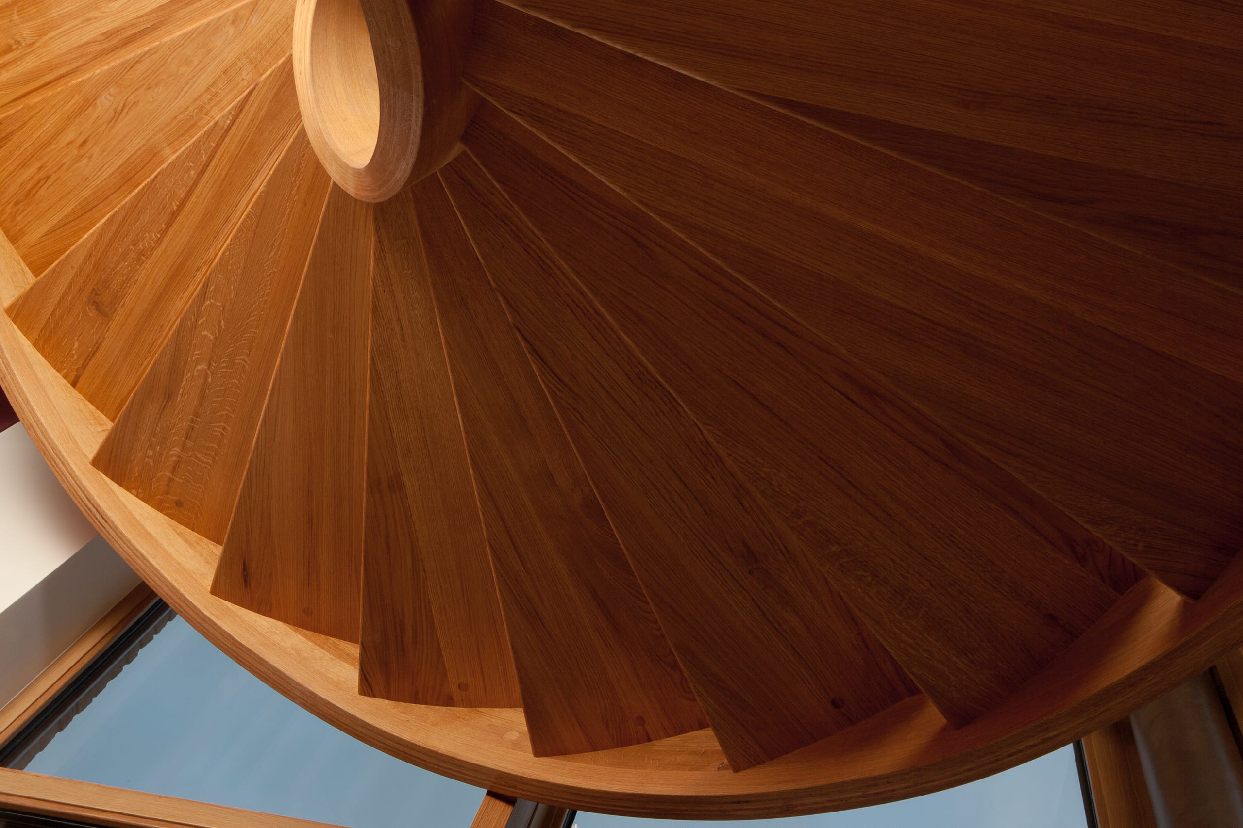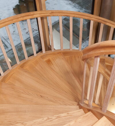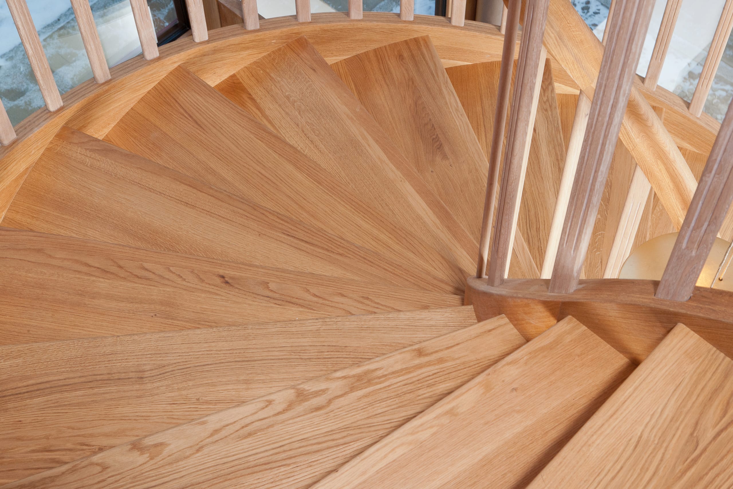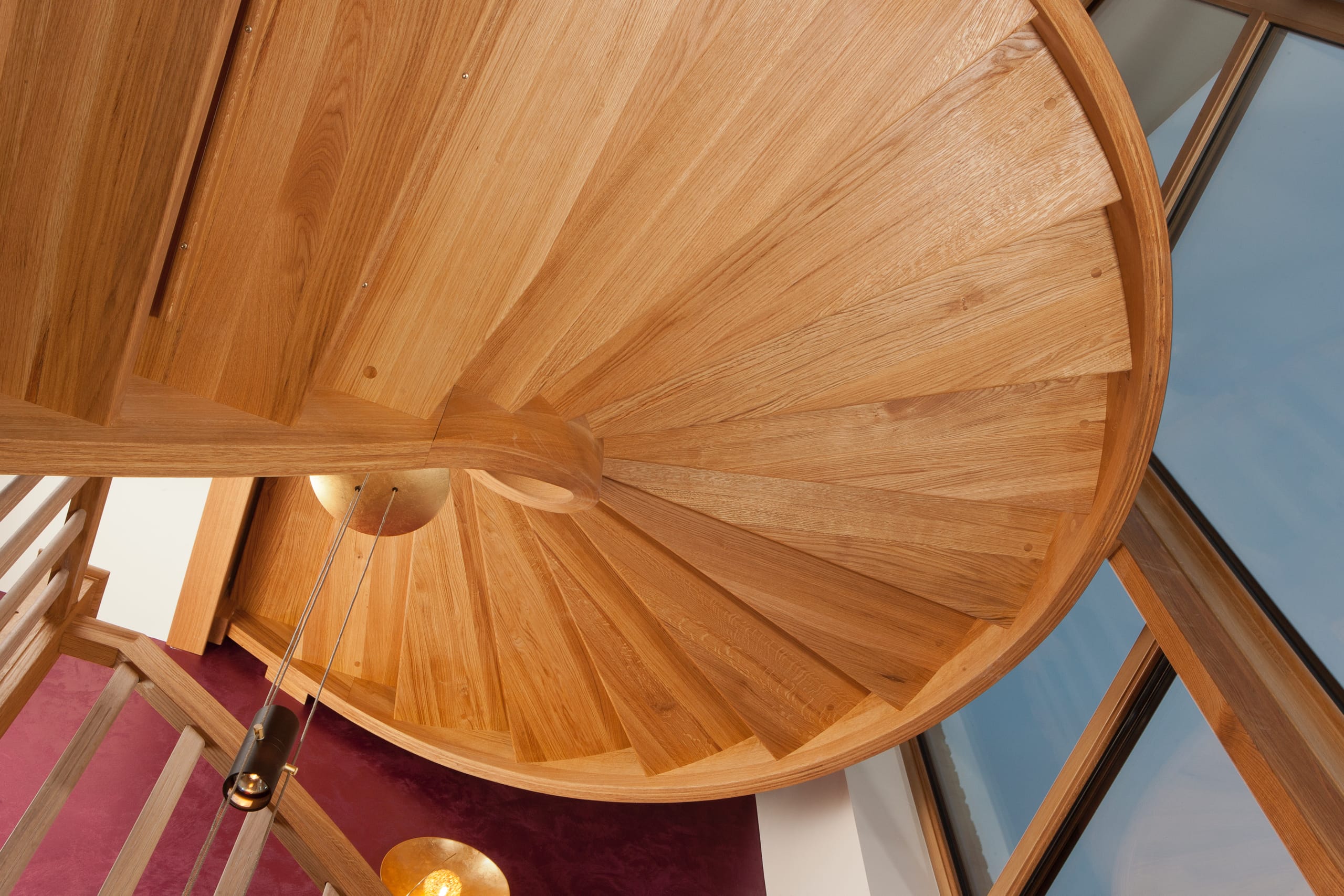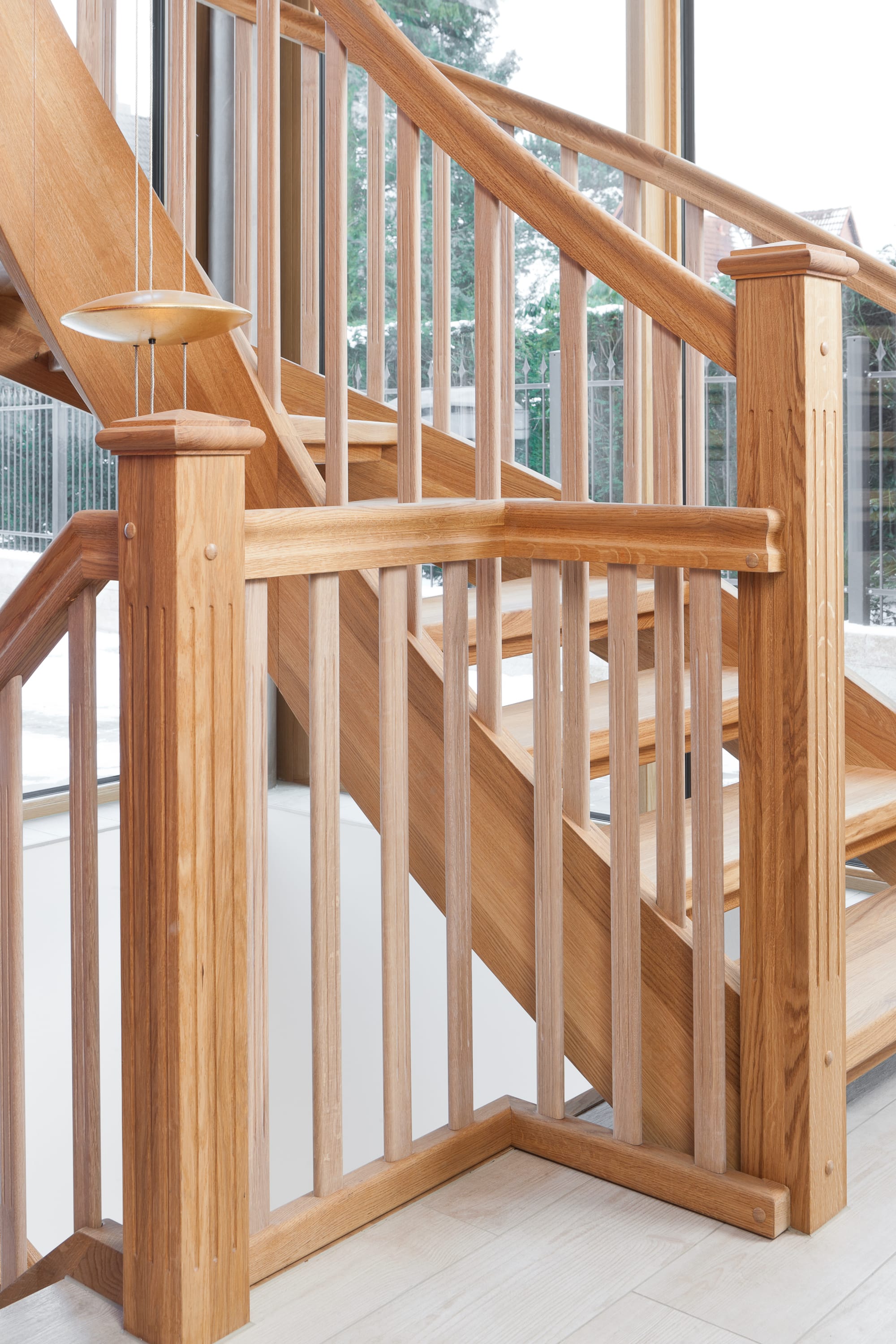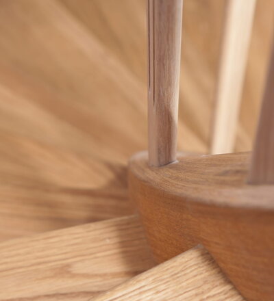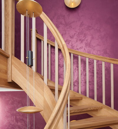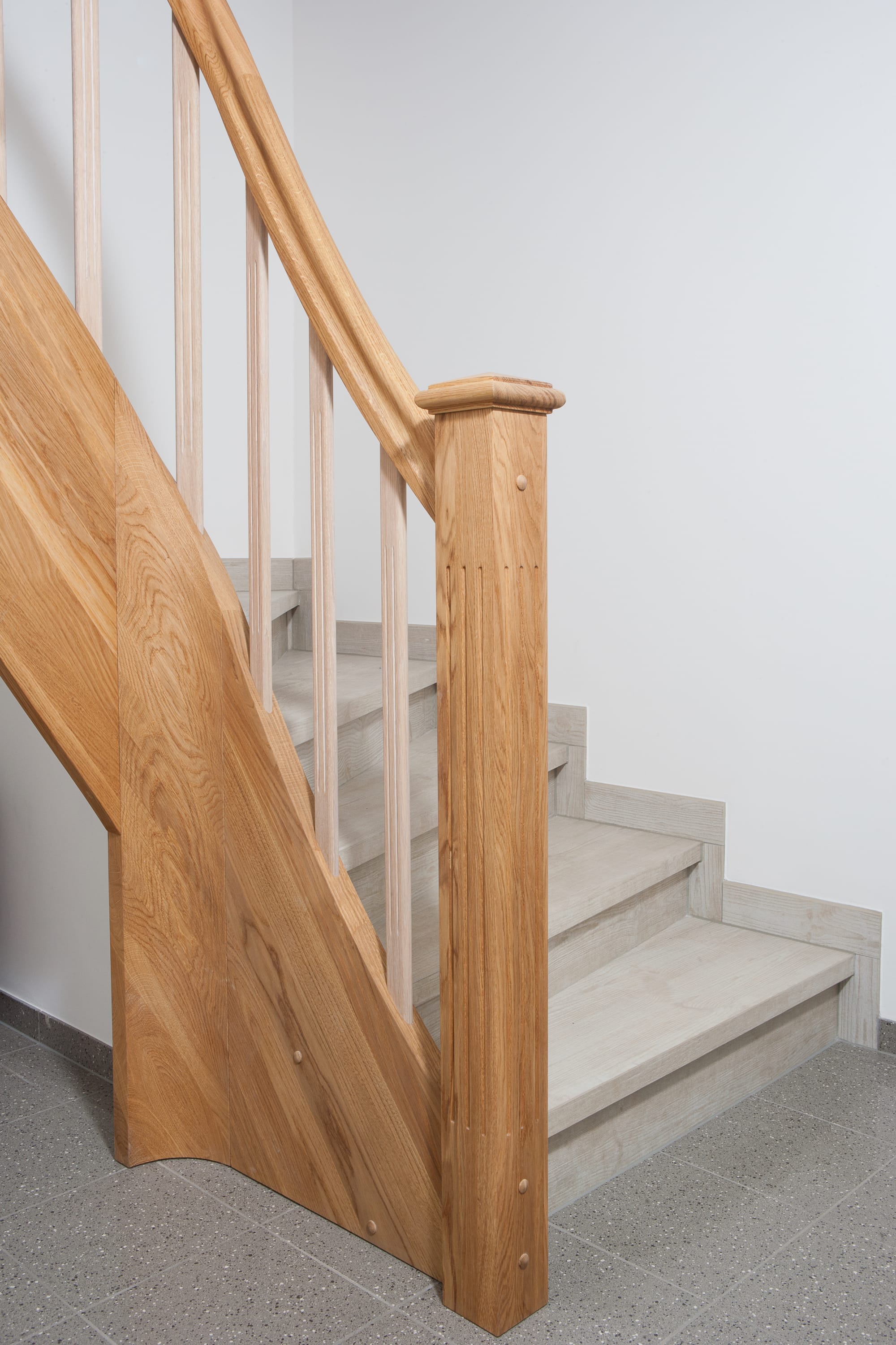 1/2 gewendelte offene Bogen-Wangentreppe Holzart Eiche geölt, Stäbe weiß transparent gewachst