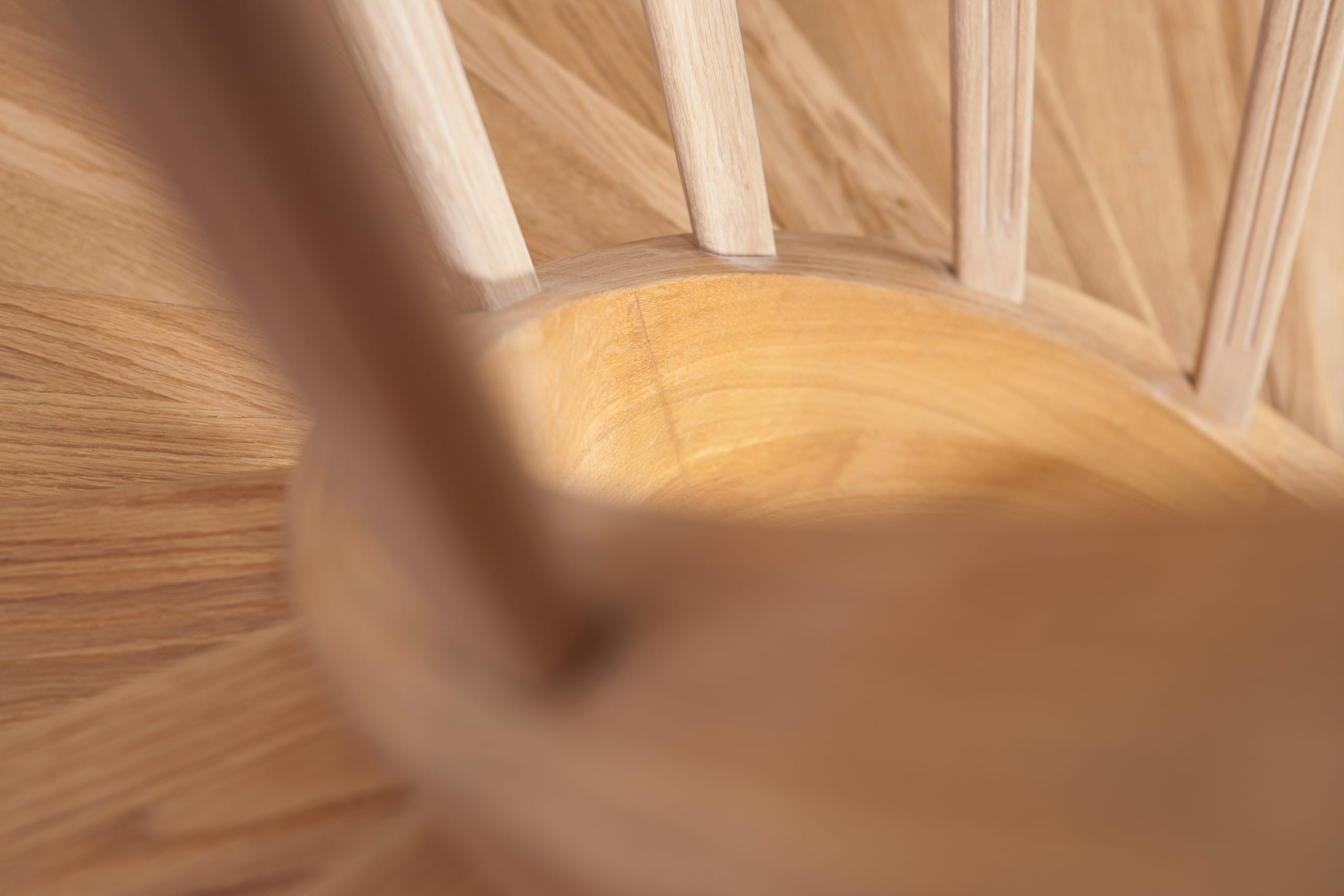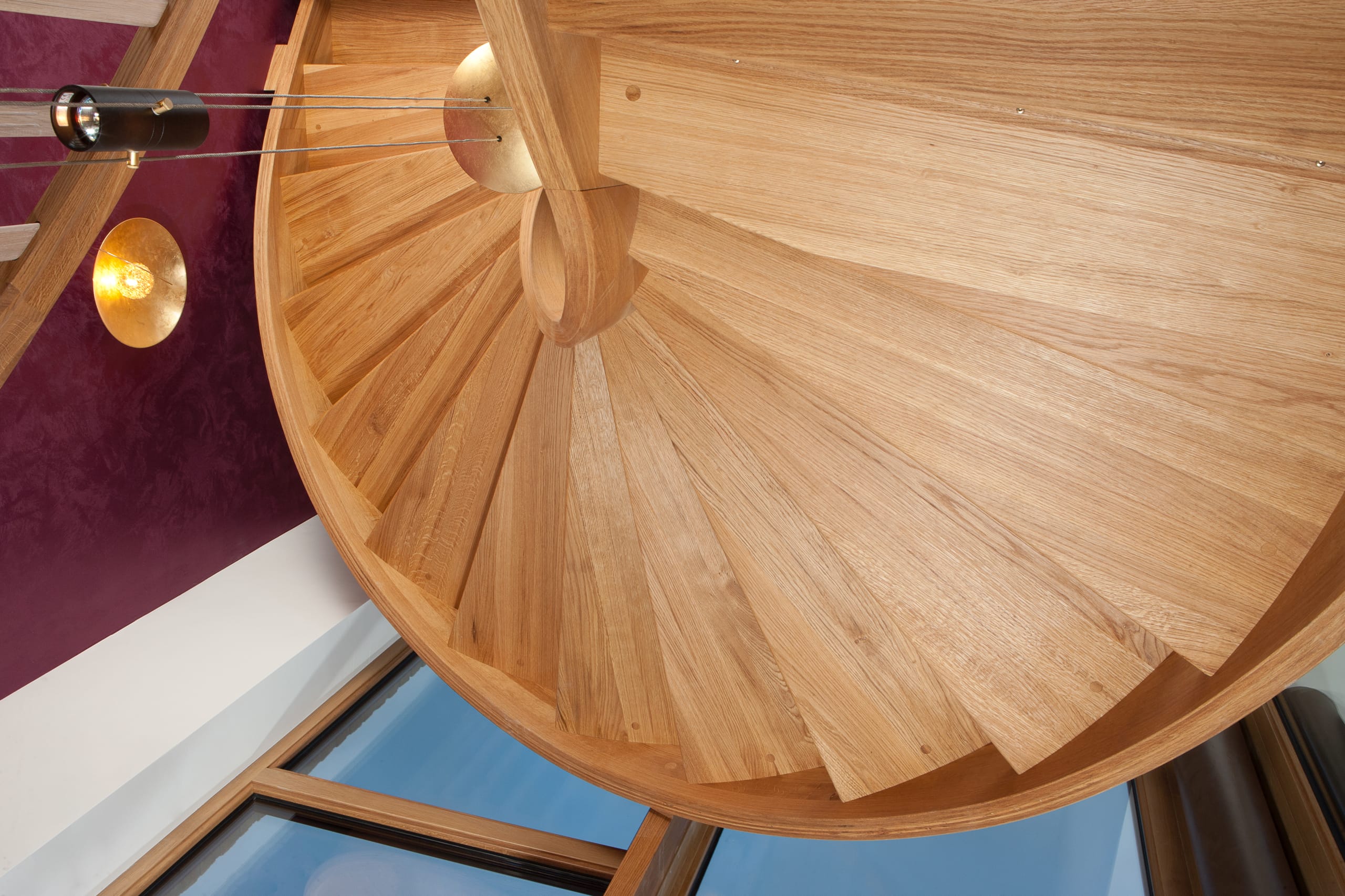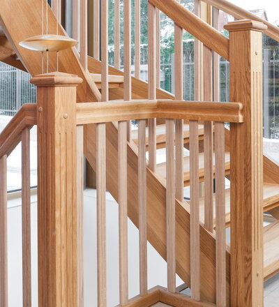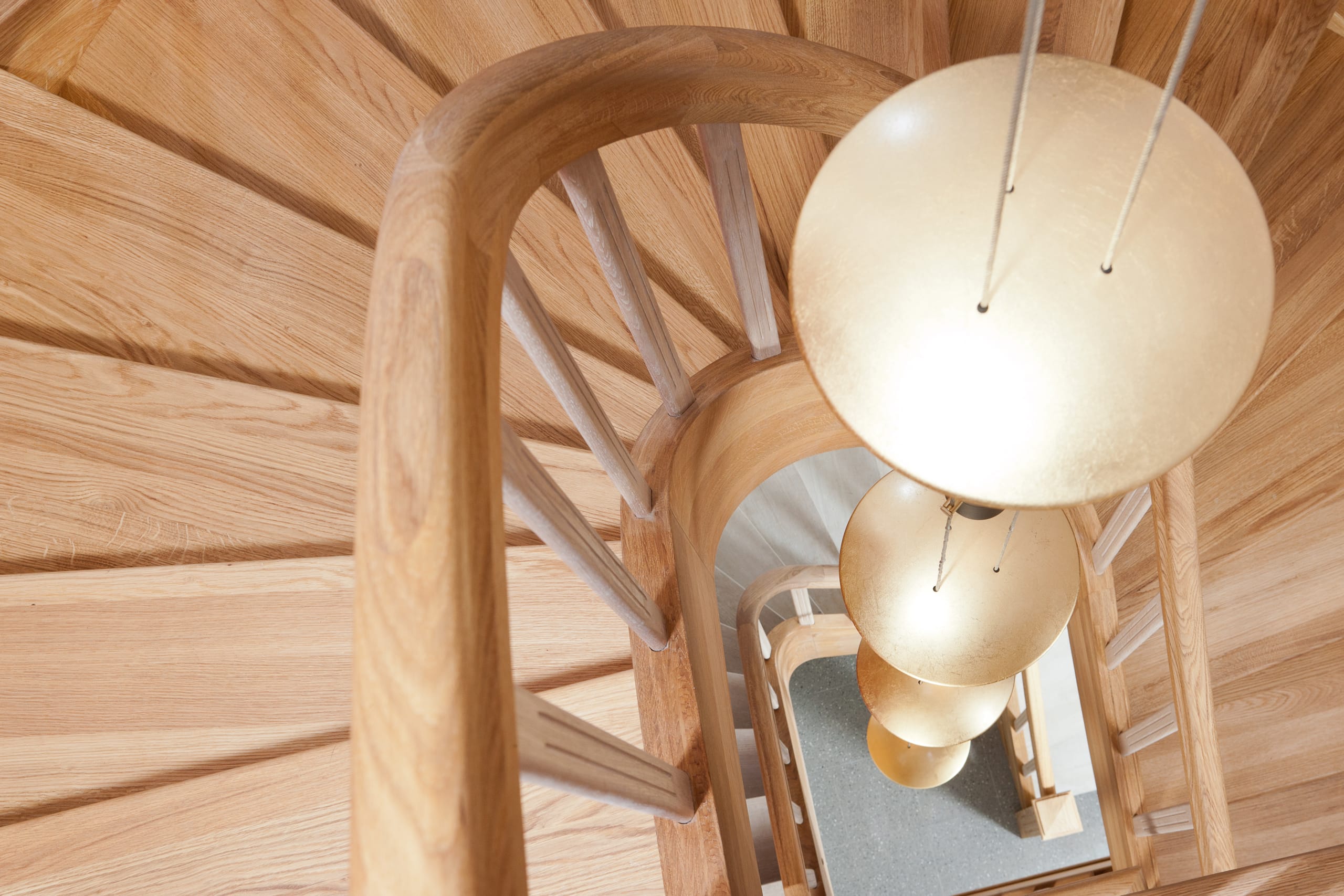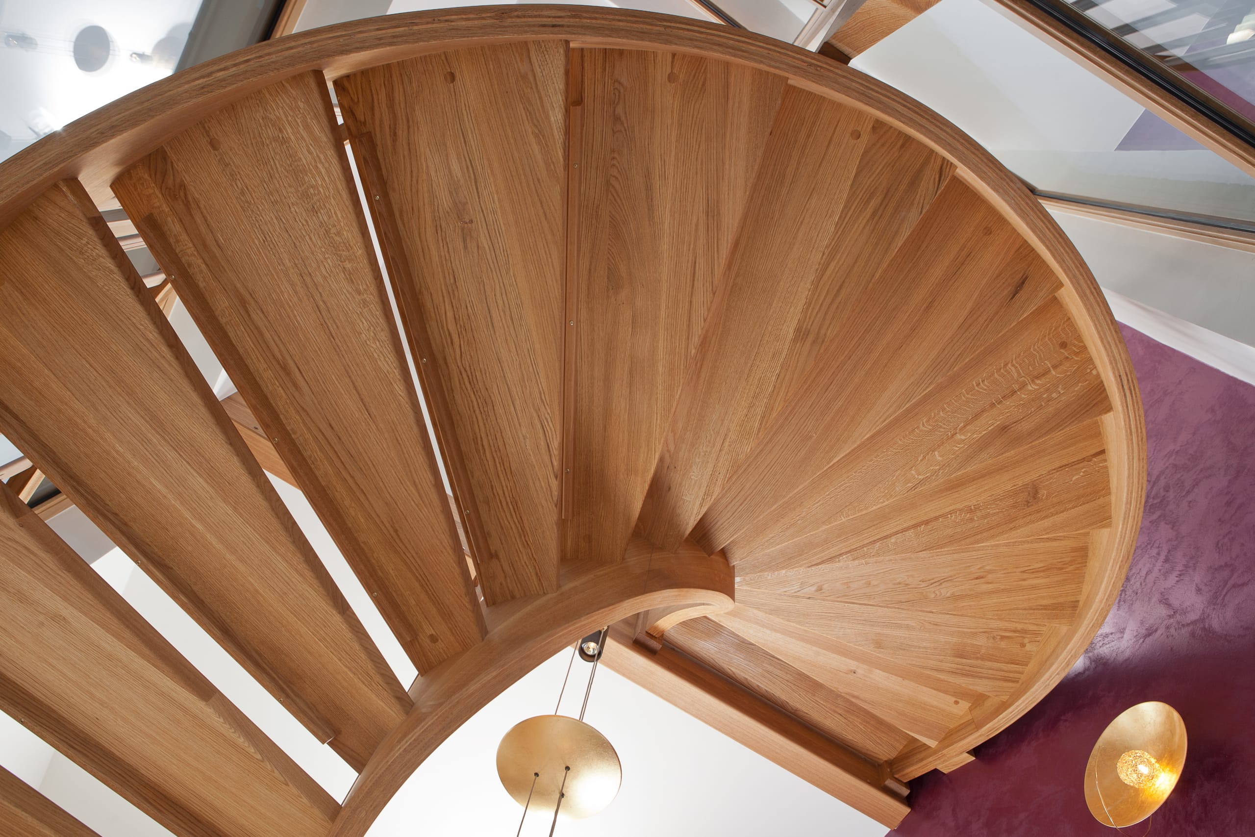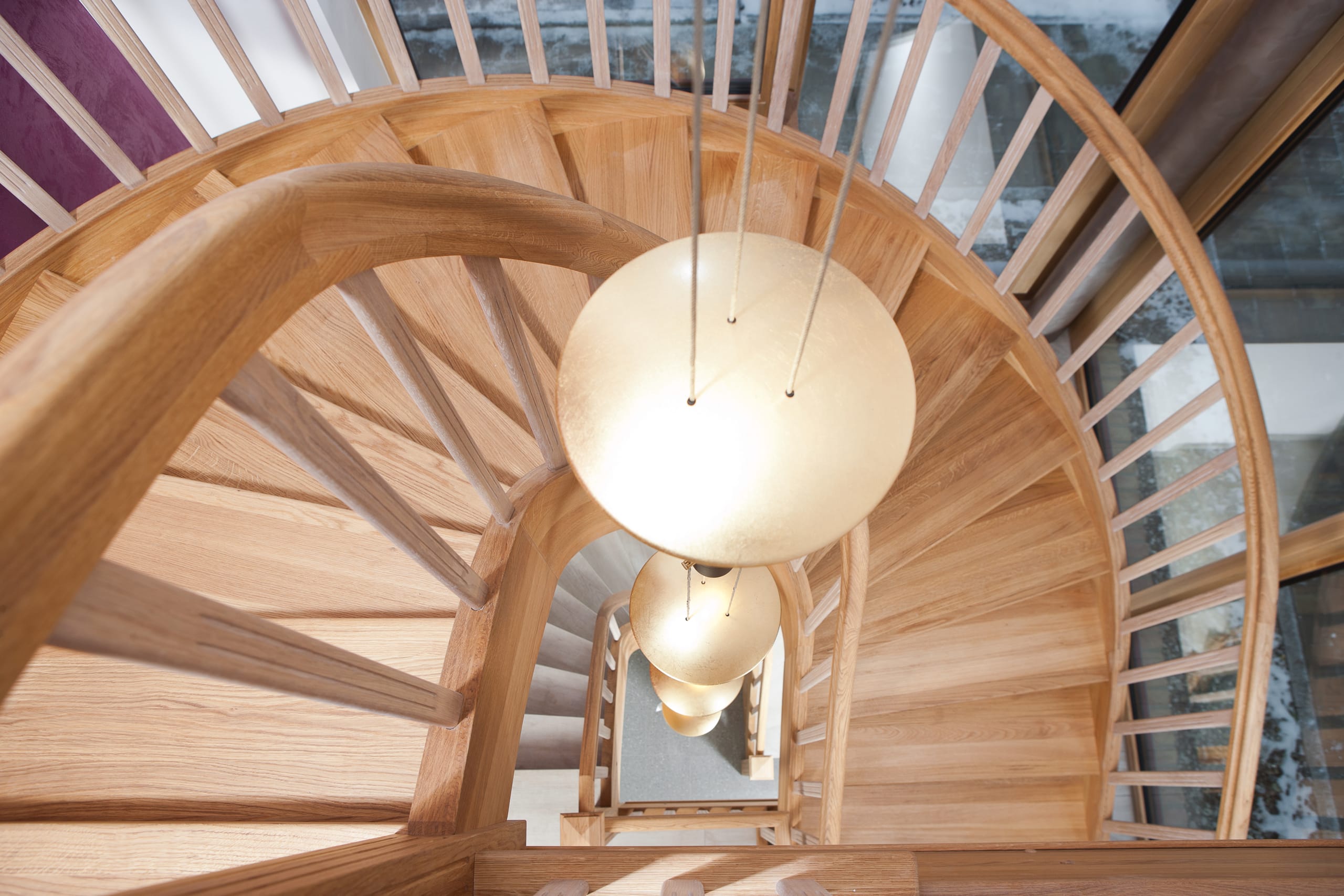 1/2 gewendelte offene Bogen-Wangentreppe Holzart Eiche geölt, Stäbe weiß transparent gewachst