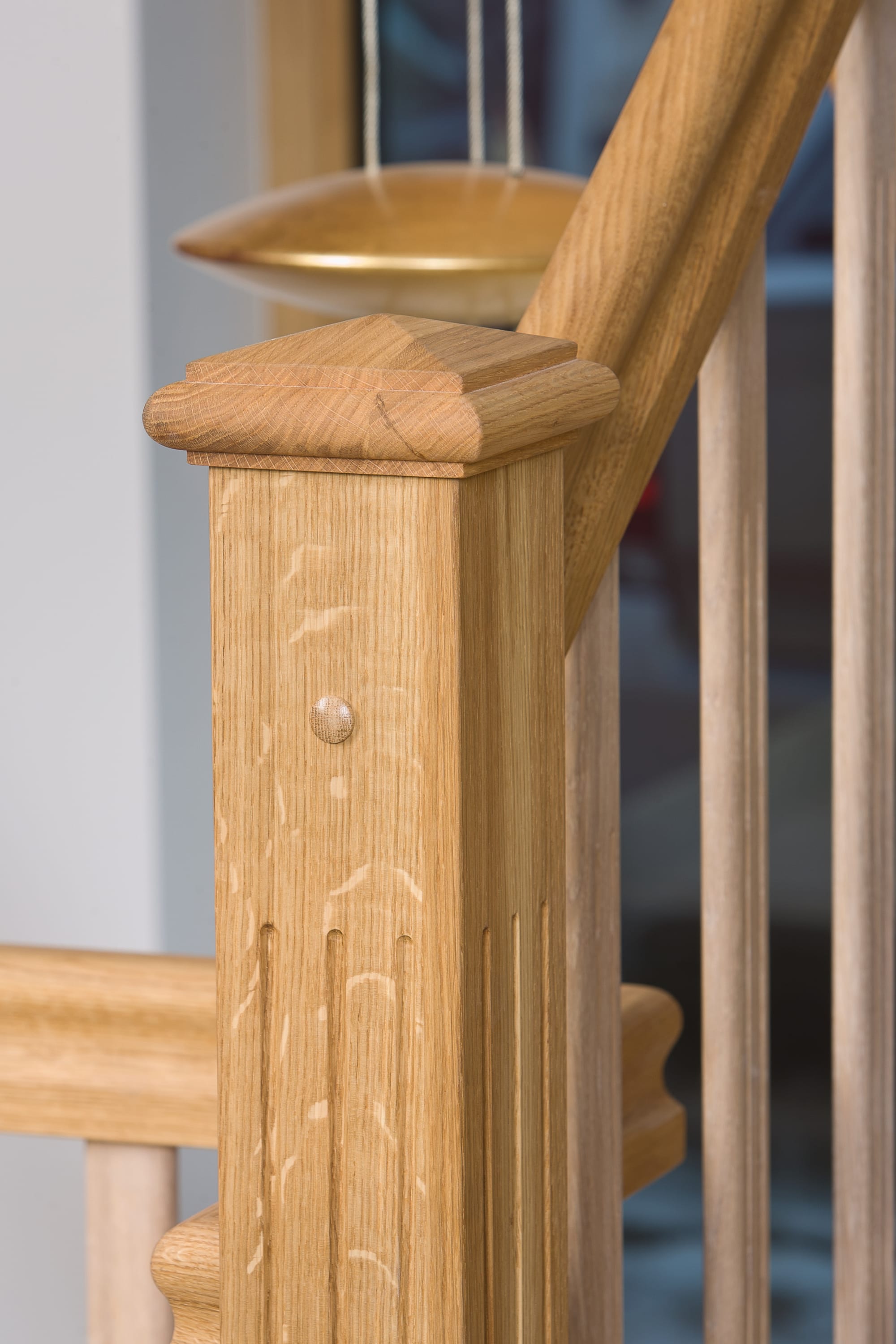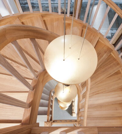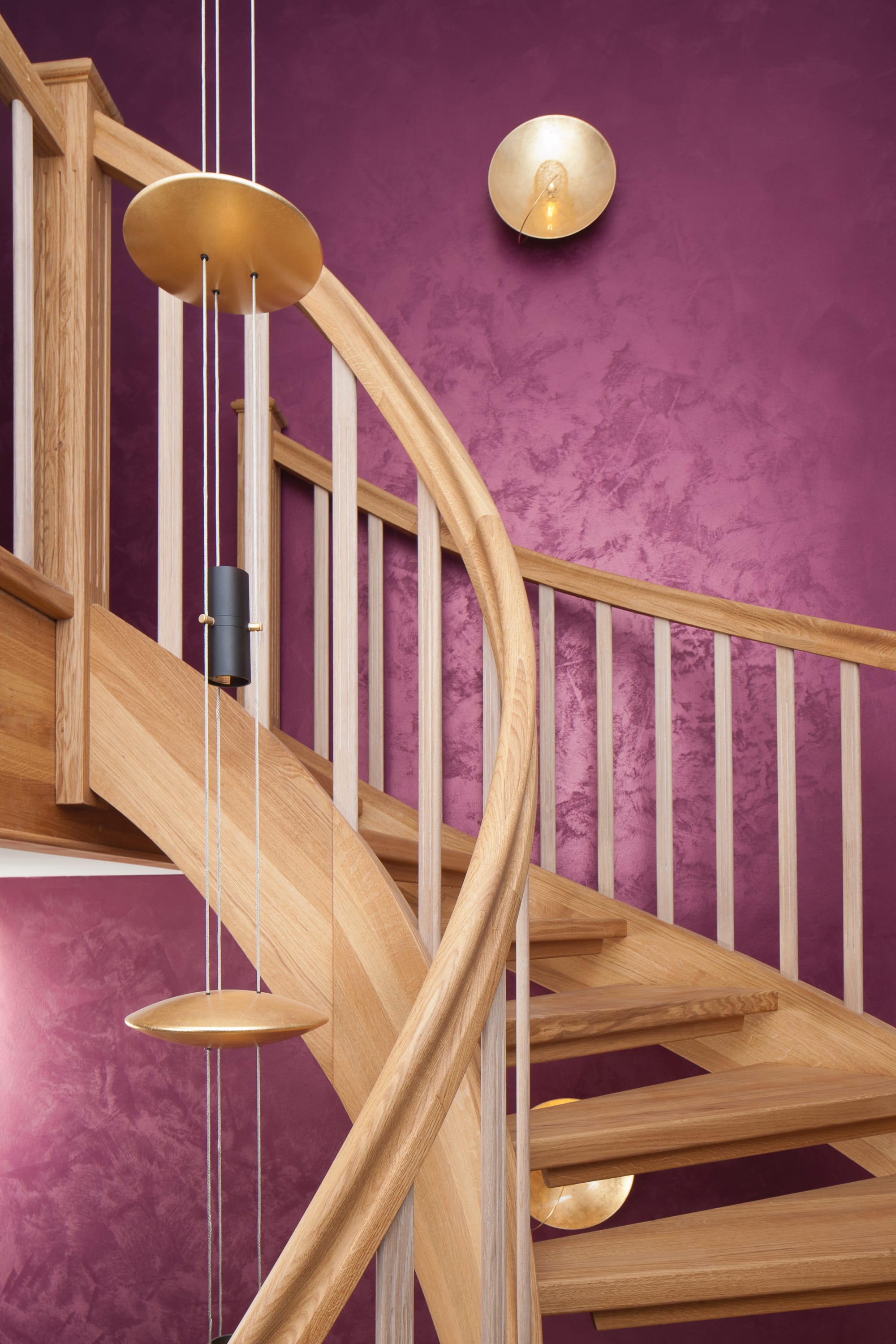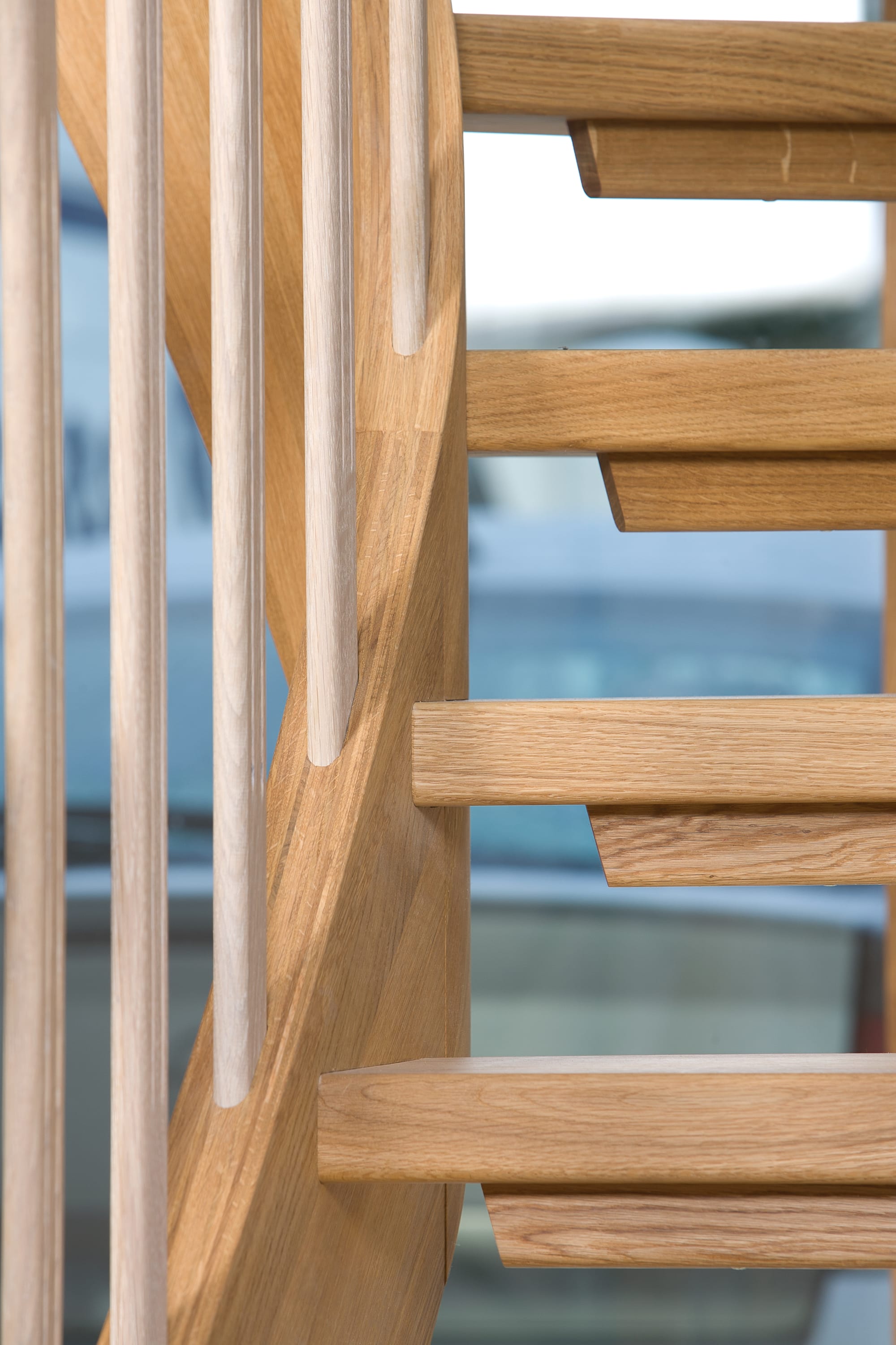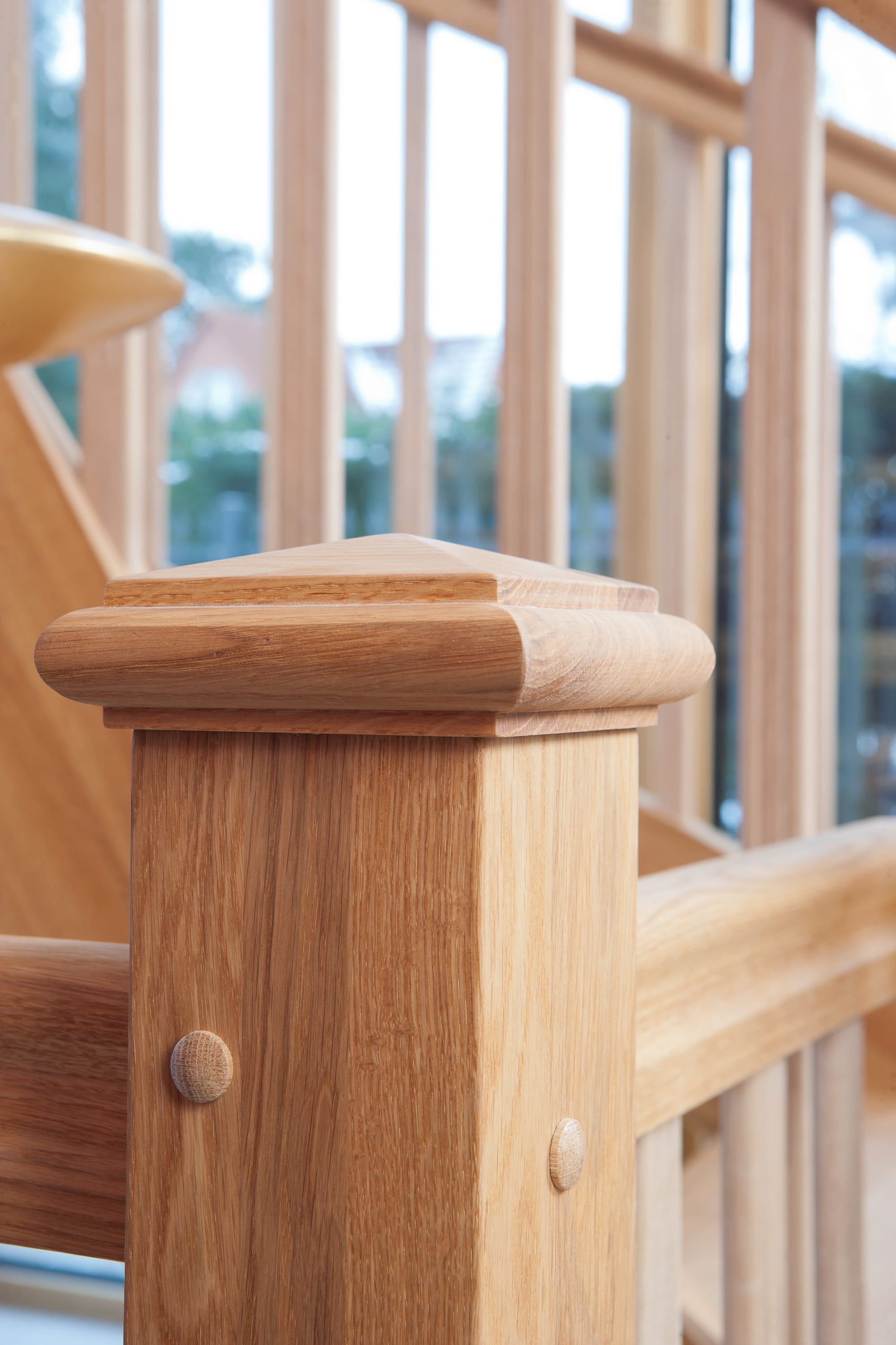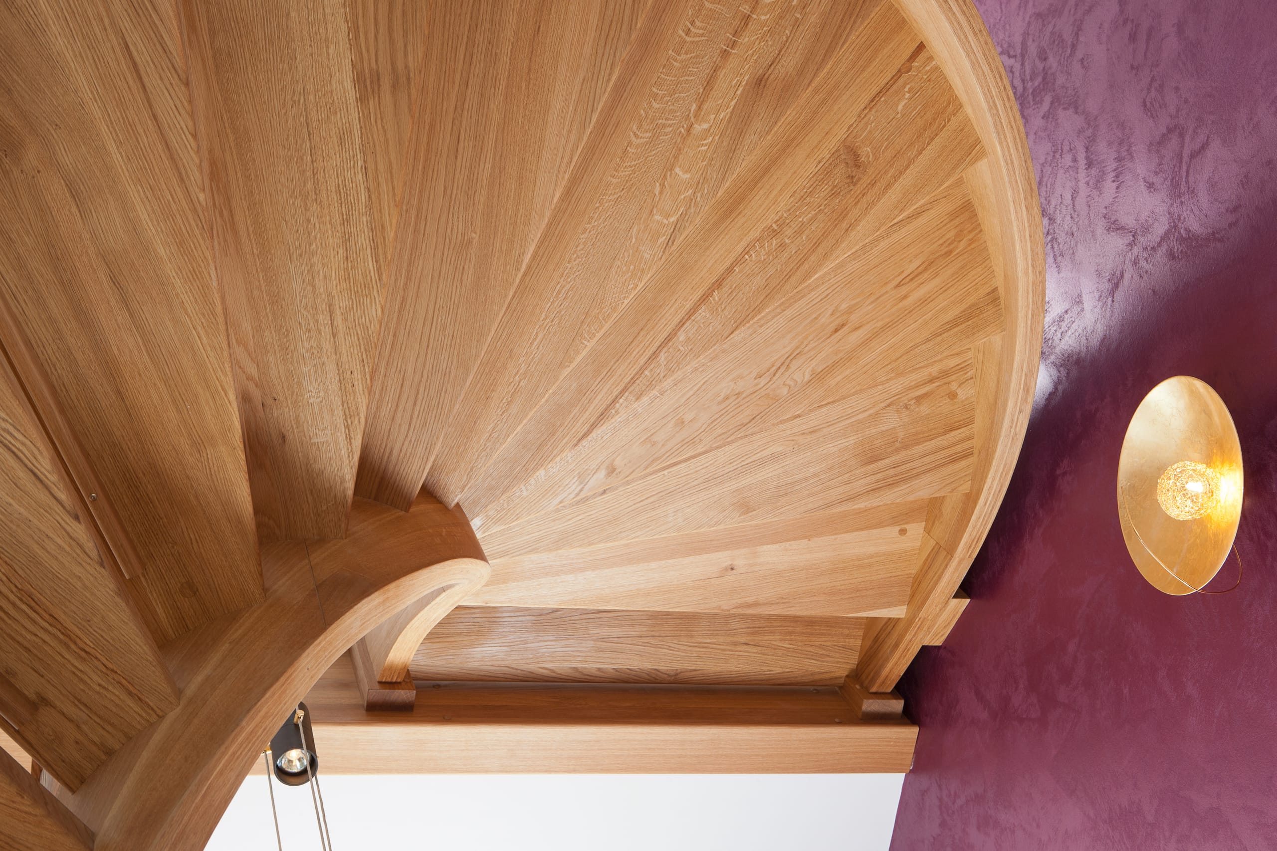 1/2 gewendelte offene Bogen-Wangentreppe Holzart Eiche geölt, Stäbe weiß transparent gewachst