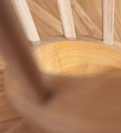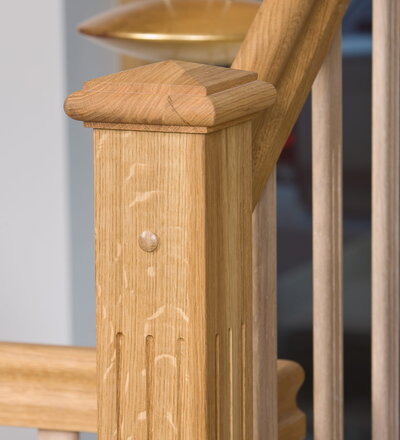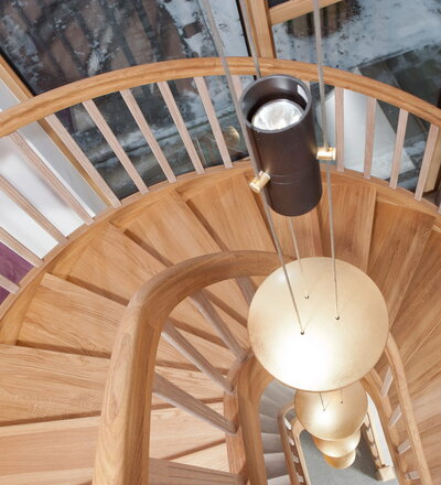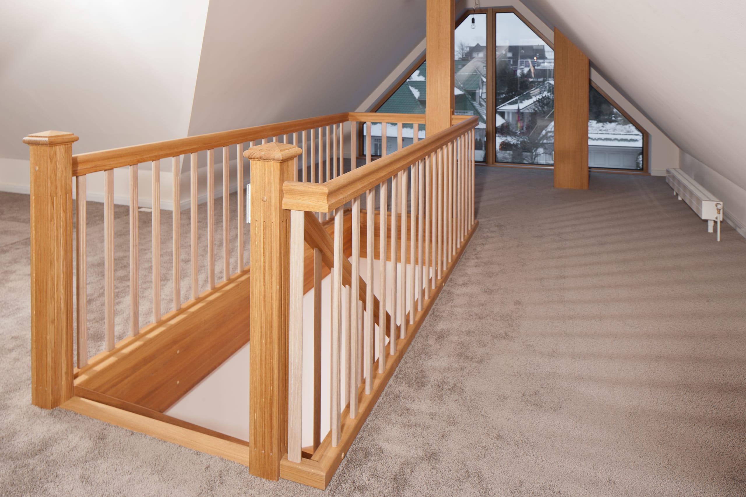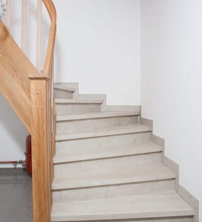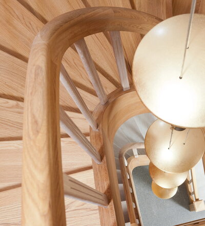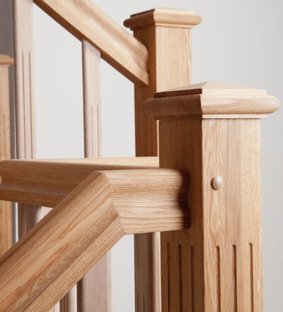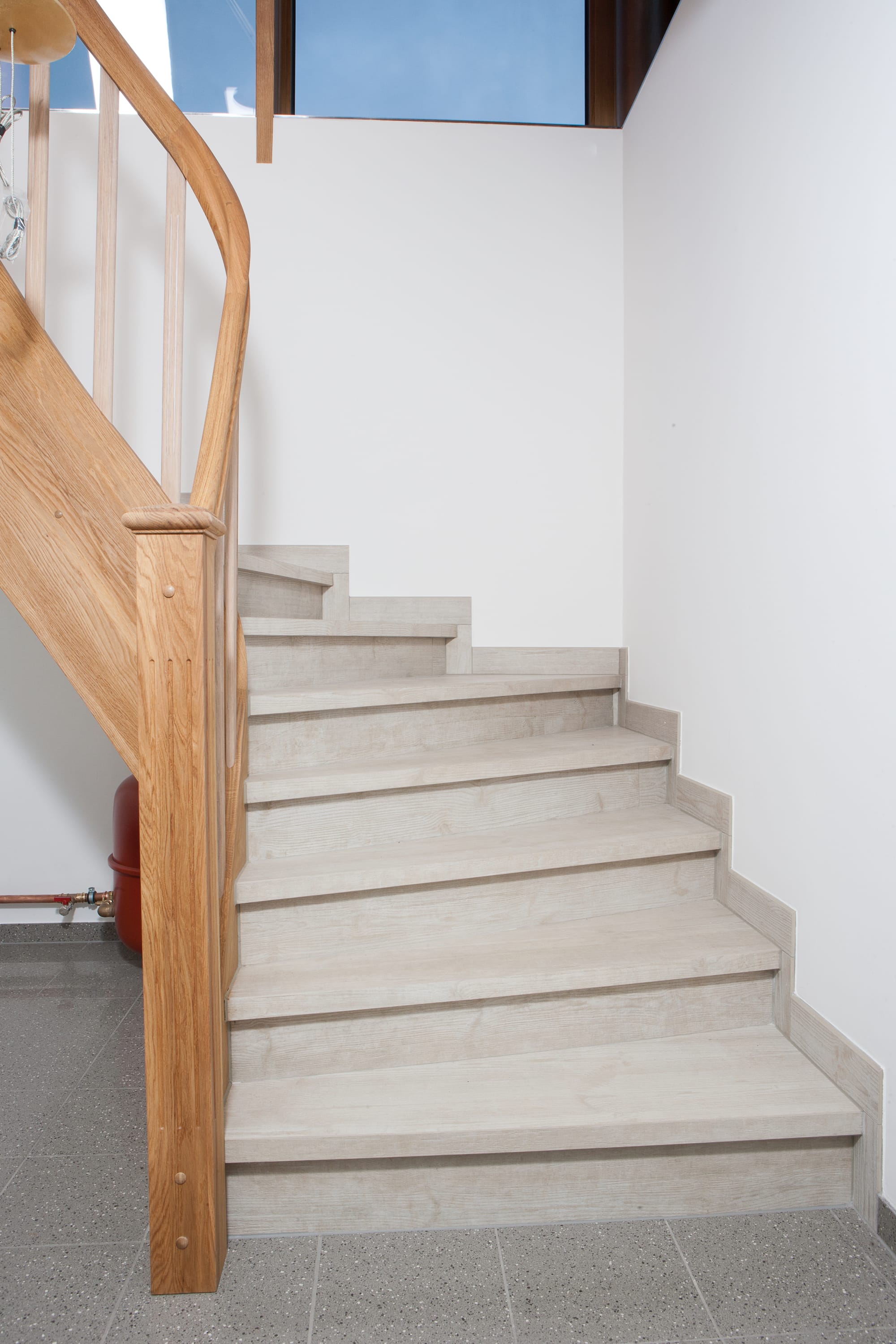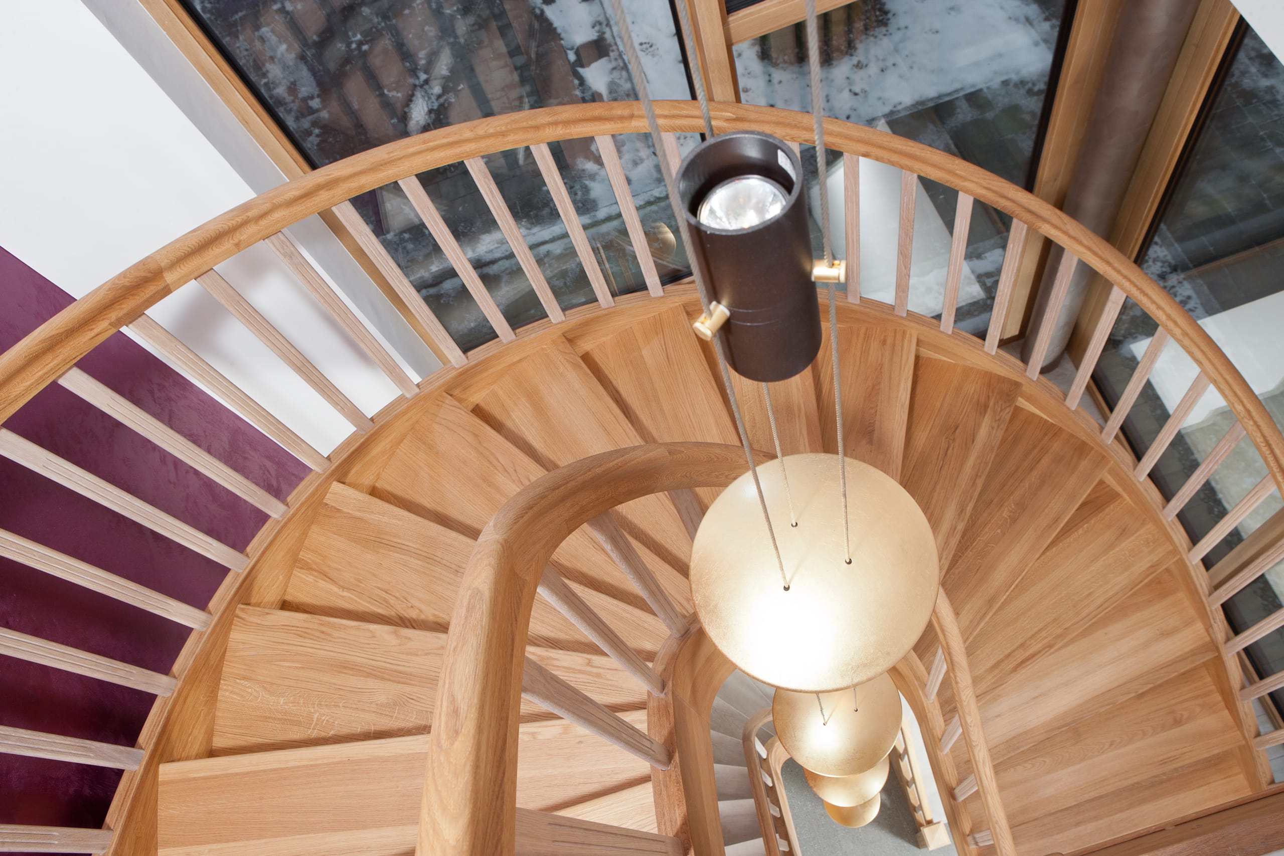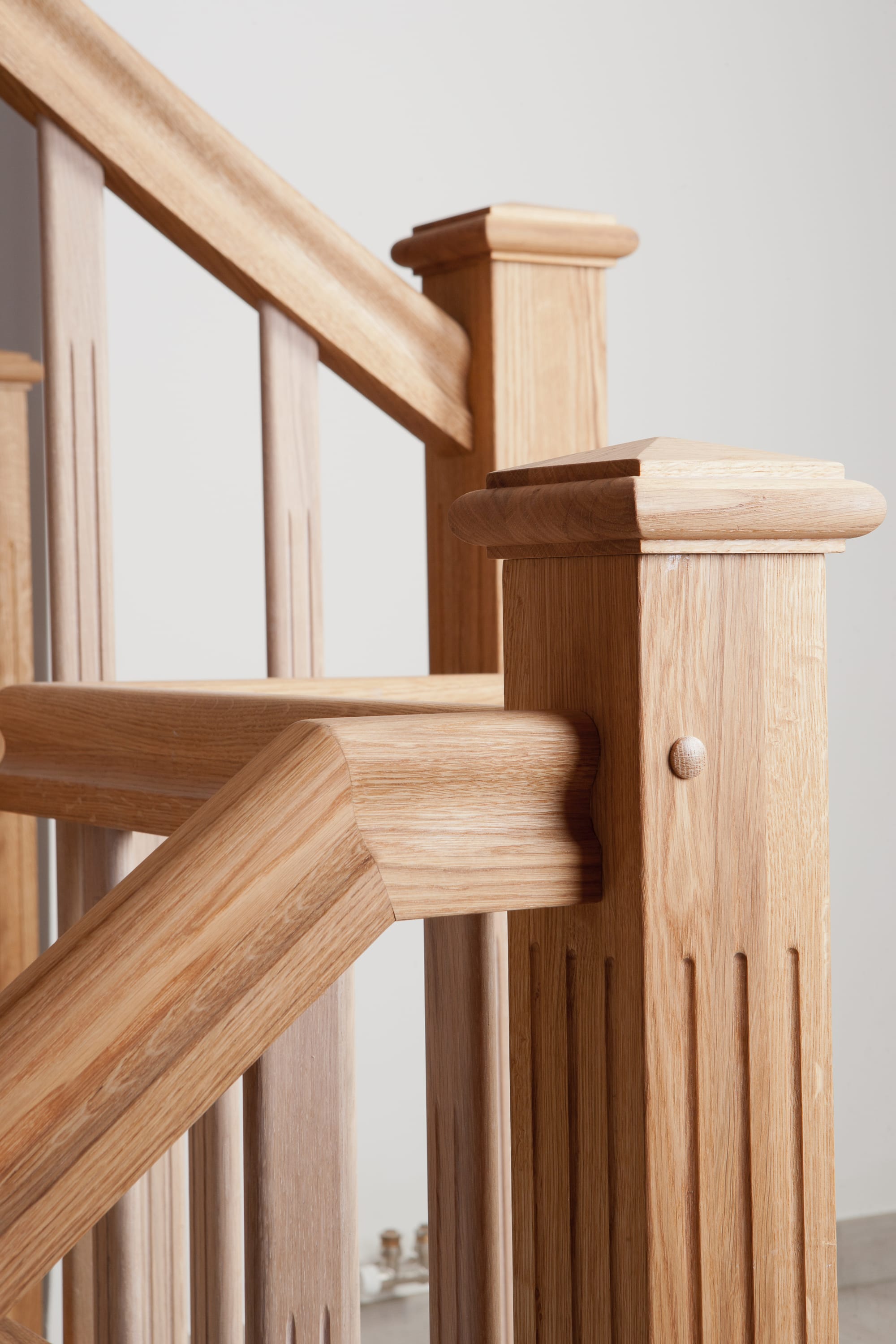 1/2 gewendelte offene Bogen-Wangentreppe Holzart Eiche geölt, Stäbe weiß transparent gewachst