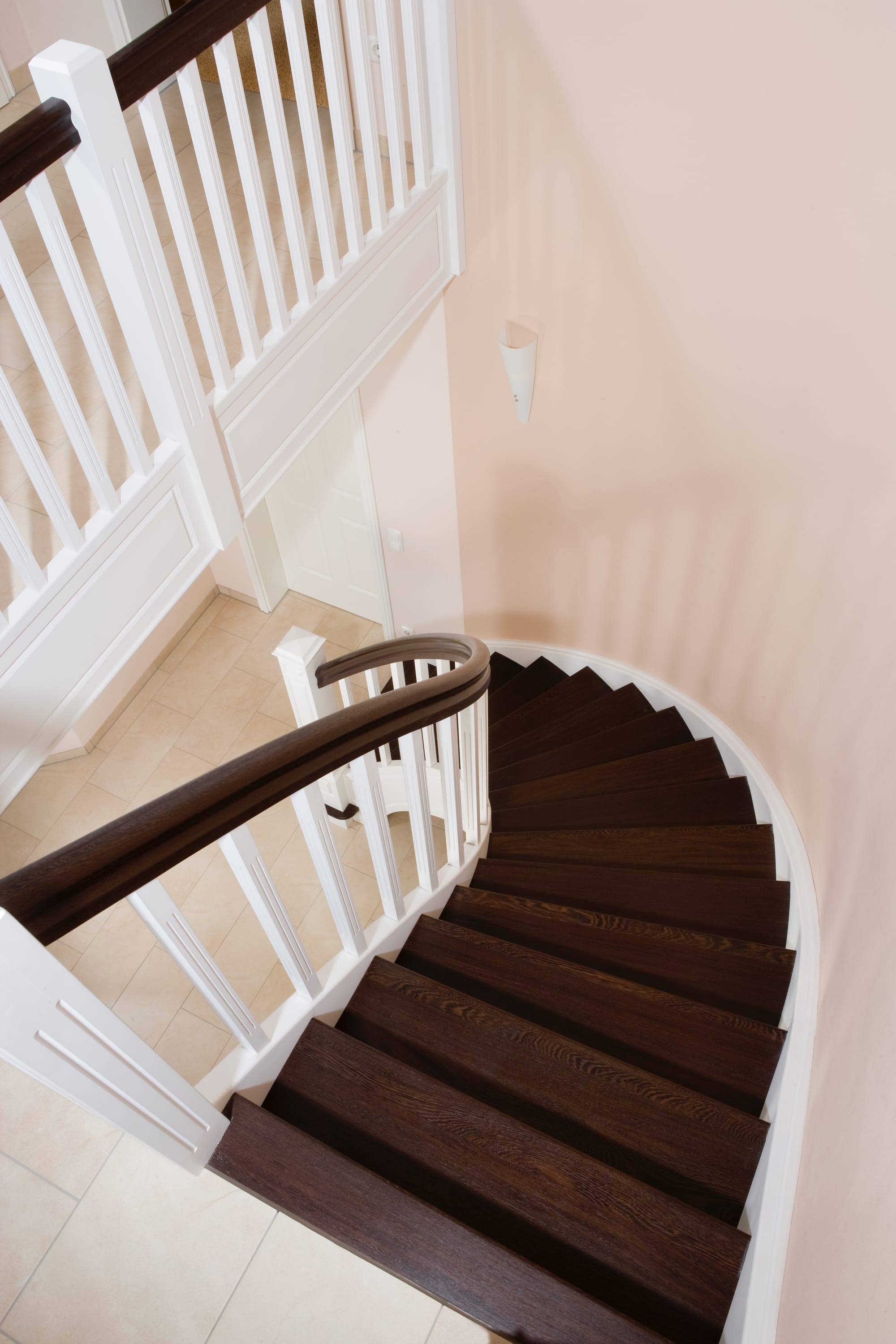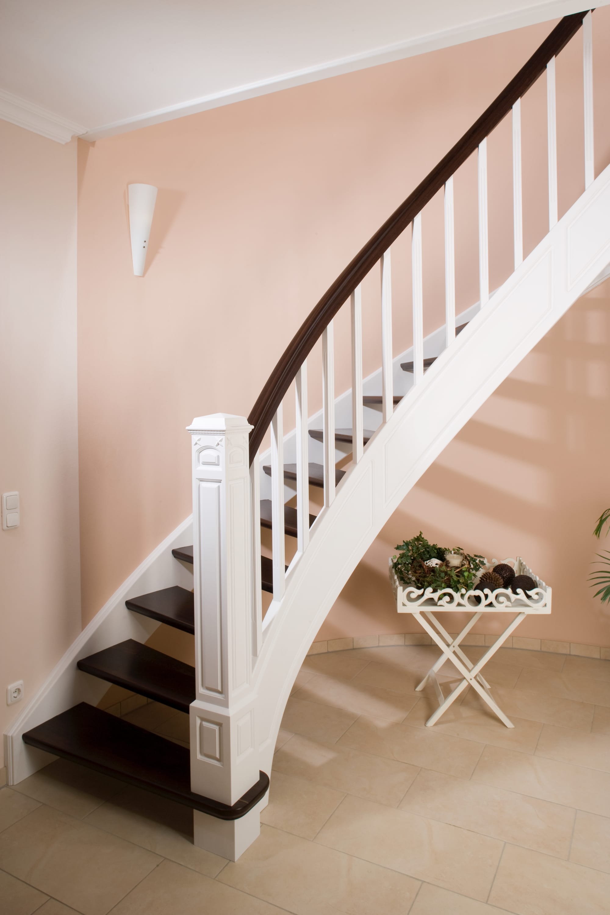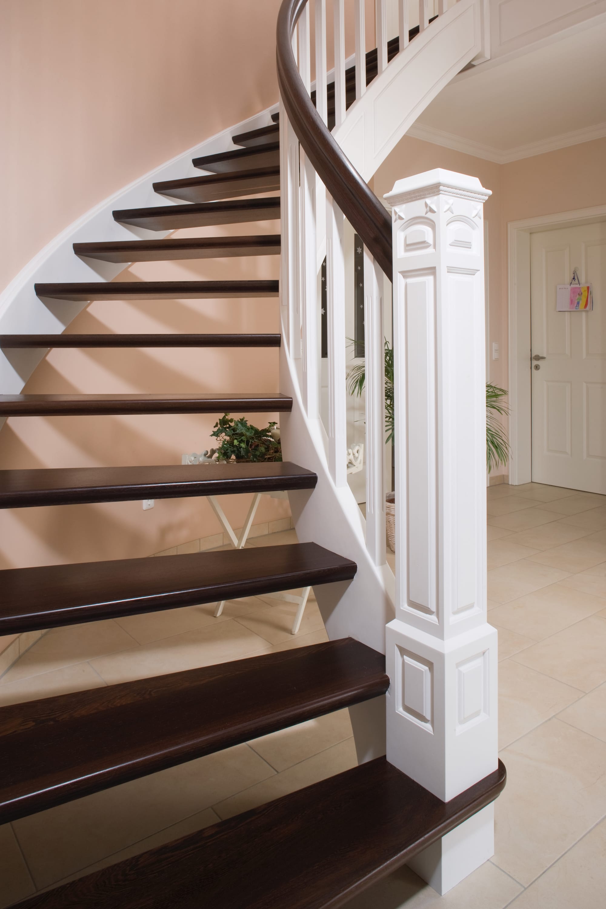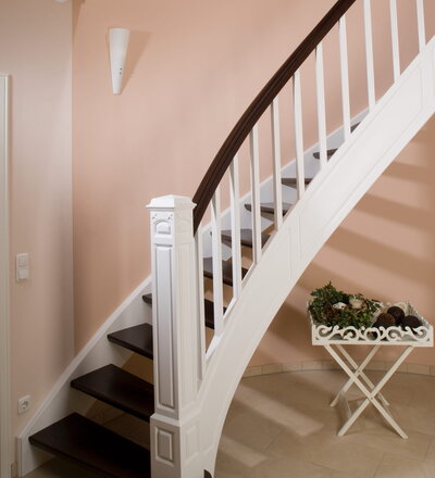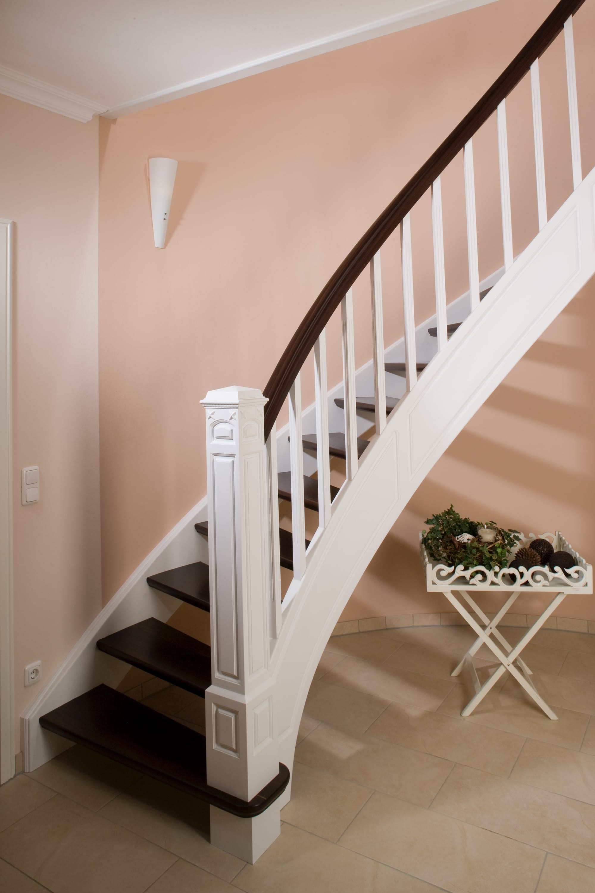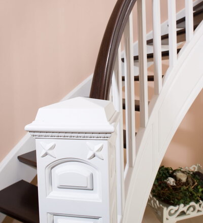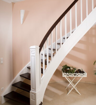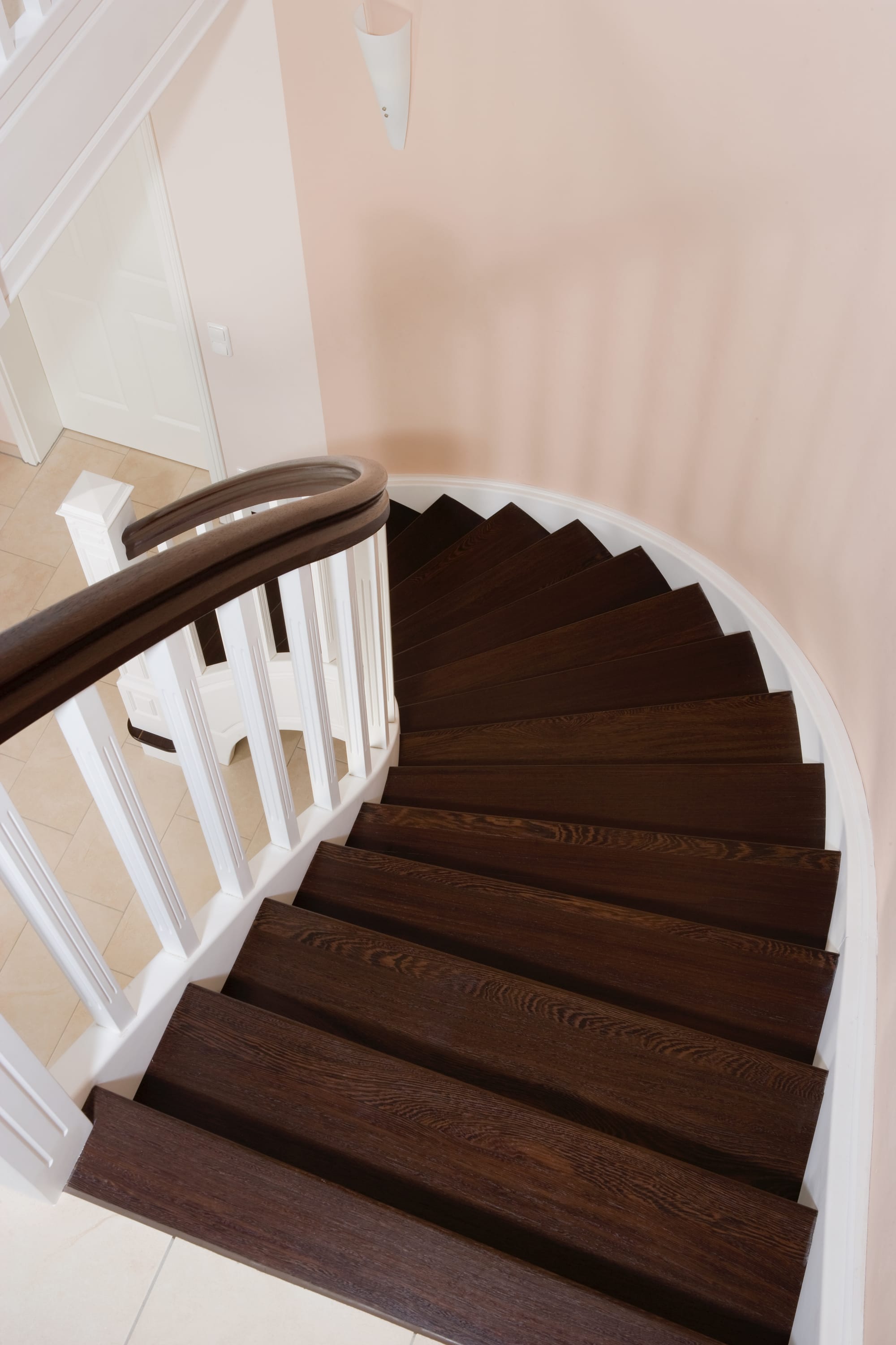Bogentreppe mit Stufen und Handlauf in der Holzart Wenge, weiß endbehandelte Wangen und Stäbe, profilierter Antrittspfosten