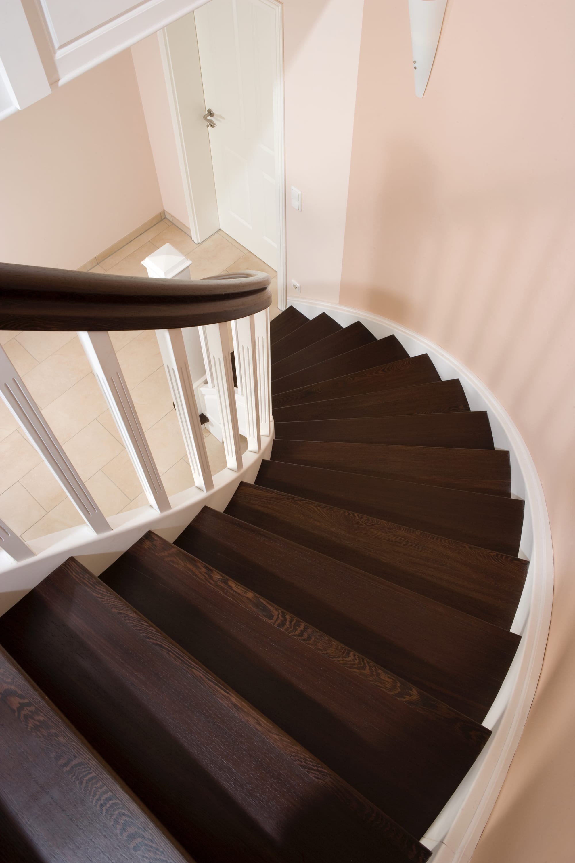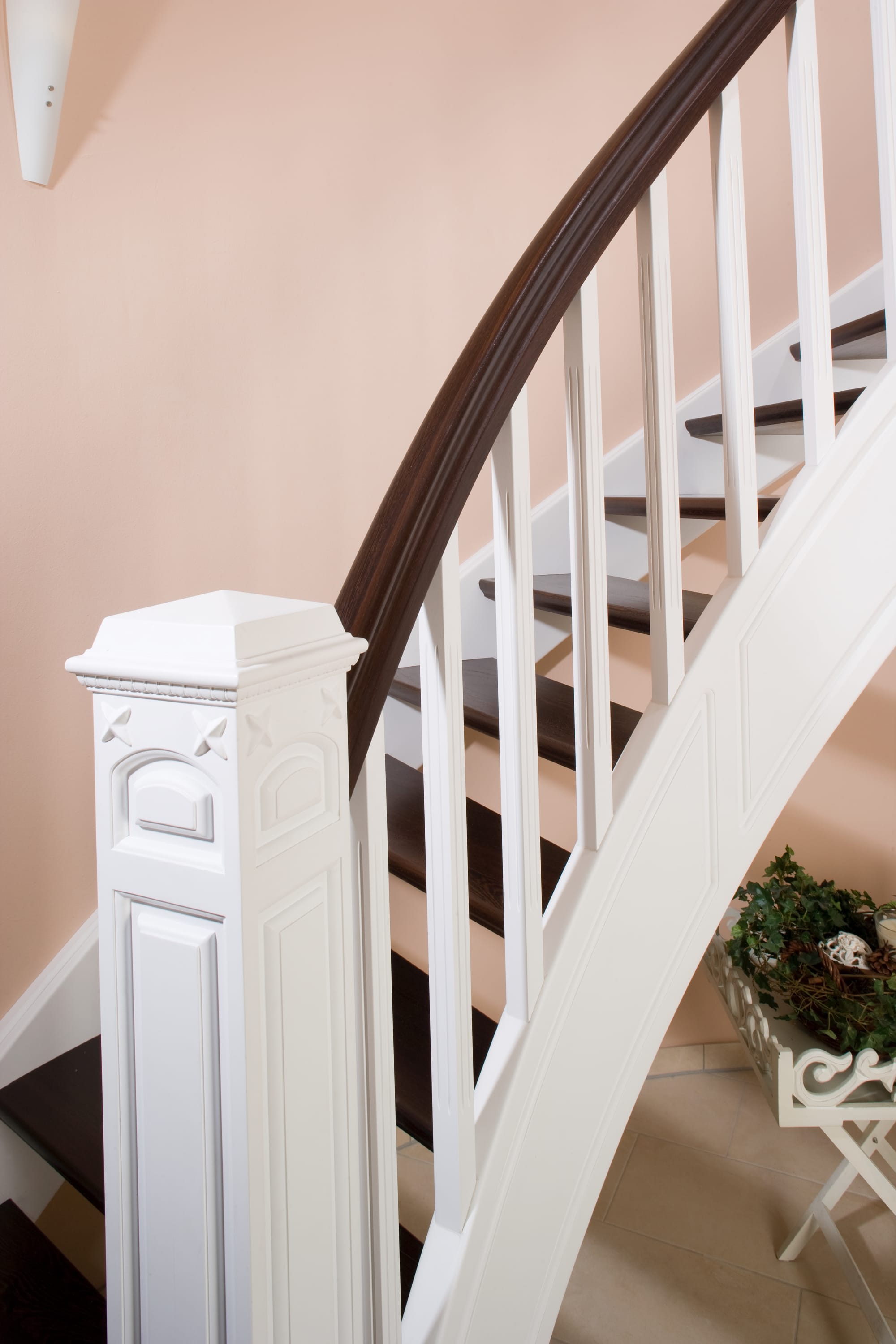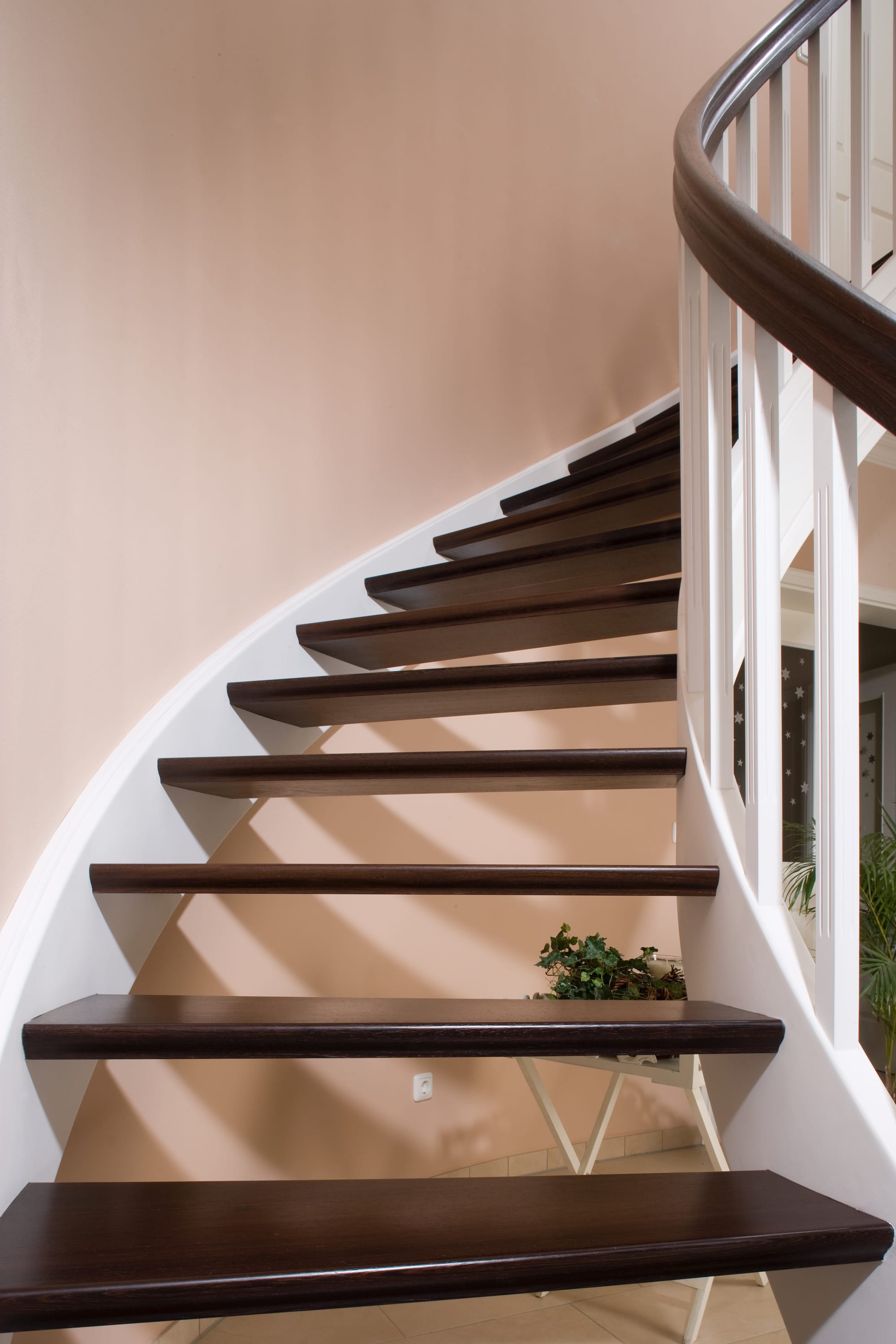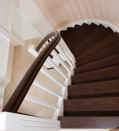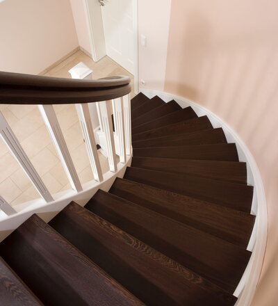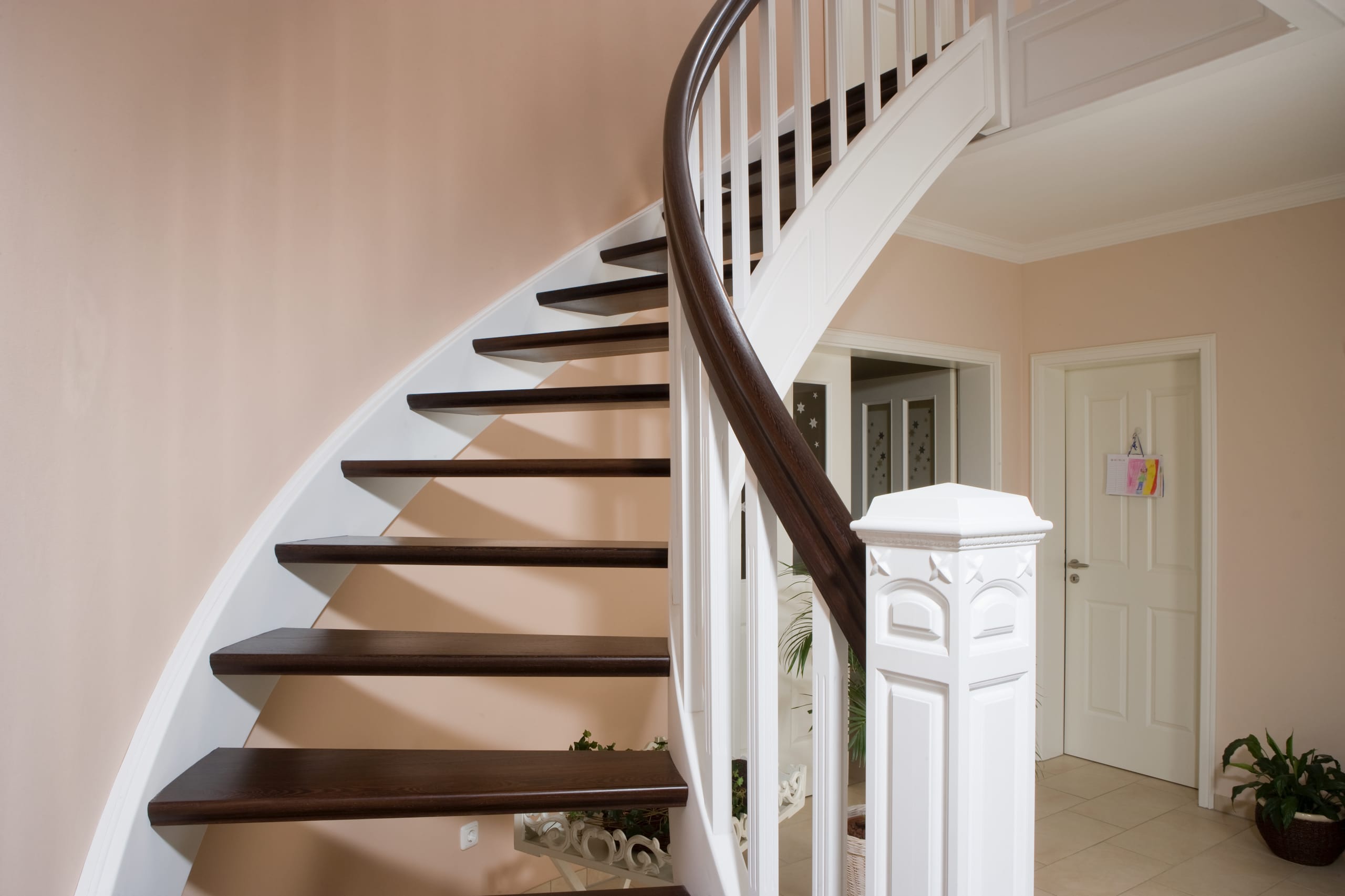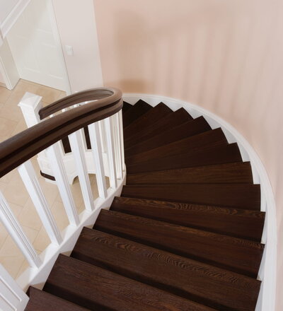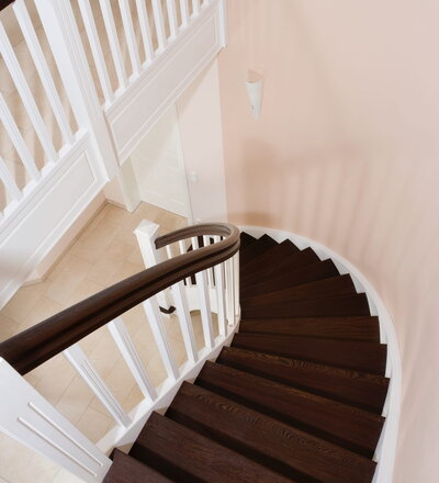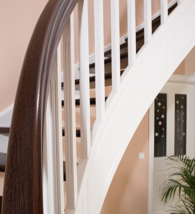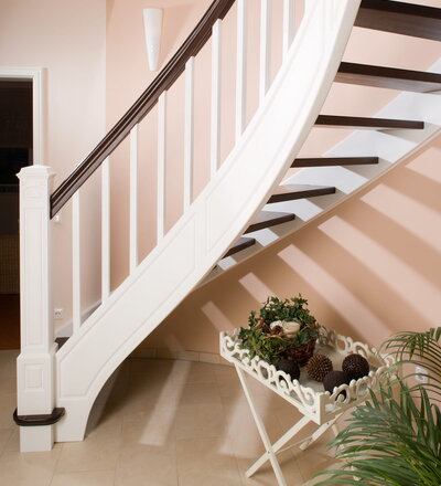 Bogentreppe mit Stufen und Handlauf in der Holzart Wenge, weiß endbehandelte Wangen und Stäbe, profilierter Antrittspfosten