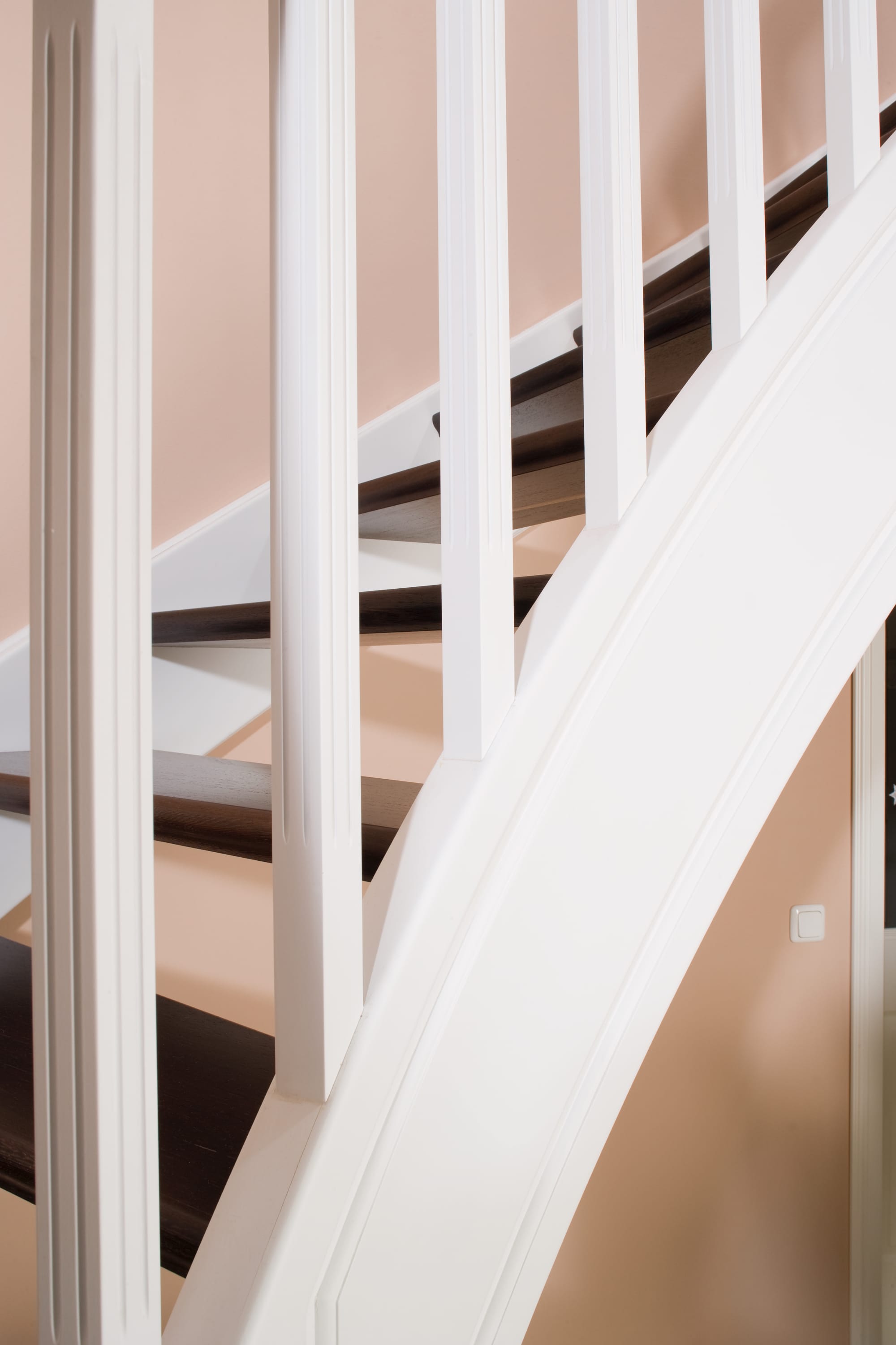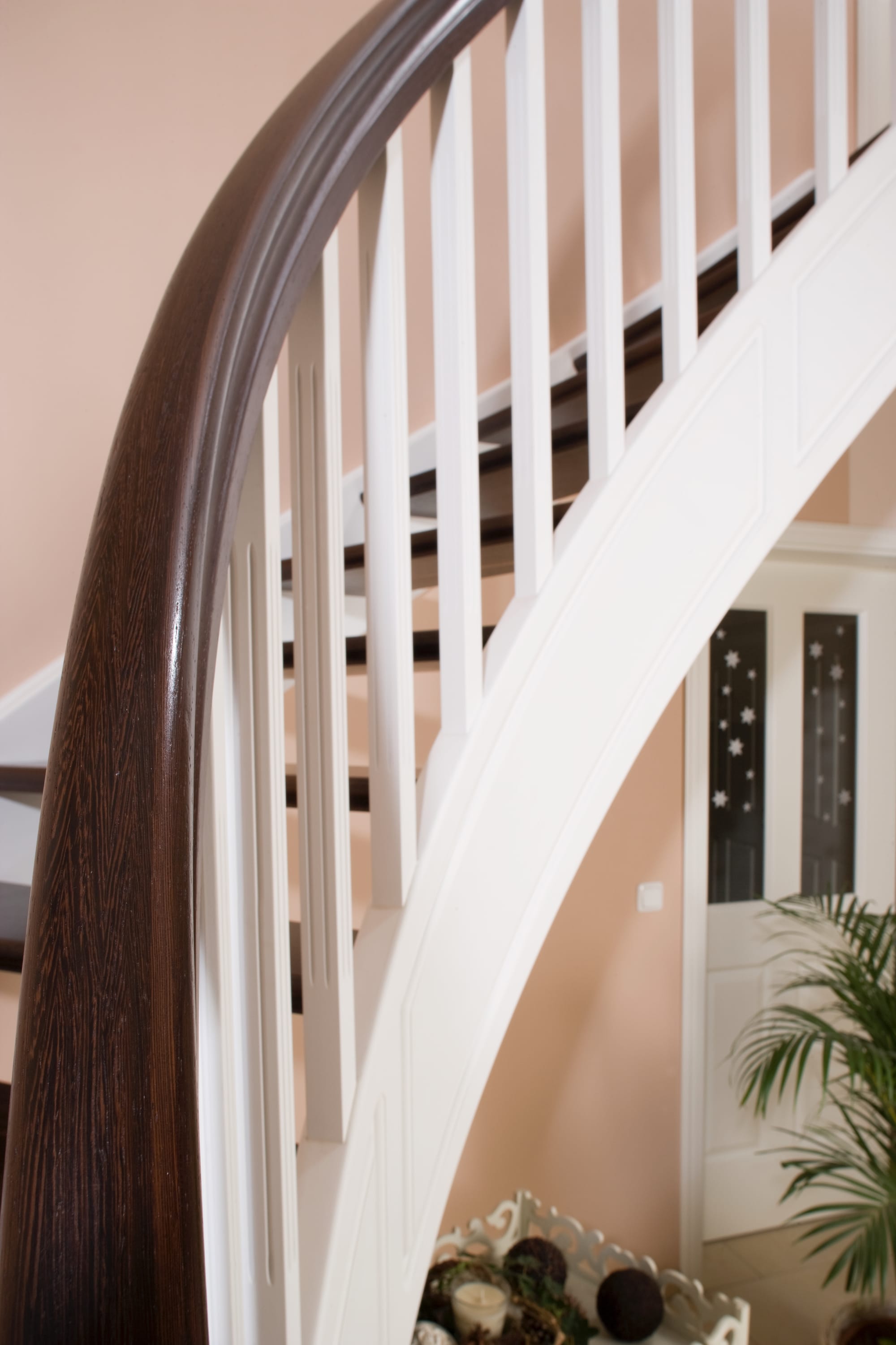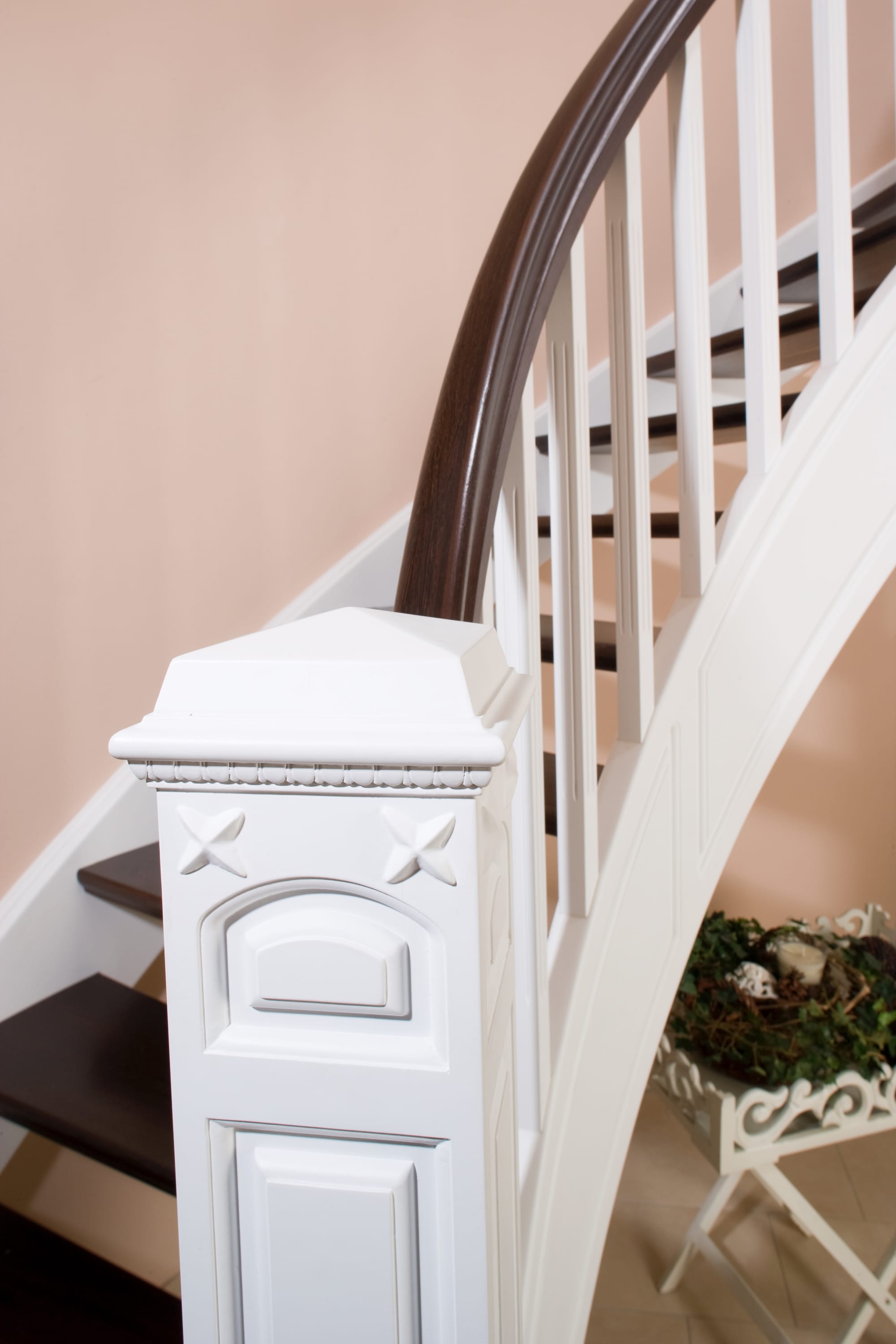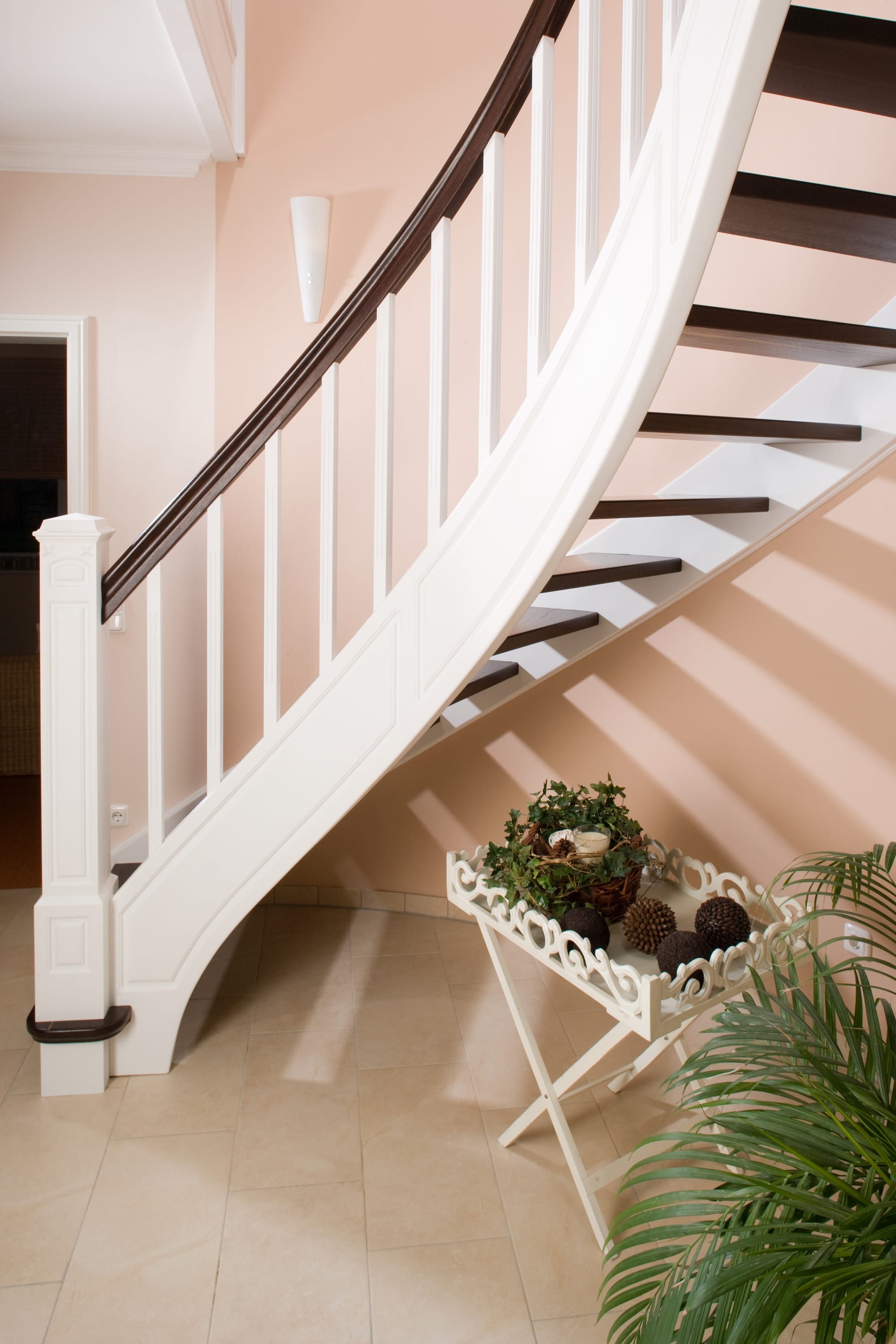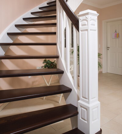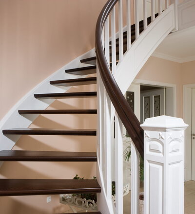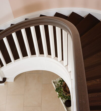 Bogentreppe mit Stufen und Handlauf in der Holzart Wenge, weiß endbehandelte Wangen und Stäbe, profilierter Antrittspfosten