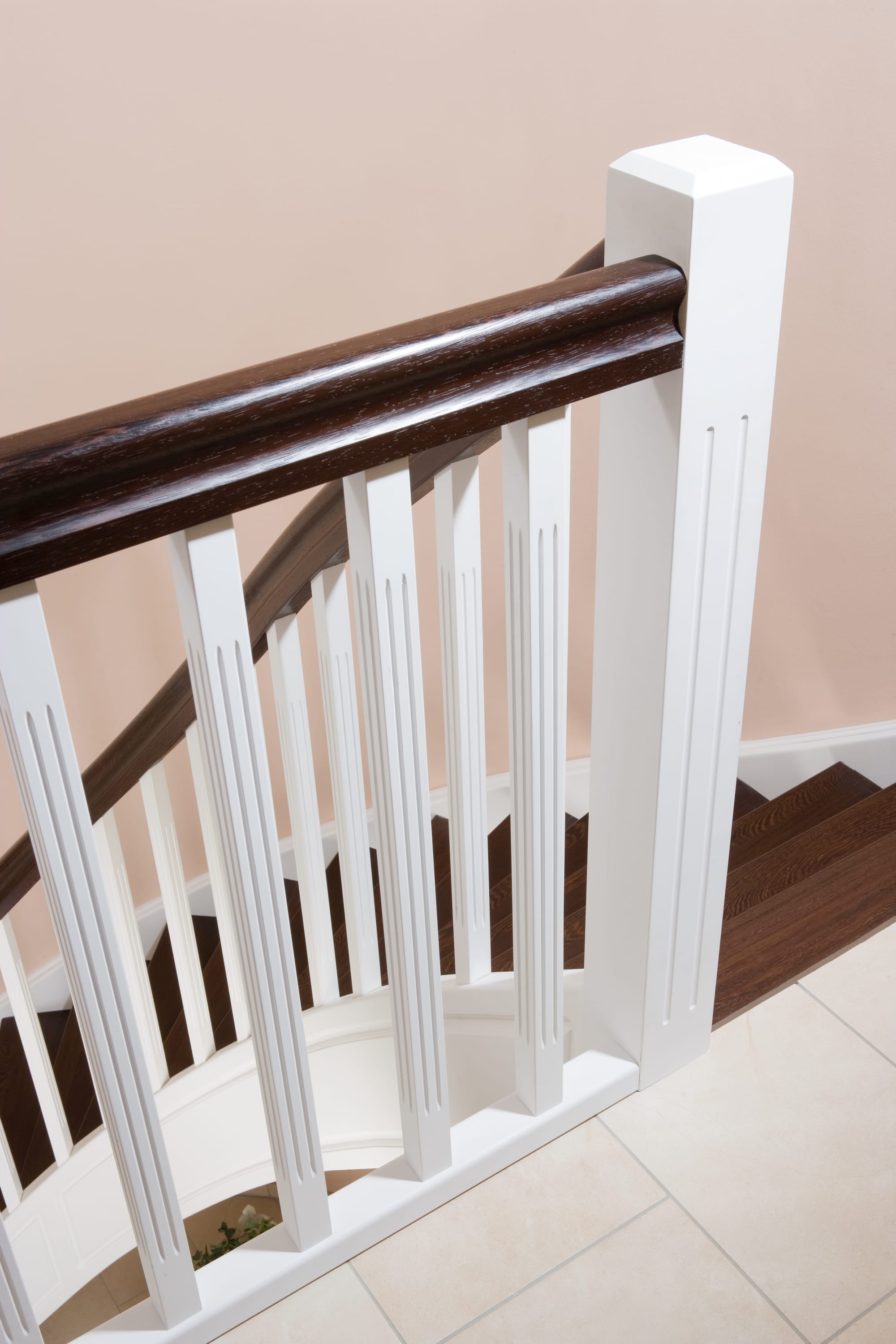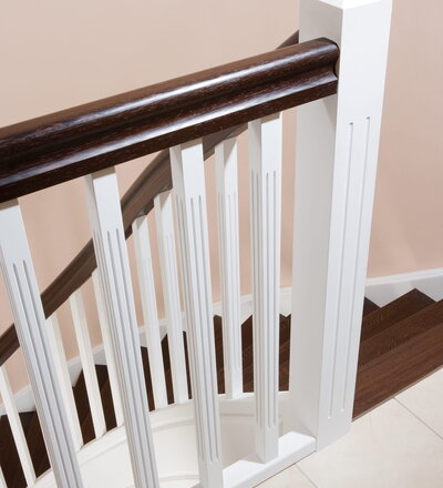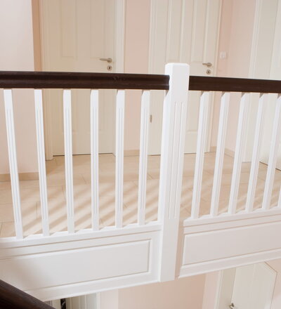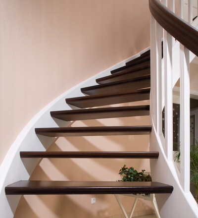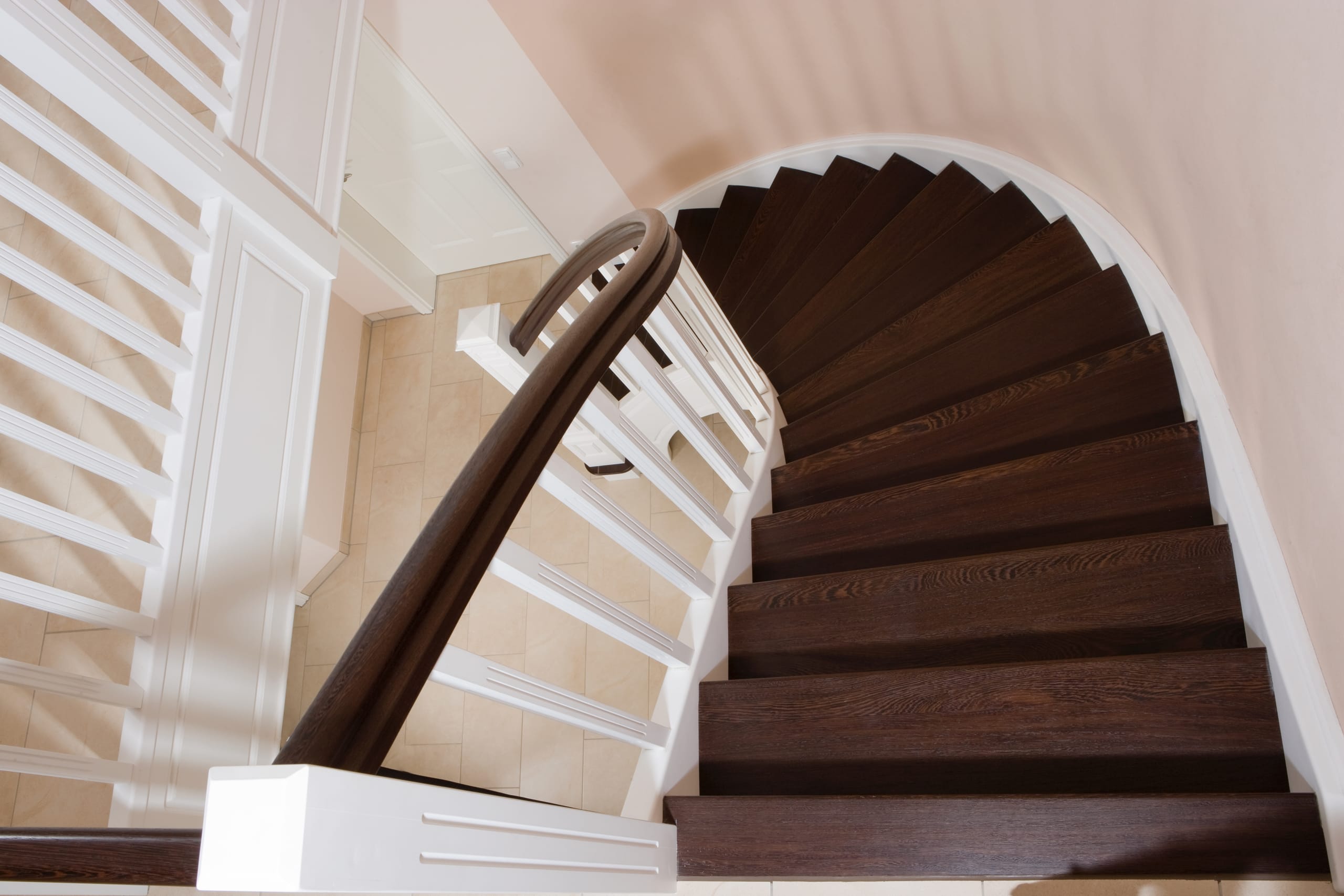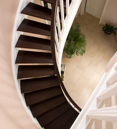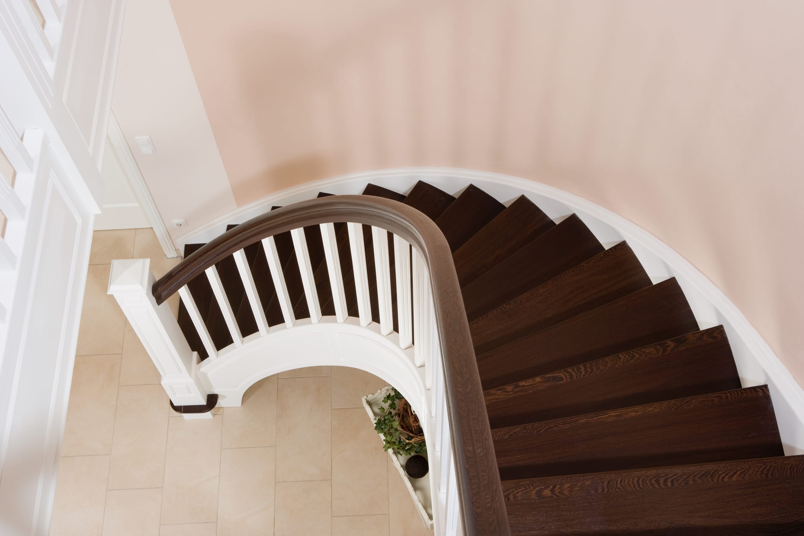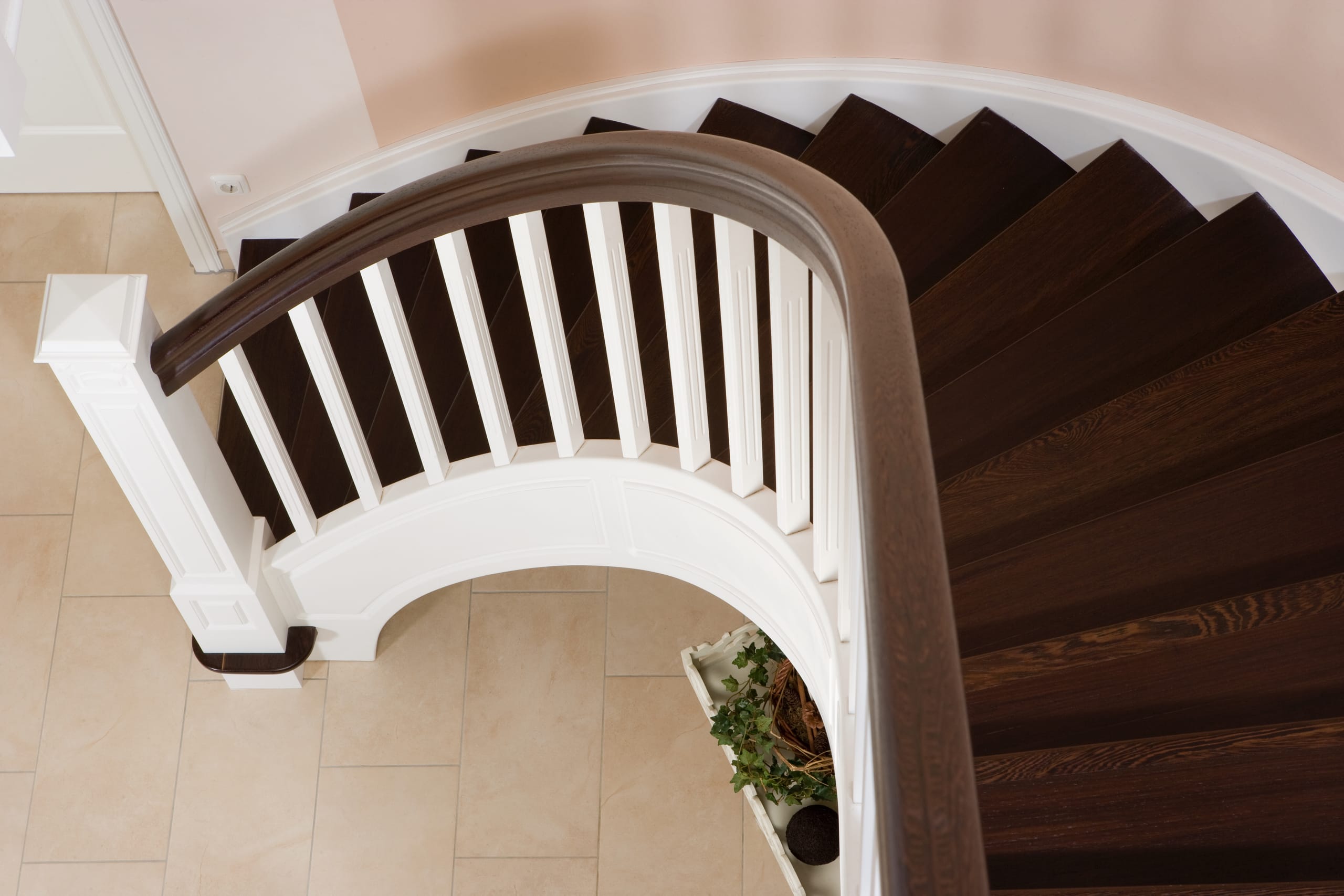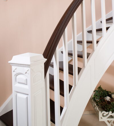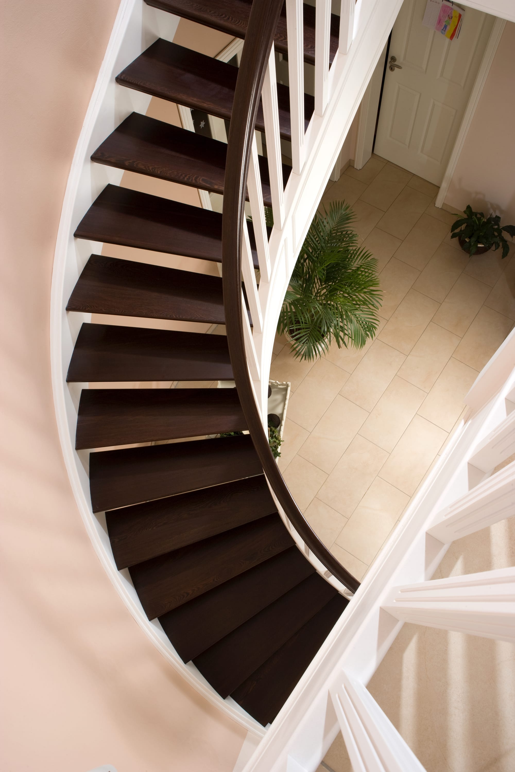 Bogentreppe mit Stufen und Handlauf in der Holzart Wenge, weiß endbehandelte Wangen und Stäbe, profilierter Antrittspfosten